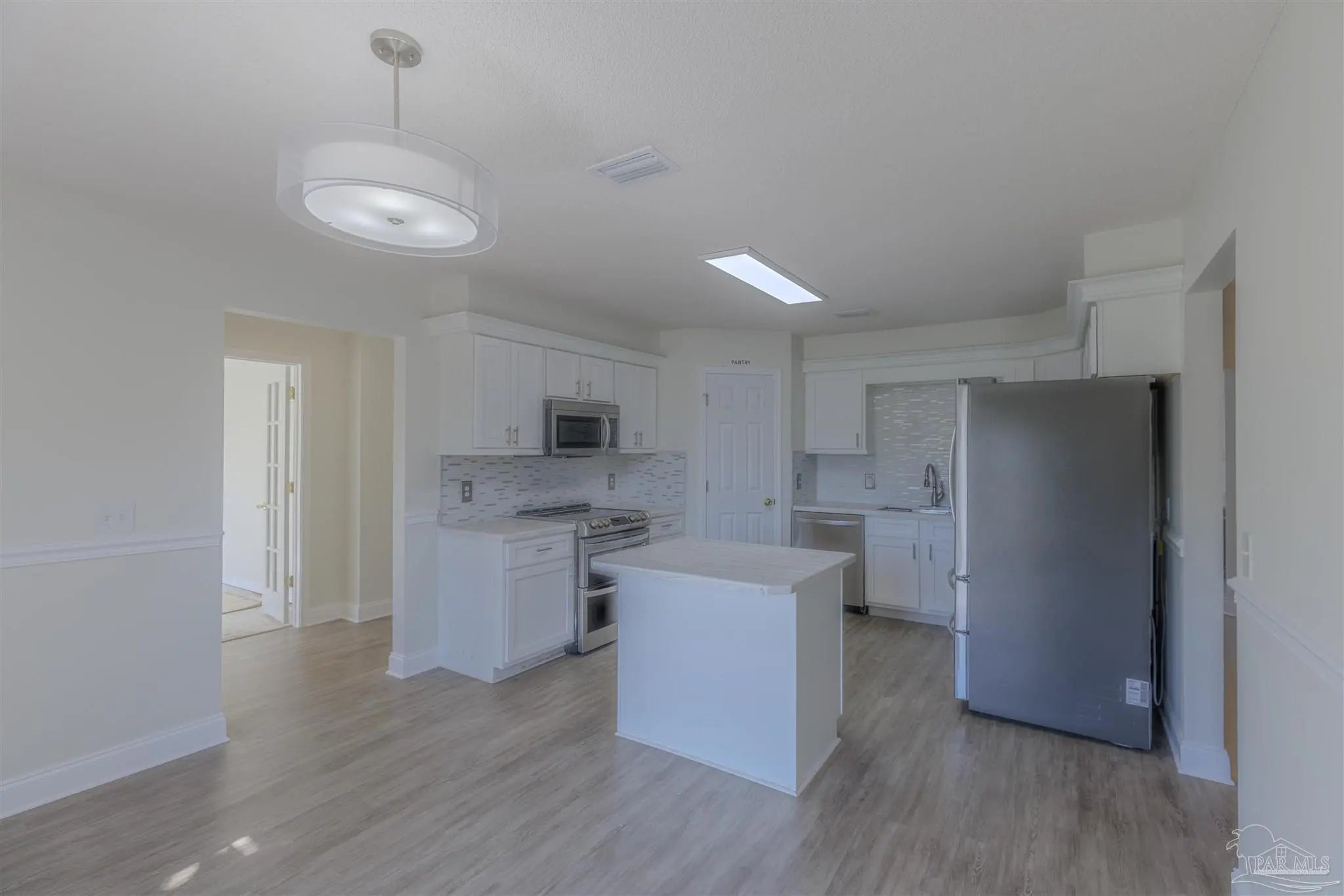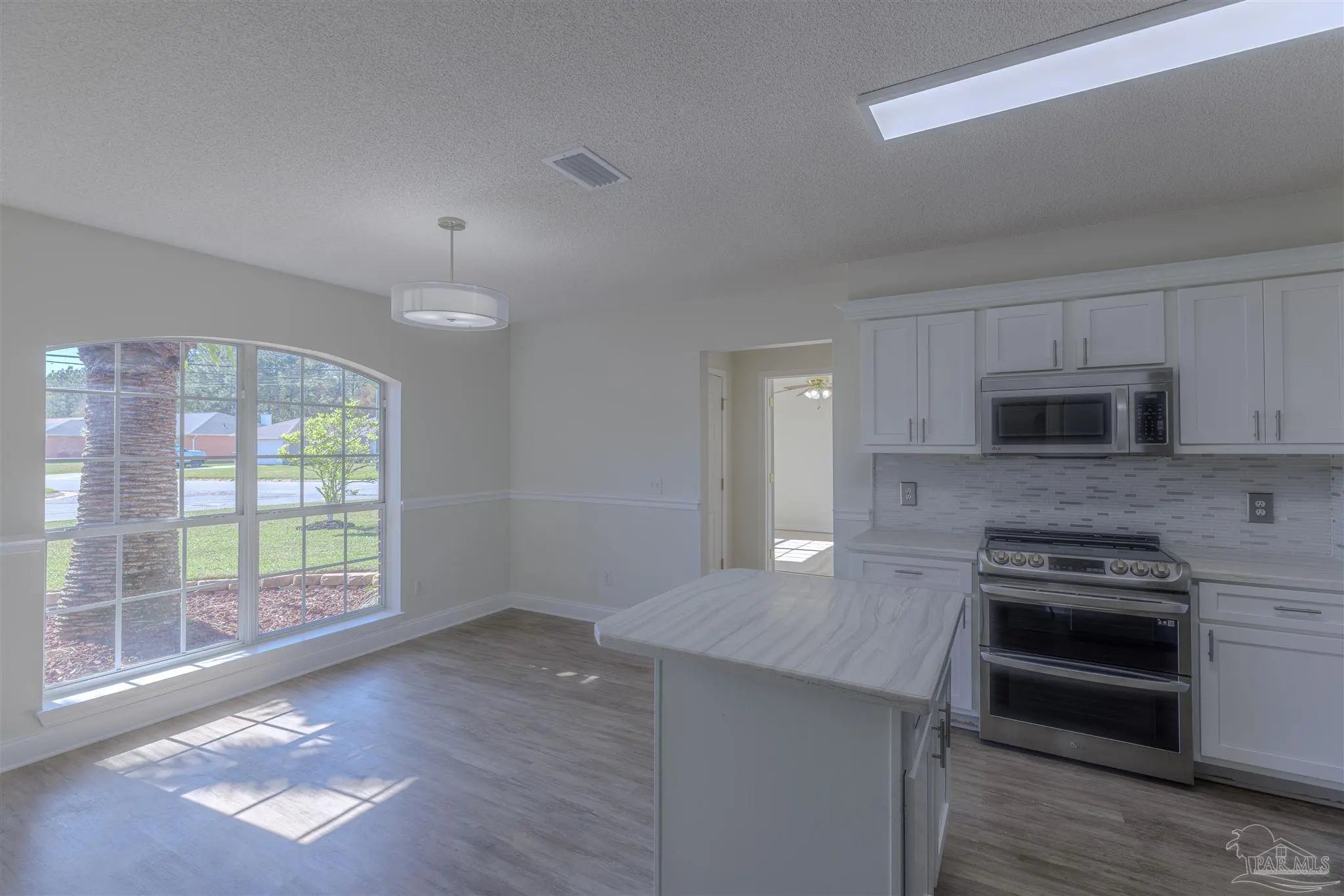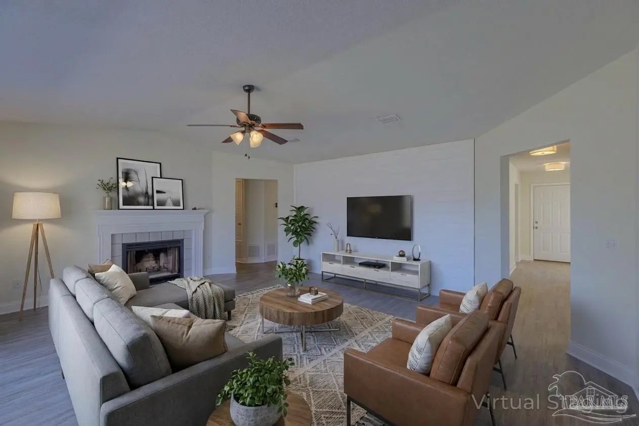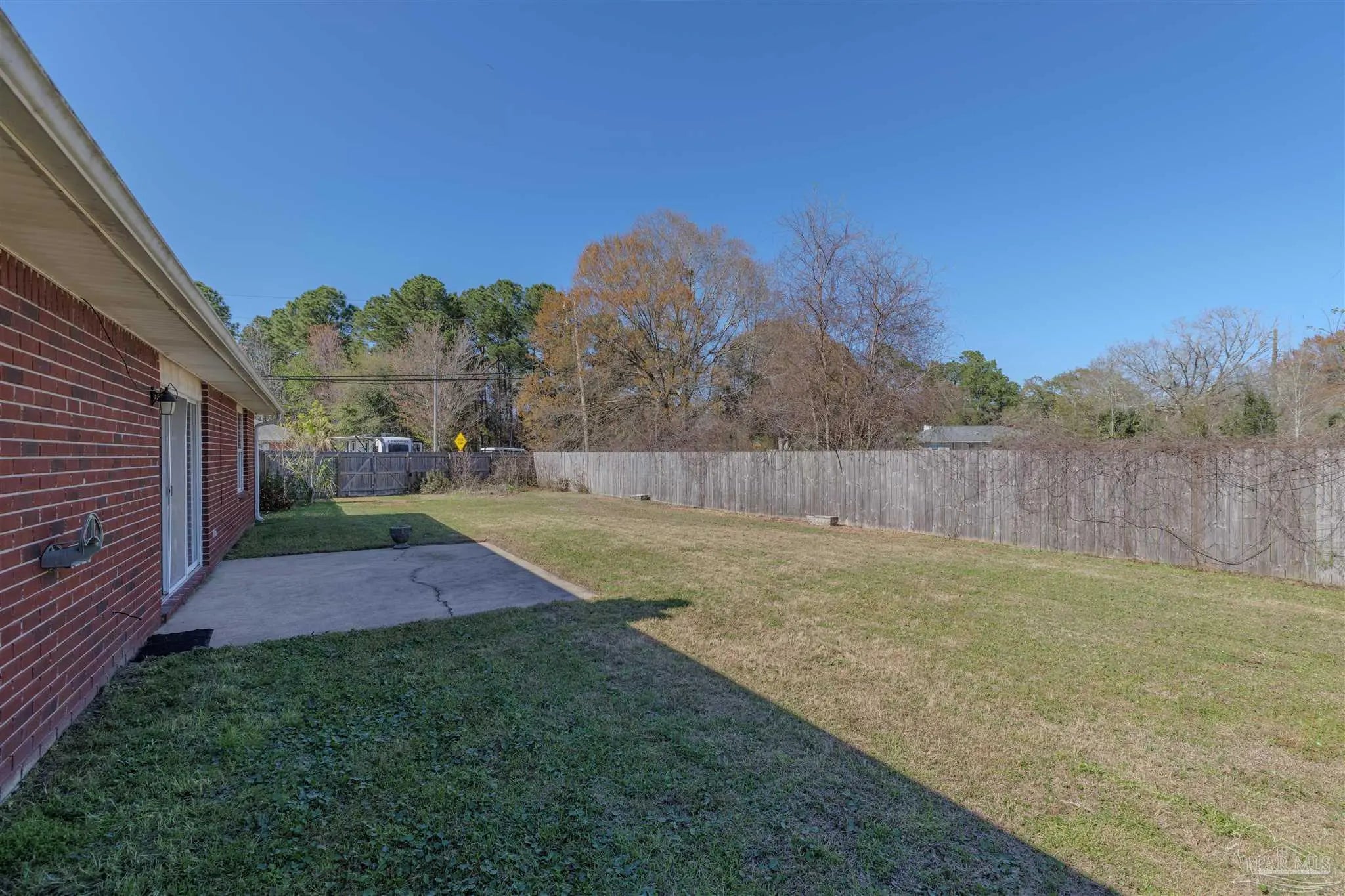 Experience the ideal blend of comfort, style, and convenience in this spacious brick home, perfectly situated in a welcoming neighborhood close to NAS Pensacola, shopping, and the beach. Thoughtfully remodeled, this ranch-style property offers three bedrooms plus a generous dedicated office that can easily serve as a fourth bedroom. The updated kitchen, completed in 2021, features solid-surface countertops, a deep stainless steel sink with custom drying racks, a striking tile backsplash, and matching stainless steel appliances. Light luxury vinyl flooring flows throughout the main living areas, and new carpet has been ordered for the study. A split floor plan provides added privacy, with the primary suite set apart from the secondary bedrooms, which share a full guest-accessible bath. The spacious family room stands out with its shiplap accent wall and cozy wood-burning fireplace—an inviting gathering space for everyday living or entertaining. Sitting on a large corner lot, the fully fenced backyard includes a convenient side entrance designed for boat or RV parking. Energy efficiency is already built in: the home is equipped with fully paid-off solar panels that keep average monthly power bills to just $26. Move-in ready and packed with upgrades, this home offers exceptional value in a sought-after location. Schedule your private showing today before this opportunity is gone.