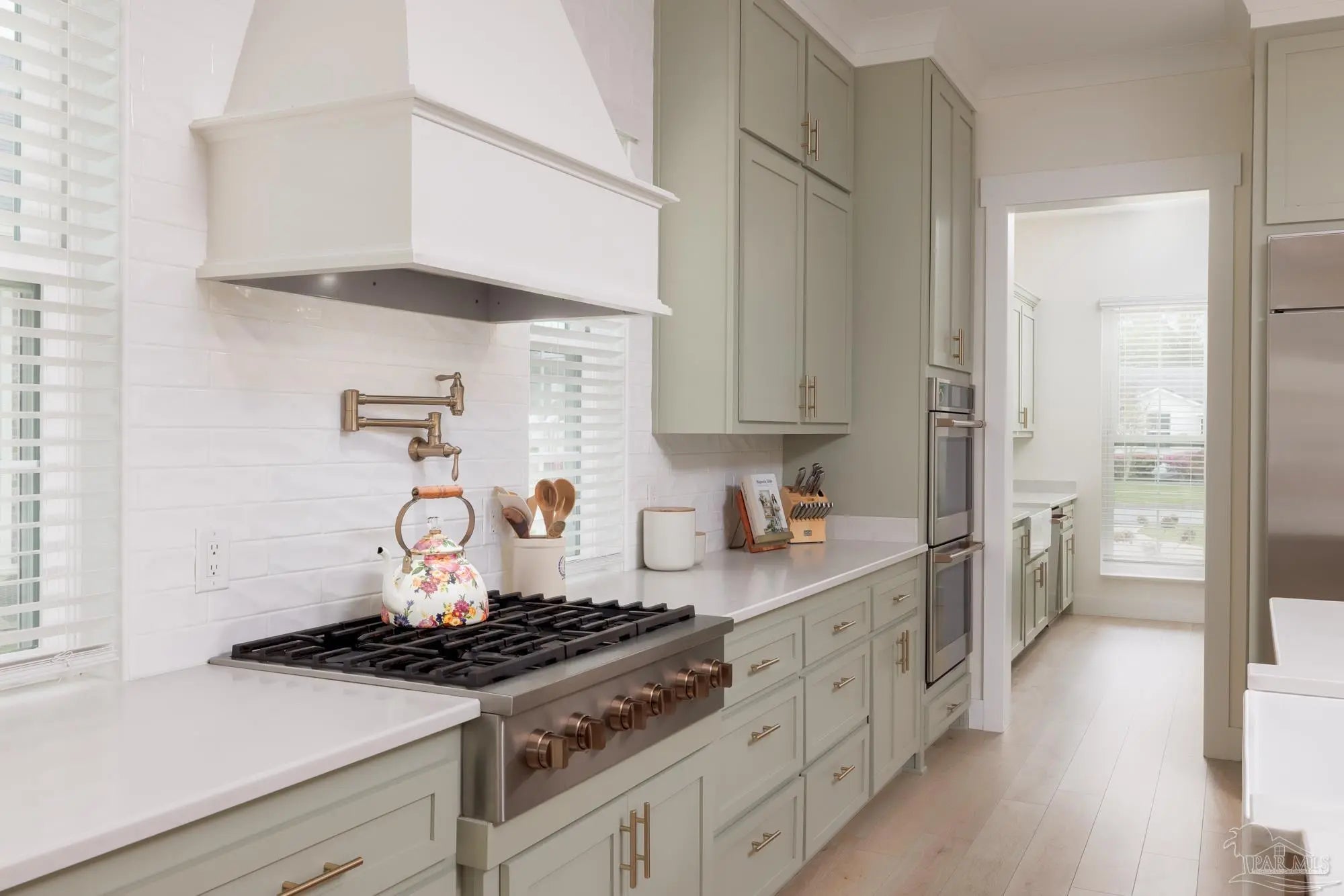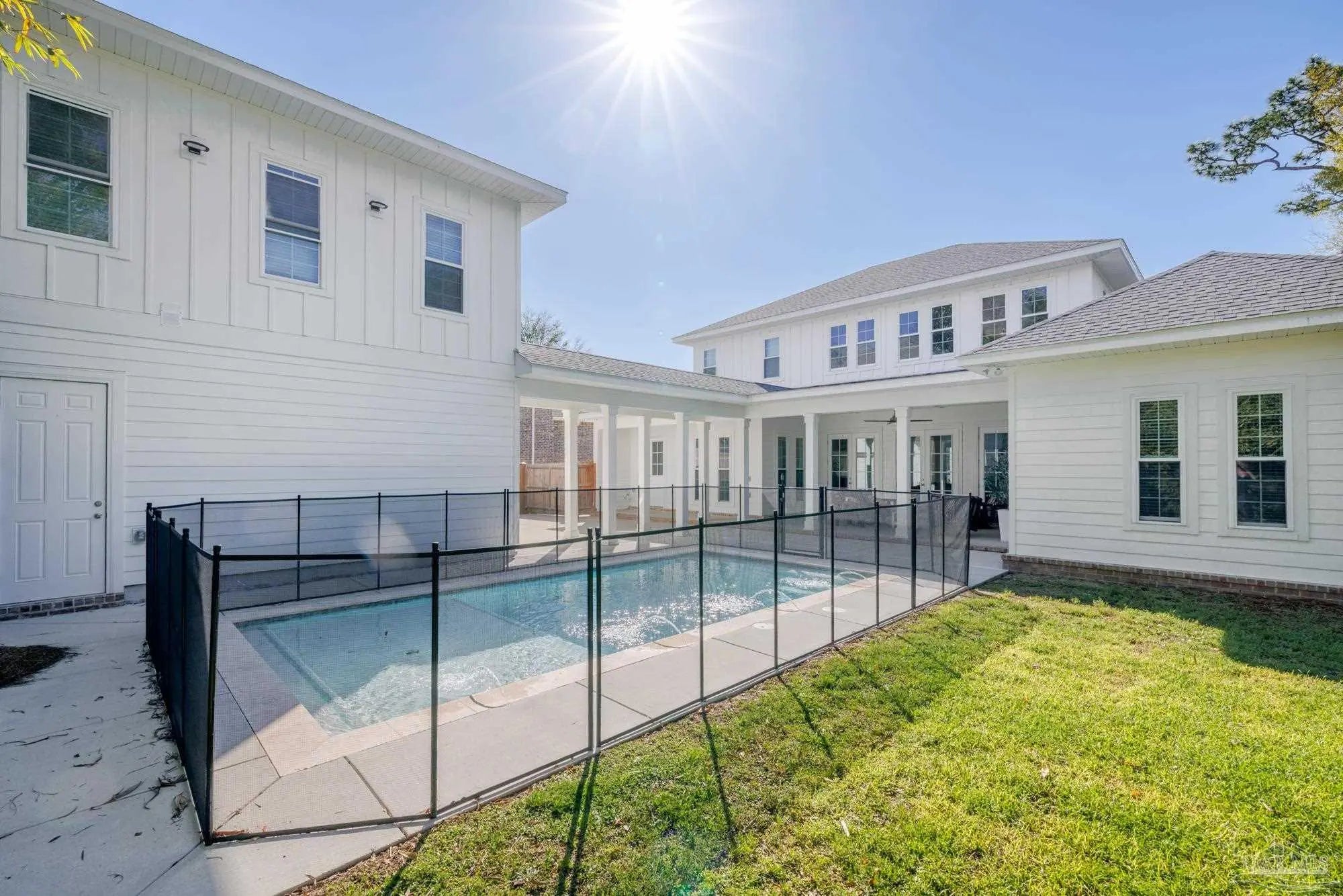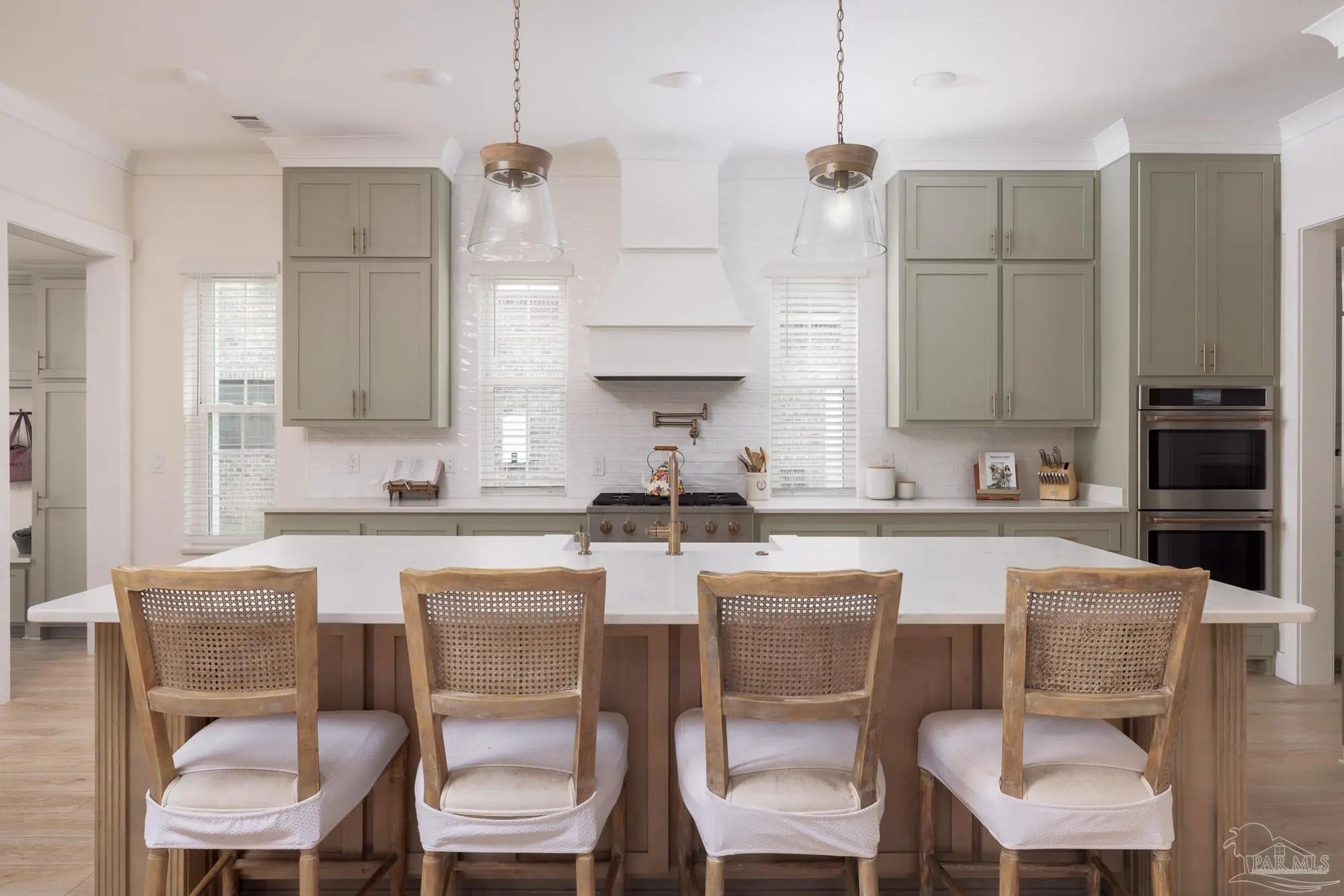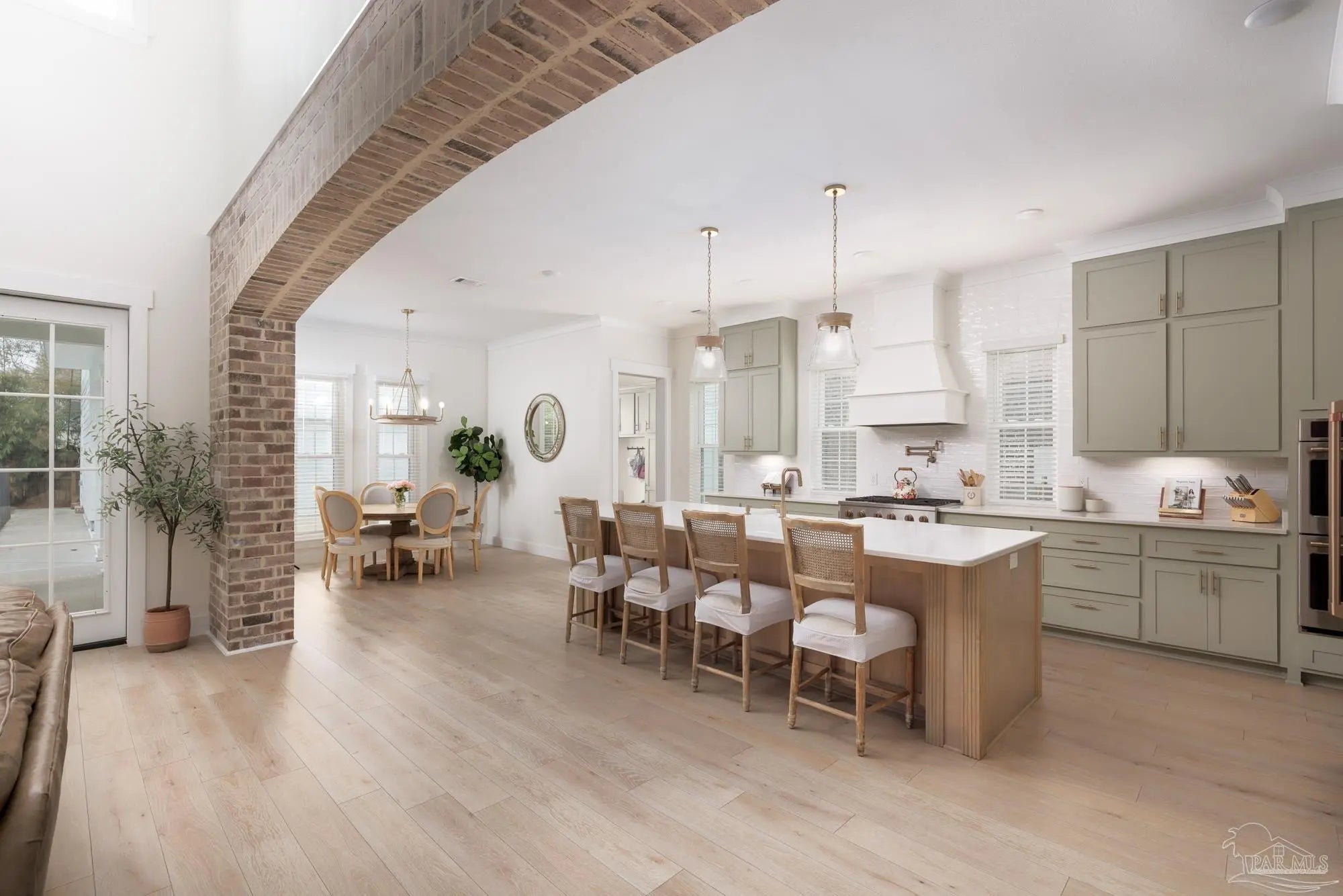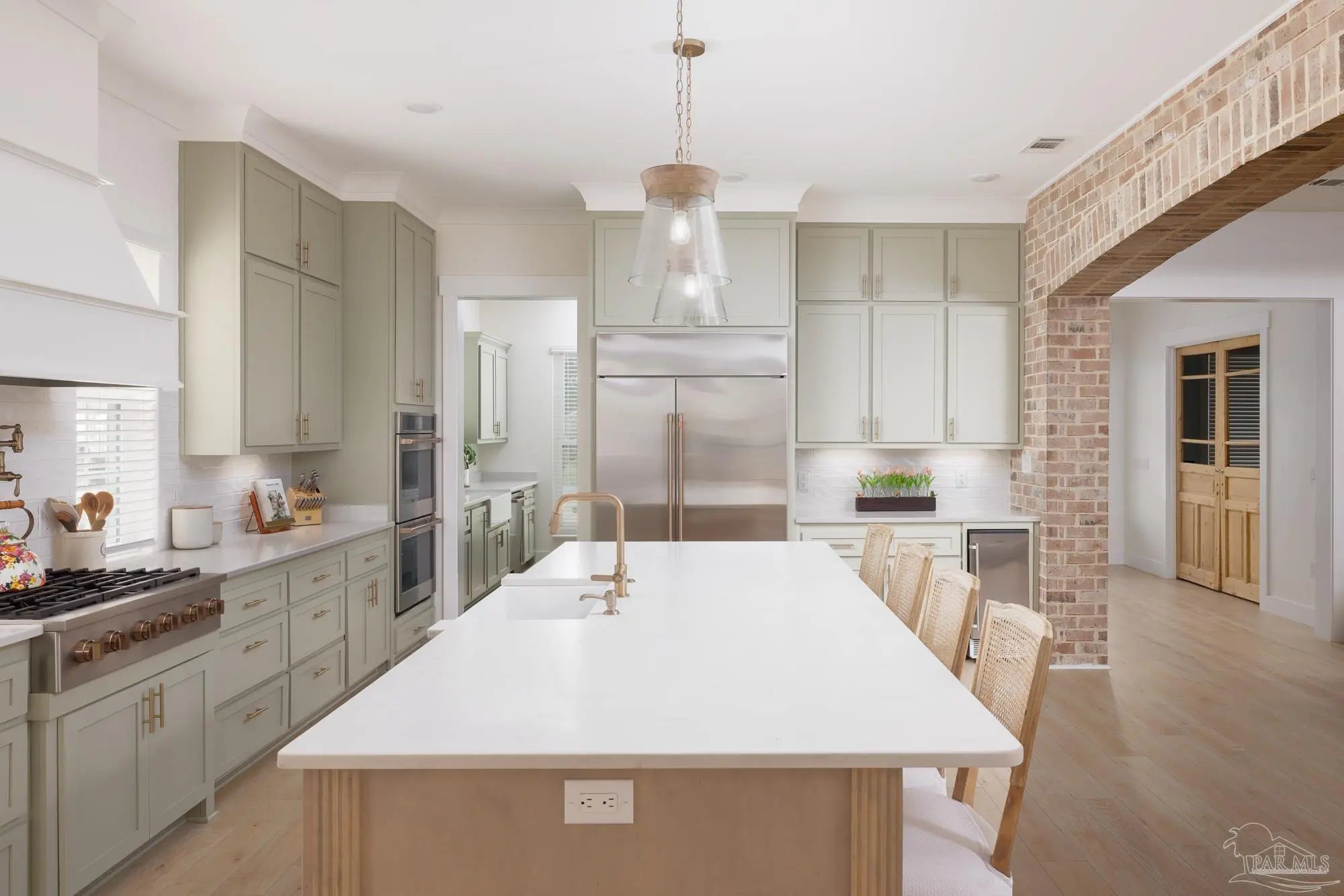 Set back from the road on a circular drive, this extraordinary home announces itself with a commanding presence and stunning curb appeal before you ever step inside. The broad foyer opens into a beautiful great room in front, with a home office and a kids play room to your right and left. The soaring great room welcomes you with two-story ceilings, wide-plank LVP floors, a white-brick fireplace, and walls of French doors that flood the space with natural light and open to the pool beyond. A stunning exposed brick arch frames the passage into the kitchen and dining area, where sage-green custom cabinetry, a six-burner gas range, double wall ovens, Cafe custom built in refrigerator, quartz countertops, pot filler, and a generous island create a chef's space of remarkable beauty. The adjacent scullery pantry with its own farmhouse sink and quartz counters ensures every inch of storage you could want. The first-floor master suite is a sanctuary, offering a spa bath with freestanding soaking tub, glass-enclosed shower with pebble tile floor, dual vanities, brass hardware, and his-and-hers walk-in closets. A powder bath, home office, playroom, mudroom, and laundry room complete the first floor with purpose and personality. Upstairs, three imaginative bedrooms are served by a Jack-and-Jill bath and a private ensuite. A fully self-contained guest suite with kitchenette and living area is available above the detached garage…perfect for extended family. Outside, the covered back porch with outdoor fireplace, mounted television, and beadboard ceiling opens to a sparkling pool embraced by bamboo and palms. All of this awaits in East Hill, minutes from top schools, hospitals, the interstate, and the shops and restaurants of Downtown Pensacola. This home is a dream come true!