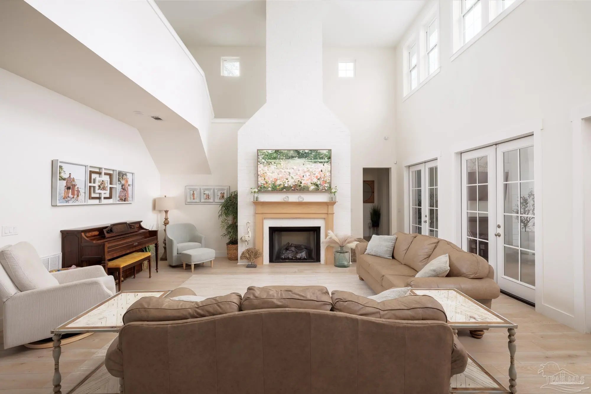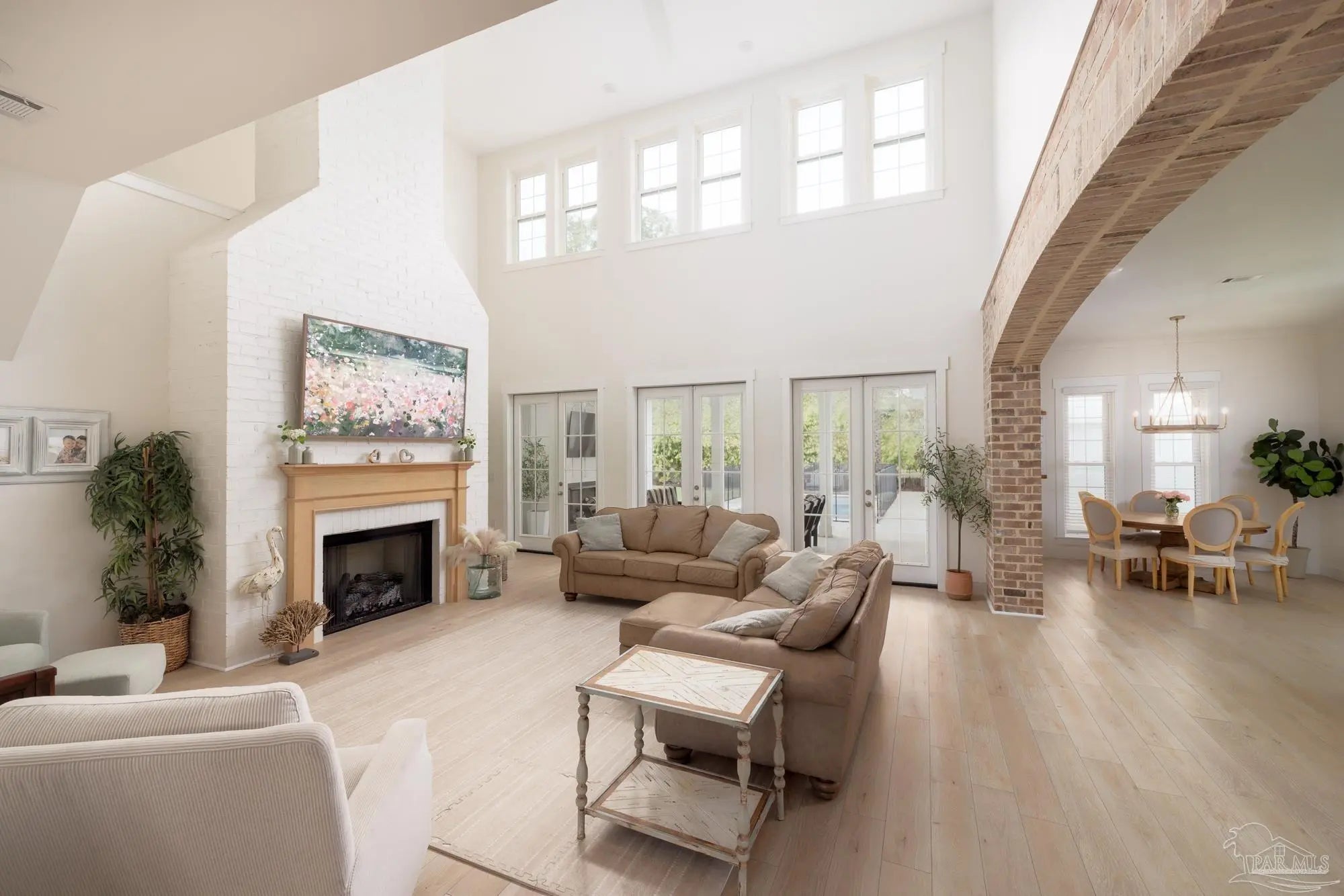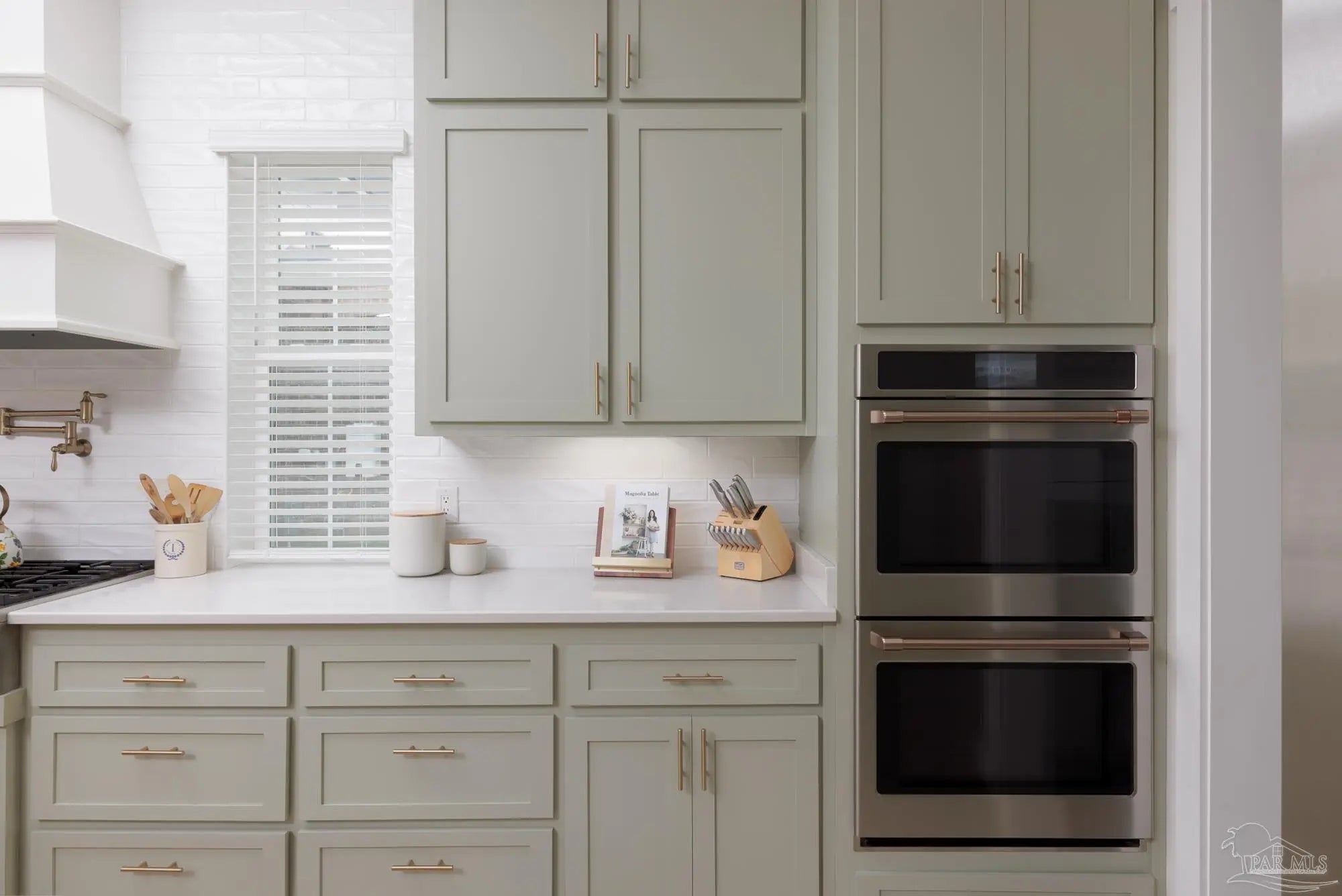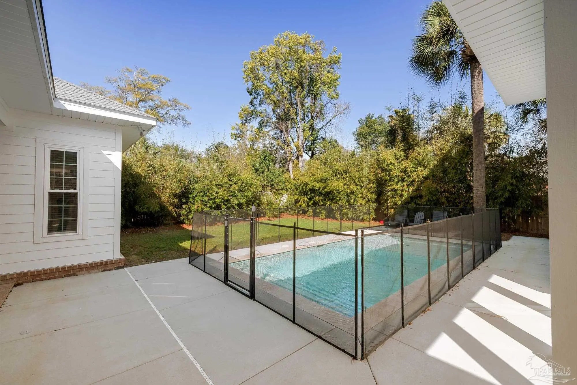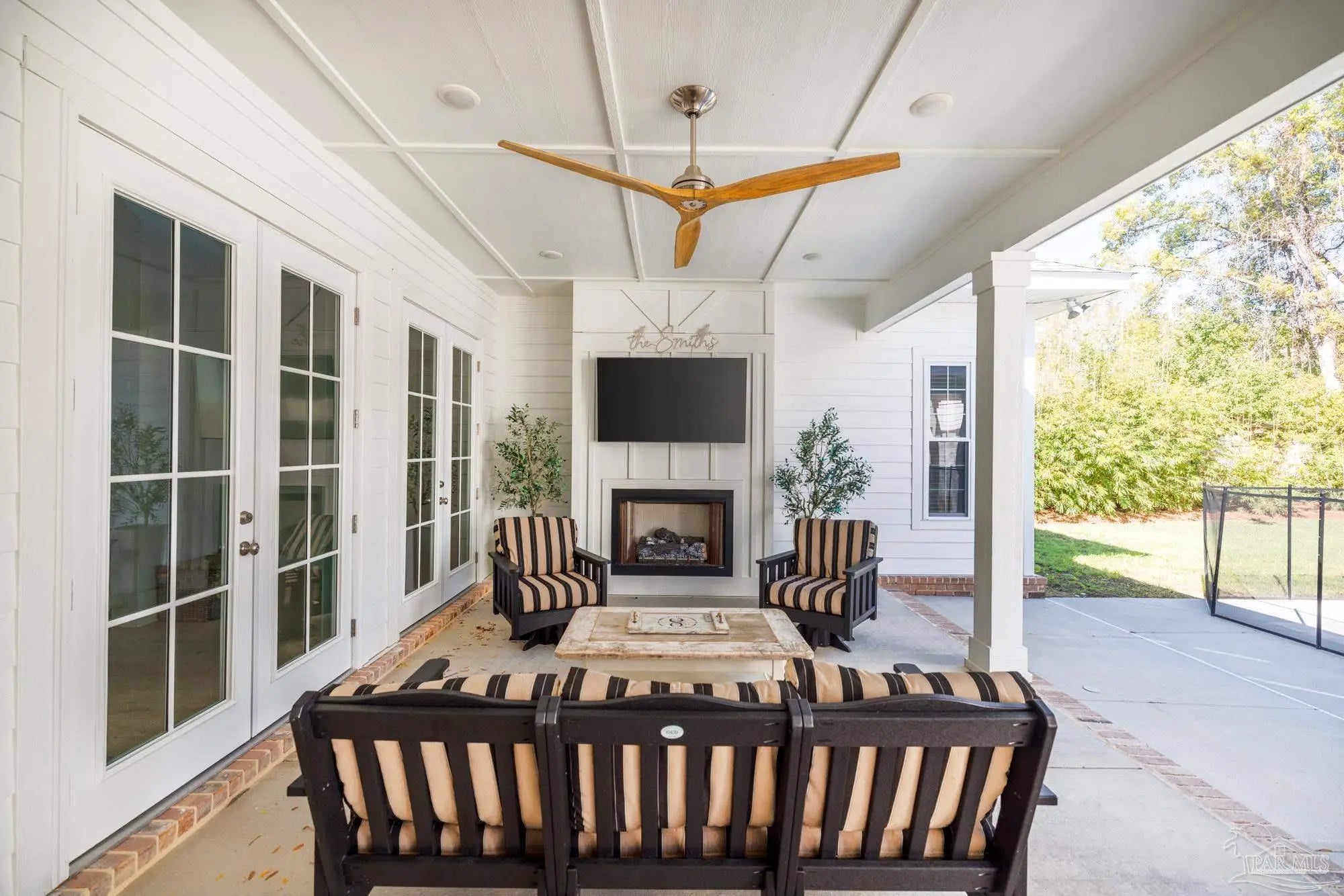 Set back from the road on a circular drive, this extraordinary home announces itself with a commanding presence and stunning curb appeal before you ever step inside. The broad foyer opens into a beautiful great room in front, with a home office and a kids play room to your right and left. The soaring great room welcomes you with two-story ceilings, wide-plank LVP floors, a white-brick fireplace, and walls of French doors that flood the space with natural light and open to the pool beyond. A stunning exposed brick arch frames the passage into the kitchen and dining area, where sage-green custom cabinetry, a six-burner gas range, double wall ovens, Cafe custom built in refrigerator, quartz countertops, pot filler, and a generous island create a chef's space of remarkable beauty. The adjacent scullery pantry with its own farmhouse sink and quartz counters ensures every inch of storage you could want. The first-floor master suite is a sanctuary, offering a spa bath with freestanding soaking tub, glass-enclosed shower with pebble tile floor, dual vanities, brass hardware, and his-and-hers walk-in closets. A powder bath, home office, playroom, mudroom, and laundry room complete the first floor with purpose and personality. Upstairs, three imaginative bedrooms are served by a Jack-and-Jill bath and a private ensuite. A fully self-contained guest suite with kitchenette and living area is available above the detached garage…perfect for extended family. Outside, the covered back porch with outdoor fireplace, mounted television, and beadboard ceiling opens to a sparkling pool embraced by bamboo and palms. All of this awaits in East Hill, minutes from top schools, hospitals, the interstate, and the shops and restaurants of Downtown Pensacola. This home is a dream come true!