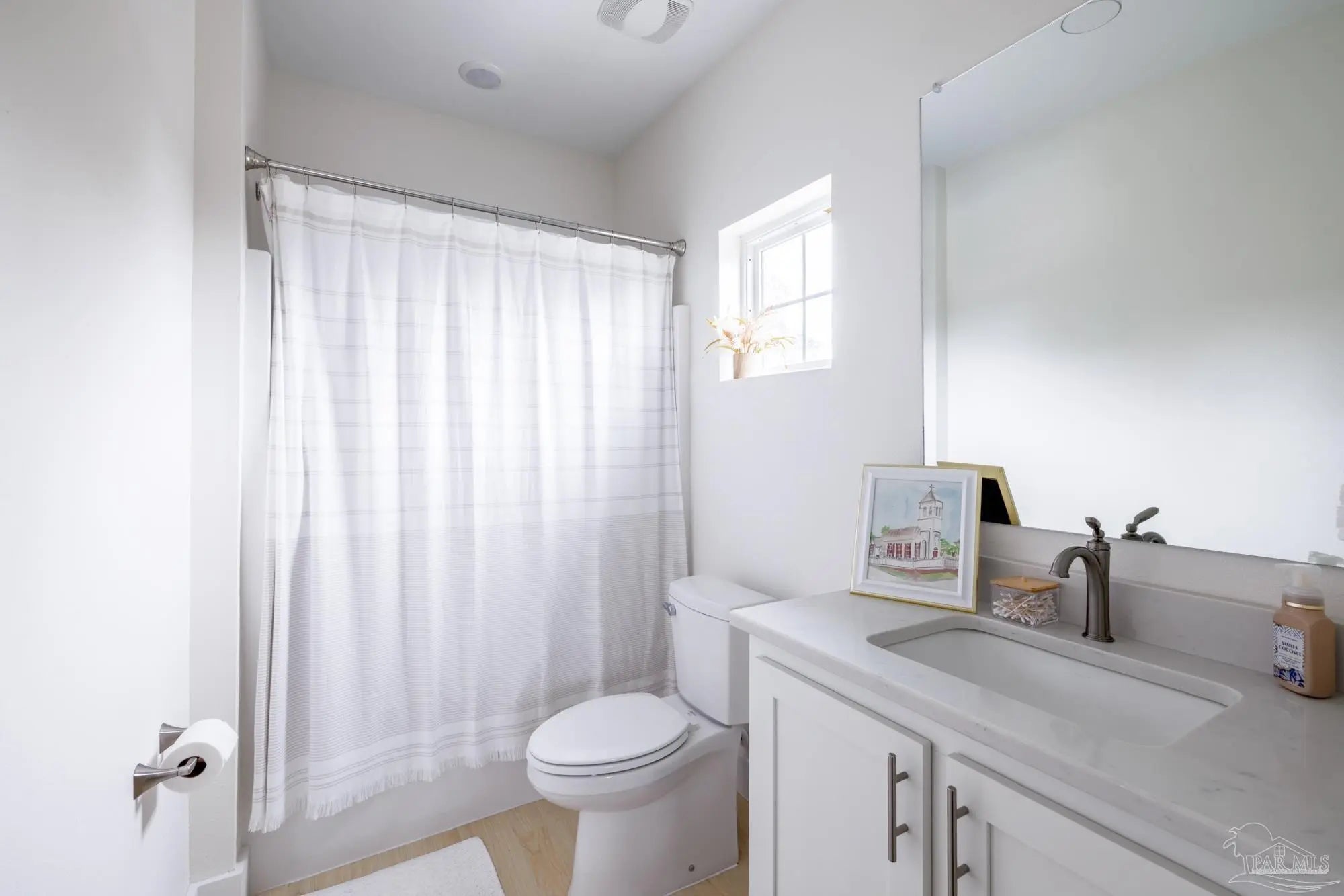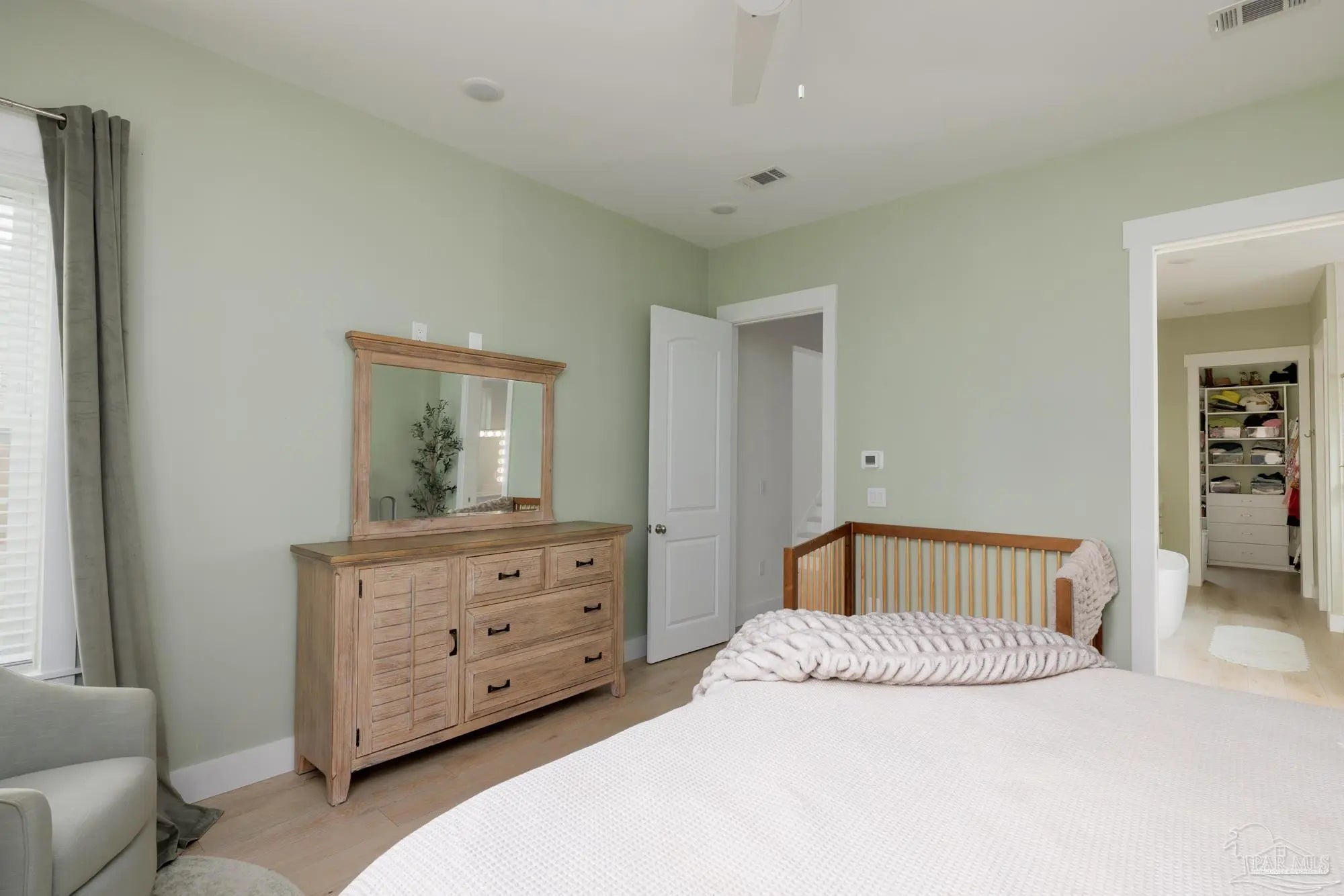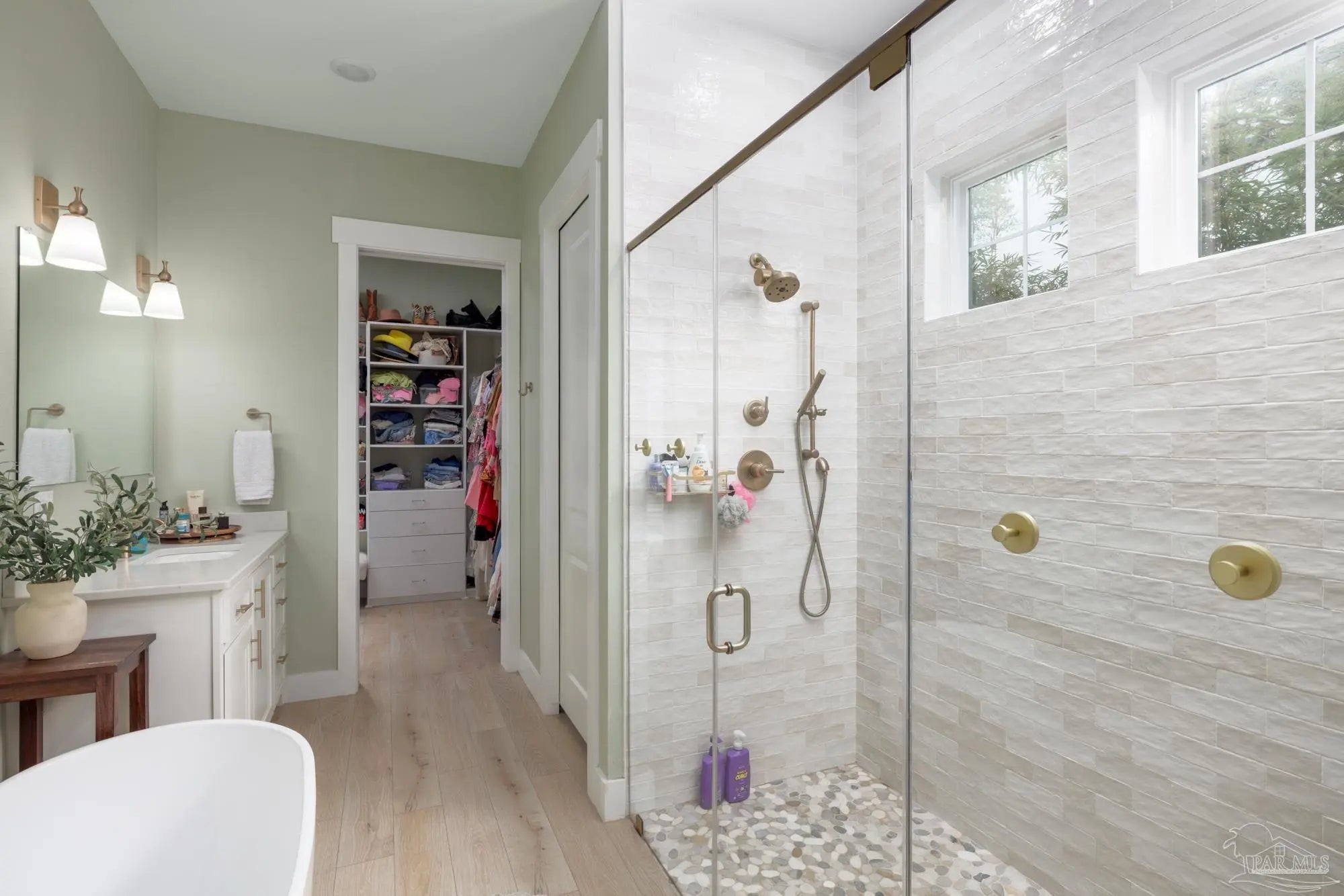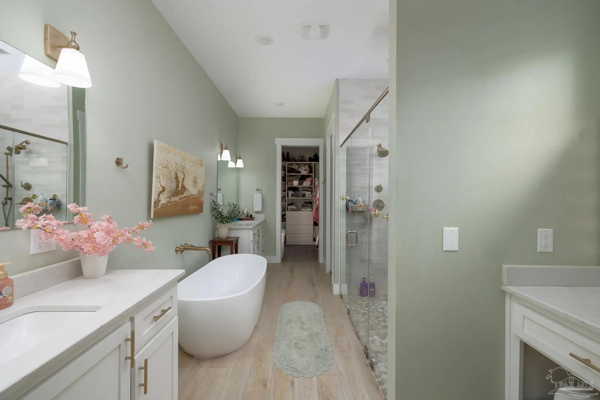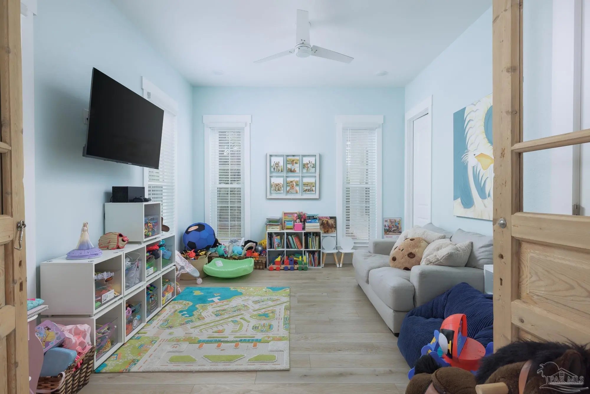 Set back from the road on a circular drive, this extraordinary home announces itself with a commanding presence and stunning curb appeal before you ever step inside. The broad foyer opens into a beautiful great room in front, with a home office and a kids play room to your right and left. The soaring great room welcomes you with two-story ceilings, wide-plank LVP floors, a white-brick fireplace, and walls of French doors that flood the space with natural light and open to the pool beyond. A stunning exposed brick arch frames the passage into the kitchen and dining area, where sage-green custom cabinetry, a six-burner gas range, double wall ovens, Cafe custom built in refrigerator, quartz countertops, pot filler, and a generous island create a chef's space of remarkable beauty. The adjacent scullery pantry with its own farmhouse sink and quartz counters ensures every inch of storage you could want. The first-floor master suite is a sanctuary, offering a spa bath with freestanding soaking tub, glass-enclosed shower with pebble tile floor, dual vanities, brass hardware, and his-and-hers walk-in closets. A powder bath, home office, playroom, mudroom, and laundry room complete the first floor with purpose and personality. Upstairs, three imaginative bedrooms are served by a Jack-and-Jill bath and a private ensuite. A fully self-contained guest suite with kitchenette and living area is available above the detached garage…perfect for extended family. Outside, the covered back porch with outdoor fireplace, mounted television, and beadboard ceiling opens to a sparkling pool embraced by bamboo and palms. All of this awaits in East Hill, minutes from top schools, hospitals, the interstate, and the shops and restaurants of Downtown Pensacola. This home is a dream come true!