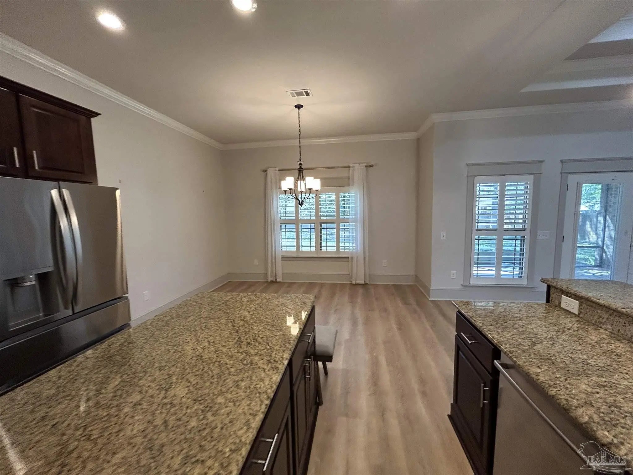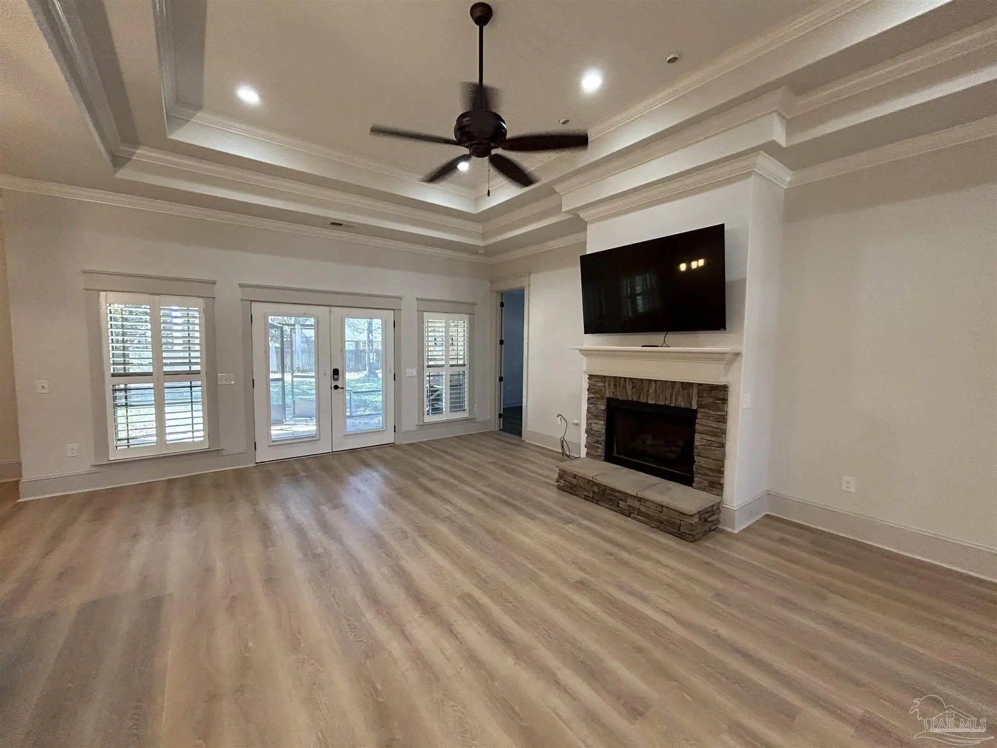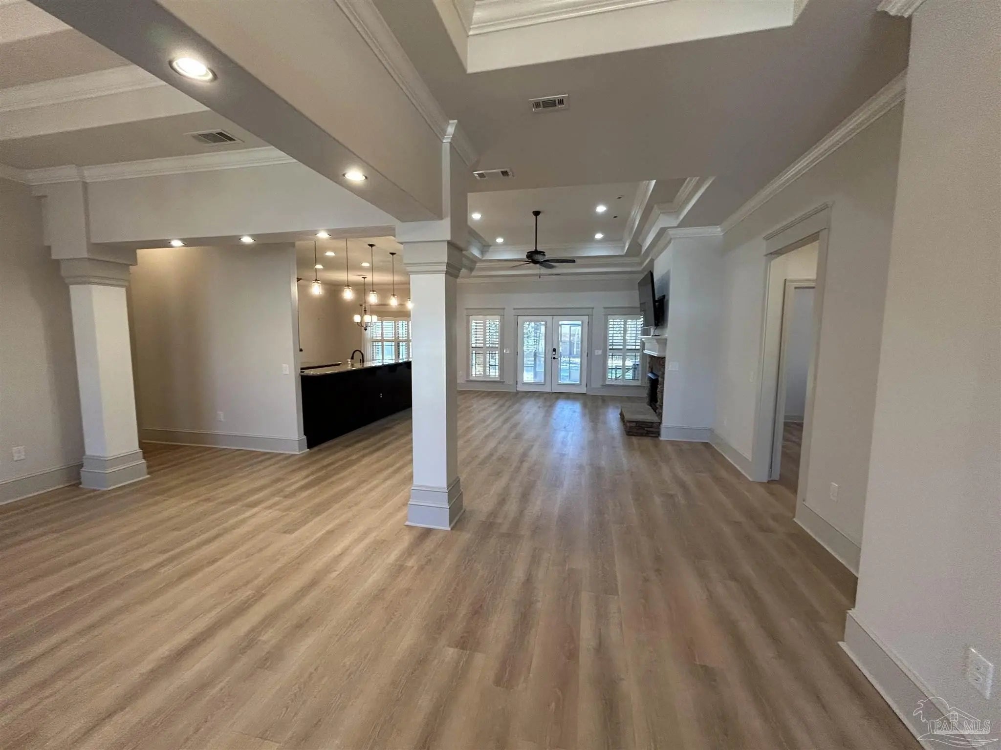 Well-maintained home located in a highly desirable subdivision! This beautiful home welcomes you with a covered front porch and elegant interior features including a formal dining room with double box ceilings, double crown molding, decorative columns, and custom plantation shutters throughout. The open-concept kitchen overlooks the spacious great room featuring impressive 12-foot stepped ceilings and a stunning stacked stone fireplace, perfect for entertaining or relaxing. The luxurious primary suite offers a double tray ceiling with double crown molding. The primary bath features a double vanity, frameless walk-in shower, garden tub, private water closet, and a beautiful custom walk-in closet with built-ins. Guest bedrooms are located on the opposite side of the home, with one bedroom featuring its own en suite bath for added convenience. Enjoy relaxing in the screened-in back porch while reading a book or taking in the peaceful surroundings. The neighborhood is perfect for evening strolls, bike rides, or cruising around in your golf cart. A wonderful place to call home!