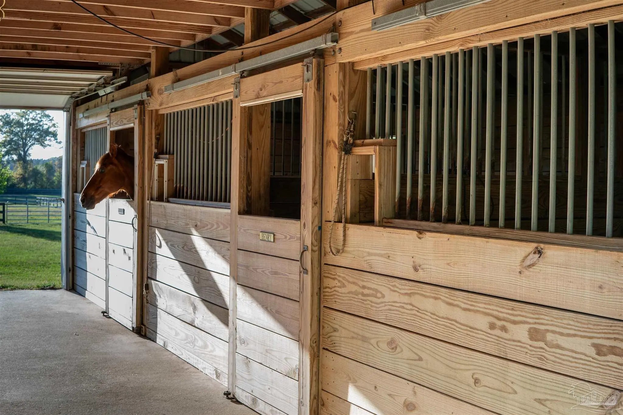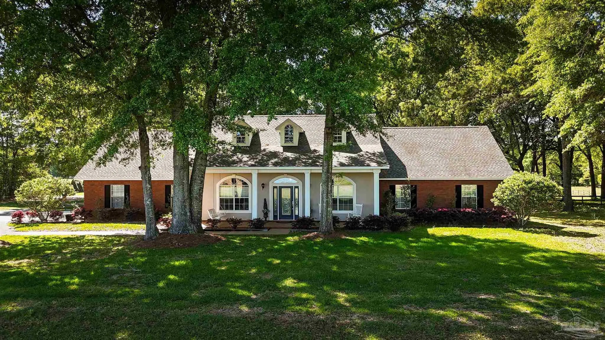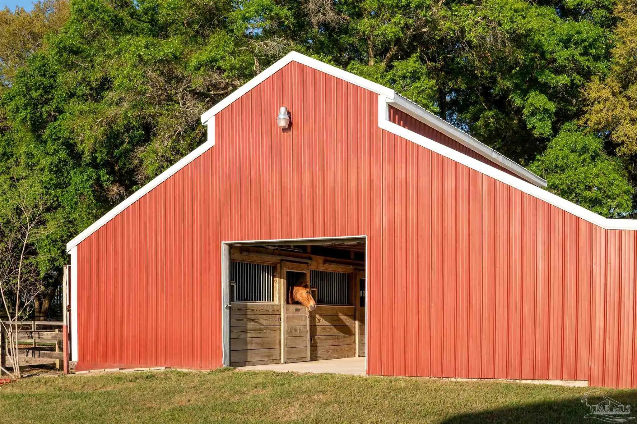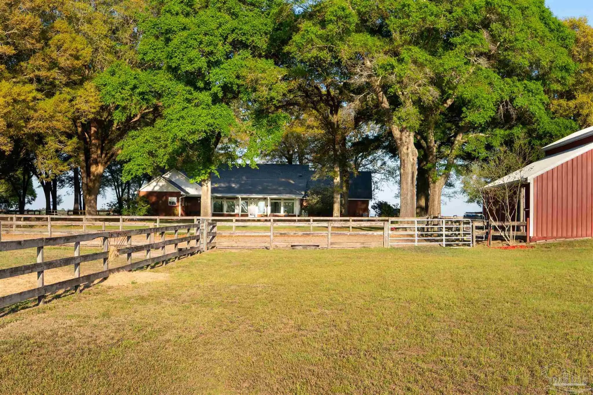 Set beneath a canopy of majestic, mature oaks, this exceptional 10-acre equestrian estate offers a rare blend of natural beauty, thoughtful design and refined functionality. Anchoring the property is a custom 3,309 square foot residence, designed for both everyday living and elegant entertaining. A long paved, gated drive creates a grand sense of arrival. Inside, a private study with French doors sits to the right, while a formal dining room with custom built-ins is to the left. The main living area features a fireplace and flows seamlessly into the eat-in kitchen. A fully enclosed, climate-controlled sunroom extends the living space and overlooks the covered patio with hot tub, offering uninterrupted views of the barn and rolling pastures. The home’s layout prioritizes privacy with a separate bedroom wing behind a hallway door. This wing includes three additional bedrooms, a guest bath and a primary suite with a garden tub overlooking the property. One of the additional rooms connects to the primary bedroom. Additional features include a laundry, oversized garage and utility area with a secondary washer and dryer. Equestrian amenities include a substantial metal barn with concrete floors, oversized dirt stalls with direct paddock access, a climate-controlled tack room, bathroom area with hot water and a large hay loft. A separate equipment building with two oversized garage doors adds versatility. The land is thoughtfully maintained with established, professionally seeded pastures and newly planted Mary Nell Holly trees, enhancing both usability and privacy.