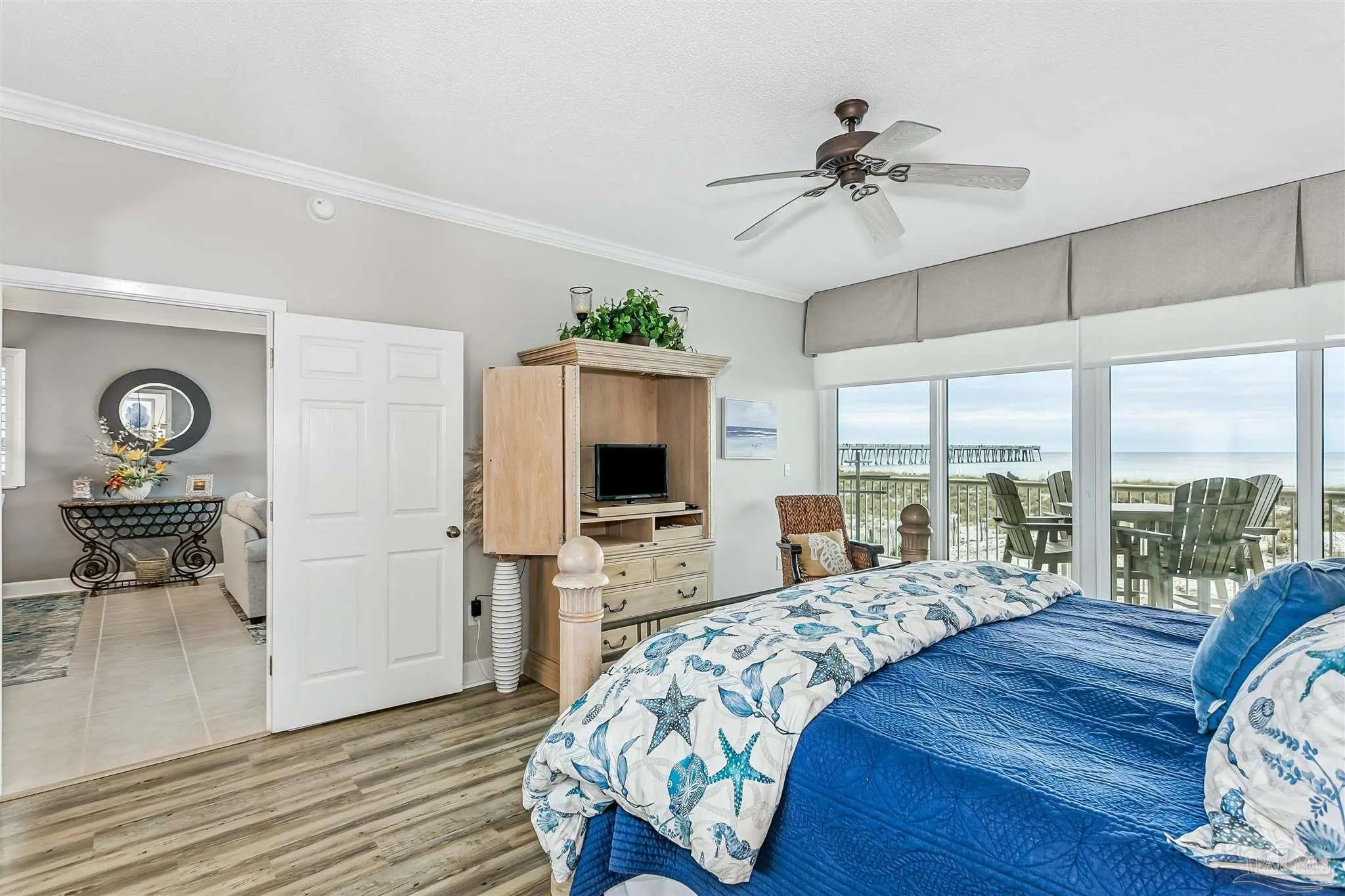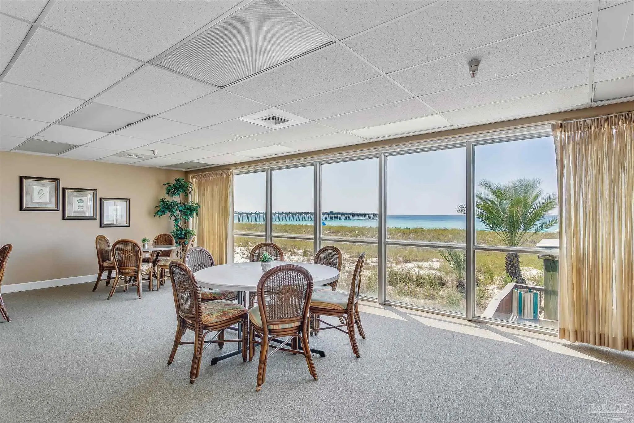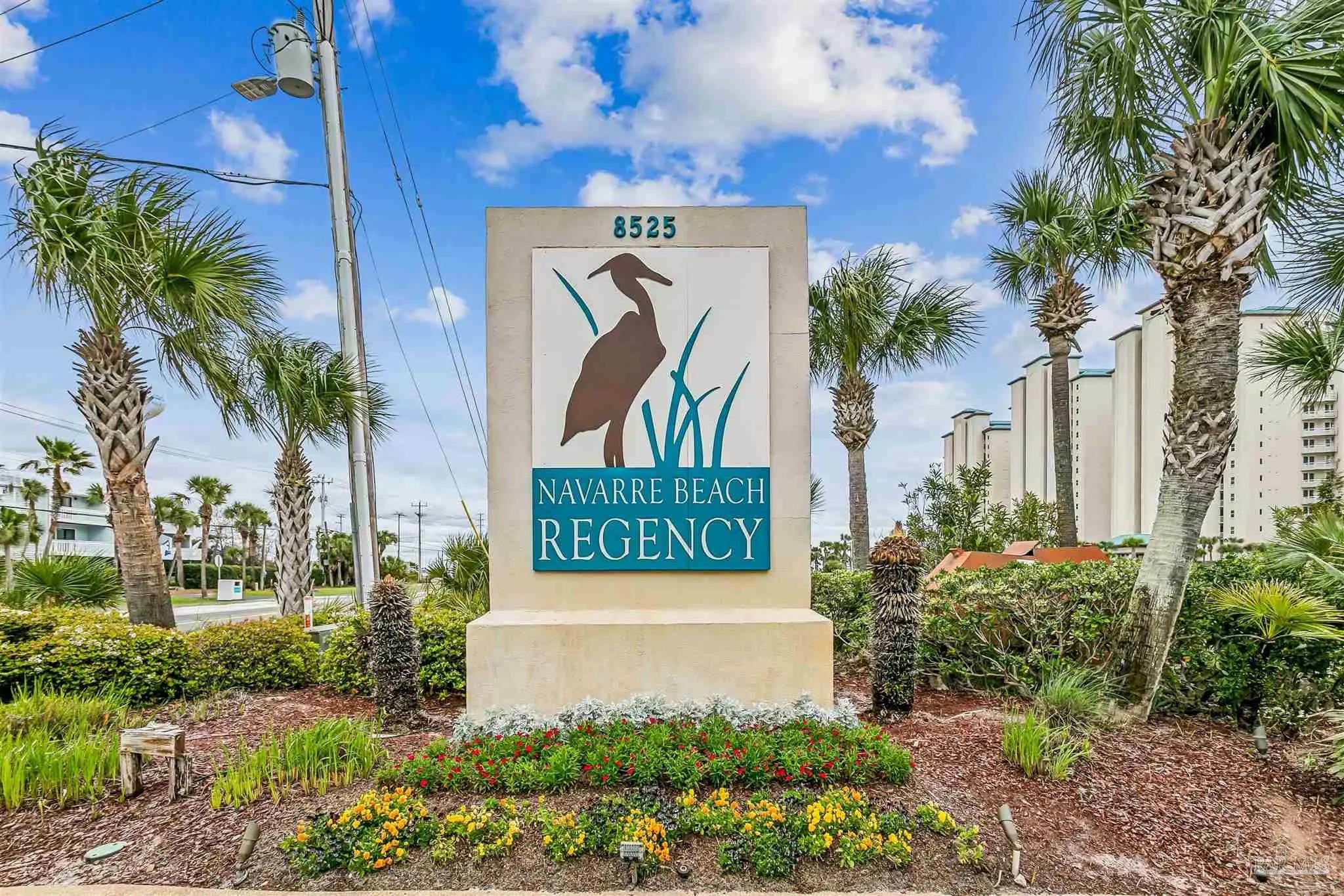 Welcome to Gulf-front living at its finest! This two bedroom, two bathroom, end unit at Navarre Beach Regency Condominiums is located on the East end of the building and boasts the most amazing, unobstructed views of the dunes, Gulf, and the iconic Navarre Beach Pier. This 1st floor residence also comes with its own covered parking space. Inside, you'll discover over 1,500 SqFt of meticulously designed living space with an open concept Main living area and tons of updated finishes - including 9ft ceilings with elegant crown molding, LVP and tiled flooring throughout, newly replaced slider doors and floor to ceiling windows that showcase the expansive private balcony overlooking the dunes and the sparkling Emerald waters that Navarre Beach is known for, plantation shutters, new appliances in the gourmet kitchen, custom cabinetry, granite countertops, built-in wine fridge, completely remodeled bathrooms, updated light fixtures, 2025 HVAC system, and more! The primary suite features its own access to the balcony, floor to ceiling windows with motorized shade to reveal breathtaking waterviews from the comfort of your own bed, as well as an en-suite bathroom with a gorgeous tiled walk-in shower. Beyond the unit itself, the Navarre Beach Regency features a heated, gulf-front swimming pool, private beach access, a fitness center, a community room, BBQ grills, and more!