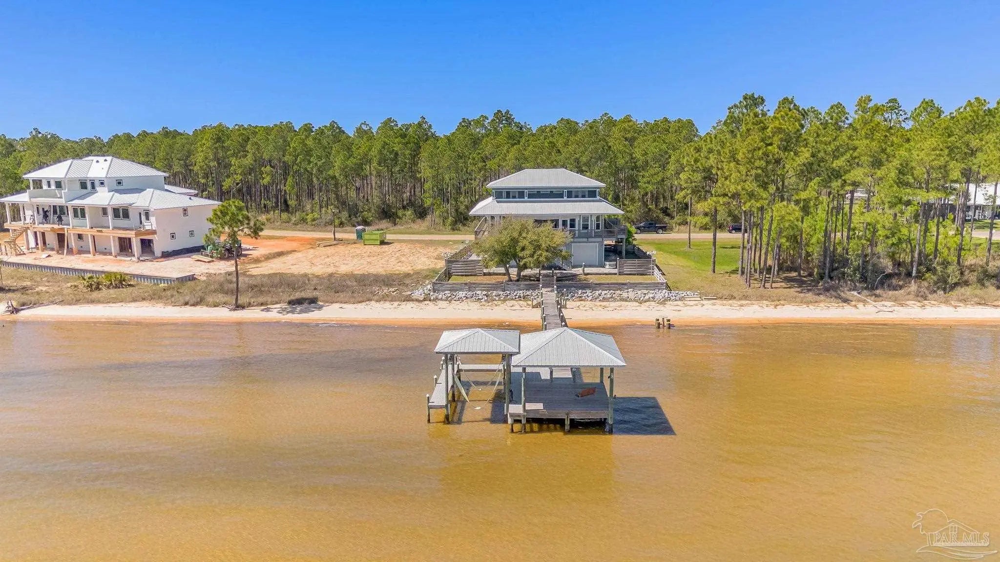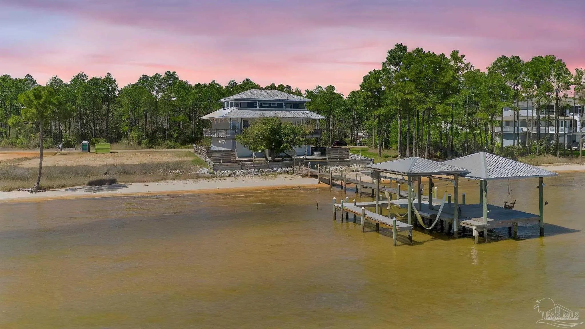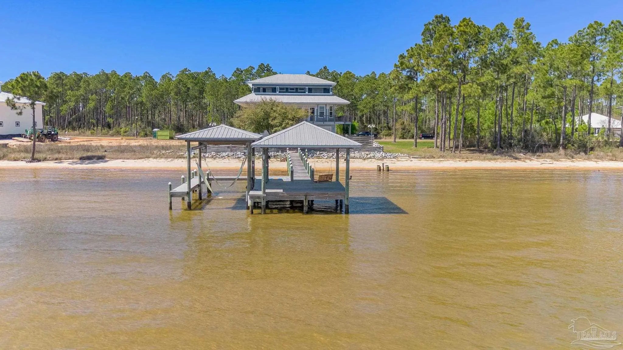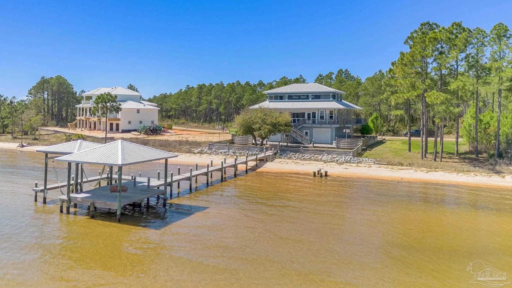 Sunrise to Sunset, the incredible waterfront views. On a clear day you are able to see all the way to Navarre and Midway. Custom built in 2016 this 3 bed 2.5 bath home is a gem you can spend great time with friends and family. Located in the gated community of Sea Pines. You walk in to a grand view of the living room with a kitchen that is meant to host and still feel included. The living room has built in bookshelves along with an electric fireplace. The kitchen has custom cabinetry along with quartz countertops, a large island with cabinets on both sides, a kitchen bar with an under counter ice maker, a second larger island with a sink. The larger island is counter height in the kitchen and bar stool height facing the living room. The main bedroom has a large walk-in closet along with a massive attached bathroom. Large luxury step in shower. Double sink vanity with another walk-in closet. Upstairs are two large bedrooms with an attached bathroom and wet-bar. Both have walk-in closets. The home was built with decking that wraps around the entire home so you do not miss a view. Main deck is screened in with sunshades. Upper deck is screened in and has a built in perch along with storm shutters to close it up. Large boat dock with boat lift. Built in swing on the covered boat dock lets you rest and enjoy the views. There is an elevator that runs from the garage up to the top floor making it easy to bring luggage, or heavy items up and down the home. Large two stall double sided garage with built in shop space and or office space. Must truly see to enjoy.
