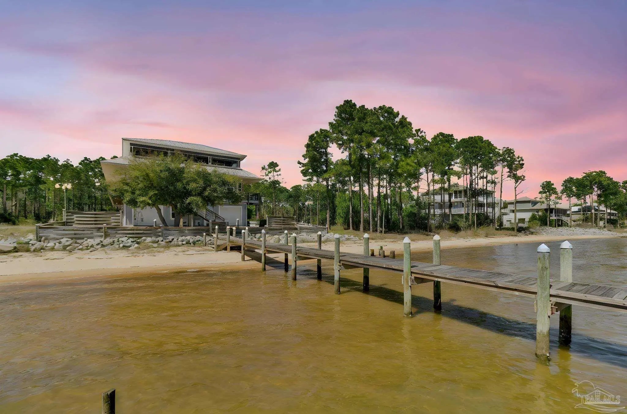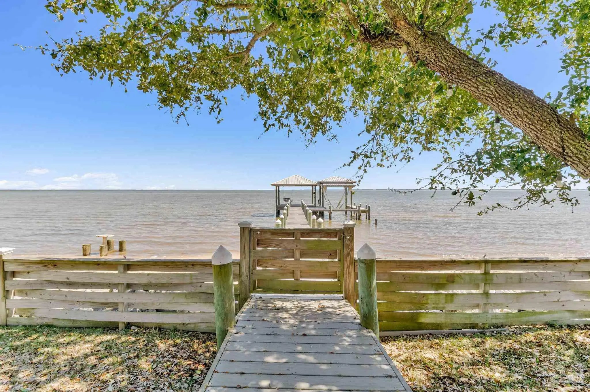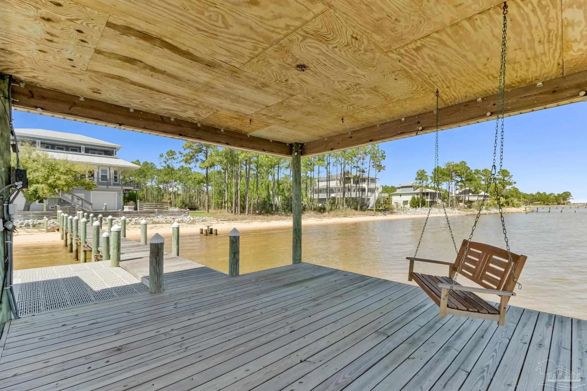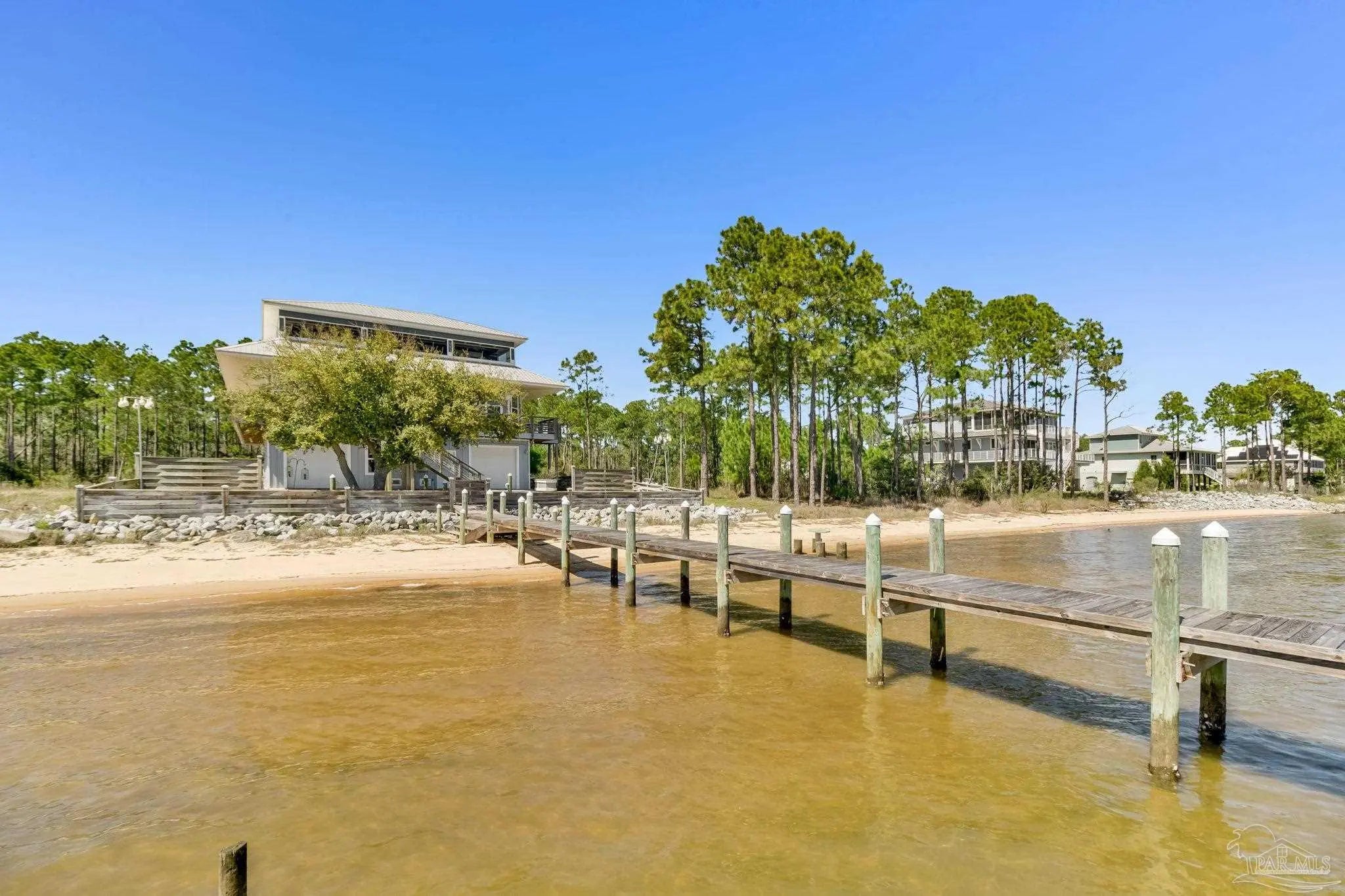 Sunrise to Sunset, the incredible waterfront views. On a clear day you are able to see all the way to Navarre and Midway. Custom built in 2016 this 3 bed 2.5 bath home is a gem you can spend great time with friends and family. Located in the gated community of Sea Pines. You walk in to a grand view of the living room with a kitchen that is meant to host and still feel included. The living room has built in bookshelves along with an electric fireplace. The kitchen has custom cabinetry along with quartz countertops, a large island with cabinets on both sides, a kitchen bar with an under counter ice maker, a second larger island with a sink. The larger island is counter height in the kitchen and bar stool height facing the living room. The main bedroom has a large walk-in closet along with a massive attached bathroom. Large luxury step in shower. Double sink vanity with another walk-in closet. Upstairs are two large bedrooms with an attached bathroom and wet-bar. Both have walk-in closets. The home was built with decking that wraps around the entire home so you do not miss a view. Main deck is screened in with sunshades. Upper deck is screened in and has a built in perch along with storm shutters to close it up. Large boat dock with boat lift. Built in swing on the covered boat dock lets you rest and enjoy the views. There is an elevator that runs from the garage up to the top floor making it easy to bring luggage, or heavy items up and down the home. Large two stall double sided garage with built in shop space and or office space. Must truly see to enjoy.