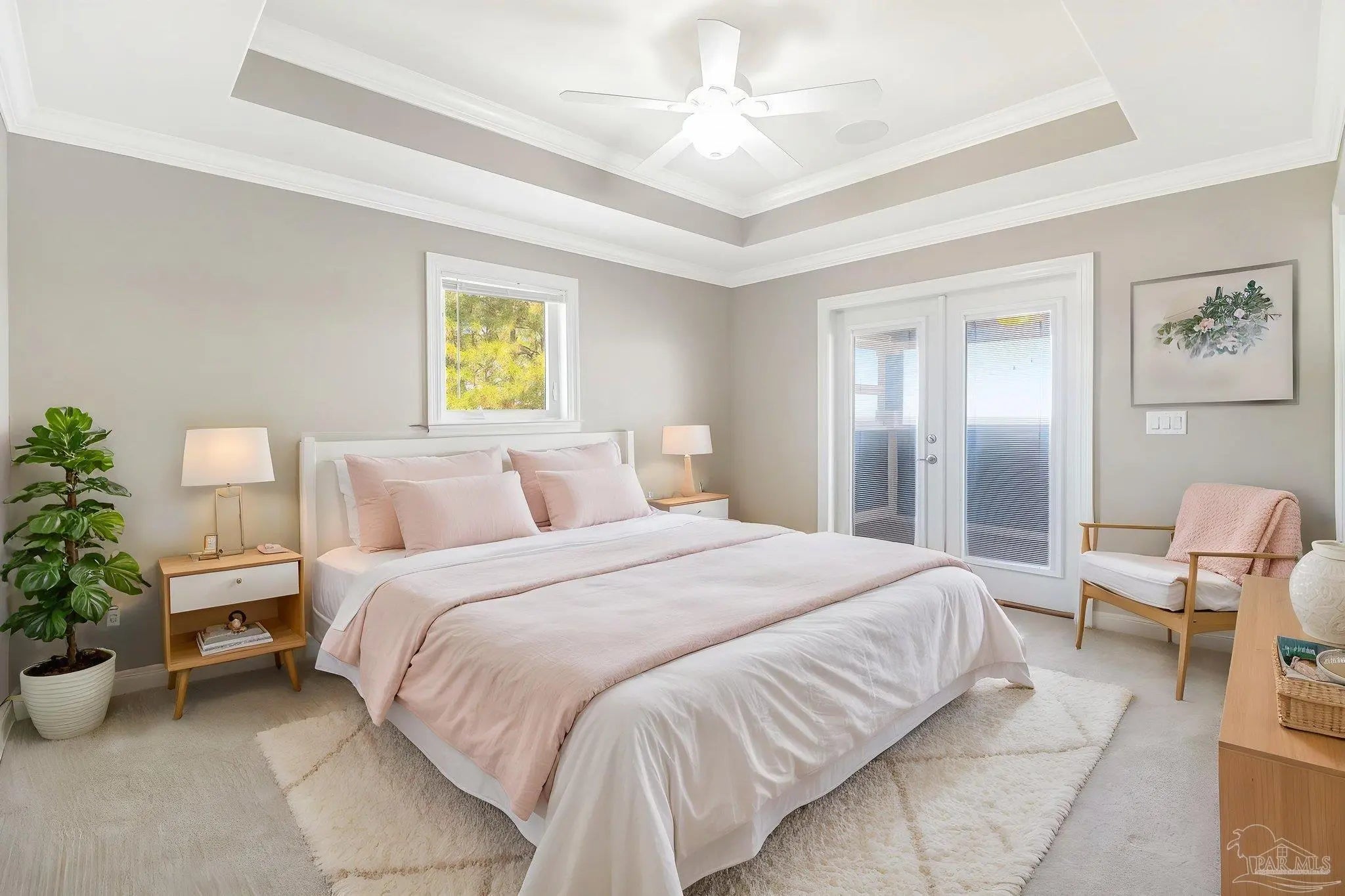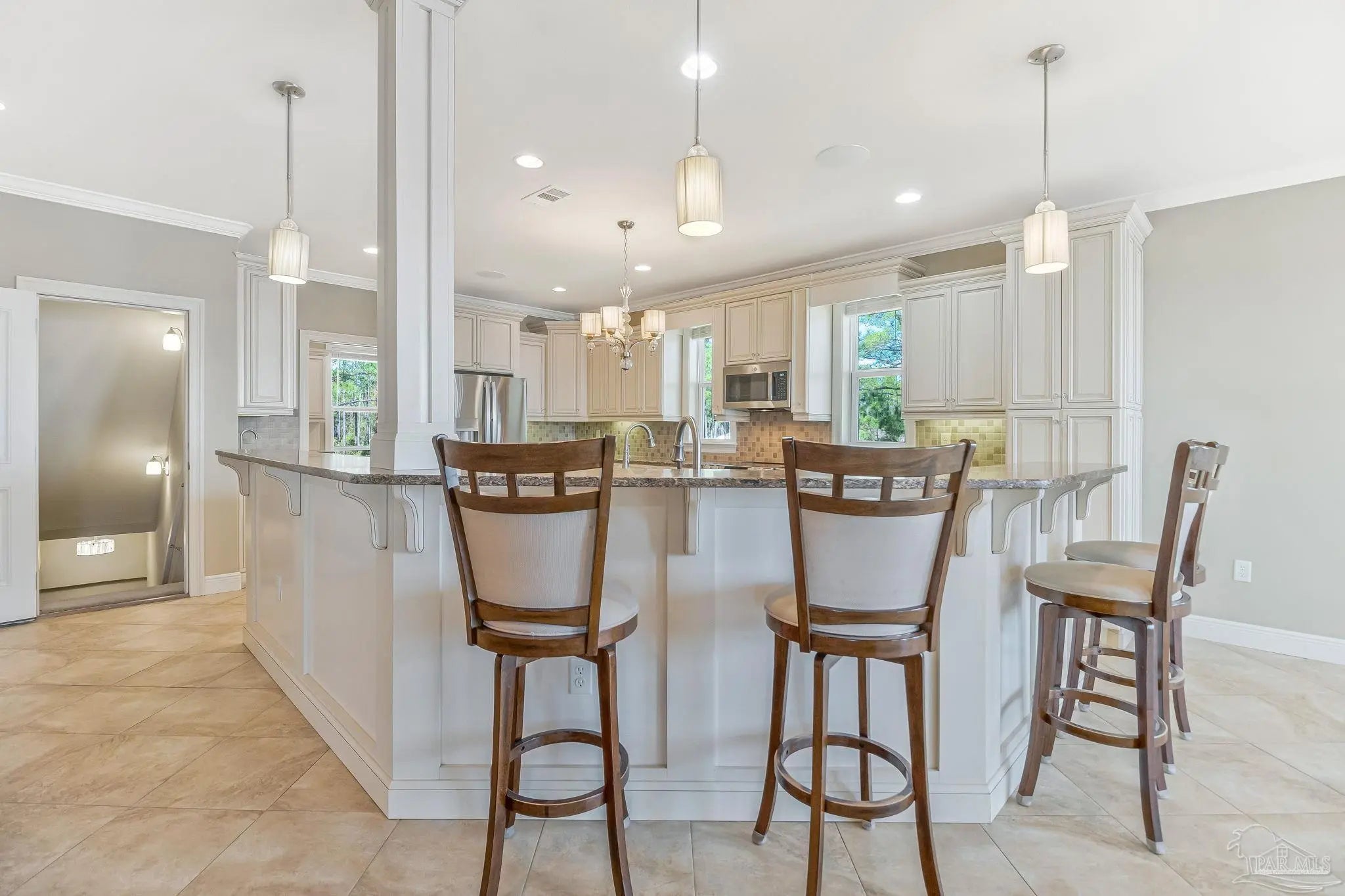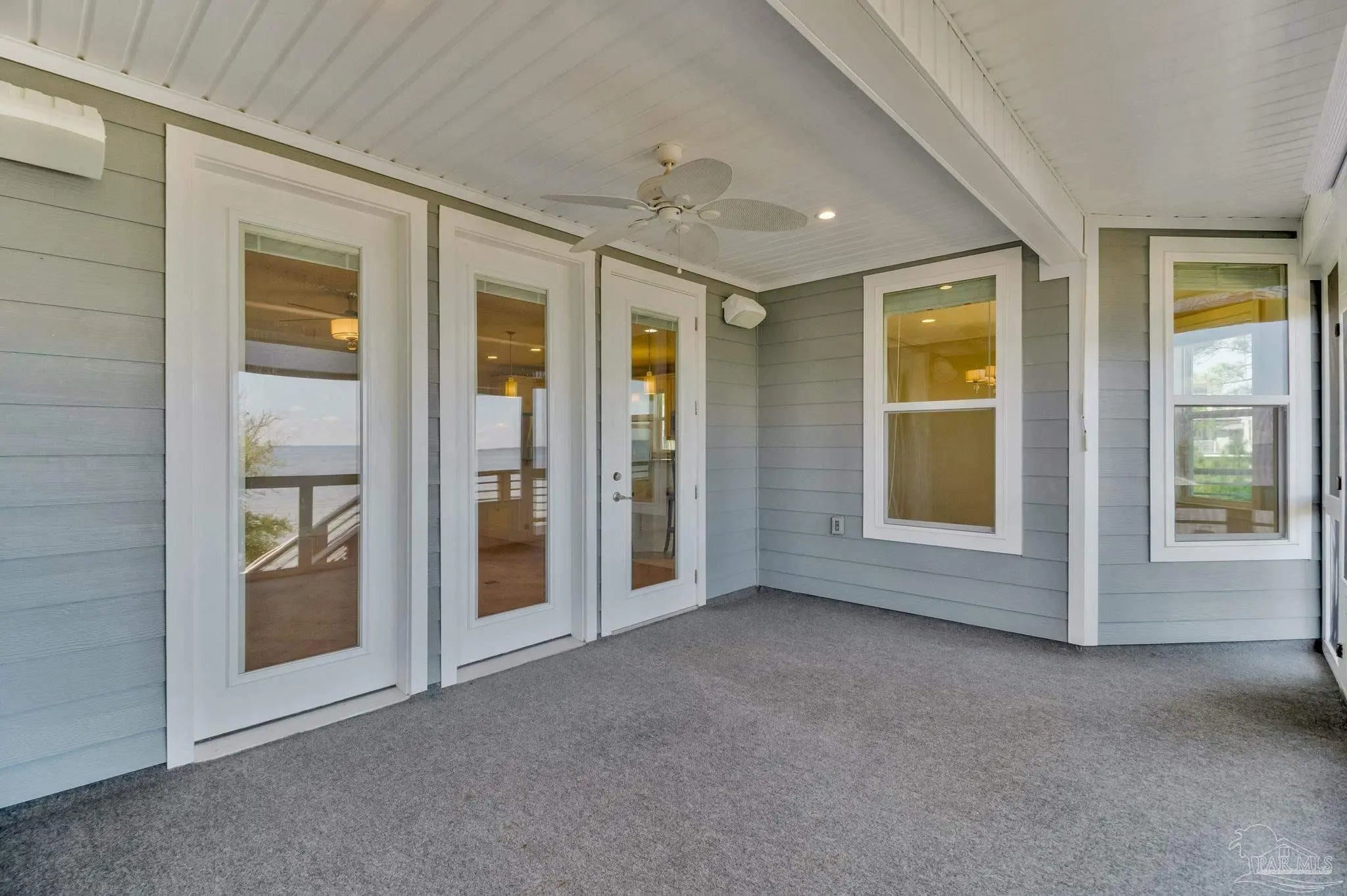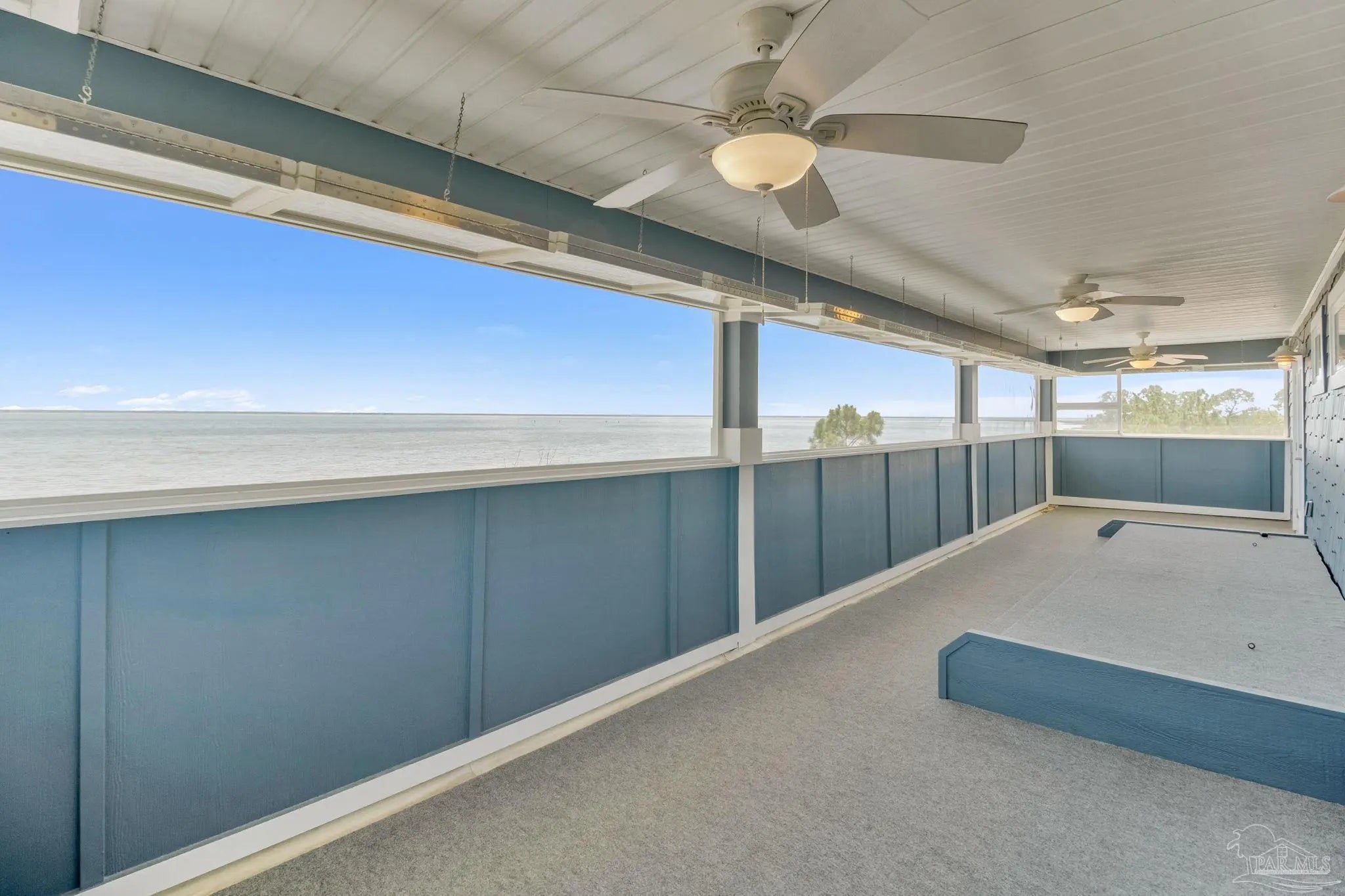 Sunrise to Sunset, the incredible waterfront views. On a clear day you are able to see all the way to Navarre and Midway. Custom built in 2016 this 3 bed 2.5 bath home is a gem you can spend great time with friends and family. Located in the gated community of Sea Pines. You walk in to a grand view of the living room with a kitchen that is meant to host and still feel included. The living room has built in bookshelves along with an electric fireplace. The kitchen has custom cabinetry along with quartz countertops, a large island with cabinets on both sides, a kitchen bar with an under counter ice maker, a second larger island with a sink. The larger island is counter height in the kitchen and bar stool height facing the living room. The main bedroom has a large walk-in closet along with a massive attached bathroom. Large luxury step in shower. Double sink vanity with another walk-in closet. Upstairs are two large bedrooms with an attached bathroom and wet-bar. Both have walk-in closets. The home was built with decking that wraps around the entire home so you do not miss a view. Main deck is screened in with sunshades. Upper deck is screened in and has a built in perch along with storm shutters to close it up. Large boat dock with boat lift. Built in swing on the covered boat dock lets you rest and enjoy the views. There is an elevator that runs from the garage up to the top floor making it easy to bring luggage, or heavy items up and down the home. Large two stall double sided garage with built in shop space and or office space. Must truly see to enjoy.