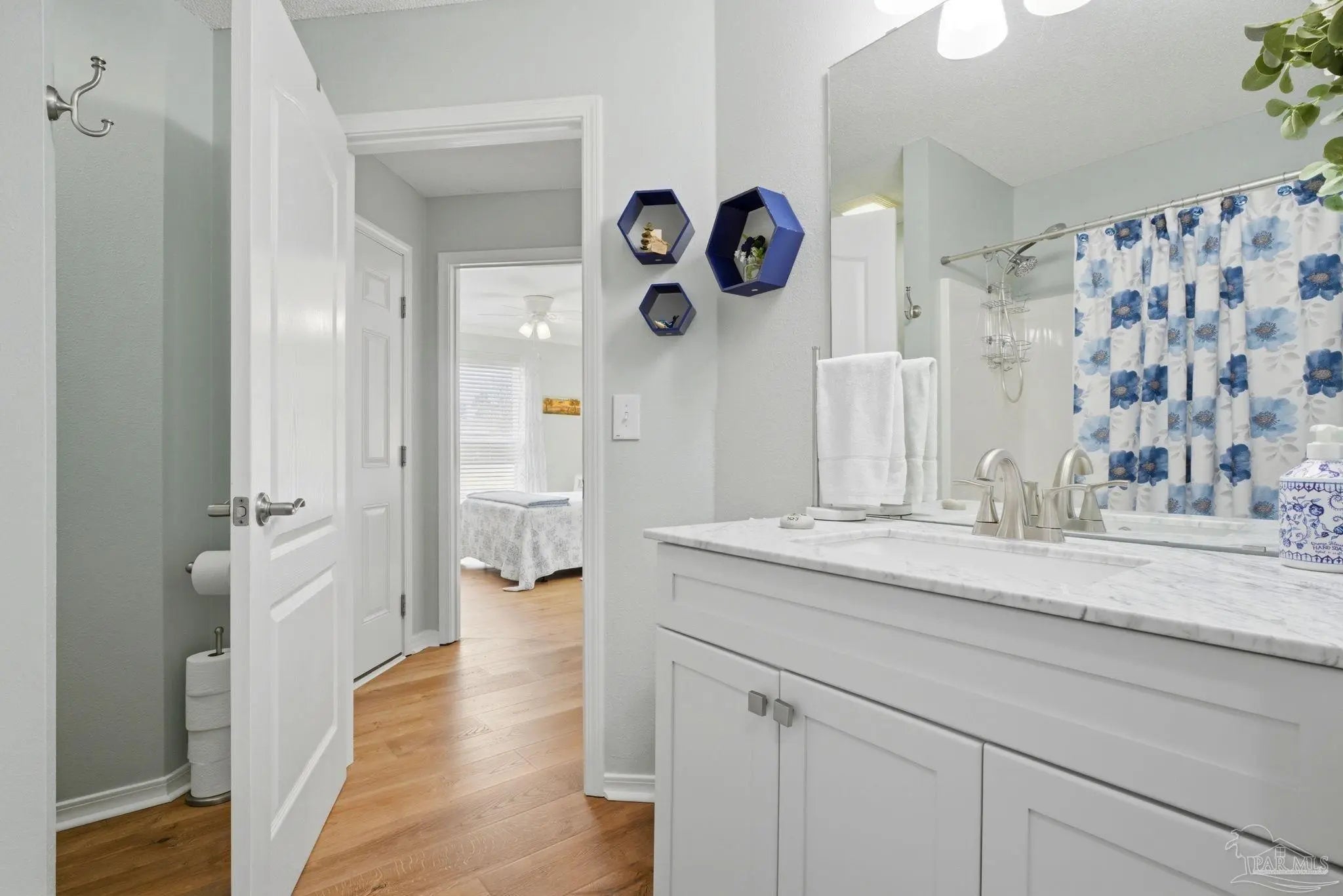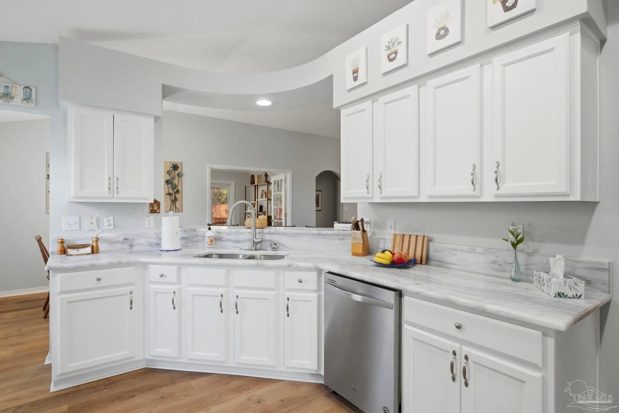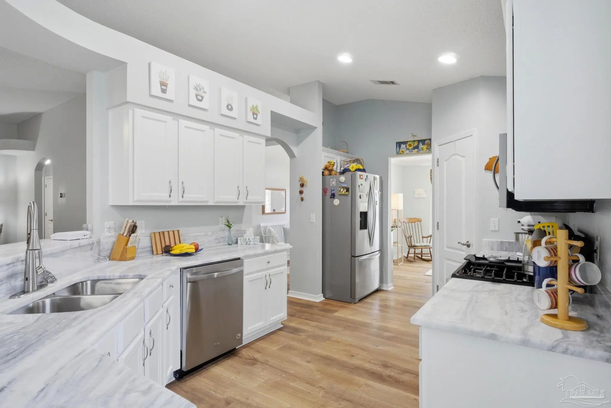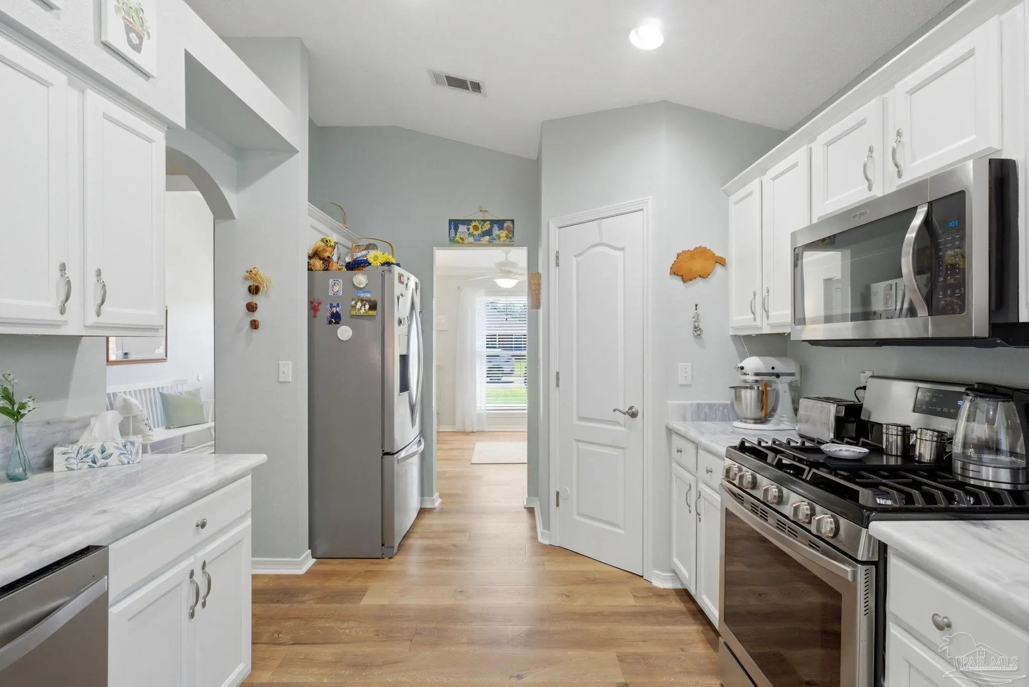 Come see this gorgeous well maintained brick home with open and split floor plan in Millview Estates on Pensacola's west side. Recent thoughtful upgrades to keep the home in wonderful condition such as new LVP flooring throughout, fresh paint, updated bathrooms, new lighting fixtures throughout and all new impact windows! The extra large primary en suite offers 2 walk in closets. The primary bath has double vanities, water closet and walk in shower. Check out the bonus space just through the French doors off of the living room. This home features gas for heat and cooking which is such a unique feature in this area. When you step out back, you'll find a screened in porch that leads to the fully fenced backyard. Conveniently located to NAS Pensacola, beaches, and easy access to Downtown Pensacola, this home truly has it all.