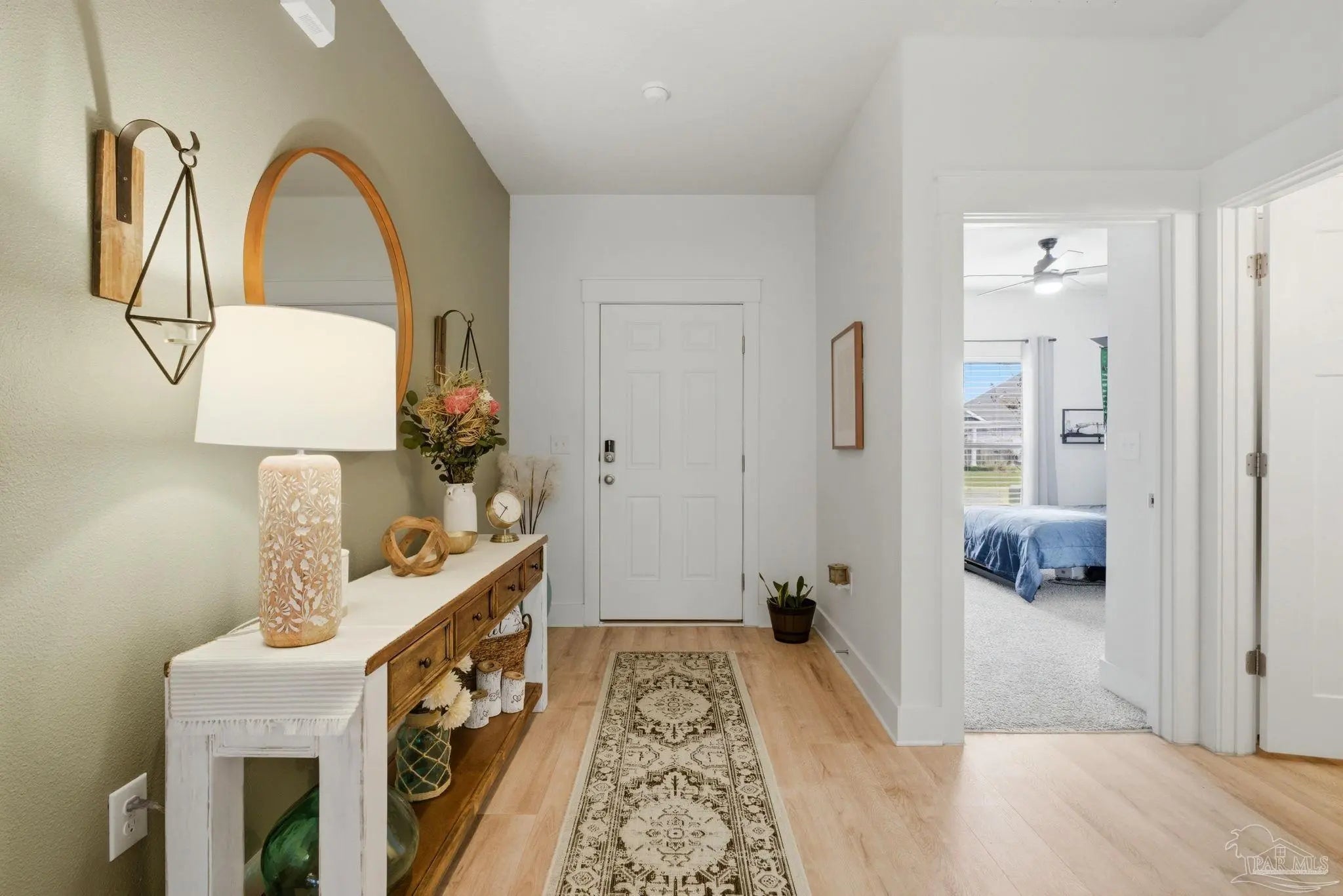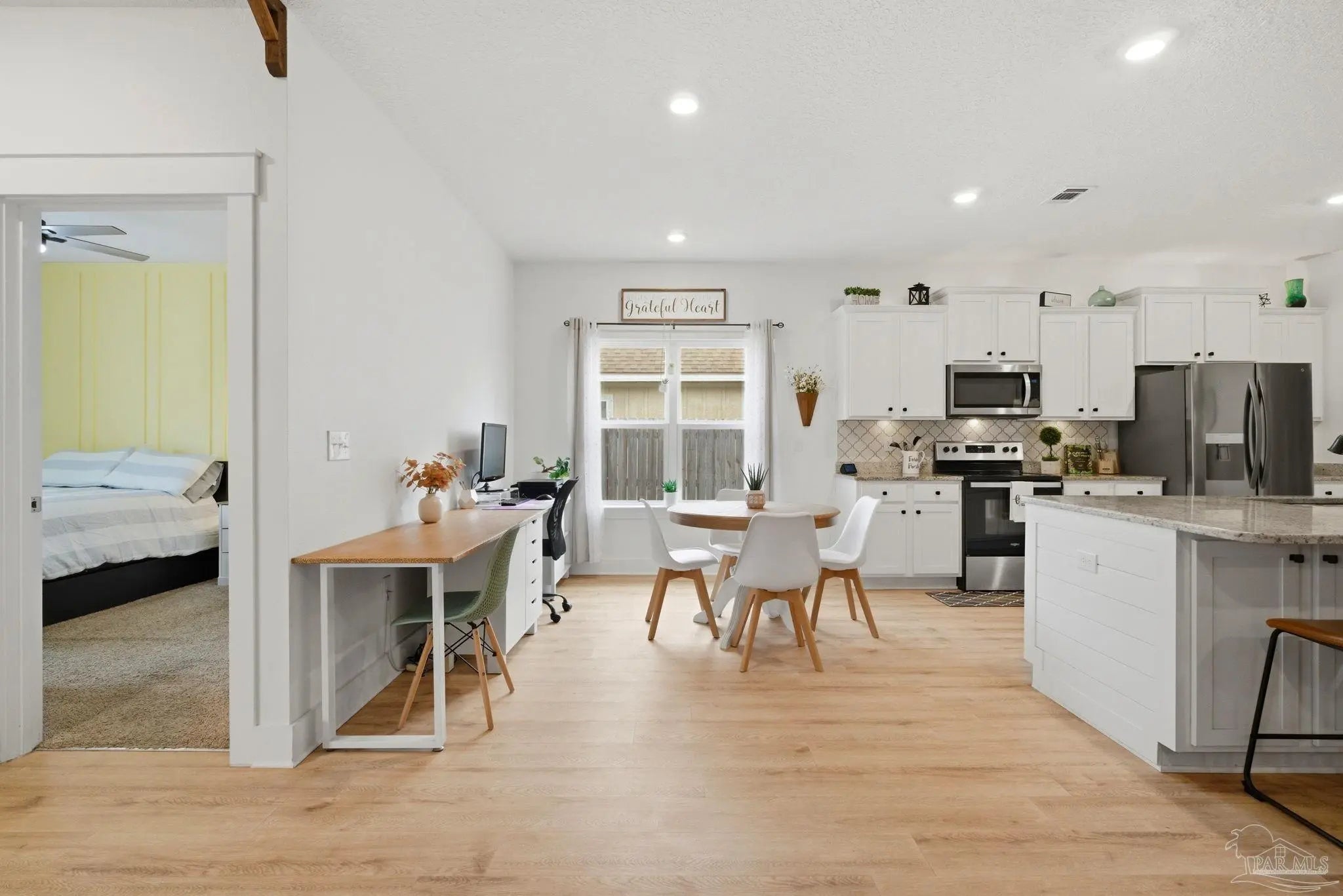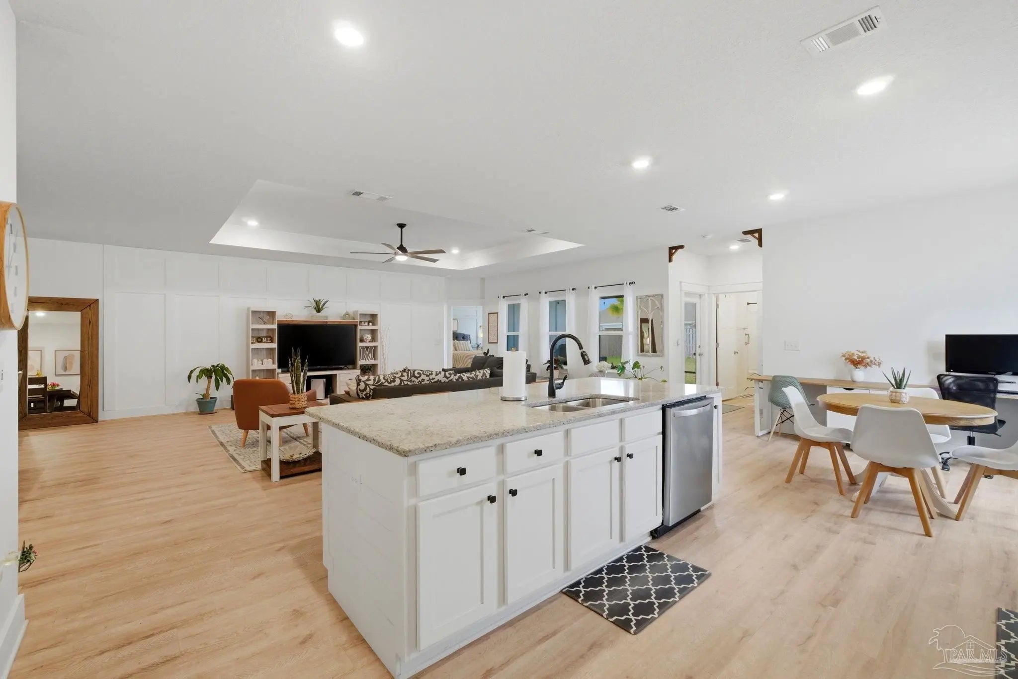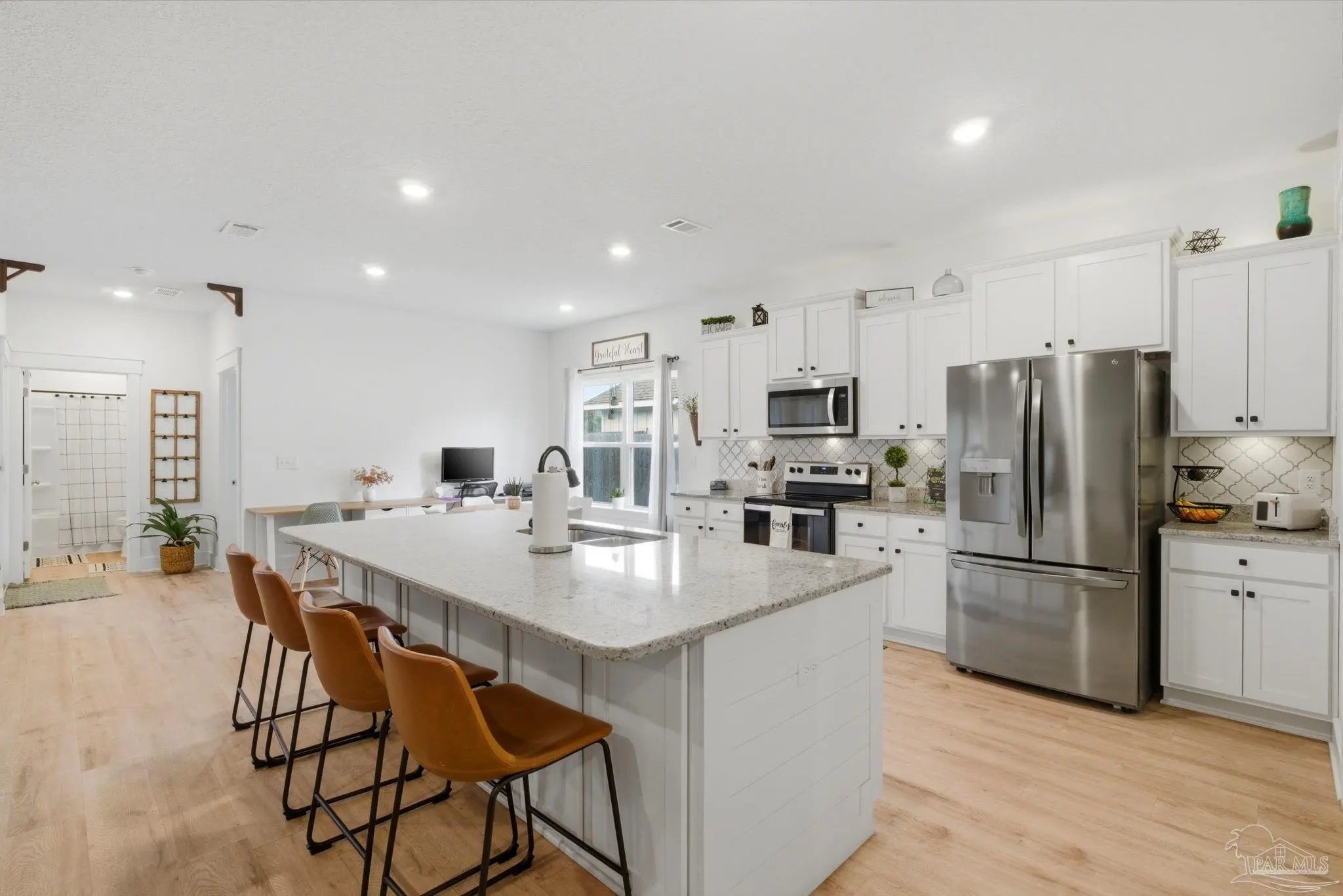 Welcome to the kind of home buyers are searching for—bright, open, & thoughtfully designed for the way people actually live, w/added opportunity of a low-interest-rate VA assumable loan for qualified buyers. This 4-bedroom, 3-bath, 3-car garage home offers over 2,300 square feet of well-planned space, including a private guest suite tucked away in its own corner—ideal for visitors, multigenerational living, or a quiet home office. Inside, you’ll find beautiful high-end LVP flooring throughout the main living areas, soaring tray ceilings, & an expansive open-concept layout. The living room flows seamlessly into a well-designed kitchen featuring a large island w/ample seating, abundant cabinetry, updated hardware, & a layout perfect for everyday living & entertaining. A generously sized pantry with solid wood shelving (no wire) adds durability and storage. Thoughtful upgrades throughout—including added trim detail and stylish accent walls—bring character & a custom feel. A versatile flex space just off the kitchen works well as an office, playroom, or additional dining area. The primary suite, split for privacy, offers generous space, natural light, & a well-appointed en-suite bath w/dual vanities, a walk-in shower, a soaking tub, water closet, & a spacious closet w/upgraded built-in organizers. The laundry room includes built-in storage cabinets and an added shelf for organization. Step outside to a screened, covered porch overlooking a spacious backyard that stands out among others in the neighborhood, offering a larger footprint, existing privacy fencing, & room to add a pool or create your ideal outdoor space. Gutters have been added for functionality & peace of mind. Located in Forest Bay Estates w/access to a community pool, clubhouse, & gathering spaces. Ideally positioned between Gulf Breeze and Navarre w/easy access to Navarre Beach, Pensacola Beach, Hurlburt Field, Eglin AFB, plus convenient access to both Pensacola and Destin-Fort Walton airports.