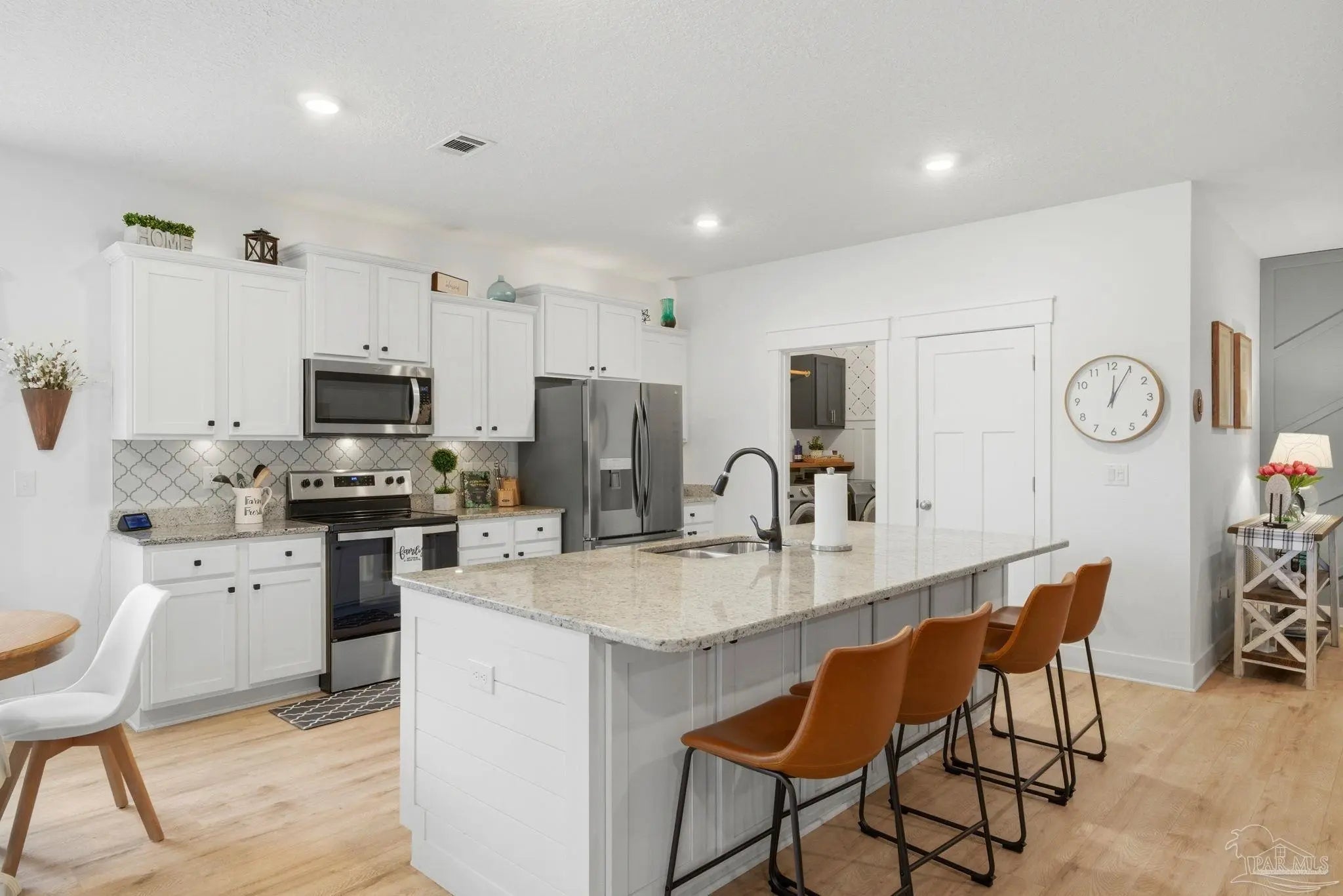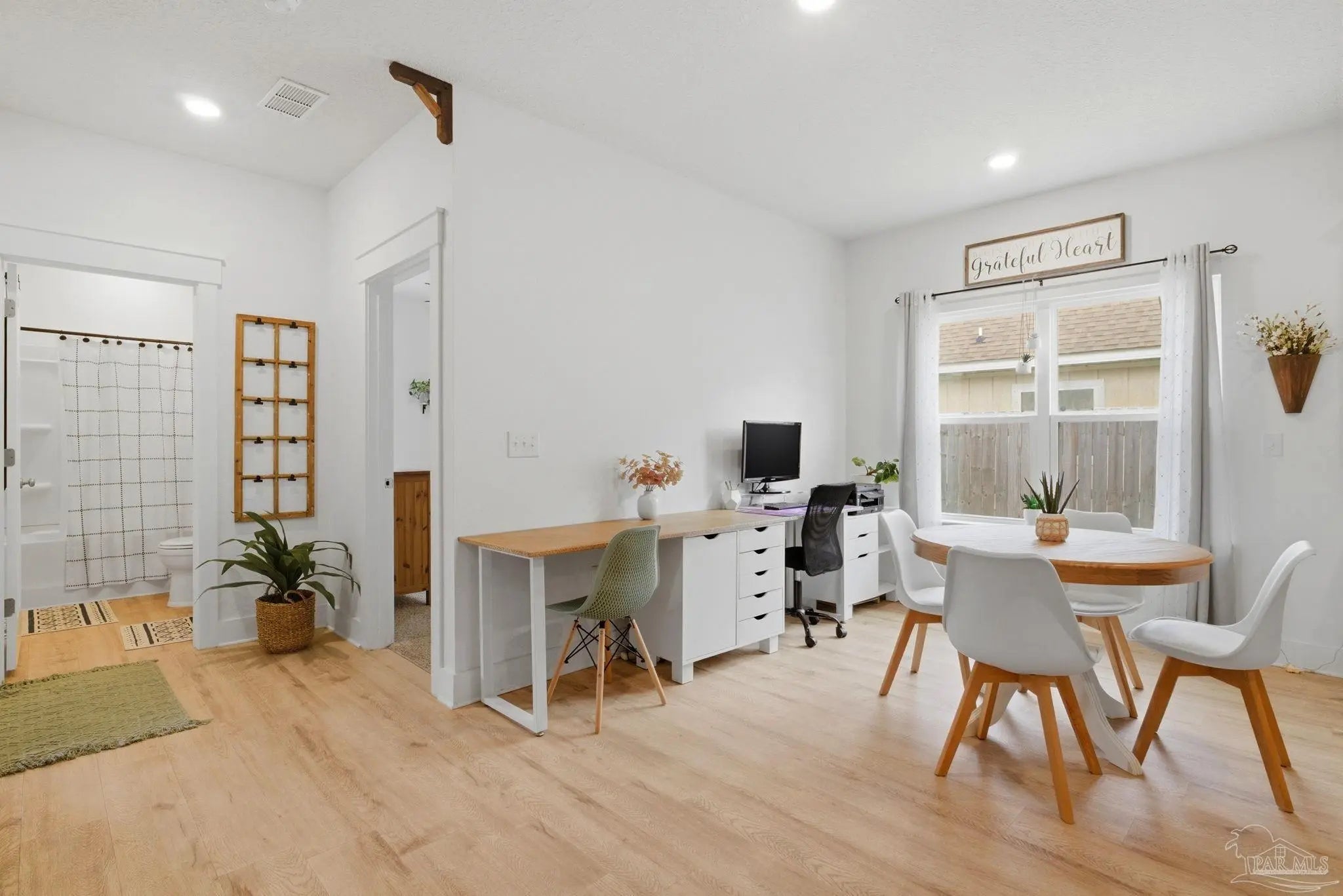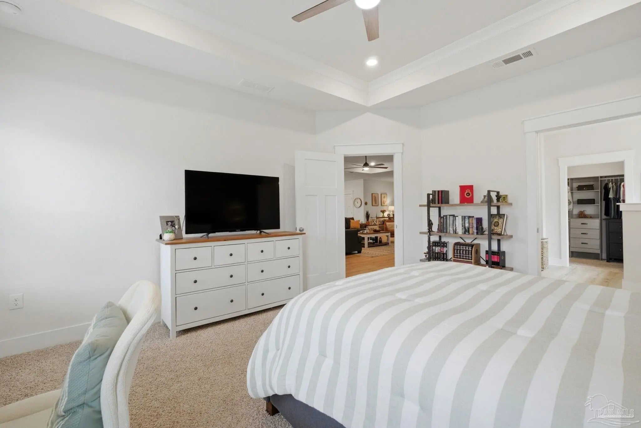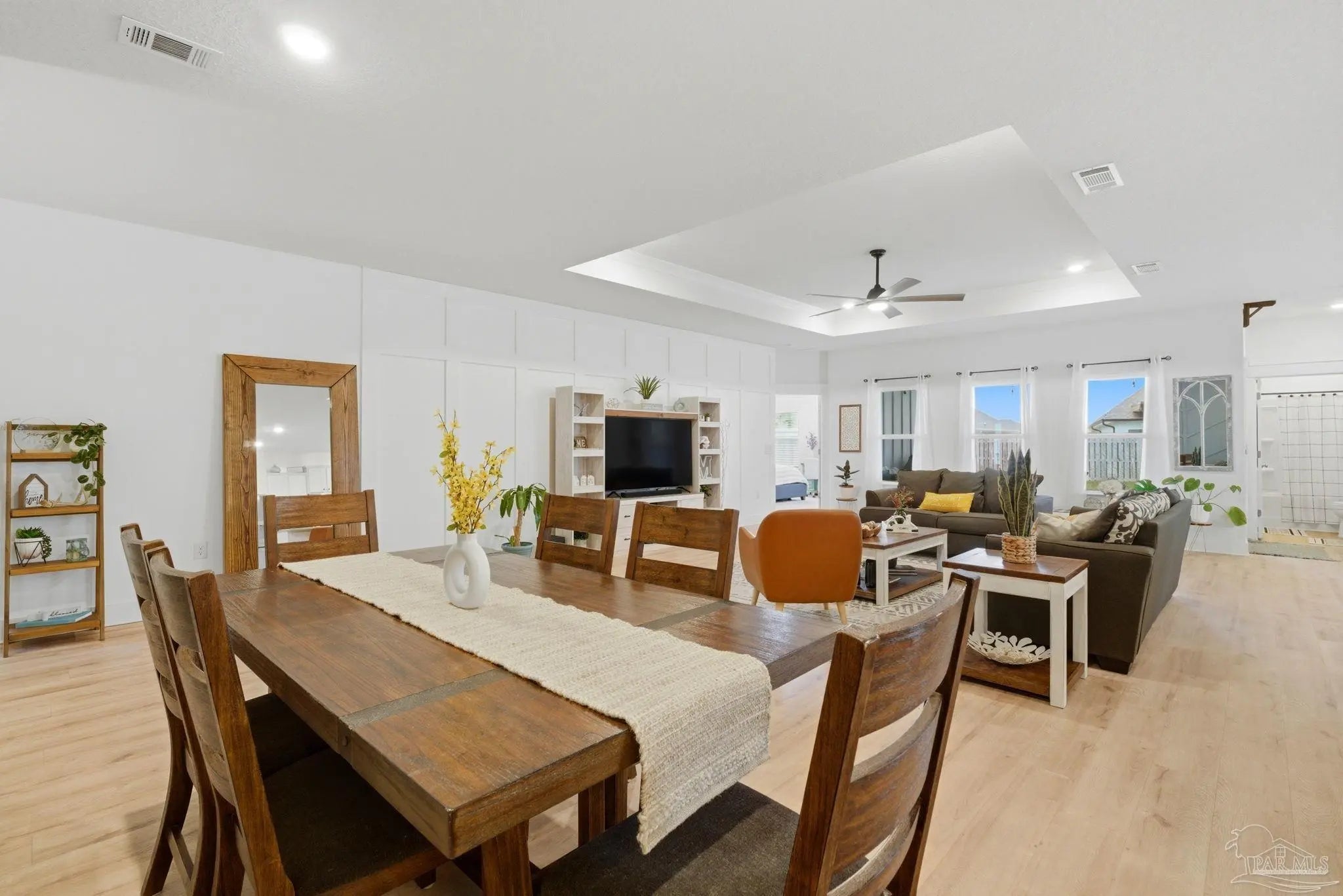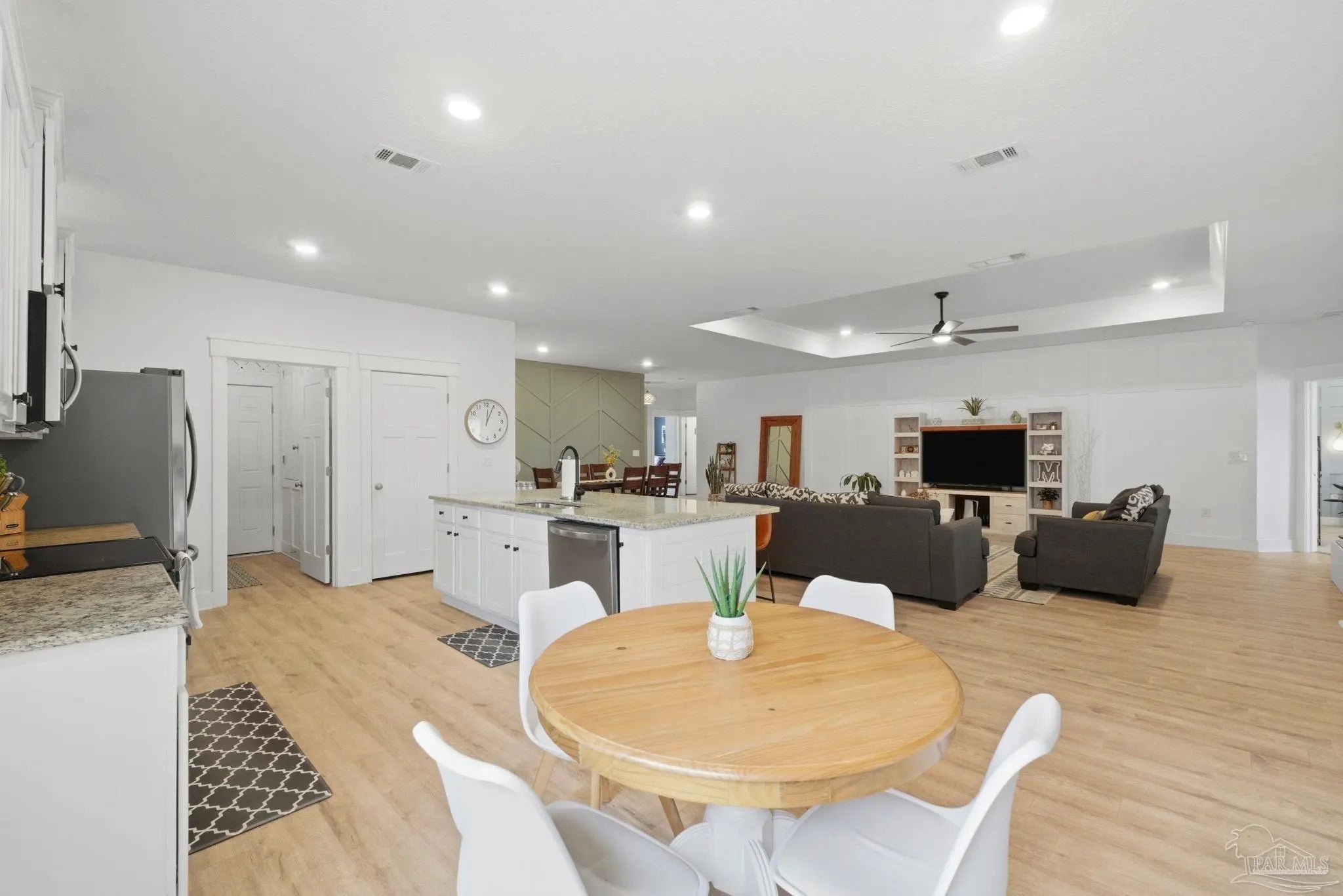 Welcome to the kind of home buyers are searching for—bright, open, & thoughtfully designed for the way people actually live, w/added opportunity of a low-interest-rate VA assumable loan for qualified buyers. This 4-bedroom, 3-bath, 3-car garage home offers over 2,300 square feet of well-planned space, including a private guest suite tucked away in its own corner—ideal for visitors, multigenerational living, or a quiet home office. Inside, you’ll find beautiful high-end LVP flooring throughout the main living areas, soaring tray ceilings, & an expansive open-concept layout. The living room flows seamlessly into a well-designed kitchen featuring a large island w/ample seating, abundant cabinetry, updated hardware, & a layout perfect for everyday living & entertaining. A generously sized pantry with solid wood shelving (no wire) adds durability and storage. Thoughtful upgrades throughout—including added trim detail and stylish accent walls—bring character & a custom feel. A versatile flex space just off the kitchen works well as an office, playroom, or additional dining area. The primary suite, split for privacy, offers generous space, natural light, & a well-appointed en-suite bath w/dual vanities, a walk-in shower, a soaking tub, water closet, & a spacious closet w/upgraded built-in organizers. The laundry room includes built-in storage cabinets and an added shelf for organization. Step outside to a screened, covered porch overlooking a spacious backyard that stands out among others in the neighborhood, offering a larger footprint, existing privacy fencing, & room to add a pool or create your ideal outdoor space. Gutters have been added for functionality & peace of mind. Located in Forest Bay Estates w/access to a community pool, clubhouse, & gathering spaces. Ideally positioned between Gulf Breeze and Navarre w/easy access to Navarre Beach, Pensacola Beach, Hurlburt Field, Eglin AFB, plus convenient access to both Pensacola and Destin-Fort Walton airports.