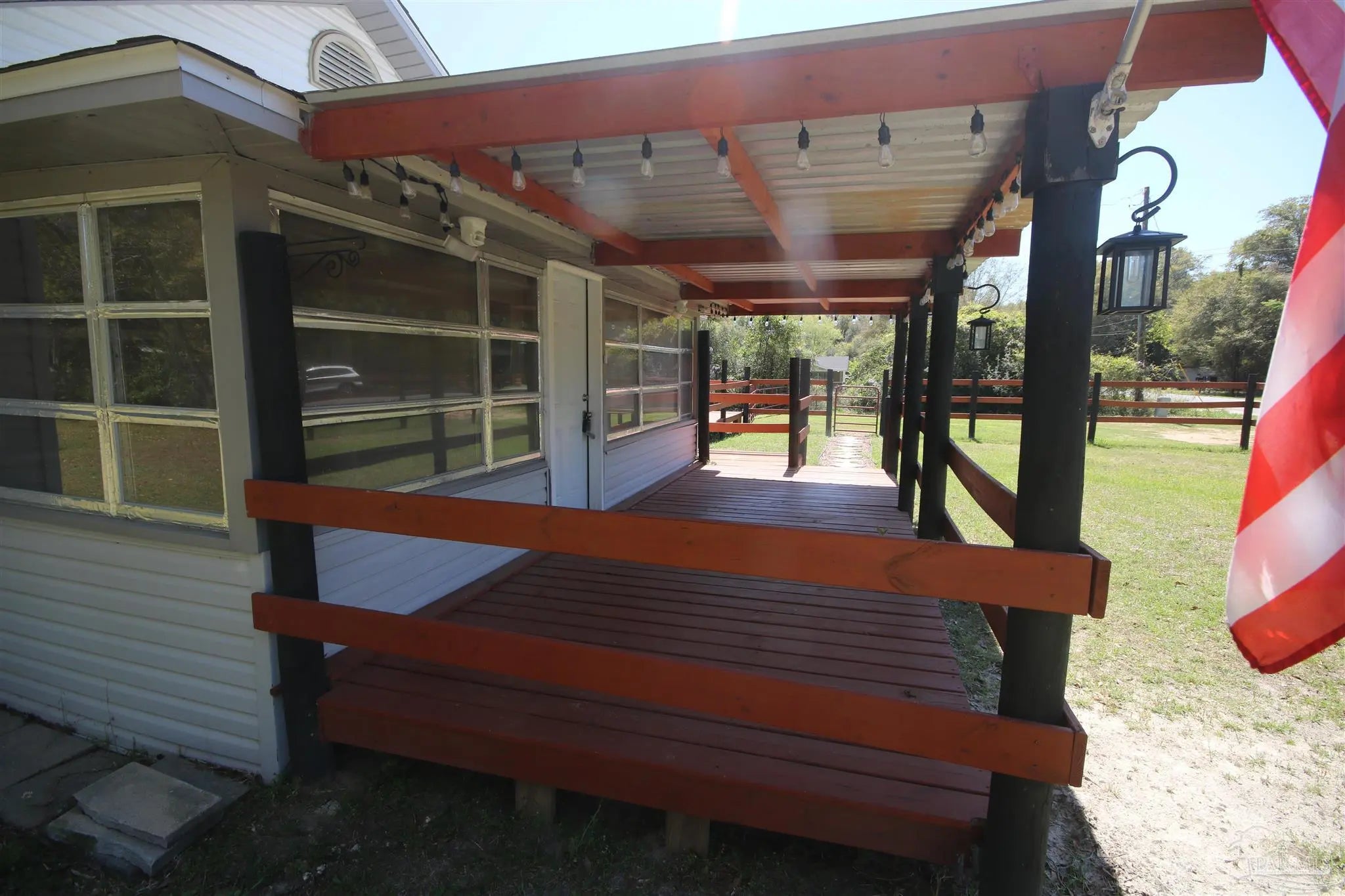 This charming home offers both comfort and functionality with inviting outdoor spaces and a flexible interior layout. An enclosed front porch that is heated and cooled provides year-round enjoyment and features laminate flooring. The open front porch with a metal roof and party lighting creates the perfect place to relax or entertain. Decking runs across the front of the home and continues along the side to the back, adding additional outdoor living space. The entire property is fenced and includes a 32-foot-wide double drive gate, offering easy access and added convenience. Inside, the living and dining areas are combined into one large open space, creating a welcoming atmosphere for gatherings. These areas feature laminate flooring that continues through the living room, dining room, kitchen, and bathrooms for a cohesive and low-maintenance finish. The kitchen offers bar seating, a pantry, built-in china cabinet, double stainless steel sink, Maytag range, and GE refrigerator. The door from the kitchen leads to a large laundry/utility room with access to a deck with party lighting, perfect for outdoor relaxation. Bedroom One is located just off the living room & includes a lighted ceiling fan & nice-sized closet. A large walk-in closet connects this bedroom to the spacious primary bedroom, which features direct access to the backyard and its own private deck. The hall bathroom features a tub/shower combination, single vanity, and elongated toilet. Carpet flooring is installed in all bedrooms for added comfort. Bedroom Three includes 2 closets and an ensuite bathroom, which also provides convenient access from the kitchen area. The backyard includes a 16x20 detached garage/workshop equipped with a roll-up garage door, service door, electricity, shop lighting, and a ceiling fan. A 10x16 lean-to on one side of the workshop offers additional covered storage. Gardeners will appreciate the two separate water sources in the yard, making watering & outdoor projects easy.