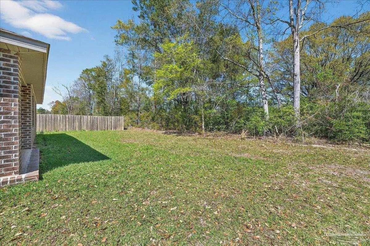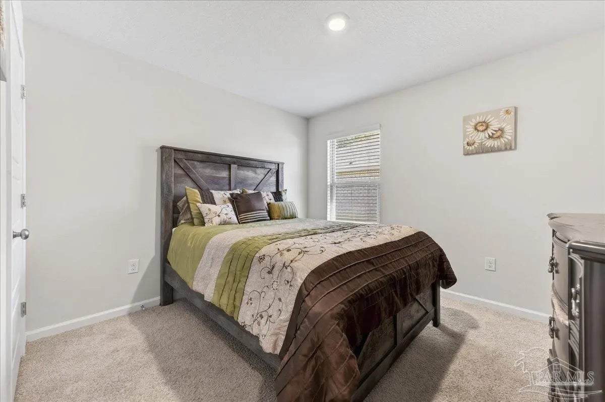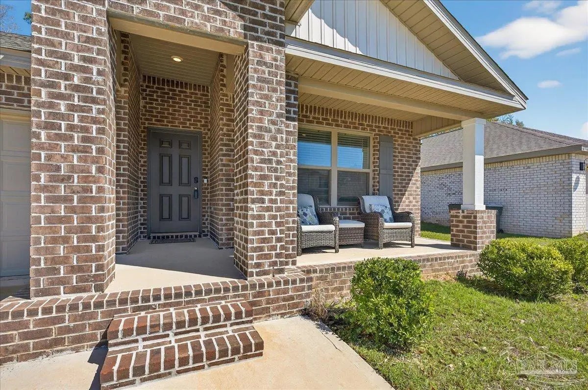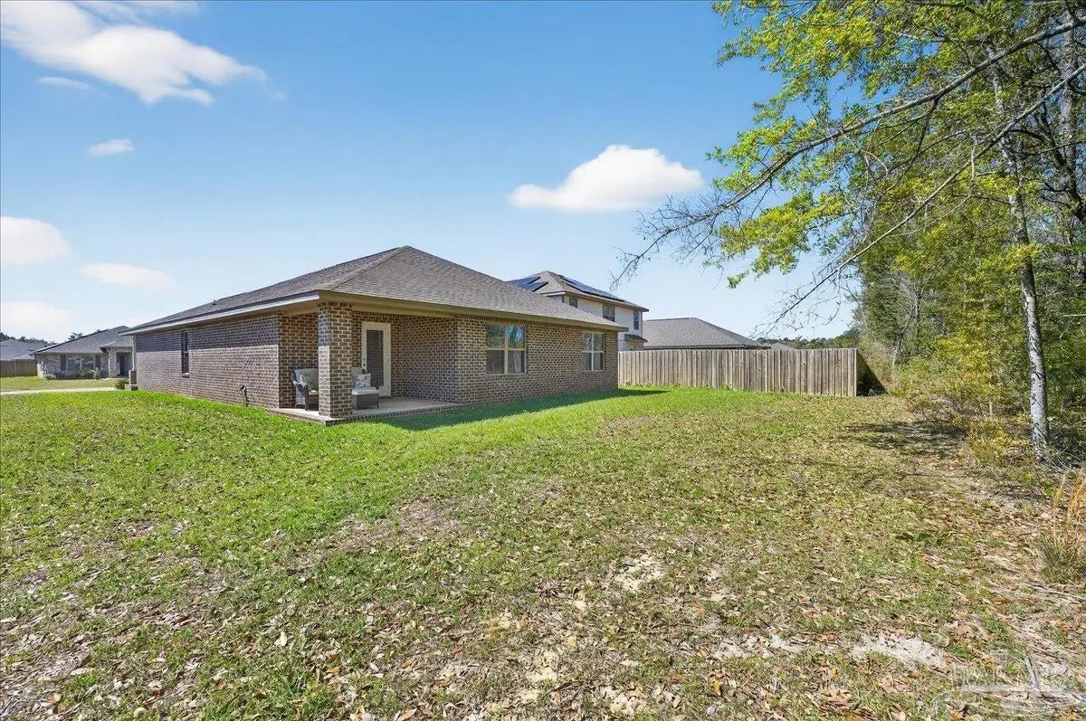 MOVE-IN READY! This is a beautifully maintained 4-bedroom, 2-bathroom was built in 2022 and nestled in a quiet, well-kept neighborhood. This home is ideally located near I-10, Navy Federal Credit Union, and local schools. Step inside to a bright, open-concept layout featuring a neutral color palette, recessed lighting, and seamless flow between the living, dining, and kitchen areas. The kitchen is a standout with its large granite-topped island, white shaker-style soft-close cabinets, stainless steel appliances, spacious pantry, and breakfast bar for additional seating. The split floorplan offers privacy, with a generously sized primary suite tucked away from the other bedrooms. The en-suite bathroom includes double vanities, a walk-in shower, water closet, linen closet, and a large walk-in closet for plenty of storage. Three additional bedrooms are thoughtfully positioned throughout the home, each with carpeted flooring, with a full bathroom nearby with a tub/shower combo. Enjoy outdoor living with both front and rear covered patios, plus the added convenience of a 2-car garage. This home truly checks all the boxes, modern features, functional design, and a prime location all in one!