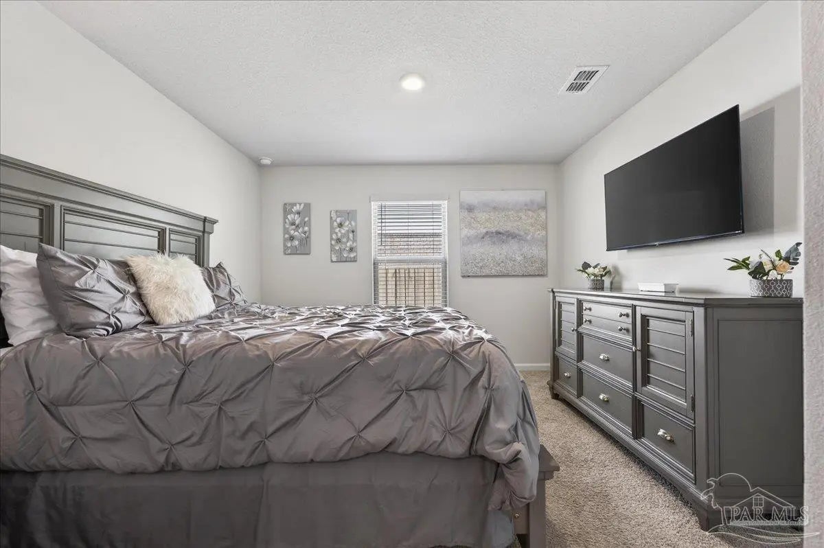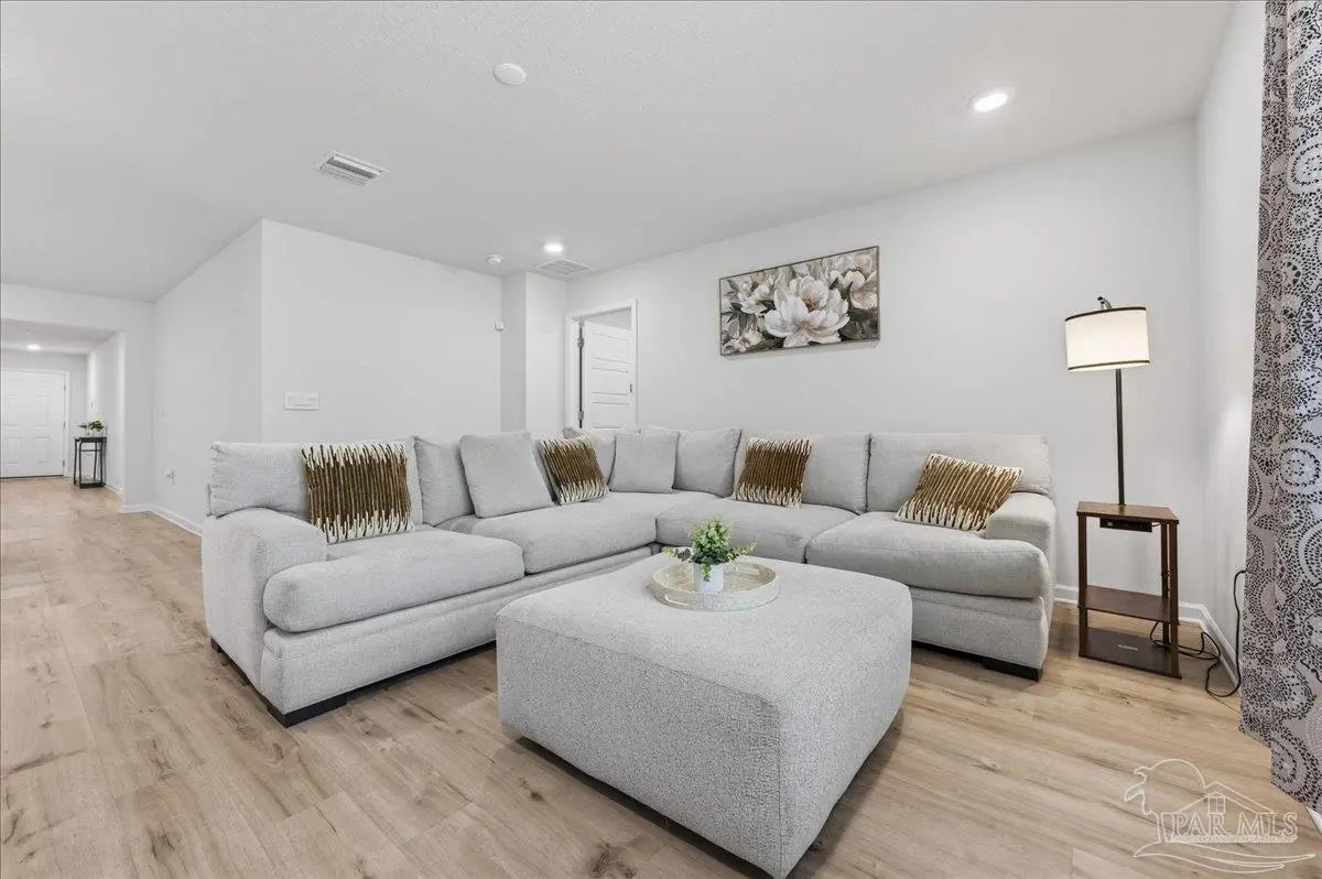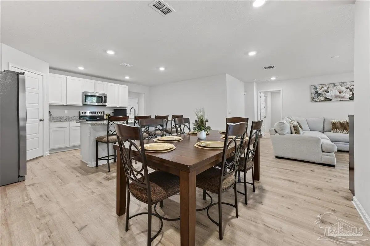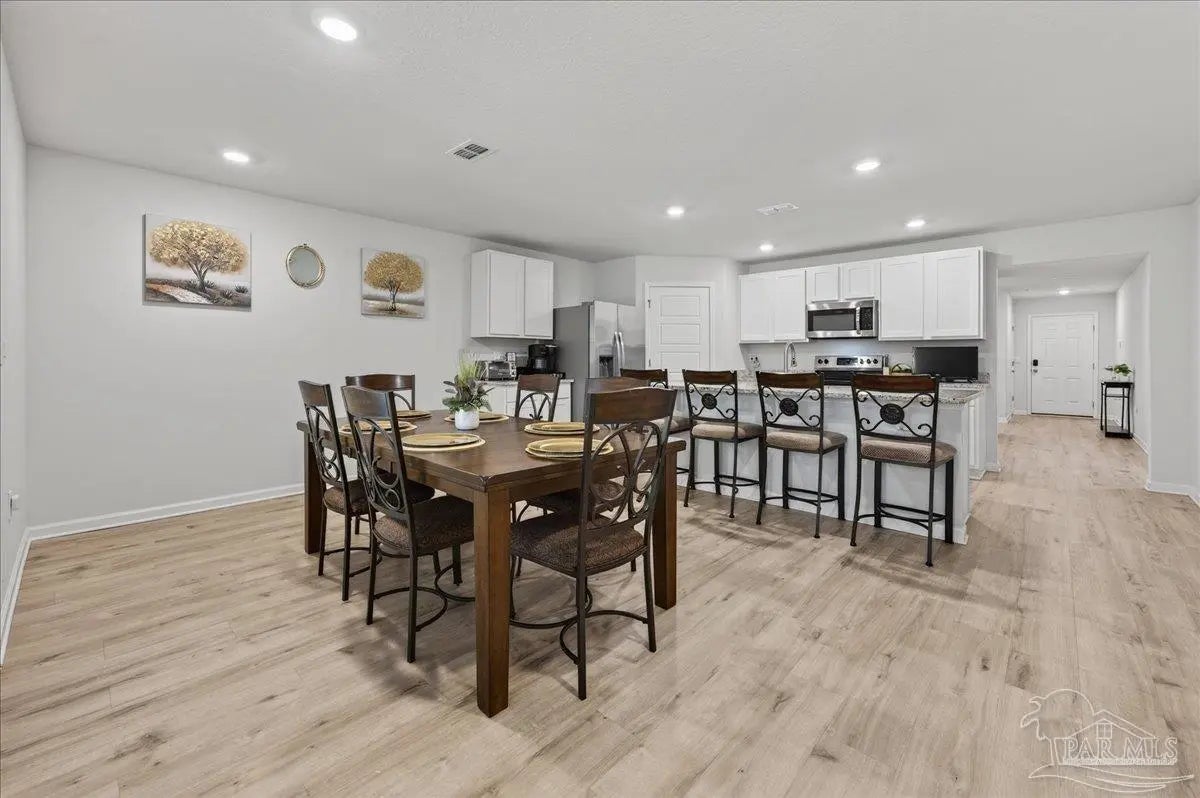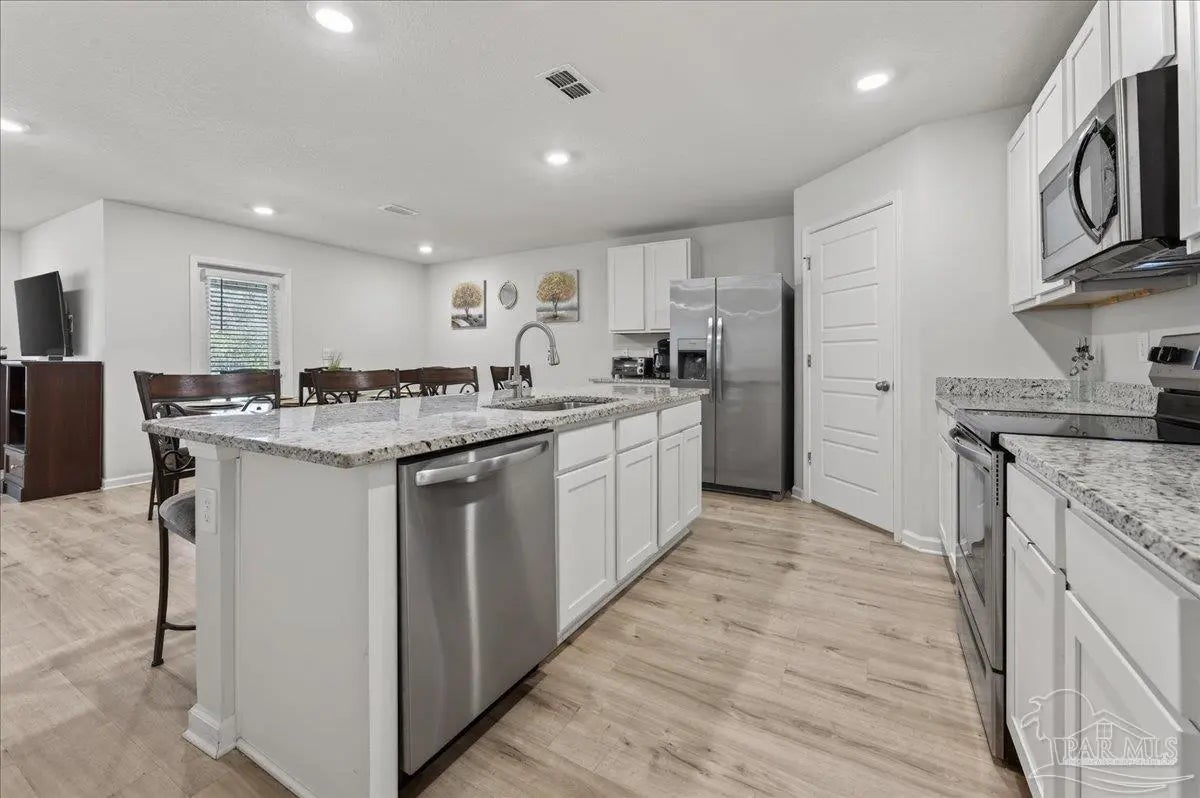 MOVE-IN READY! This is a beautifully maintained 4-bedroom, 2-bathroom was built in 2022 and nestled in a quiet, well-kept neighborhood. This home is ideally located near I-10, Navy Federal Credit Union, and local schools. Step inside to a bright, open-concept layout featuring a neutral color palette, recessed lighting, and seamless flow between the living, dining, and kitchen areas. The kitchen is a standout with its large granite-topped island, white shaker-style soft-close cabinets, stainless steel appliances, spacious pantry, and breakfast bar for additional seating. The split floorplan offers privacy, with a generously sized primary suite tucked away from the other bedrooms. The en-suite bathroom includes double vanities, a walk-in shower, water closet, linen closet, and a large walk-in closet for plenty of storage. Three additional bedrooms are thoughtfully positioned throughout the home, each with carpeted flooring, with a full bathroom nearby with a tub/shower combo. Enjoy outdoor living with both front and rear covered patios, plus the added convenience of a 2-car garage. This home truly checks all the boxes, modern features, functional design, and a prime location all in one!