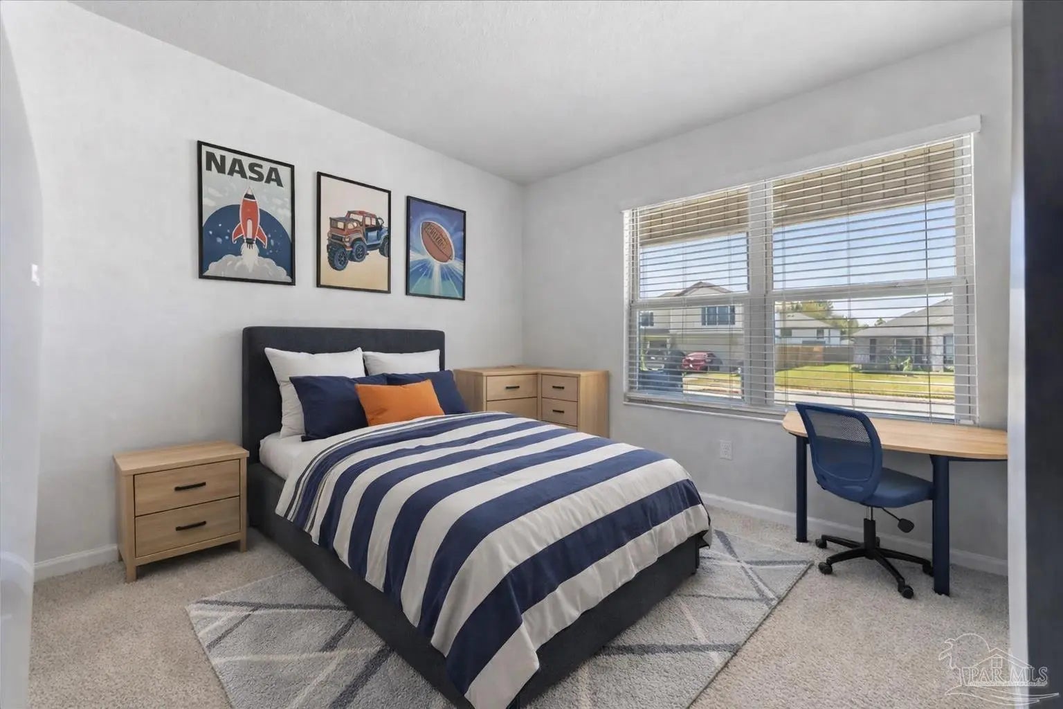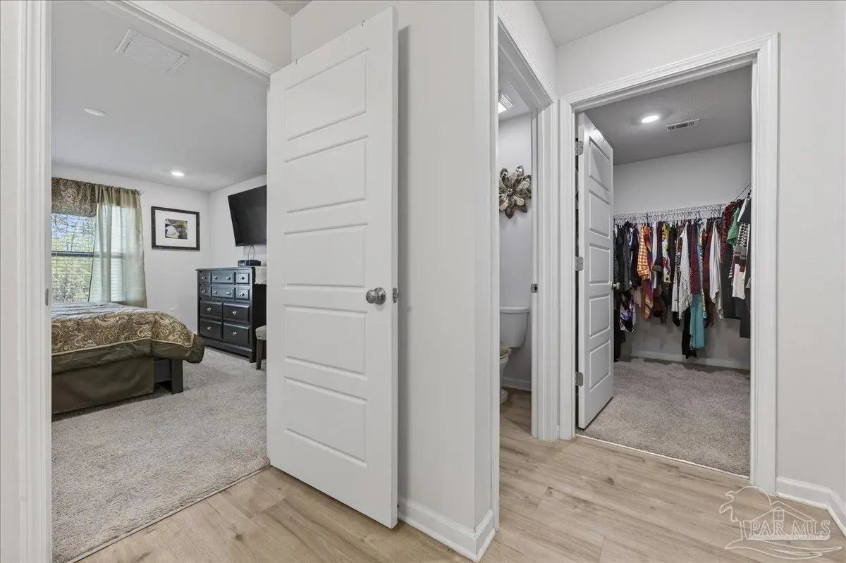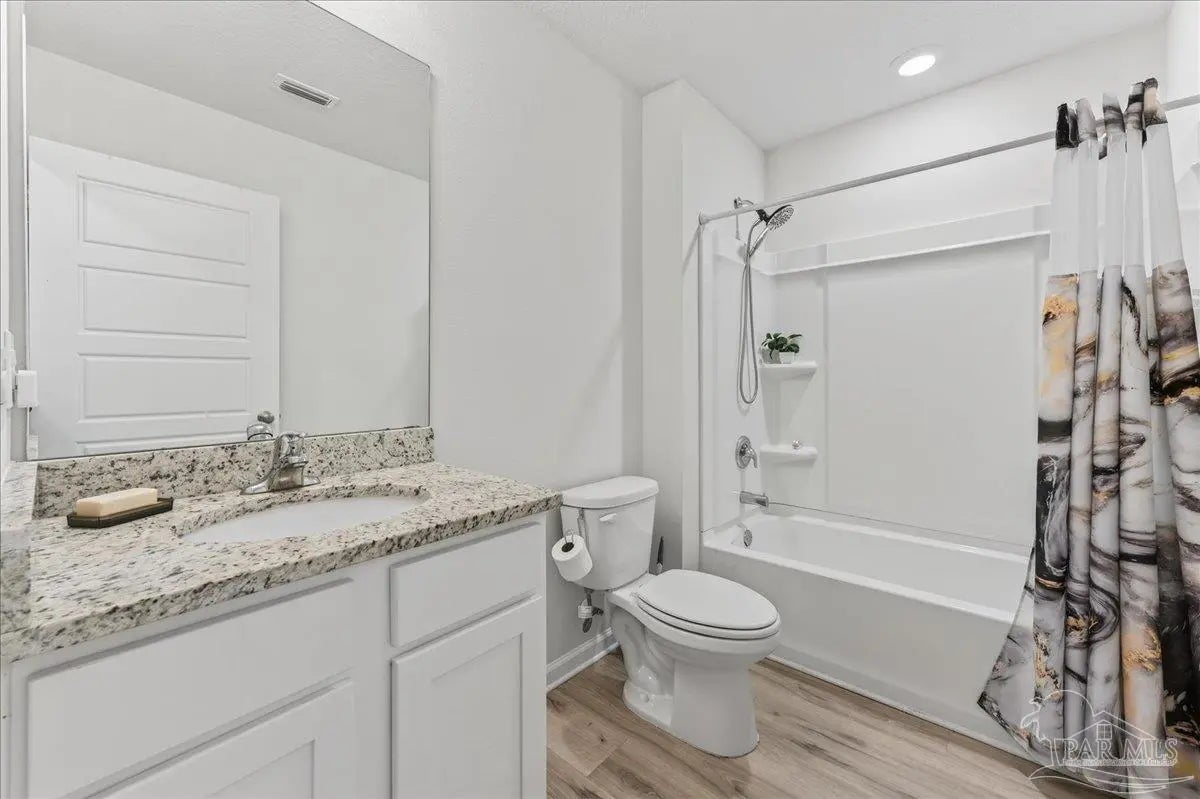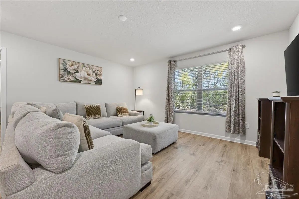 MOVE-IN READY! This is a beautifully maintained 4-bedroom, 2-bathroom was built in 2022 and nestled in a quiet, well-kept neighborhood. This home is ideally located near I-10, Navy Federal Credit Union, and local schools. Step inside to a bright, open-concept layout featuring a neutral color palette, recessed lighting, and seamless flow between the living, dining, and kitchen areas. The kitchen is a standout with its large granite-topped island, white shaker-style soft-close cabinets, stainless steel appliances, spacious pantry, and breakfast bar for additional seating. The split floorplan offers privacy, with a generously sized primary suite tucked away from the other bedrooms. The en-suite bathroom includes double vanities, a walk-in shower, water closet, linen closet, and a large walk-in closet for plenty of storage. Three additional bedrooms are thoughtfully positioned throughout the home, each with carpeted flooring, with a full bathroom nearby with a tub/shower combo. Enjoy outdoor living with both front and rear covered patios, plus the added convenience of a 2-car garage. This home truly checks all the boxes, modern features, functional design, and a prime location all in one!