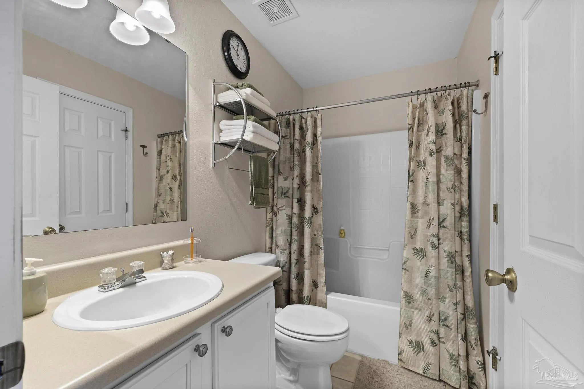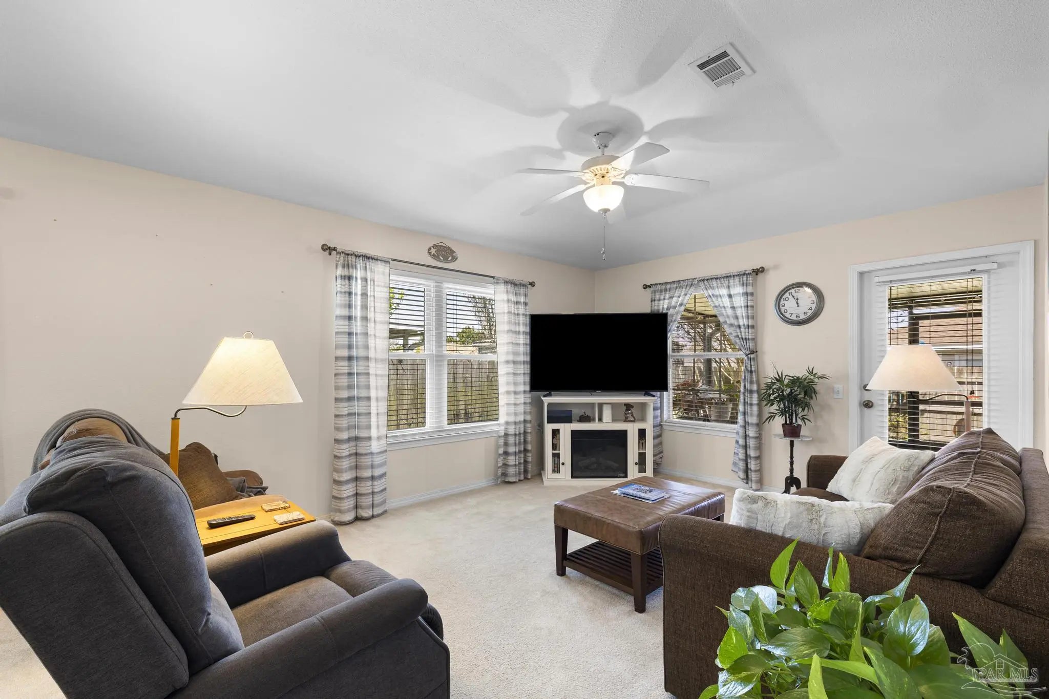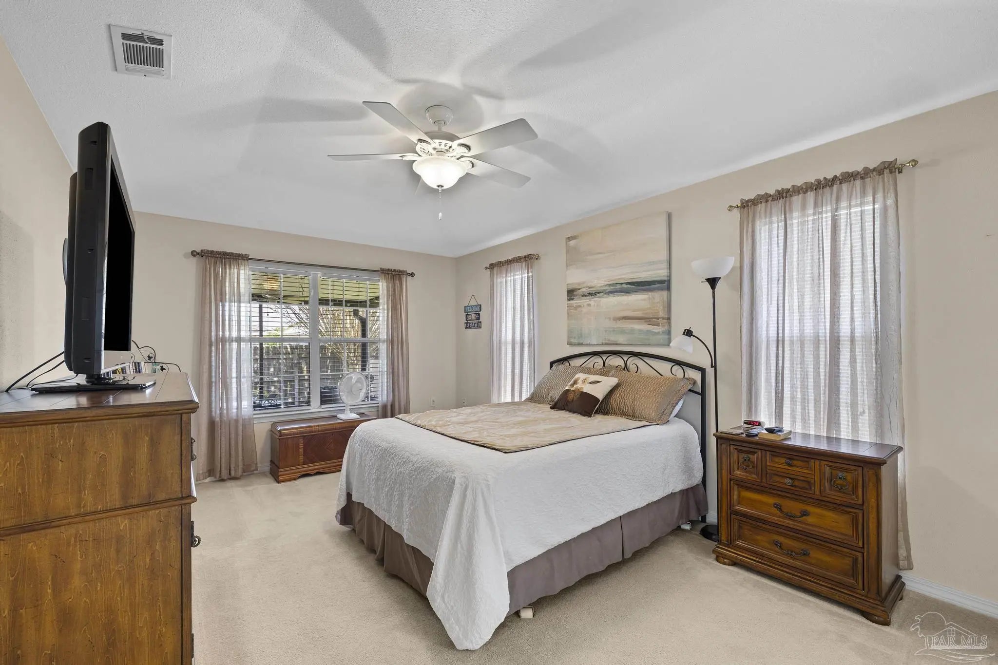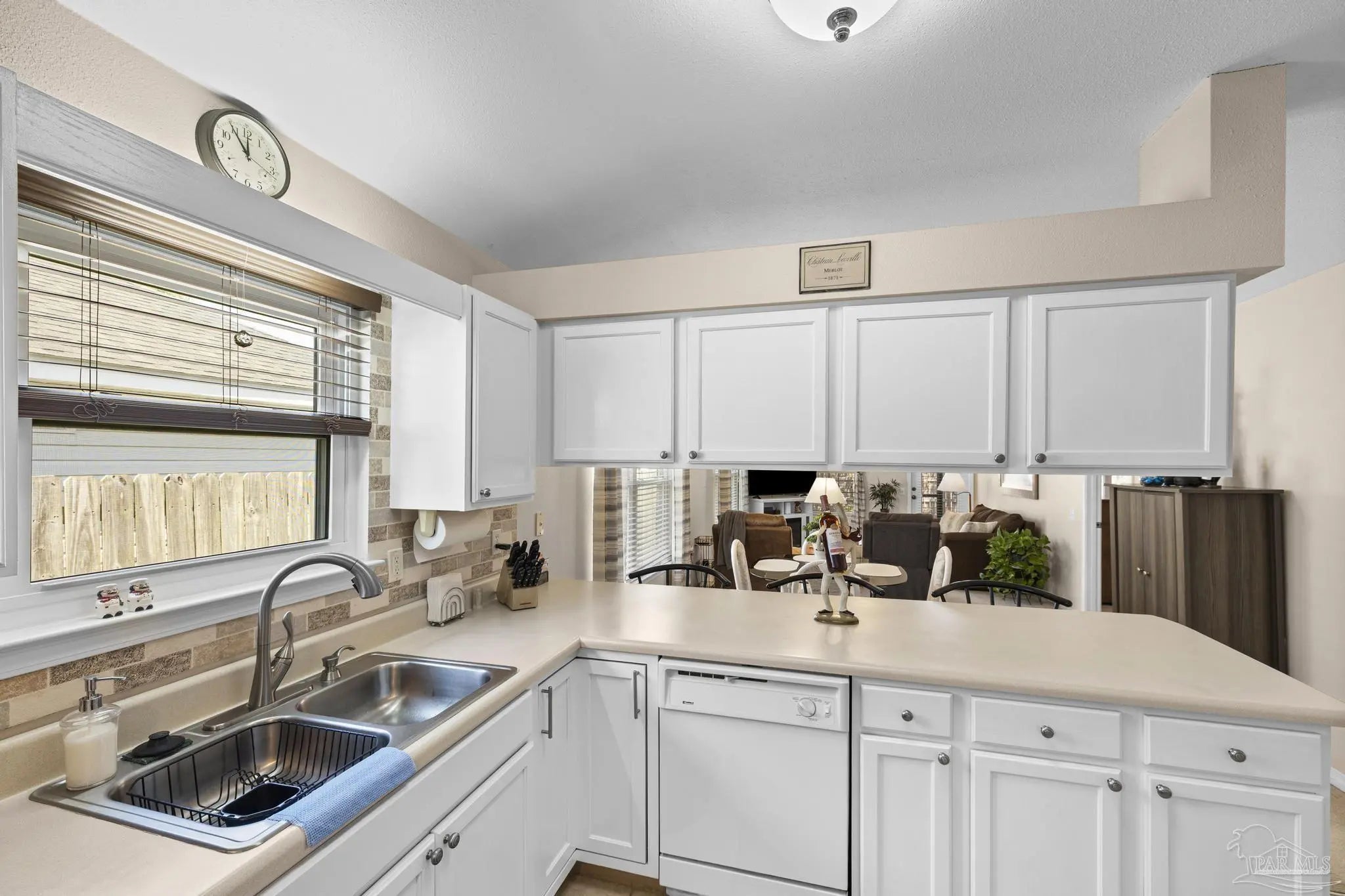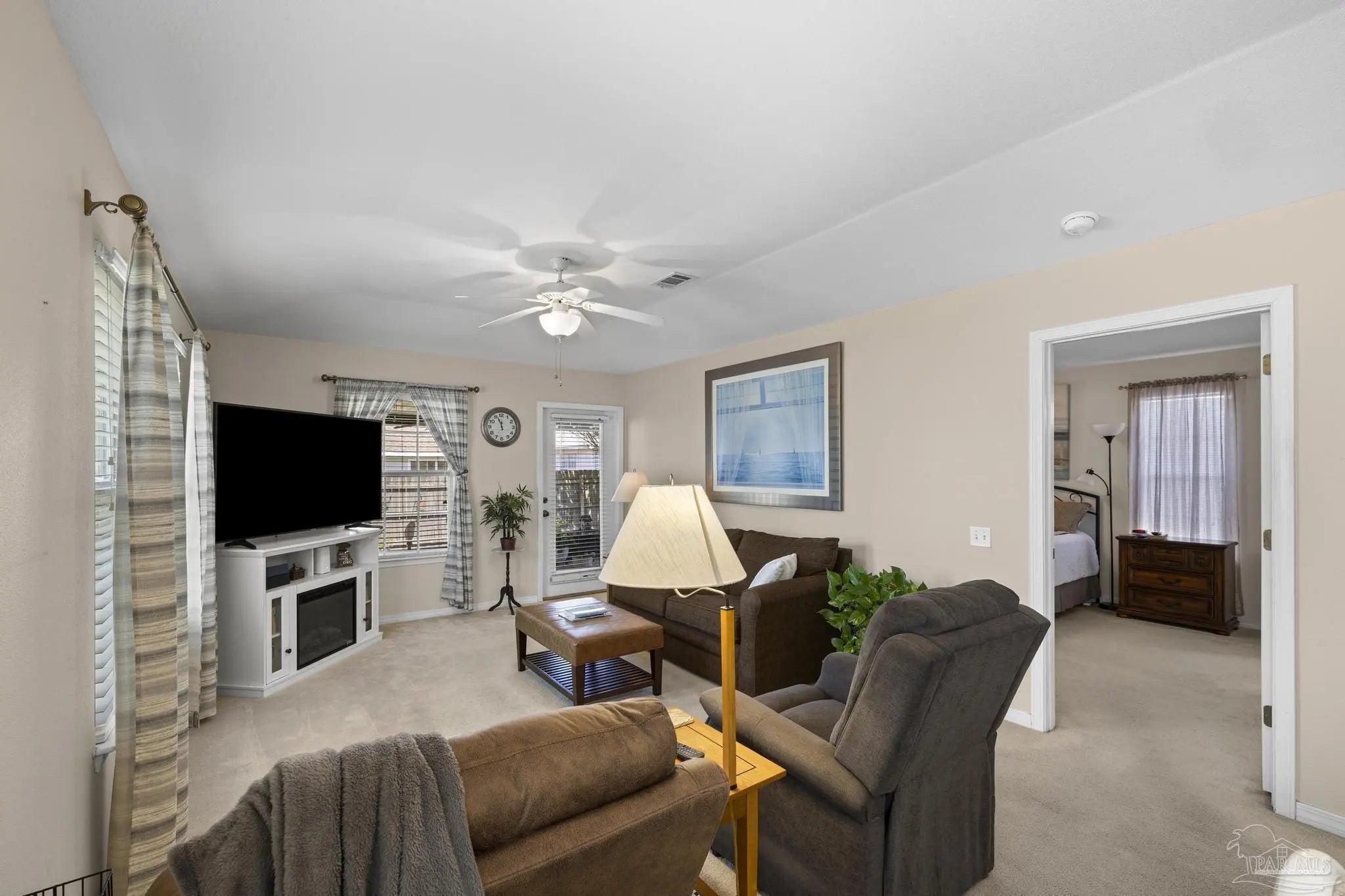 This meticulously maintained residence captures the essence of relaxed Florida living, offering a perfect balance of modern updates and cozy charm. From the moment you pull into the quiet cul-de-sac, you are greeted by an inviting exterior that leads into a thoughtfully designed 1,257-square-foot interior. The home boasts a bright and cheery floorplan that seamlessly connects the living, dining, and kitchen areas, making it an ideal space for both daily life and hosting. No popcorn ceilings here! Neutral colors provide a clean canvas for any decor style. The main suite overlooks the backyard and is complete with a spacious walk-in closet in the private ensuite bathroom. Two additional bedrooms in the front of the home offer versatility for dedicated home office, or a guest wing. The transition from indoor to outdoor living is effortless through the screened-in porch, where dual ceiling fans allow you to enjoy the coastal breeze in total comfort. This outdoor space features a manageable, low-maintenance backyard with sprinkler system on reclaimed water, providing just enough space for gardening or pets without the burden of extensive weekend yard work. Location is everything, and this property delivers by being situated in a neighborhood with sidewalks and underground utilities while remaining just a short drive from both Pensacola Beach and Navarre Beach. Residents of Shadow Lakes enjoy access to neighborhood amenities including a serene community lake and well-lit sidewalks for evening walks. Positioned within the top-tier Santa Rosa County School District and located near the new Soundside High School, local favorites like the Gulf Breeze Zoo, Tiger Point & Hidden Creek Golf Courses and various shopping hubs, this home represents a rare opportunity to own a piece of paradise in one of the Panhandle's most convenient locations. This home has gutters on the screen porch and impact windows on the west side of the home. Roof & fence 2021, Ac 2019, water heater 2016.