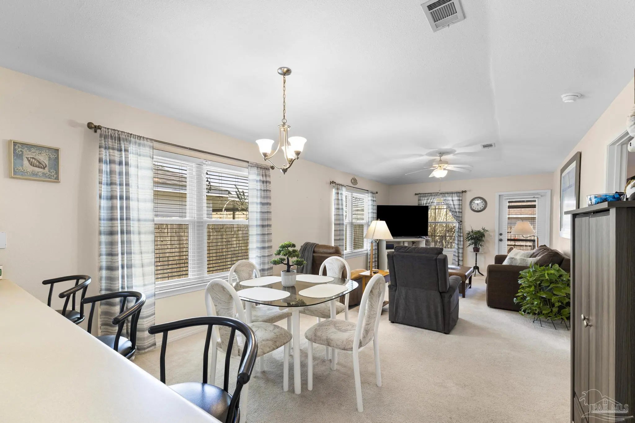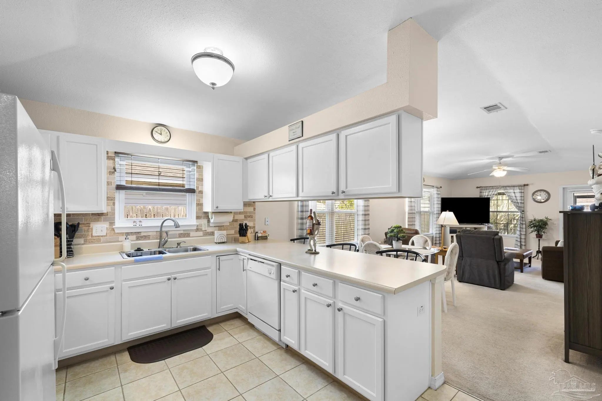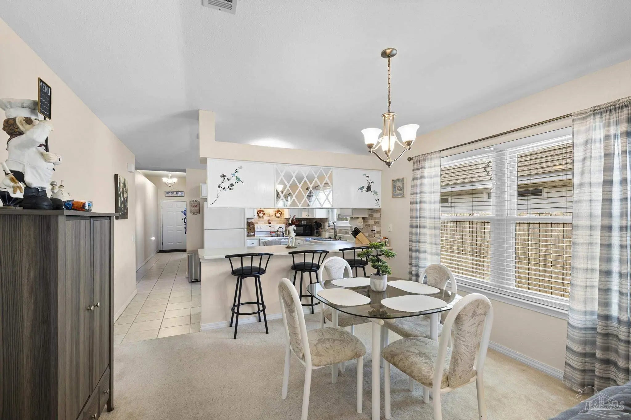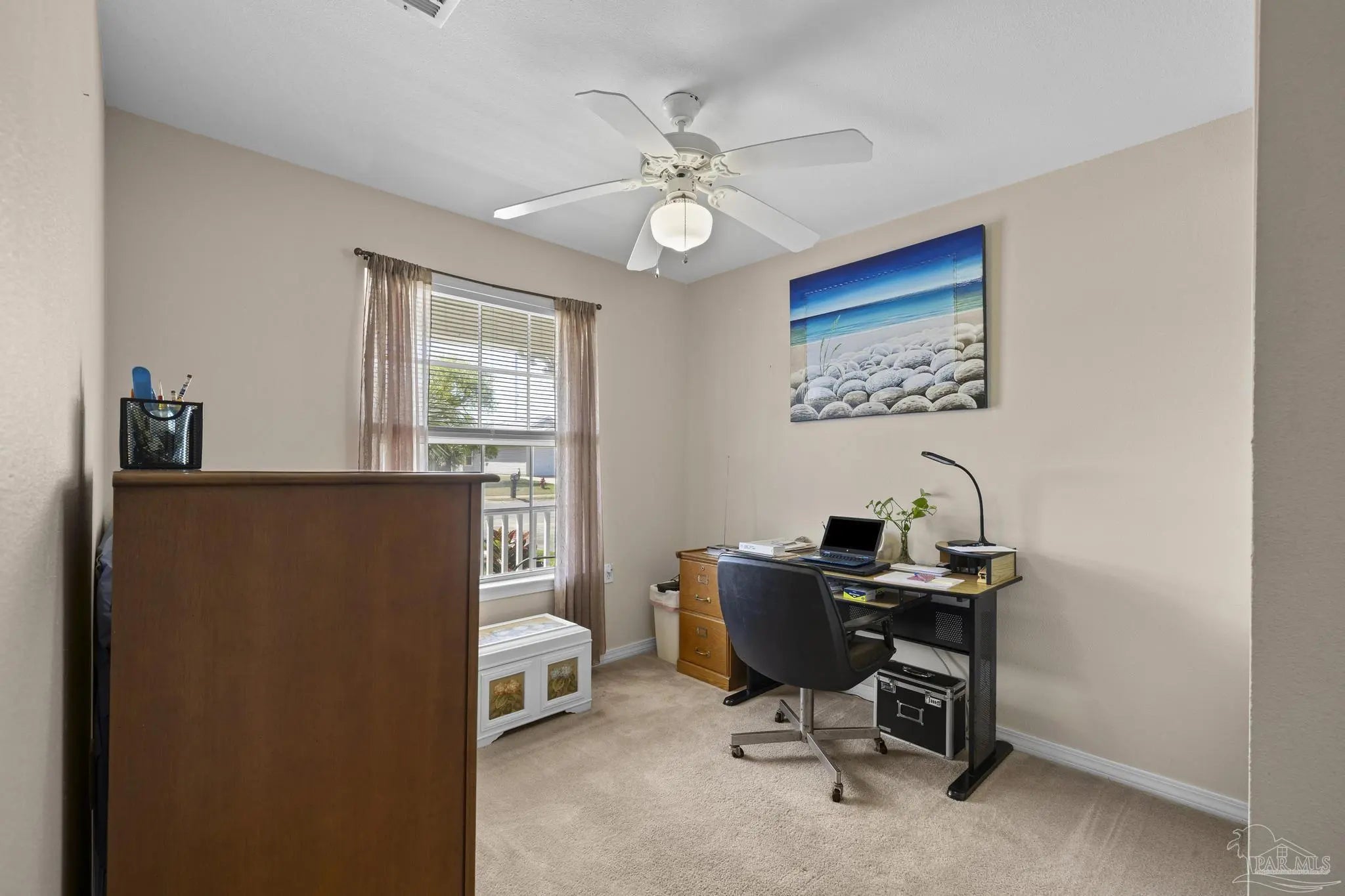 This meticulously maintained residence captures the essence of relaxed Florida living, offering a perfect balance of modern updates and cozy charm. From the moment you pull into the quiet cul-de-sac, you are greeted by an inviting exterior that leads into a thoughtfully designed 1,257-square-foot interior. The home boasts a bright and cheery floorplan that seamlessly connects the living, dining, and kitchen areas, making it an ideal space for both daily life and hosting. No popcorn ceilings here! Neutral colors provide a clean canvas for any decor style. The main suite overlooks the backyard and is complete with a spacious walk-in closet in the private ensuite bathroom. Two additional bedrooms in the front of the home offer versatility for dedicated home office, or a guest wing. The transition from indoor to outdoor living is effortless through the screened-in porch, where dual ceiling fans allow you to enjoy the coastal breeze in total comfort. This outdoor space features a manageable, low-maintenance backyard with sprinkler system on reclaimed water, providing just enough space for gardening or pets without the burden of extensive weekend yard work. Location is everything, and this property delivers by being situated in a neighborhood with sidewalks and underground utilities while remaining just a short drive from both Pensacola Beach and Navarre Beach. Residents of Shadow Lakes enjoy access to neighborhood amenities including a serene community lake and well-lit sidewalks for evening walks. Positioned within the top-tier Santa Rosa County School District and located near the new Soundside High School, local favorites like the Gulf Breeze Zoo, Tiger Point & Hidden Creek Golf Courses and various shopping hubs, this home represents a rare opportunity to own a piece of paradise in one of the Panhandle's most convenient locations. This home has gutters on the screen porch and impact windows on the west side of the home. Roof & fence 2021, Ac 2019, water heater 2016.
