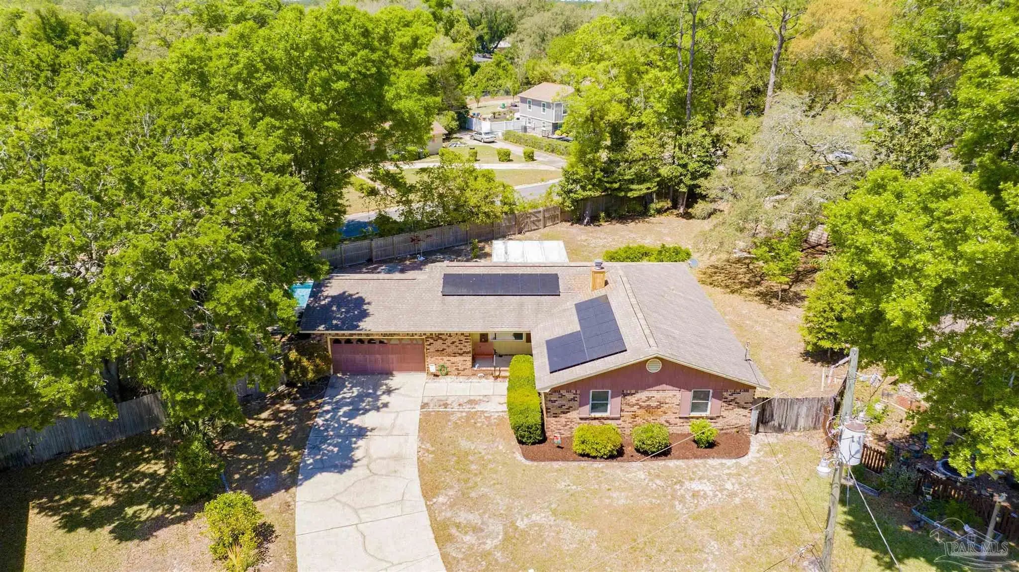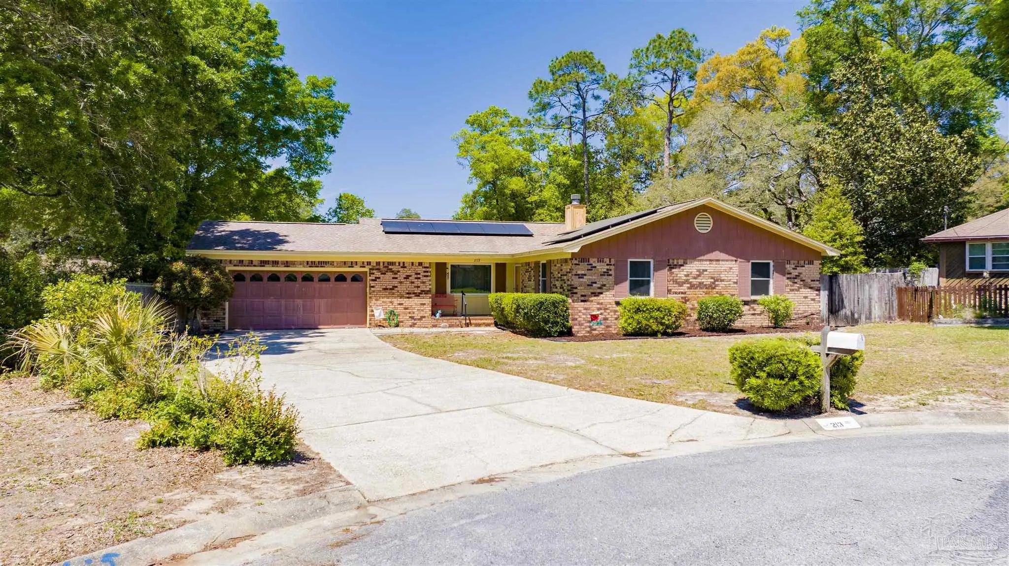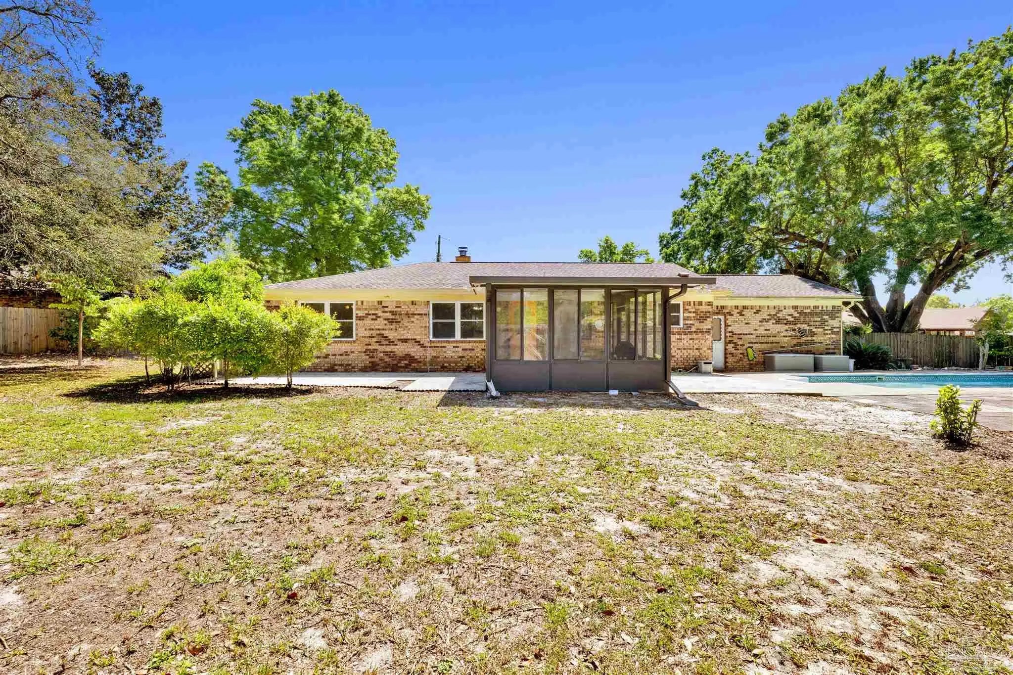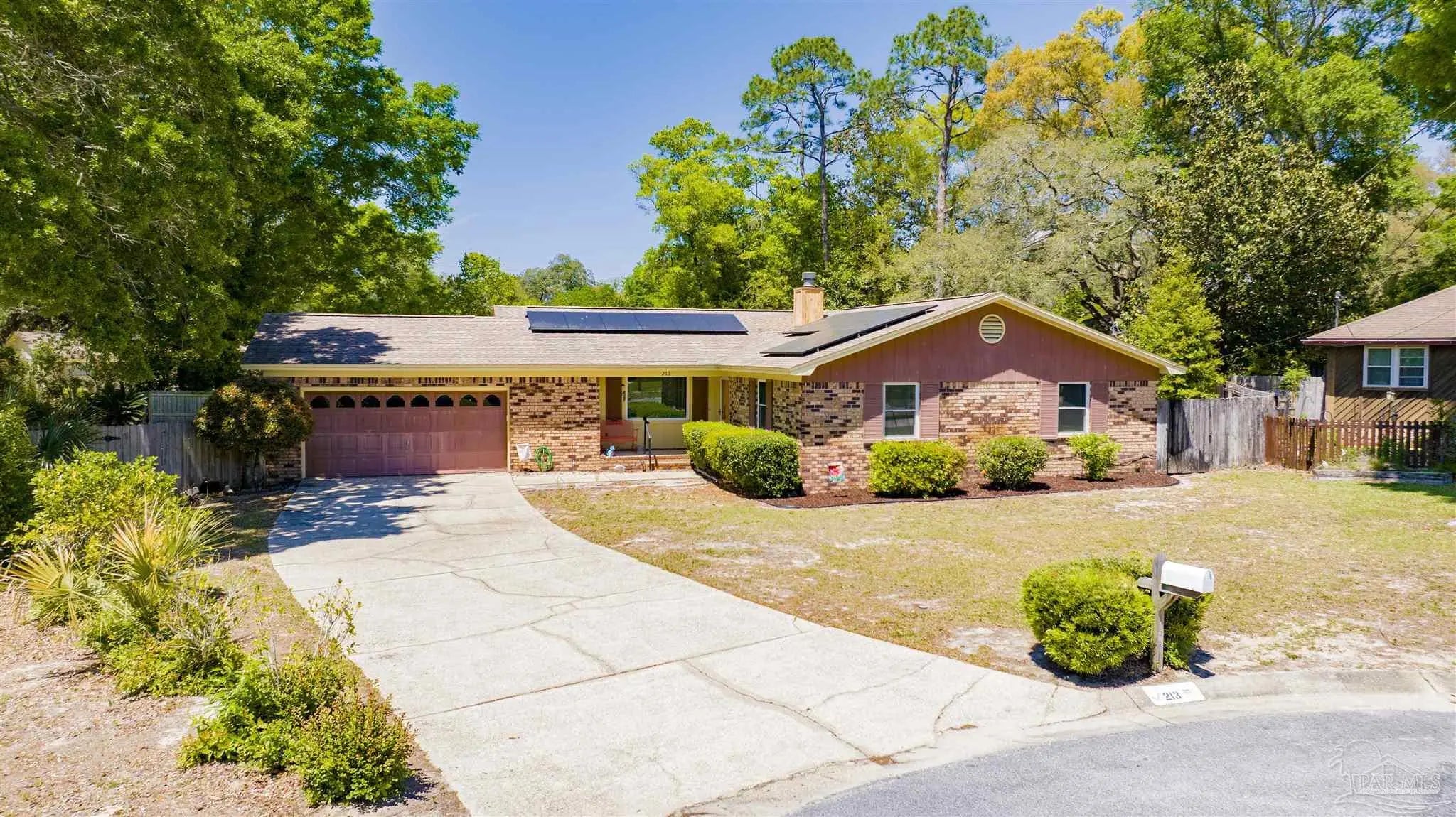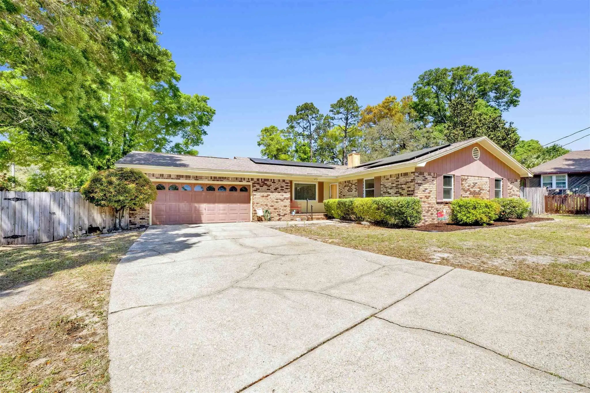 YOUR DREAM HAS ARRIVED JUST IN TIME FOR SRING! Come see this ALL BRICK home with SALT WATER POOL situated on .38 acre lot with EXTRA LARGE GARAGE tucked away on low traffic Cul De Sac! As you walk in you will be be greeted by a home featuring two living areas one with bricked fireplace, LARGE EAT-IN KITCHEN along with a separate dining room/office and a 12x16 sunroom OVERLOOKING THE POOL! Sunroom not currently heated and cooled (nor included in the property square footage) but has electric outlets and ceiling fan. The primary bedroom is complete with double closets and full bathroom with tub/shower and down the hall you will find the two additional bedrooms and guest bathroom with newer (2024) JETTED WALK IN TUB/SHOWER and toilet with BIDET. This all electric home has SOLAR PANELS and the lawn with IRRIGATION ON A WELL for your added convenience and savings. The large garage is a dream boasting of tons of overhead storage and has a 5'9"x8 extension with workbench! SEVERAL NEWER FEATURES that will save you $$$ are.... IMPACT- RESISTANT WINDOWS (2023), roof replaced (2018) SOLAR PANELS (2022), HVAC (2023) and hot water heater (2018), new salt cell (2026) & Pool pump (2022). Come see and imagine your special touches to this home is an established NO HOA community where you can just ENJOY LIFE with your own private outdoor oasis with potted lime tree, Crepe Myrtles, Japanese Maple trees, Palm trees with large storage building and a relaxing SALT WATER POOL with NO NEIGHBORS BEHIND YOU and with the back yard FULLY PRIVACY FENCED! You will love the convenient location to two beautiful beaches, NAS, Navy Hospital and both town and downtown for your shopping and entertainment. Come and make this your new place to CALL HOME!