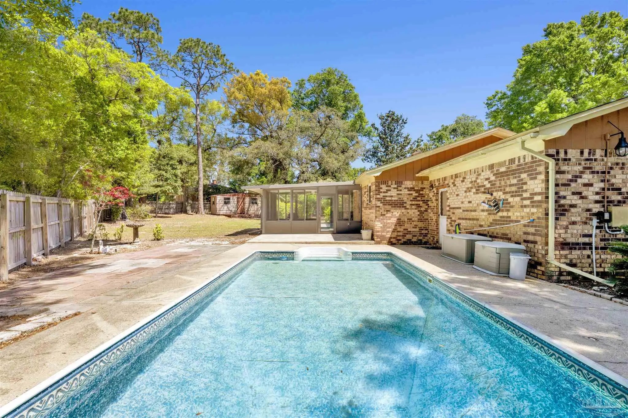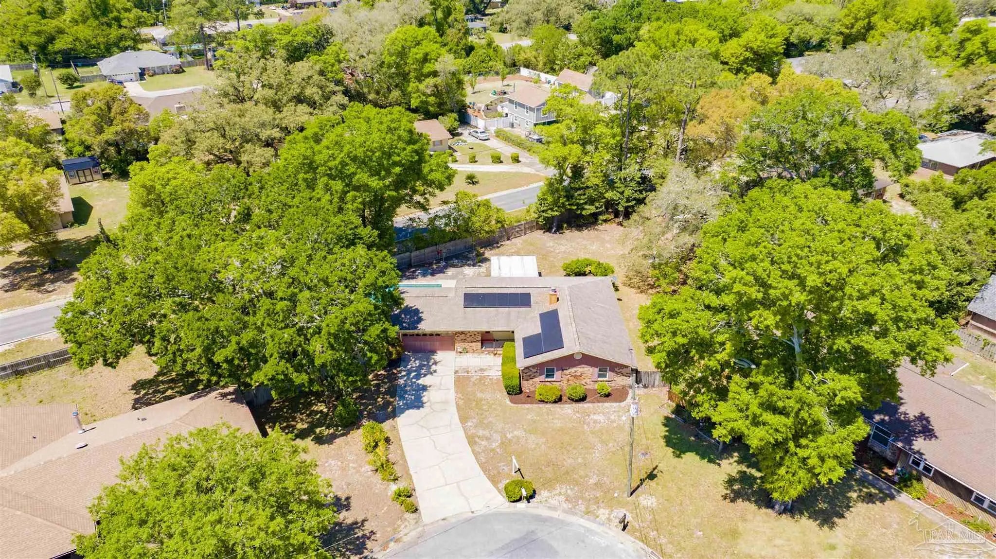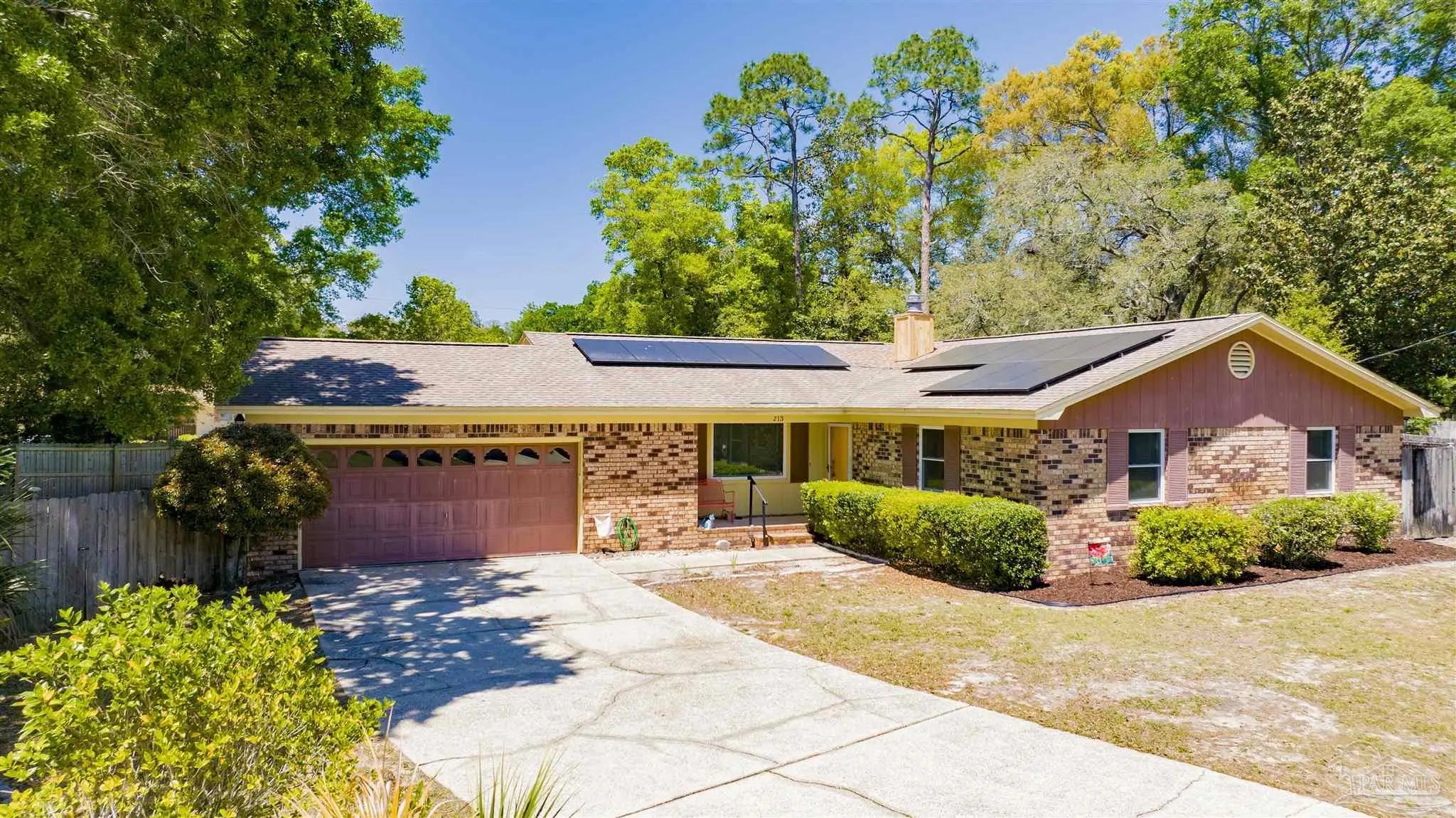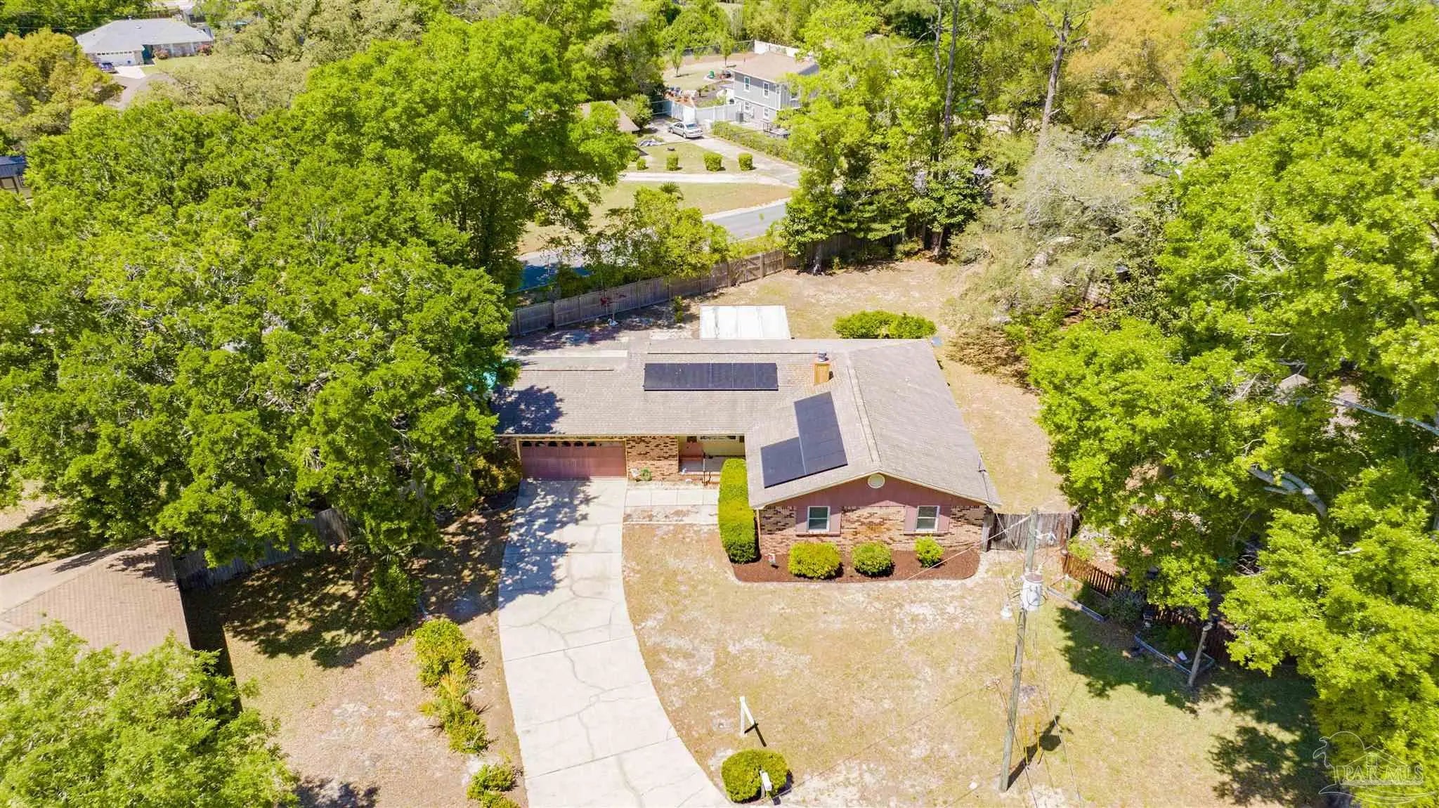 YOUR DREAM HAS ARRIVED JUST IN TIME FOR SRING! Come see this ALL BRICK home with SALT WATER POOL situated on .38 acre lot with EXTRA LARGE GARAGE tucked away on low traffic Cul De Sac! As you walk in you will be be greeted by a home featuring two living areas one with bricked fireplace, LARGE EAT-IN KITCHEN along with a separate dining room/office and a 12x16 sunroom OVERLOOKING THE POOL! Sunroom not currently heated and cooled (nor included in the property square footage) but has electric outlets and ceiling fan. The primary bedroom is complete with double closets and full bathroom with tub/shower and down the hall you will find the two additional bedrooms and guest bathroom with newer (2024) JETTED WALK IN TUB/SHOWER and toilet with BIDET. This all electric home has SOLAR PANELS and the lawn with IRRIGATION ON A WELL for your added convenience and savings. The large garage is a dream boasting of tons of overhead storage and has a 5'9"x8 extension with workbench! SEVERAL NEWER FEATURES that will save you $$$ are.... IMPACT- RESISTANT WINDOWS (2023), roof replaced (2018) SOLAR PANELS (2022), HVAC (2023) and hot water heater (2018), new salt cell (2026) & Pool pump (2022). Come see and imagine your special touches to this home is an established NO HOA community where you can just ENJOY LIFE with your own private outdoor oasis with potted lime tree, Crepe Myrtles, Japanese Maple trees, Palm trees with large storage building and a relaxing SALT WATER POOL with NO NEIGHBORS BEHIND YOU and with the back yard FULLY PRIVACY FENCED! You will love the convenient location to two beautiful beaches, NAS, Navy Hospital and both town and downtown for your shopping and entertainment. Come and make this your new place to CALL HOME!