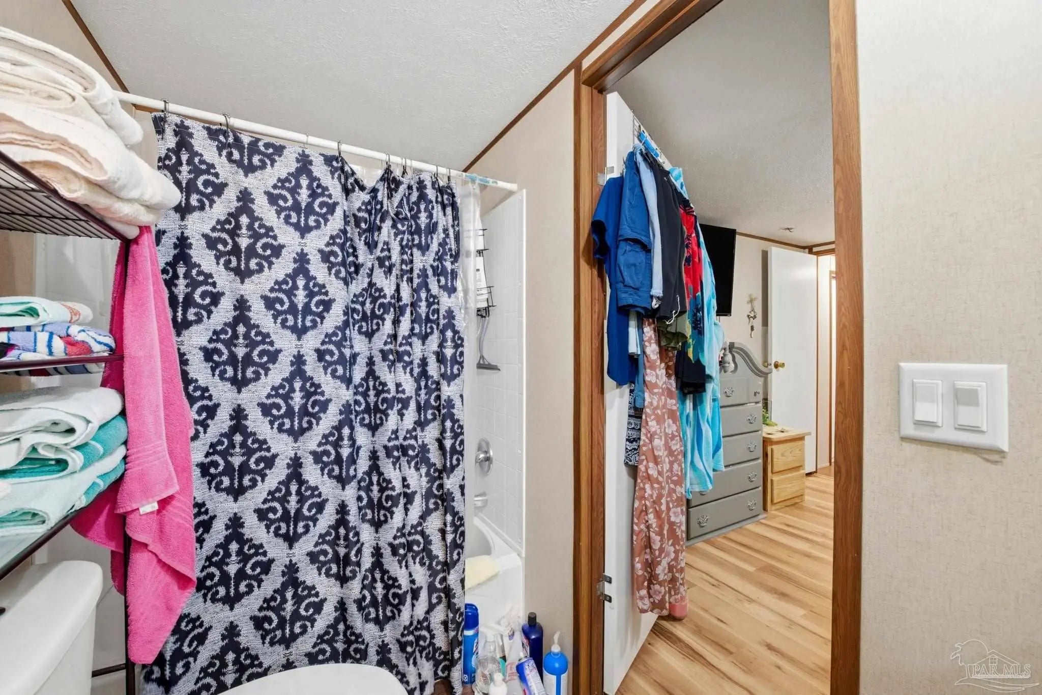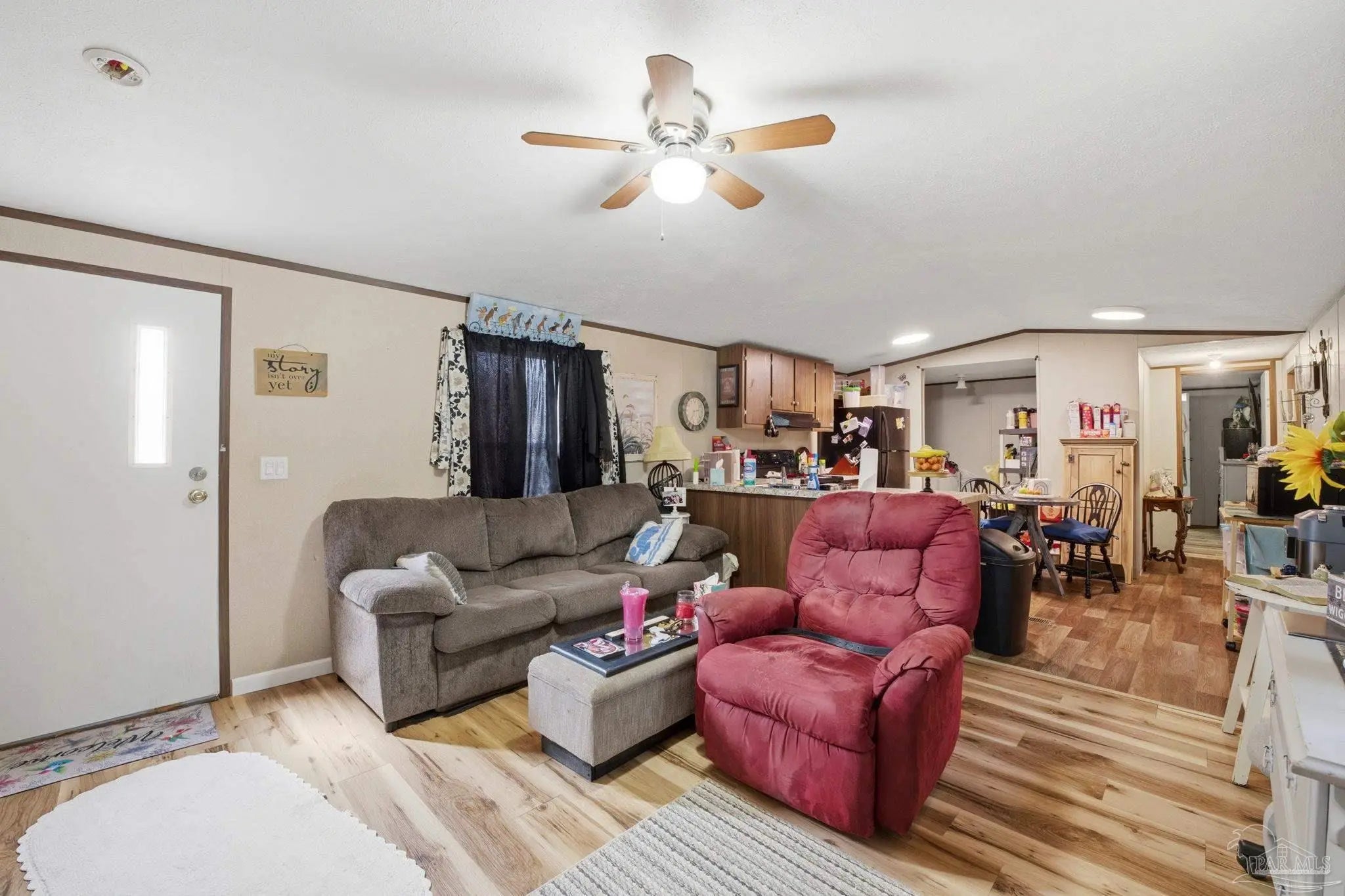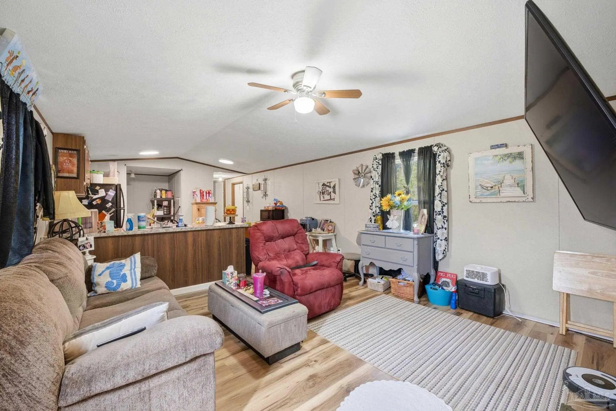 Welcome to this charming 2-bedroom, 2-bathroom home situated on a spacious 0.553-acre lot in Navarre. This residence features a thoughtfully designed split floor plan that optimizes space and functionality, making it an ideal choice for a variety of lifestyles. As you enter, you’ll immediately notice the elegant wood-look LVP flooring that flows seamlessly throughout the main living areas, offering both durability and a modern aesthetic. The open-concept layout encompasses the kitchen, dining, and living areas, creating a cohesive space perfect for entertaining or everyday living. The vaulted ceilings enhance the sense of space, allowing for abundant natural light to fill the home. The kitchen is well-appointed and features a generous layout, complemented by a large laundry area that also serves as a walk-in pantry, ensuring ample storage for all your culinary needs. The guest bedroom is comfortably carpeted, providing a warm and inviting space for family or guests. Step outside to the expansive backyard, which boasts an open deck area—ideal for outdoor gatherings or enjoying quiet moments in your private retreat. With no rear neighbors, you can relish in the tranquility and privacy this property offers. The shed in the back provides additional storage, perfect for garden tools or outdoor equipment. This home combines comfort and functionality with easy access to local amenities, parks, and the beautiful Navarre Beach. Don’t miss the opportunity to make this delightful property your own!