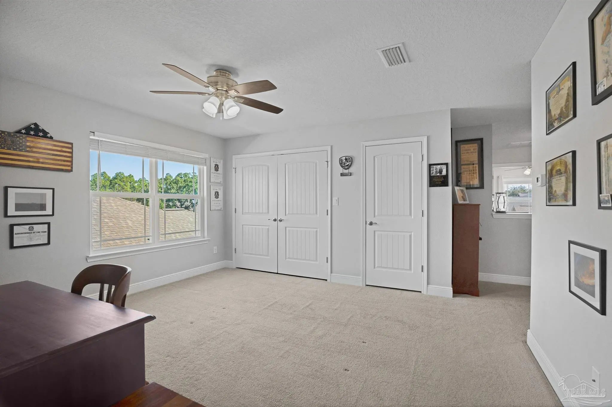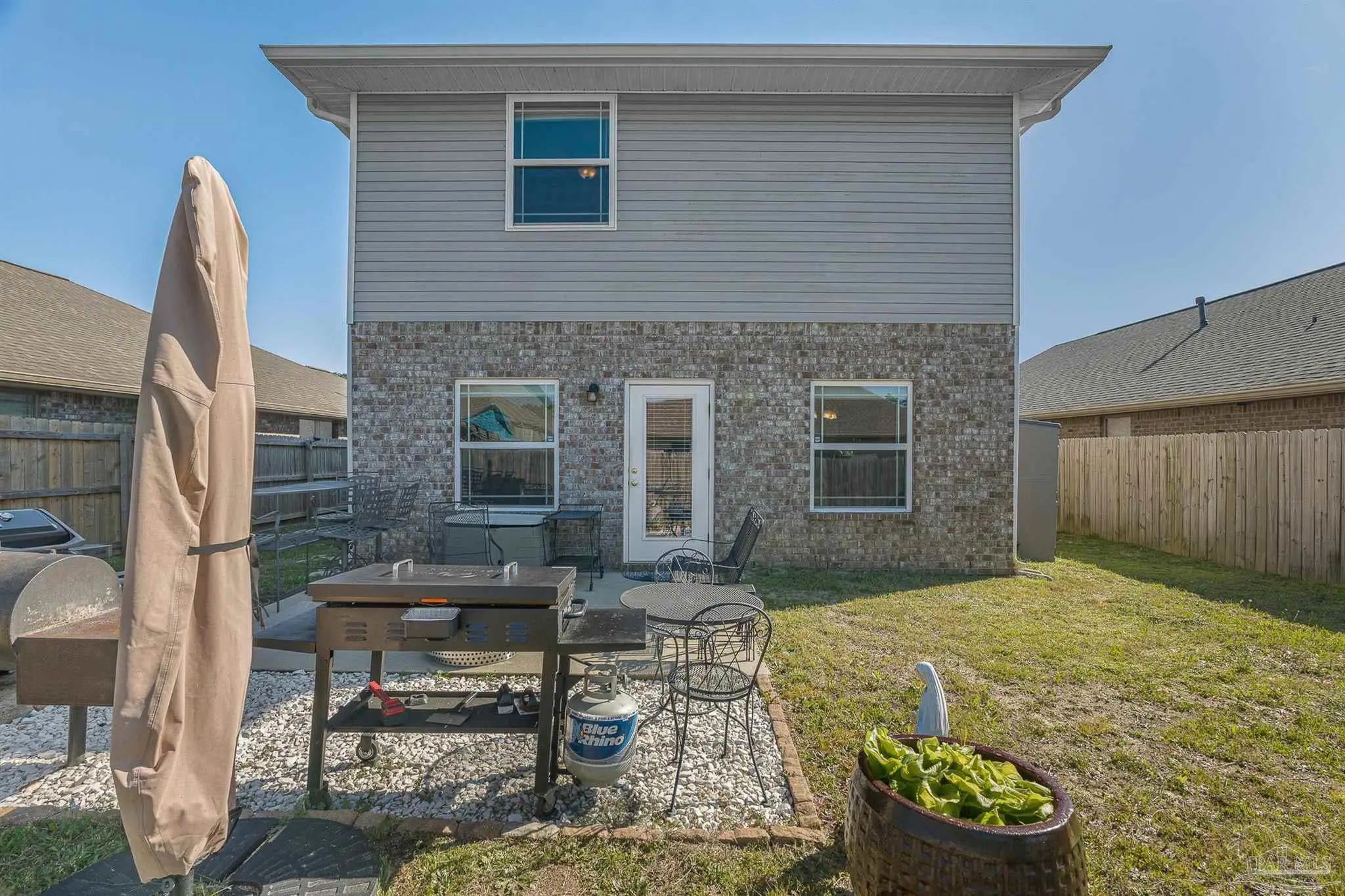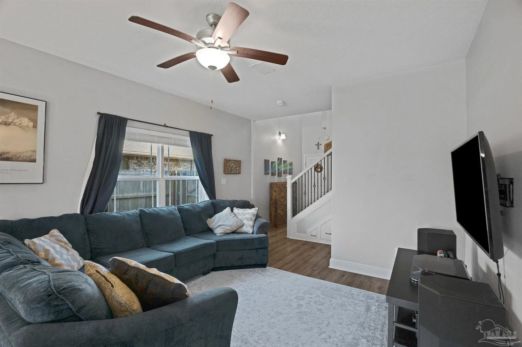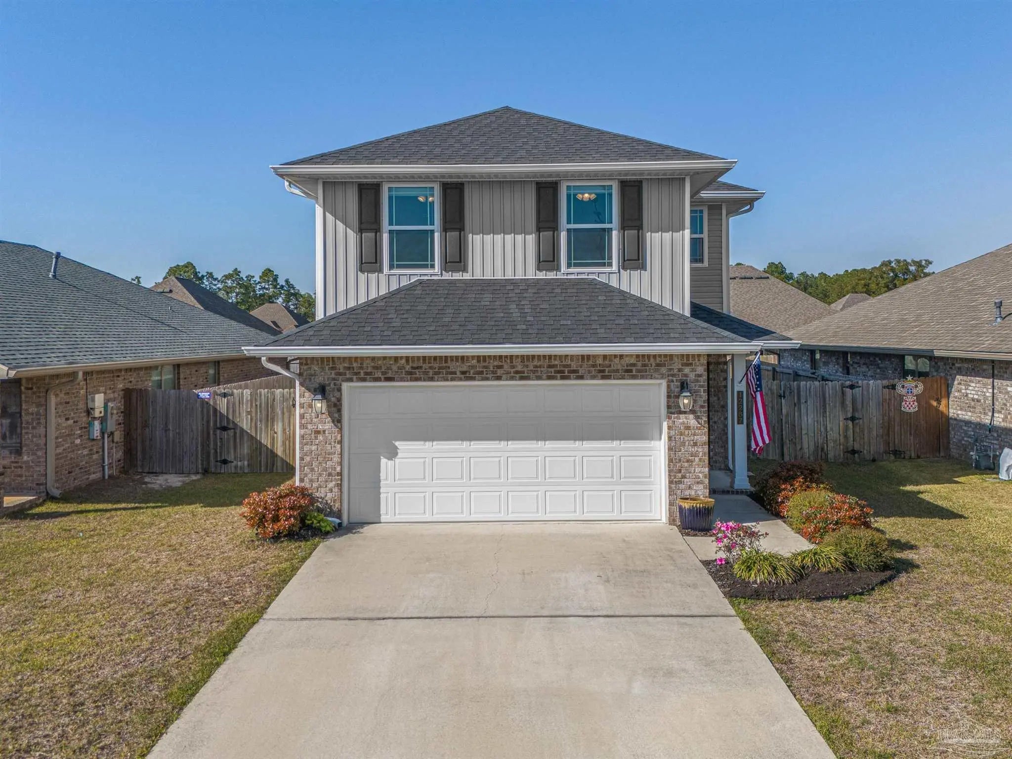 Welcome to this well-maintained two-story home featuring 3 bedrooms and 2.5 bathrooms, located in the highly sought-after Seagrass Point Subdivision. The kitchen is equipped with stainless steel appliances, hard surface countertops, dark wood cabinetry, a bar-height counter, double sink, and a dedicated eat-in dining area. The main living and dining spaces have luxury vinyl plank flooring, providing a modern look with no carpet on the first floor. A conveniently located half bath and additional storage closet complete the downstairs layout. Upstairs, you’ll find all three bedrooms along with a versatile bonus space ideal for a home office, playroom, or additional living area. The primary suite features a trey ceiling, ceiling fan, and a spacious ensuite bathroom with double vanities, a walk-in closet, and a tub/shower combination. A full guest bathroom with a walk-in shower and an upstairs laundry closet add to the home’s functionality. The fully fenced backyard includes a concrete patio, perfect for outdoor relaxation or entertaining. LED lighting, Fabric Shield hurricane shutters, Moen fixtures, a finished garage, architectural shingle roof, ceiling fans, and window blinds throughout. This home offers a great combination of location, updates, and livable space—schedule your showing today. Conveniently situated near NAS Pensacola, as well as shopping and dining options including Target, Walmart, and Aldi, this home offers both comfort and accessibility. **** Buyer to verify all information, features and dimensions ****