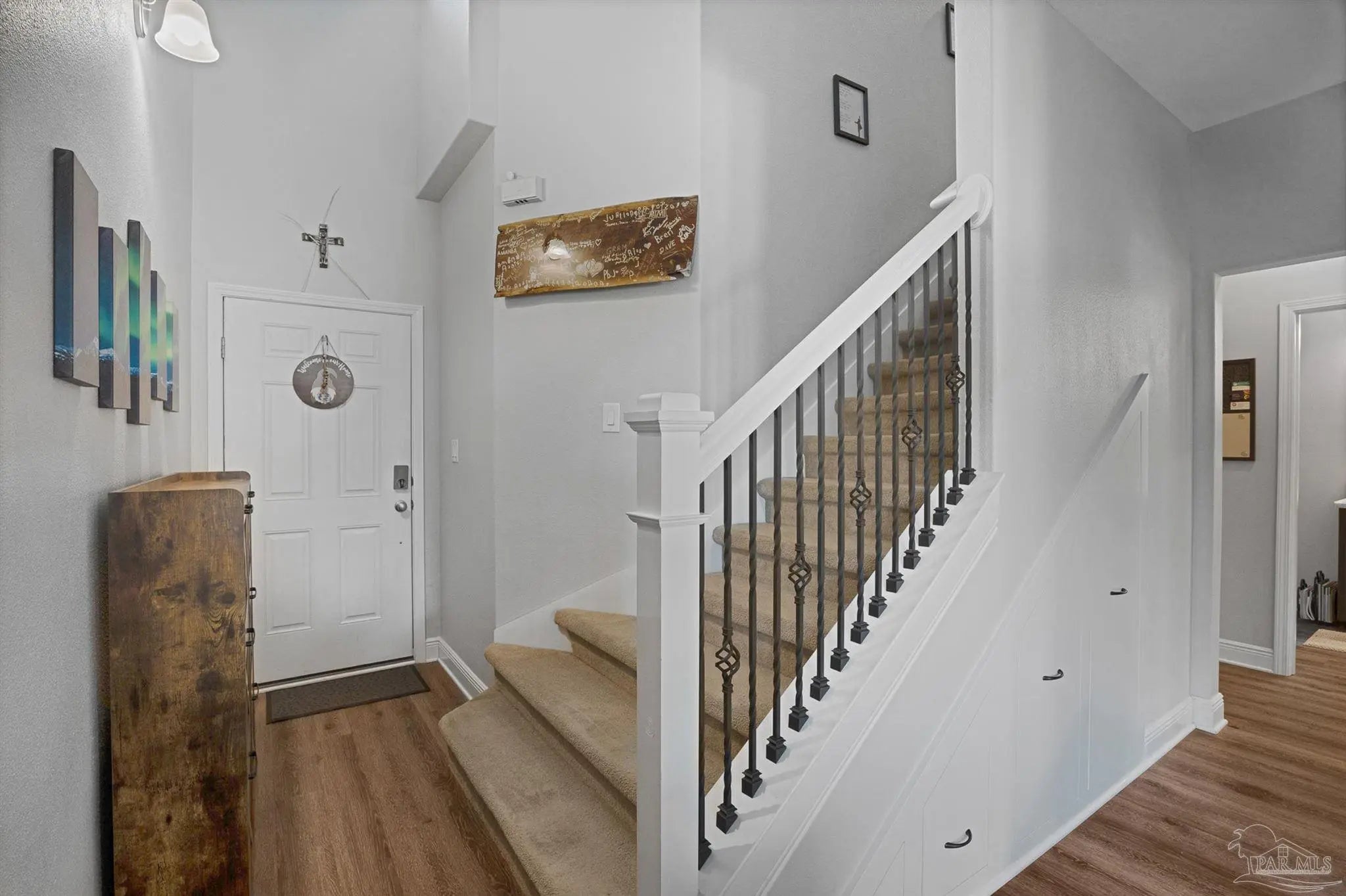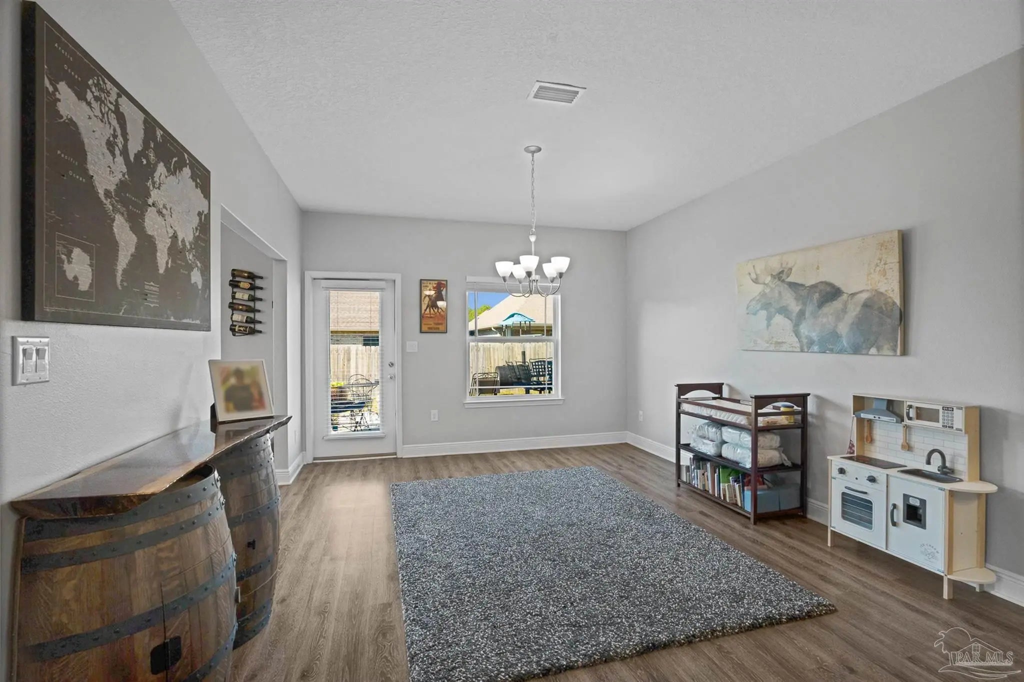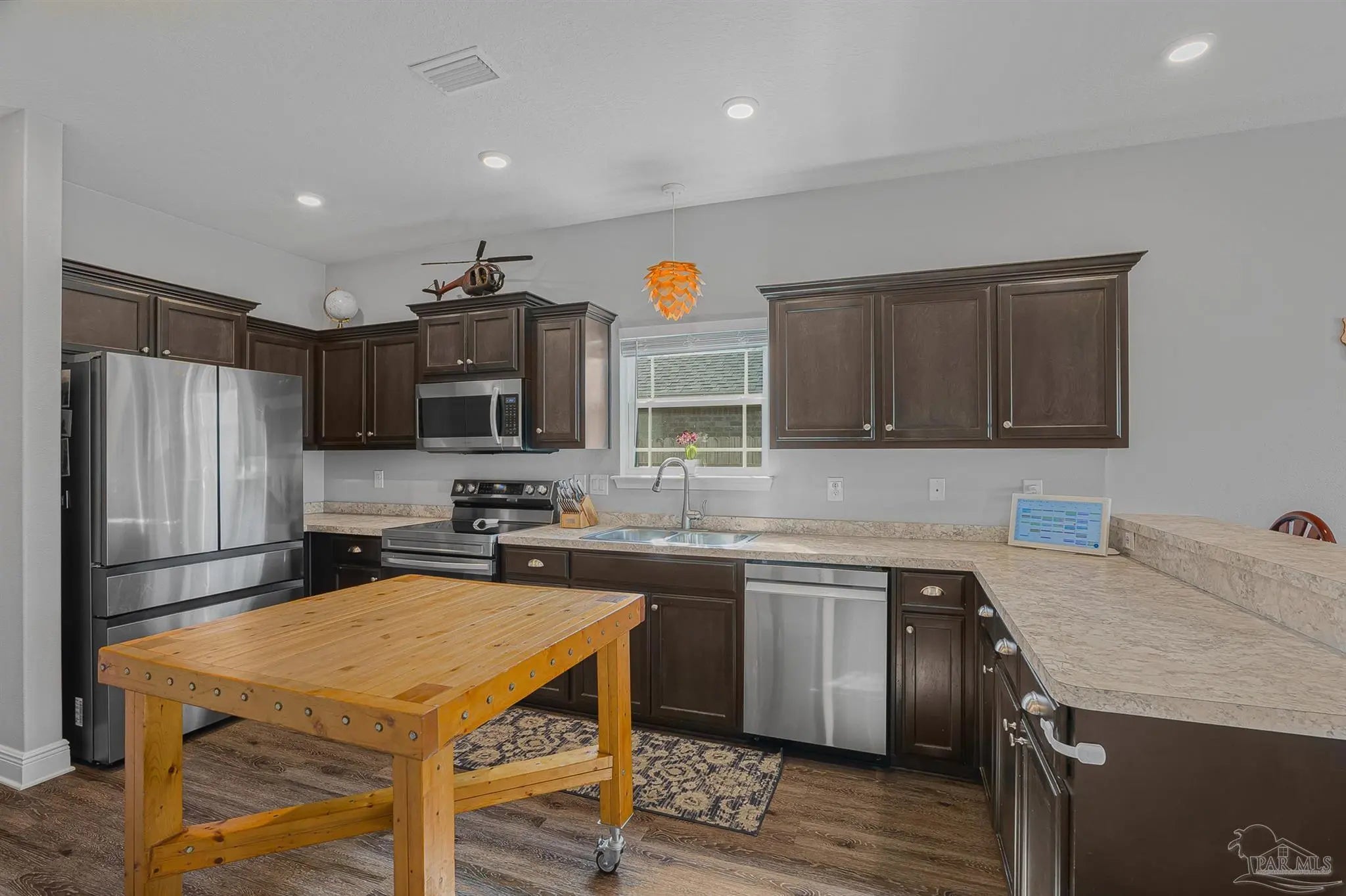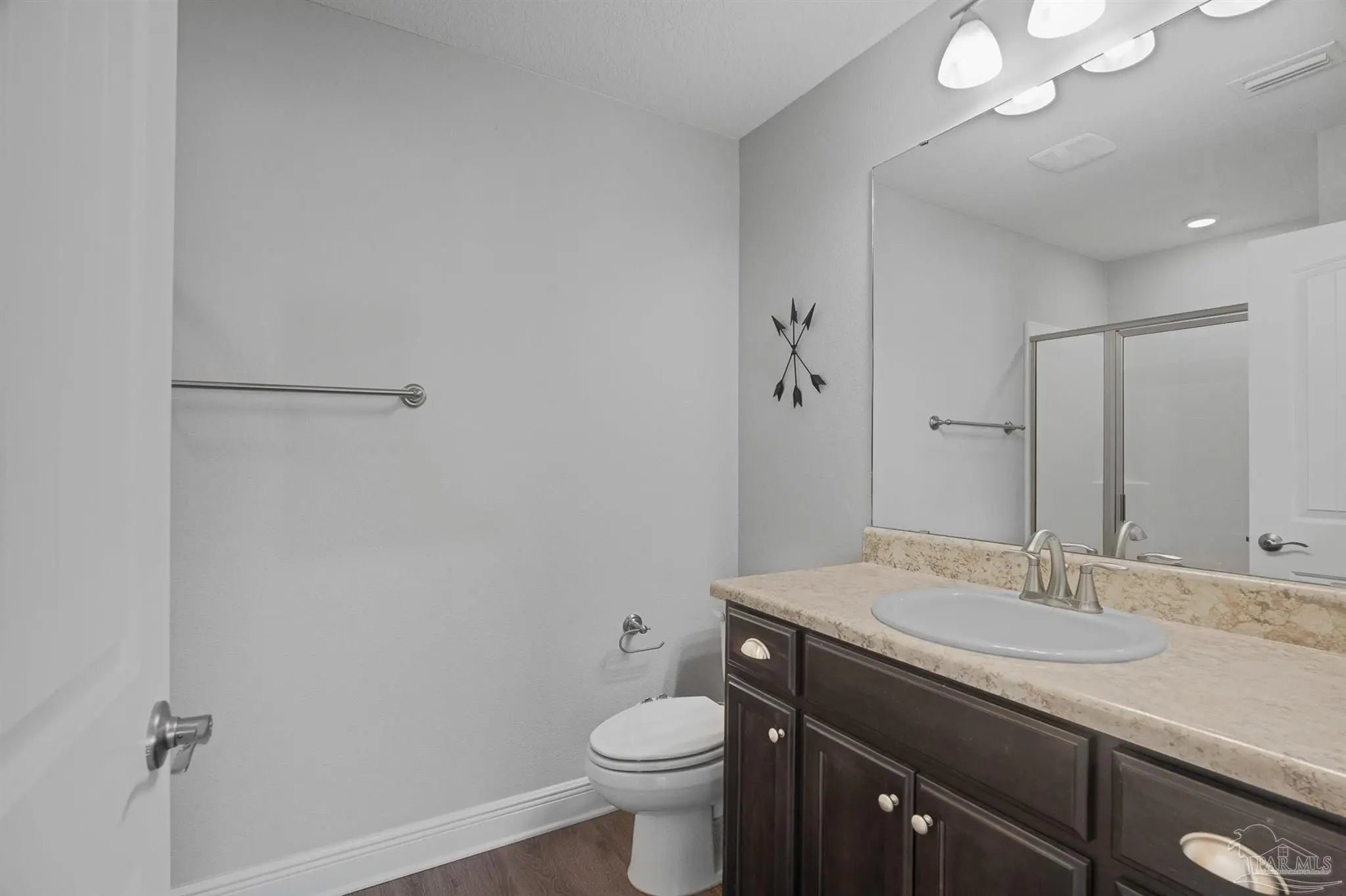 Welcome to this well-maintained two-story home featuring 3 bedrooms and 2.5 bathrooms, located in the highly sought-after Seagrass Point Subdivision. The kitchen is equipped with stainless steel appliances, hard surface countertops, dark wood cabinetry, a bar-height counter, double sink, and a dedicated eat-in dining area. The main living and dining spaces have luxury vinyl plank flooring, providing a modern look with no carpet on the first floor. A conveniently located half bath and additional storage closet complete the downstairs layout. Upstairs, you’ll find all three bedrooms along with a versatile bonus space ideal for a home office, playroom, or additional living area. The primary suite features a trey ceiling, ceiling fan, and a spacious ensuite bathroom with double vanities, a walk-in closet, and a tub/shower combination. A full guest bathroom with a walk-in shower and an upstairs laundry closet add to the home’s functionality. The fully fenced backyard includes a concrete patio, perfect for outdoor relaxation or entertaining. LED lighting, Fabric Shield hurricane shutters, Moen fixtures, a finished garage, architectural shingle roof, ceiling fans, and window blinds throughout. This home offers a great combination of location, updates, and livable space—schedule your showing today. Conveniently situated near NAS Pensacola, as well as shopping and dining options including Target, Walmart, and Aldi, this home offers both comfort and accessibility. **** Buyer to verify all information, features and dimensions ****