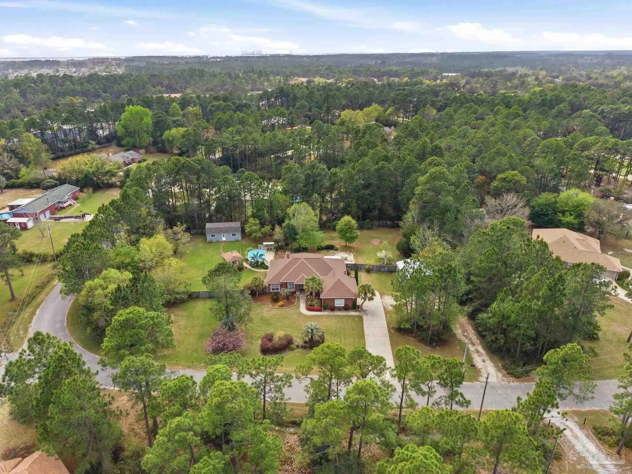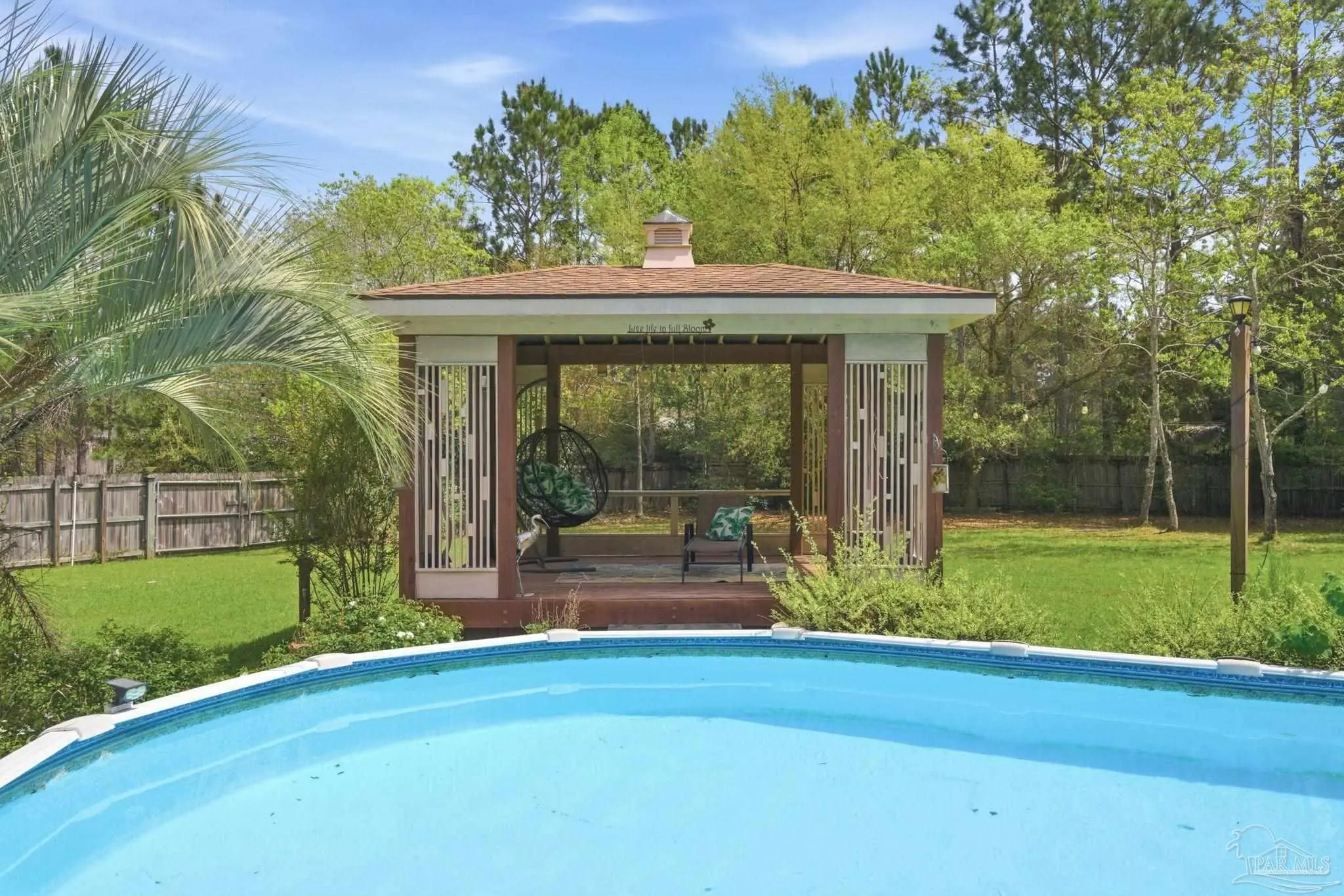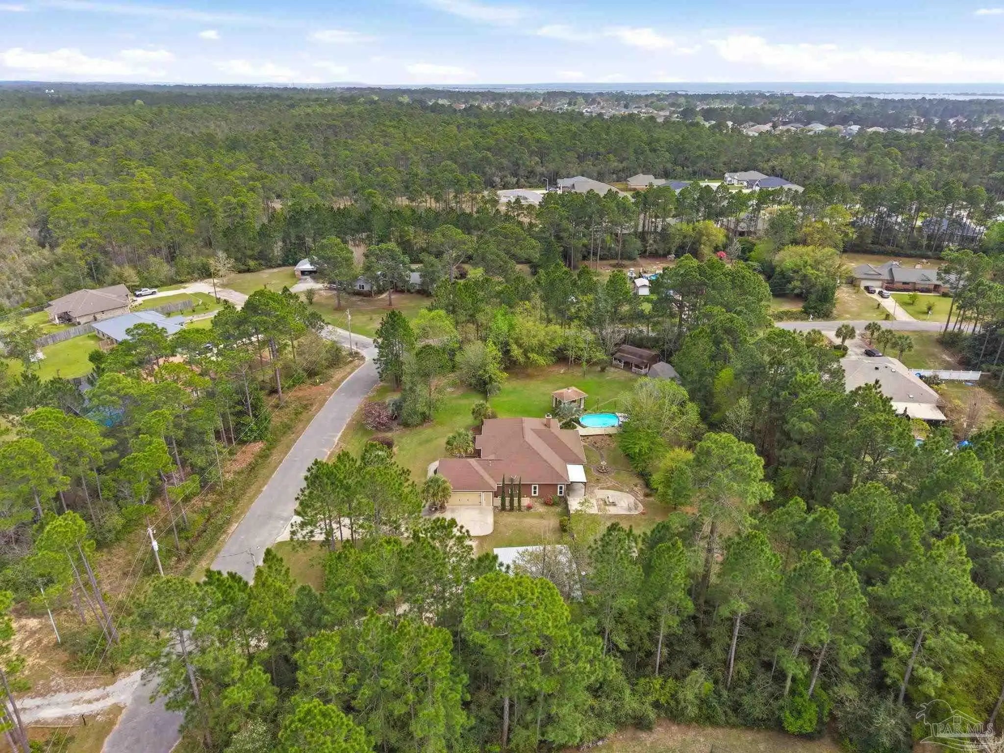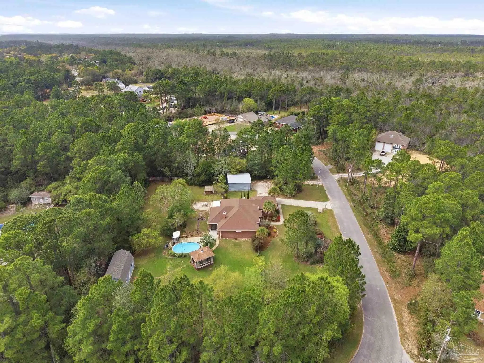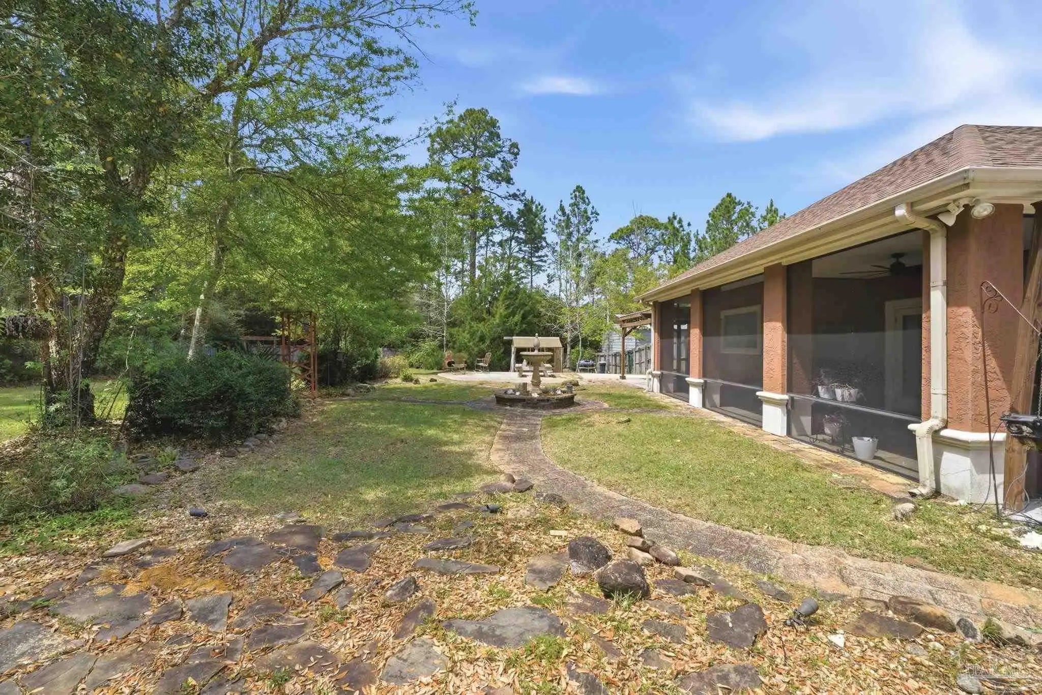 Welcome to this stunning, custom-designed retreat of a home - perfectly situated on 1.27 acres in the Whispering Pines community of Navarre. This 2,216 SqFt home offers a split floor plan with an open concept Main living space with accented wood beamed ceilings and pillars and beautiful, semi-polished travertine stone flooring that flows seamlessly throughout—ensuring a carpet-free, low-maintenance living experience. The heart of the home is a chef’s dream kitchen, featuring a massive 3x10 granite island with breakfast bar, stainless steel appliances - including a gas powered stove - a farmhouse sink, and updated cabinetry. The dining room impresses with eleven-foot ceilings and an elegant wood-accented tray ceiling, while the spacious living room centers around a cozy fireplace and triple French doors that lead to your outdoor sanctuary. The primary suite is complete with a lighted, double tray ceiling, a private entrance to the backyard, and a spa-like ensuite bathroom featuring a massive walk-in travertine shower with standalone soaking tub, double vanity, and an oversized closet. Two additional bedrooms provide ample space for family or guests - one with double doors that open to the backyard. There's also a dedicated bonus room with a custom window seat that could serve as an ideal home office or playroom. Step outside to a backyard built for relaxation and entertaining, where a screened lanai overlooks a lush, tropical garden oasis, a semi-inground pool surrounded by a spacious deck, a 512 SqFt climate controlled hobby or workshop, and a custom-designed gazebo. Complete with a side-entry two-car garage and a detached steel carport with plenty of room for an RV or boat, this exceptional property offers the perfect blend of secluded luxury and modern convenience.