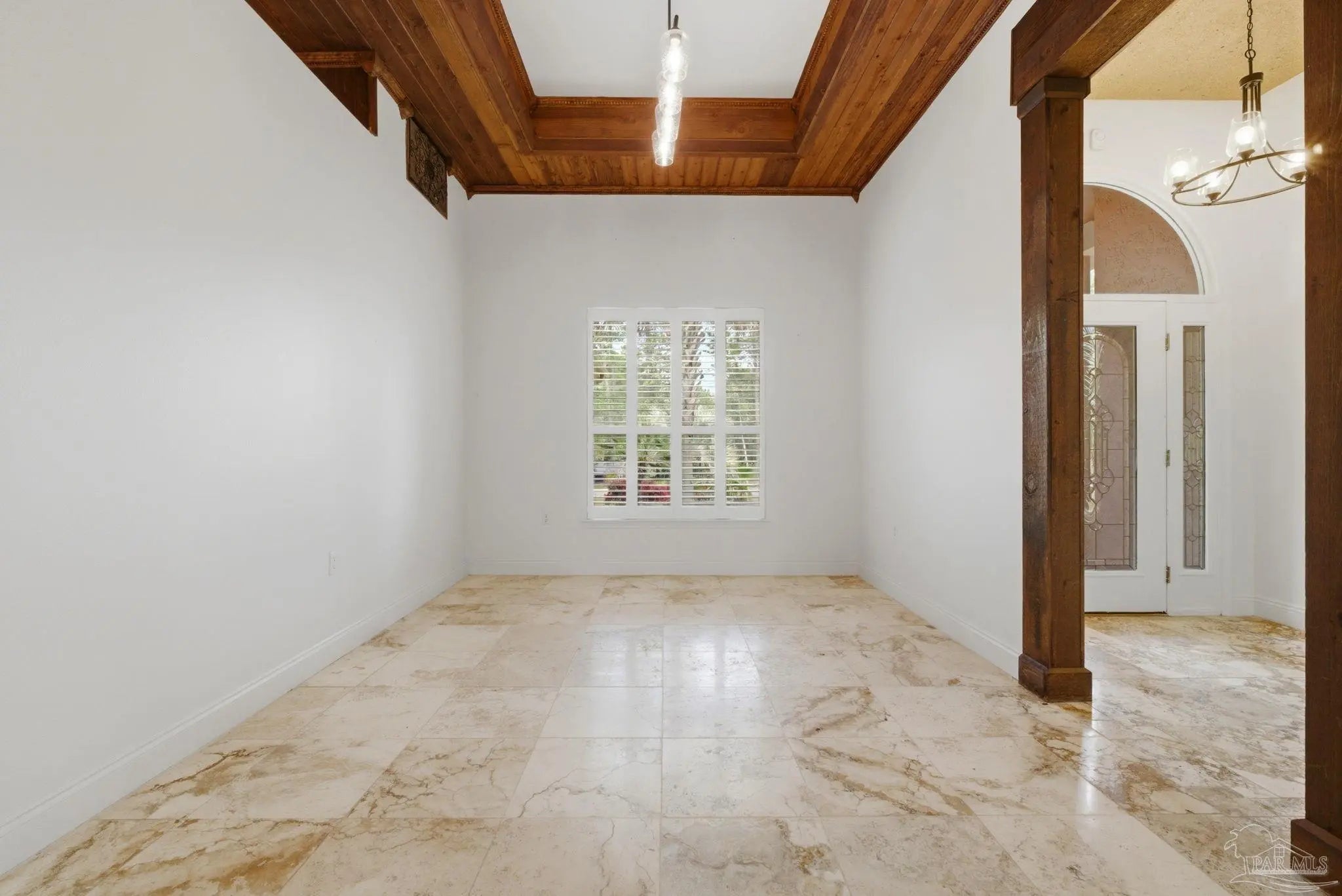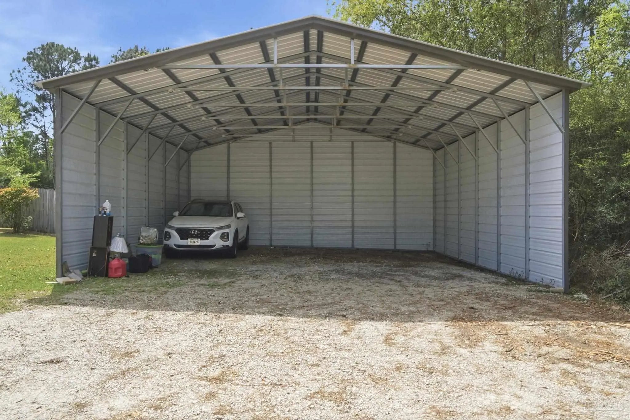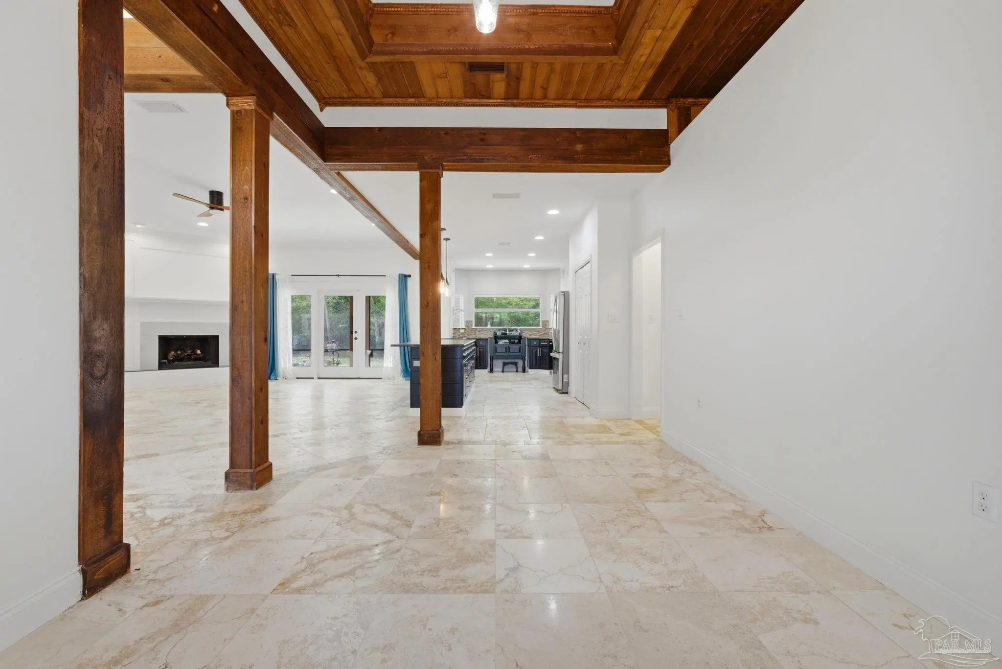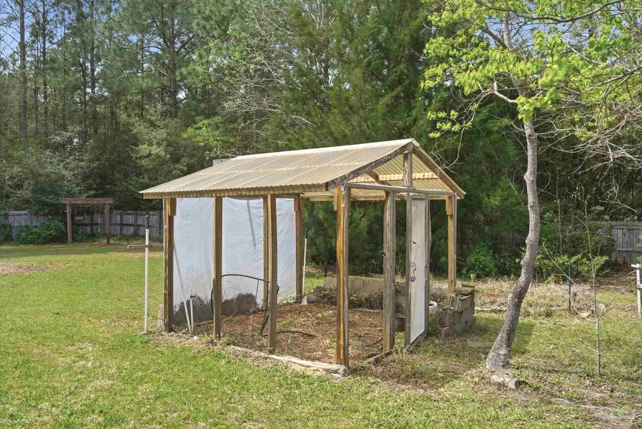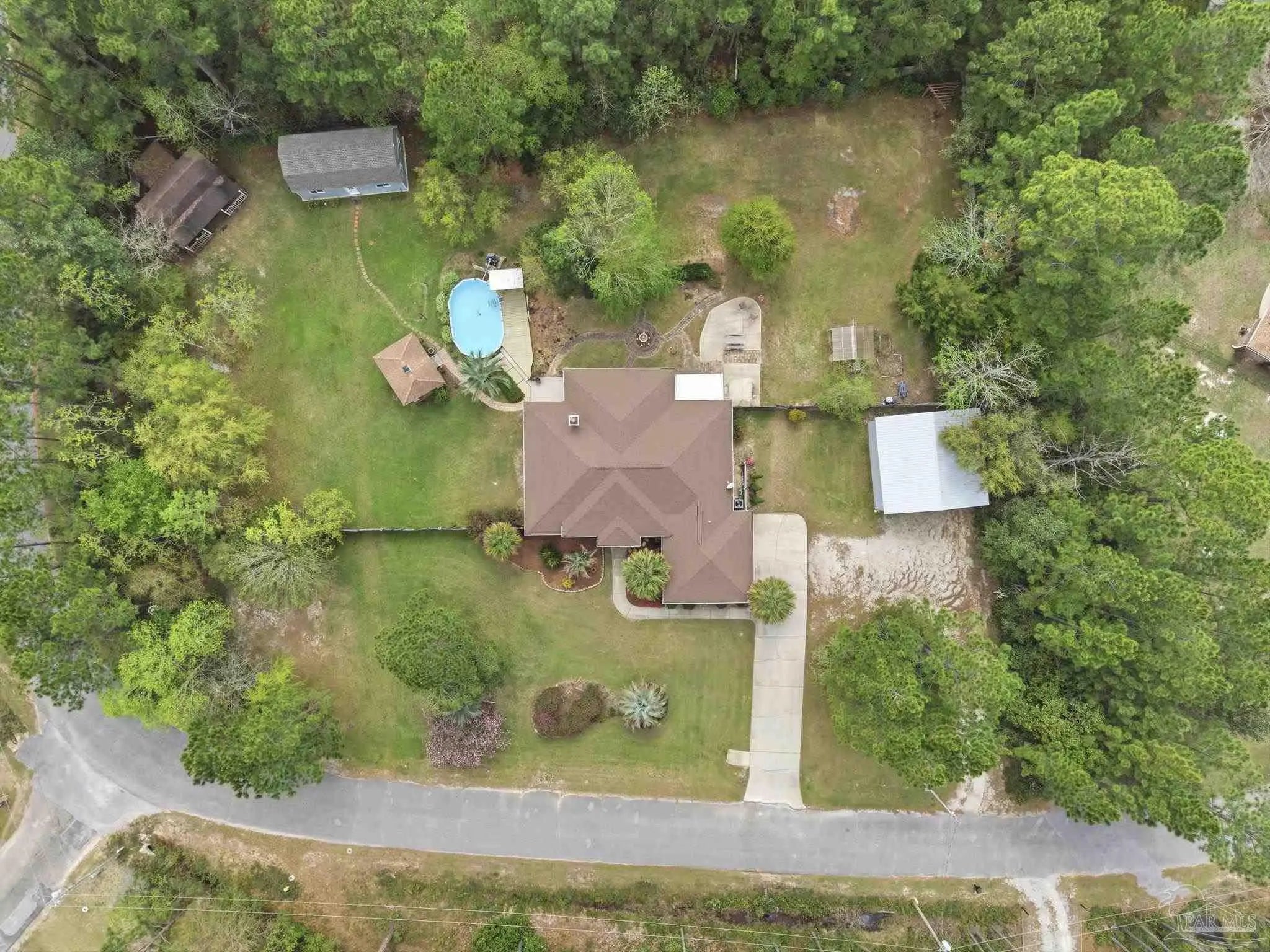 Welcome to this stunning, custom-designed retreat of a home - perfectly situated on 1.27 acres in the Whispering Pines community of Navarre. This 2,216 SqFt home offers a split floor plan with an open concept Main living space with accented wood beamed ceilings and pillars and beautiful, semi-polished travertine stone flooring that flows seamlessly throughout—ensuring a carpet-free, low-maintenance living experience. The heart of the home is a chef’s dream kitchen, featuring a massive 3x10 granite island with breakfast bar, stainless steel appliances - including a gas powered stove - a farmhouse sink, and updated cabinetry. The dining room impresses with eleven-foot ceilings and an elegant wood-accented tray ceiling, while the spacious living room centers around a cozy fireplace and triple French doors that lead to your outdoor sanctuary. The primary suite is complete with a lighted, double tray ceiling, a private entrance to the backyard, and a spa-like ensuite bathroom featuring a massive walk-in travertine shower with standalone soaking tub, double vanity, and an oversized closet. Two additional bedrooms provide ample space for family or guests - one with double doors that open to the backyard. There's also a dedicated bonus room with a custom window seat that could serve as an ideal home office or playroom. Step outside to a backyard built for relaxation and entertaining, where a screened lanai overlooks a lush, tropical garden oasis, a semi-inground pool surrounded by a spacious deck, a 512 SqFt climate controlled hobby or workshop, and a custom-designed gazebo. Complete with a side-entry two-car garage and a detached steel carport with plenty of room for an RV or boat, this exceptional property offers the perfect blend of secluded luxury and modern convenience.