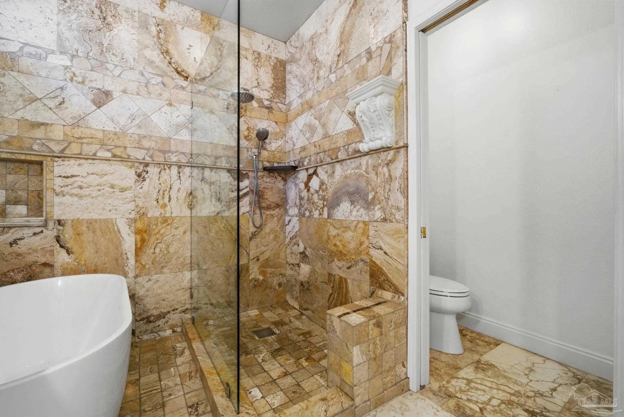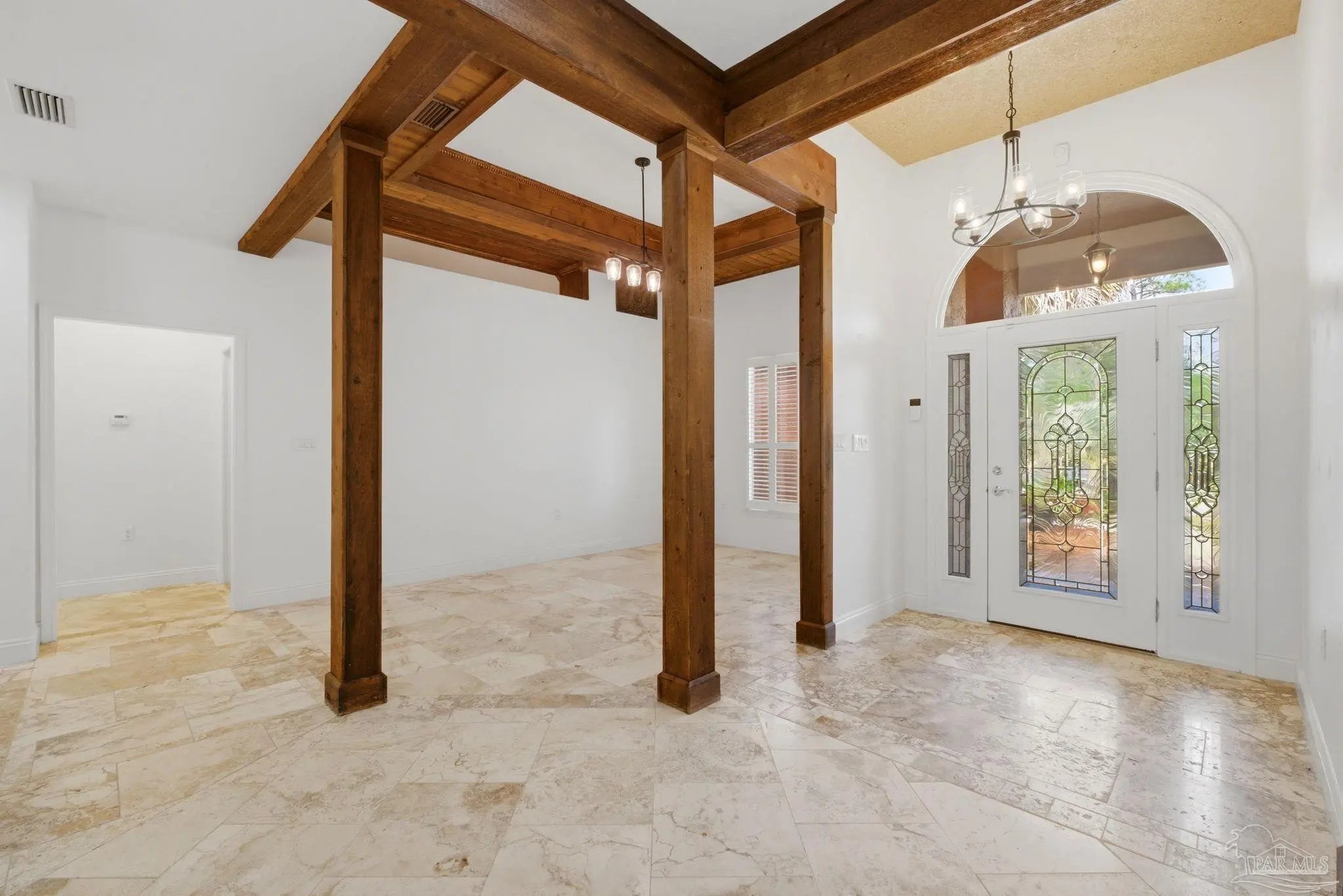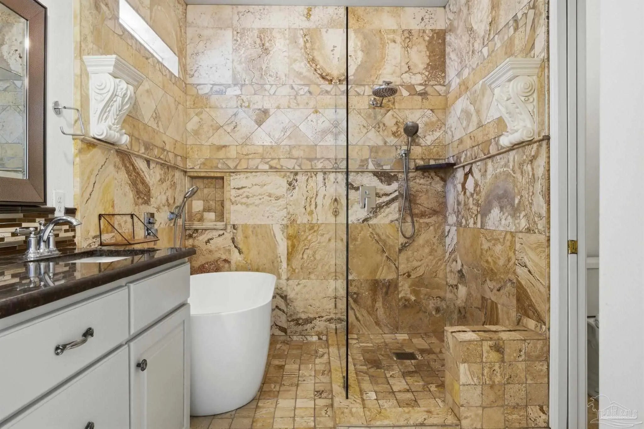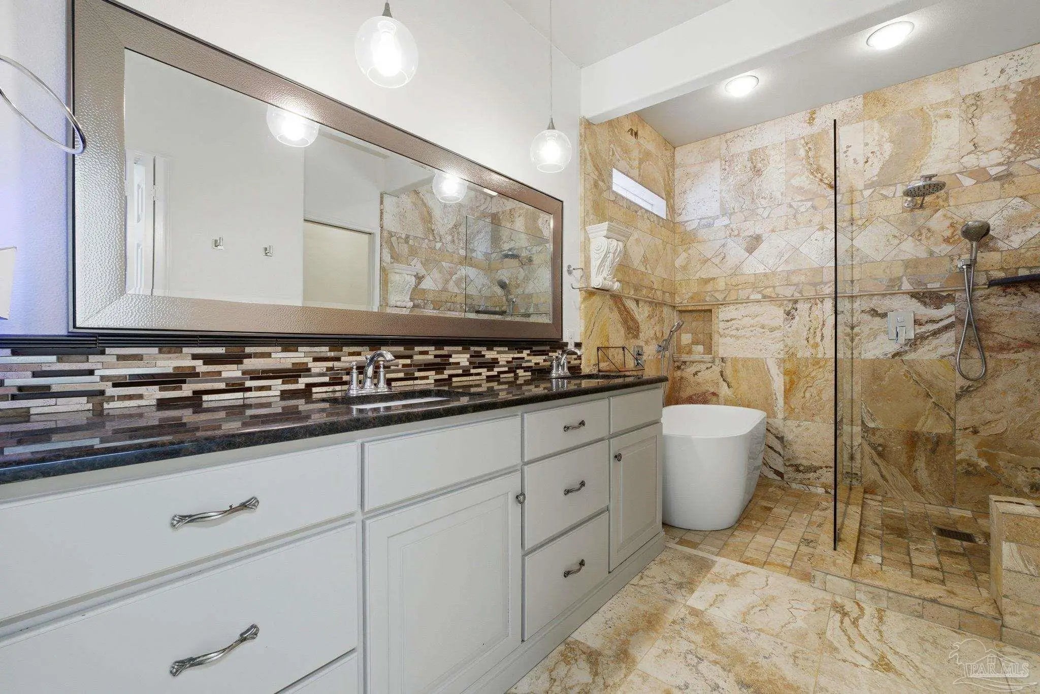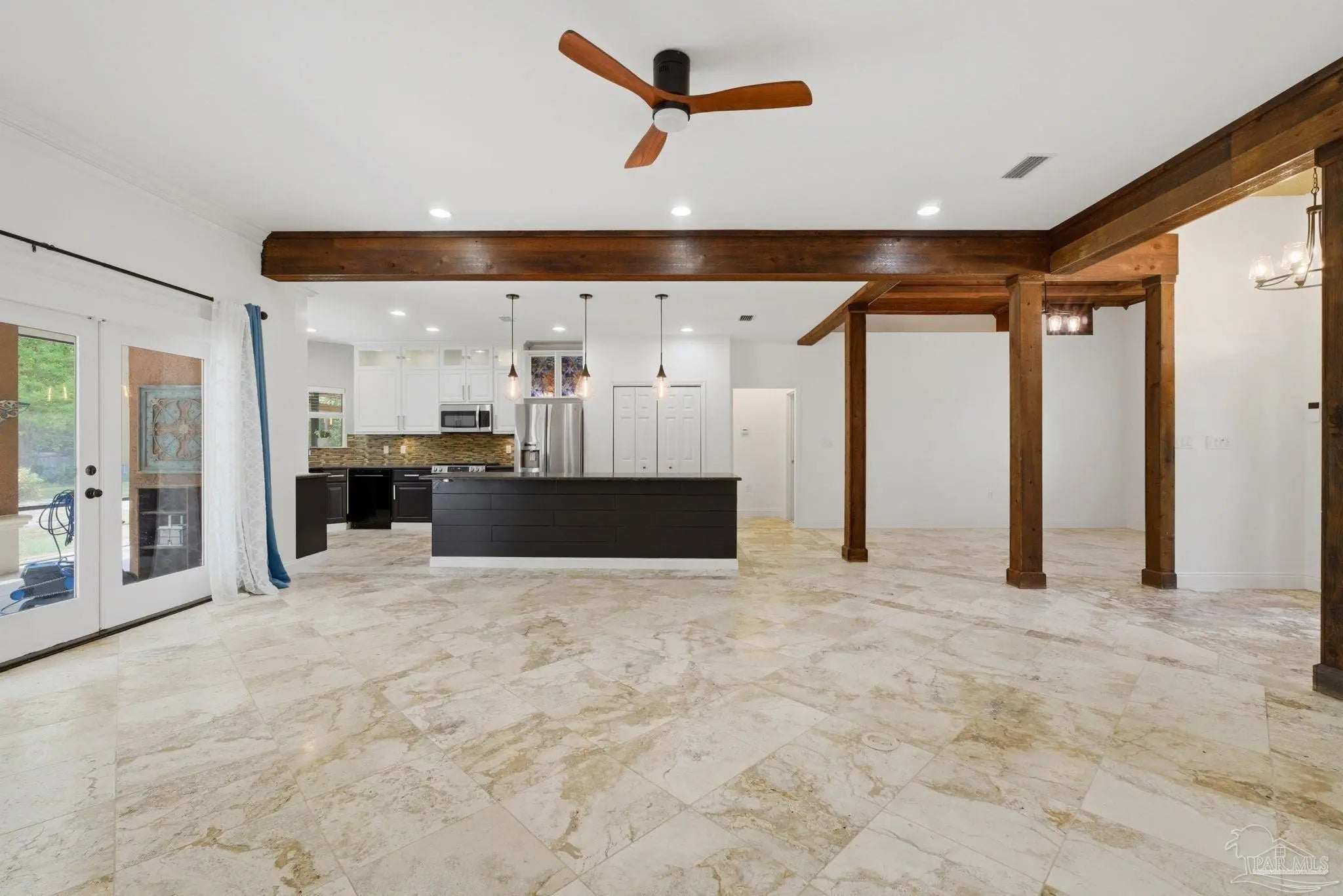 Welcome to this stunning, custom-designed retreat of a home - perfectly situated on 1.27 acres in the Whispering Pines community of Navarre. This 2,216 SqFt home offers a split floor plan with an open concept Main living space with accented wood beamed ceilings and pillars and beautiful, semi-polished travertine stone flooring that flows seamlessly throughout—ensuring a carpet-free, low-maintenance living experience. The heart of the home is a chef’s dream kitchen, featuring a massive 3x10 granite island with breakfast bar, stainless steel appliances - including a gas powered stove - a farmhouse sink, and updated cabinetry. The dining room impresses with eleven-foot ceilings and an elegant wood-accented tray ceiling, while the spacious living room centers around a cozy fireplace and triple French doors that lead to your outdoor sanctuary. The primary suite is complete with a lighted, double tray ceiling, a private entrance to the backyard, and a spa-like ensuite bathroom featuring a massive walk-in travertine shower with standalone soaking tub, double vanity, and an oversized closet. Two additional bedrooms provide ample space for family or guests - one with double doors that open to the backyard. There's also a dedicated bonus room with a custom window seat that could serve as an ideal home office or playroom. Step outside to a backyard built for relaxation and entertaining, where a screened lanai overlooks a lush, tropical garden oasis, a semi-inground pool surrounded by a spacious deck, a 512 SqFt climate controlled hobby or workshop, and a custom-designed gazebo. Complete with a side-entry two-car garage and a detached steel carport with plenty of room for an RV or boat, this exceptional property offers the perfect blend of secluded luxury and modern convenience.