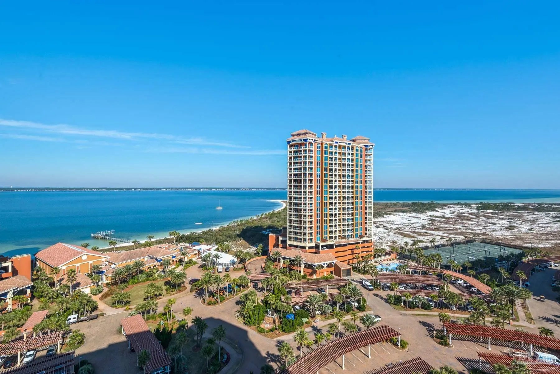 Relax on your balcony while overlooking the Intracoastal waterway on the 11th floor. Beautiful northern views of all the activity on the water and beautiful lights at night. In the summer, enjoy watching the fireworks directly across from you. This unit allows for comfort year around, as the sun will not directly hit your balcony at any given point in the day, yet offers beautiful trajectory views of both the East and West. Sellers spent $5000 in new appliances in 2022 and they just put in a new washer and dryer. This unit features 9 foot ceilings with 9 ft. sliders and windows to bring in these magnificent views. Master bedroom has large sliding door that opens to balcony, features 2 closets and private bath with double vanities, jetted tub and separate shower. Guest Room has private bath and French door that opens to balcony. Our European Spa and Lifestyle Center offers state of the art fitness area, treatment rooms, indoor spa, separate his and hers spa areas (with dry sauna, steam room, showers, lockers and lounge area), 2 lagoon pools with spas overlooking the intracoastal waterway and Indoor Olympic size lap pool Enjoy indoor dining at Coastal or relaxing poolside dining from Al Fresco Bar and Grill. Play tennis with 5 Rubico clay surface courts. Each Tower has its own Pool and Hot Tub. All of this is on-site for your convenience, as well as, a variety of water sport rentals, bikes mini cars, and golf carts. Don't miss this opportunity to own at the most complete destination resort on the Gulf Coast. Unit being sold fully furnished.