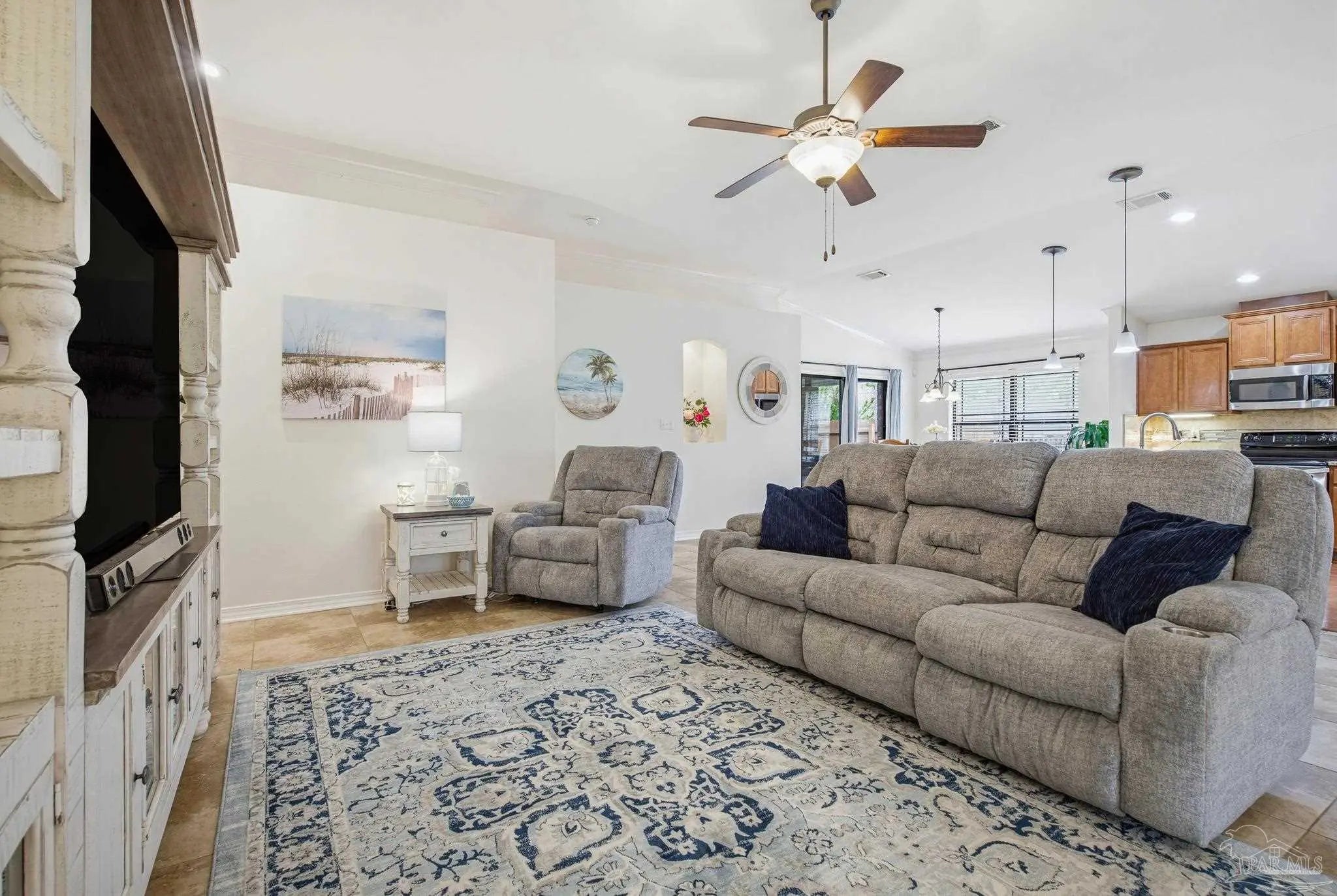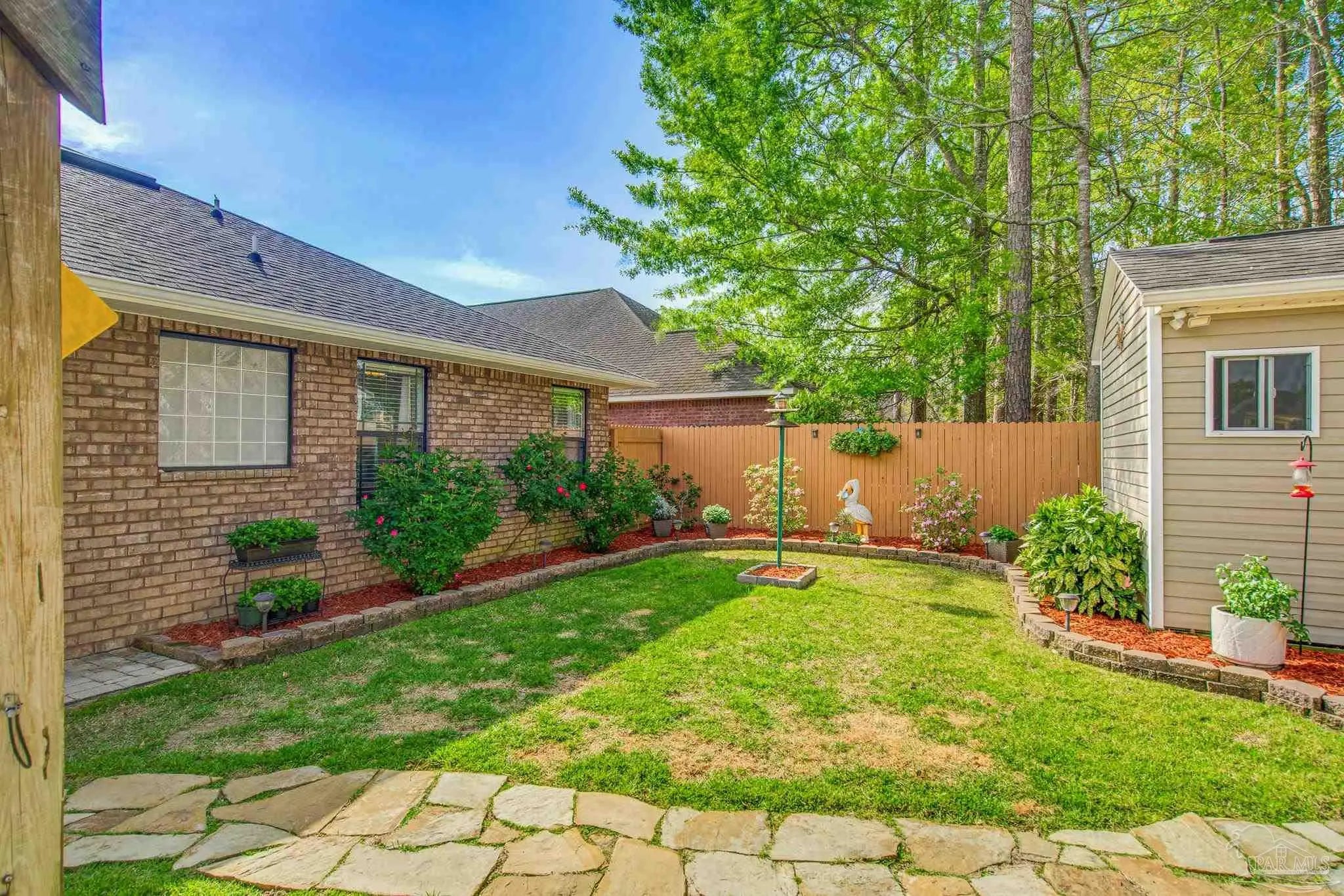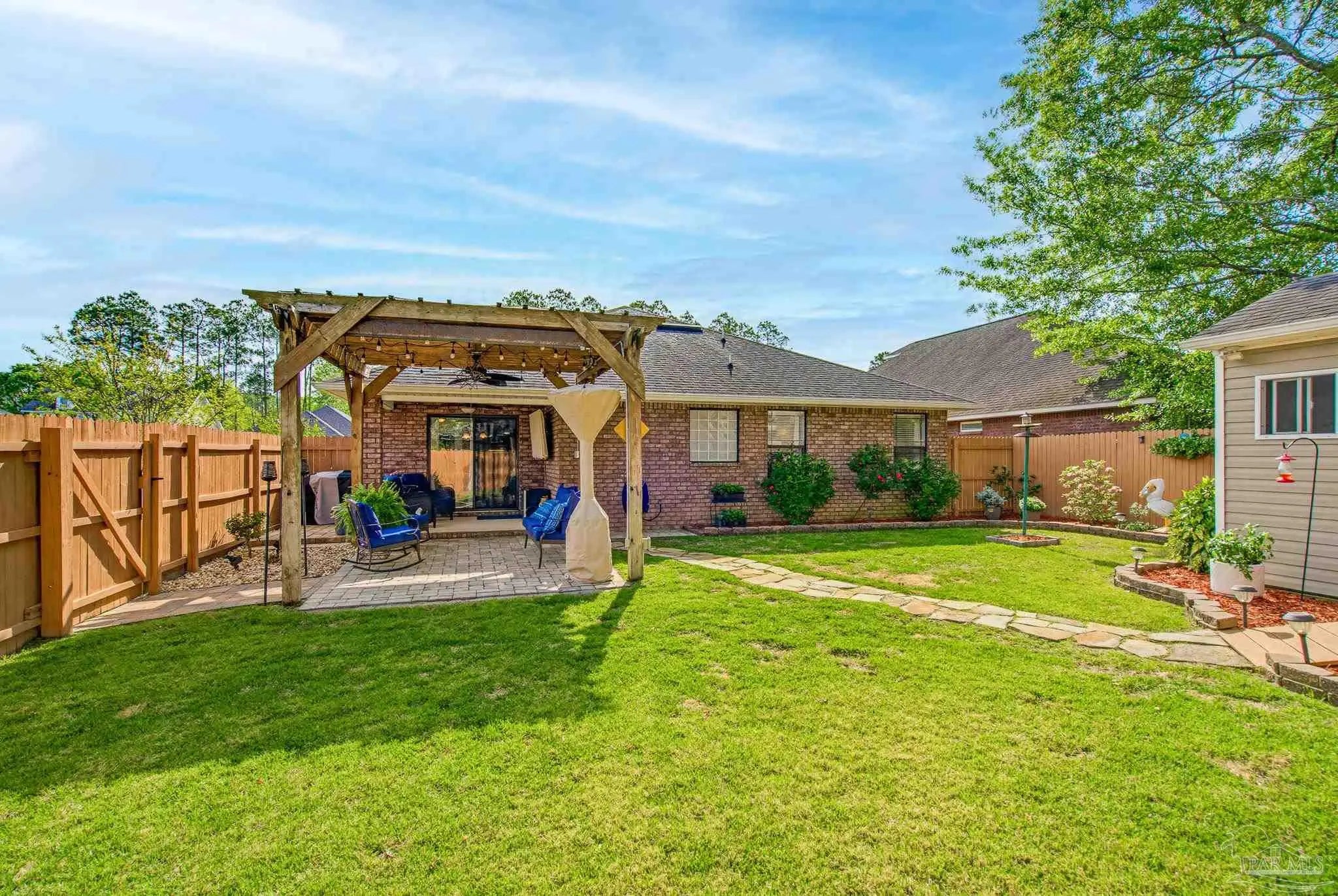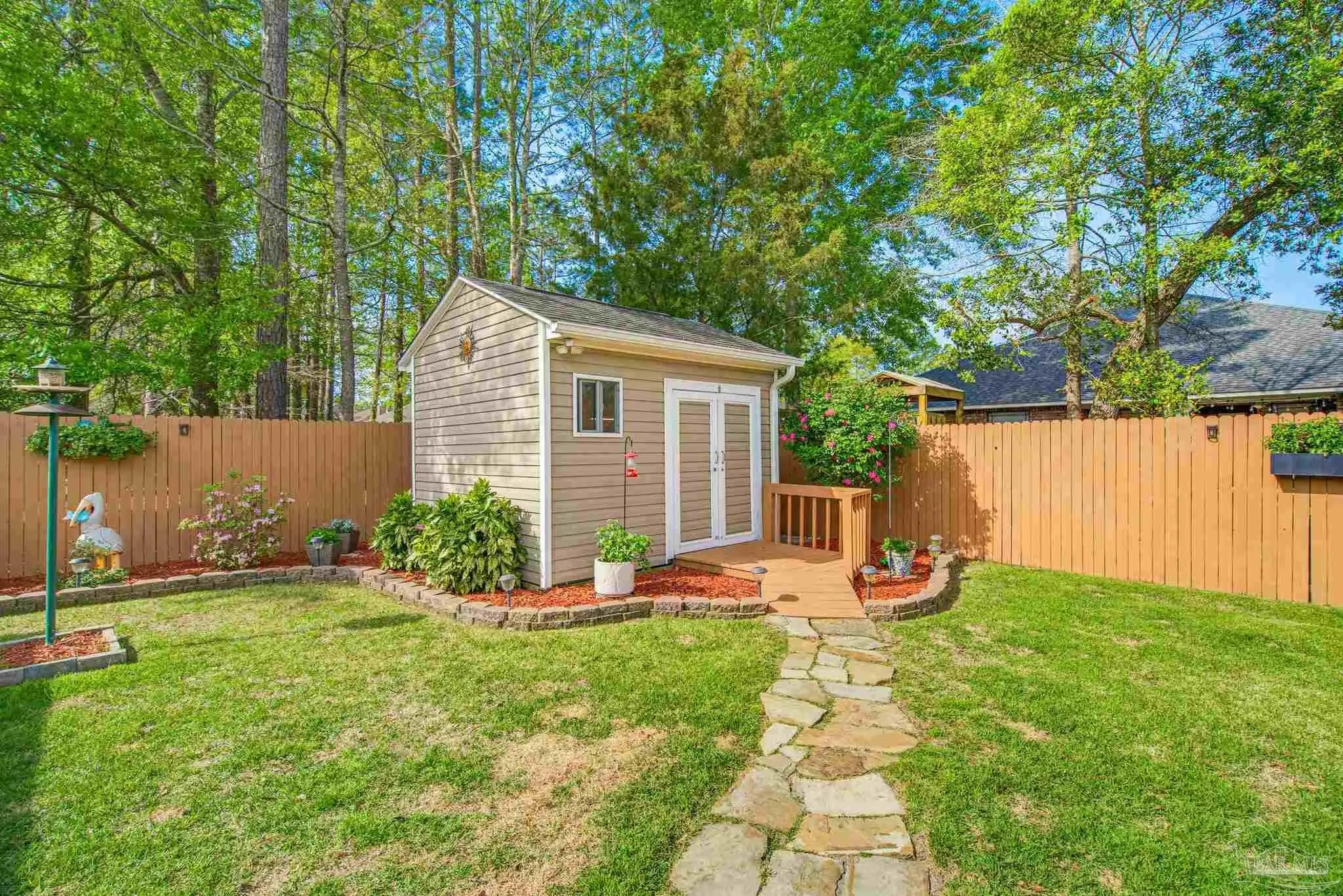 Welcome to this well-maintained 3-bedroom, 2-bath home on a corner lot in the gated community of Stonechase. Inside, you’ll find an open layout connecting the great room, kitchen, and dining area—perfect for everyday living or hosting guests. The great room features vaulted ceilings, crown molding, and tasteful built-in details, along with large ceramic tile floors that offer a natural stone look and run throughout the main living area. The kitchen is both stylish and functional, with granite countertops, a stainless sink, pendant and under-cabinet lighting, hardwood floors, and a walk-in pantry. The dining area is bright and open, with sliding glass doors leading out back—and that’s where this home really shines. Enjoy multiple outdoor spaces, including a dedicated grilling patio, a larger patio under a pergola with a ceiling fan, Tuscan-style stone pavers, and a covered area for relaxing in the shade. There’s also a powered storage shed with double doors and a window—perfect for tools, hobbies, or extra storage. Schedule your showing today!
