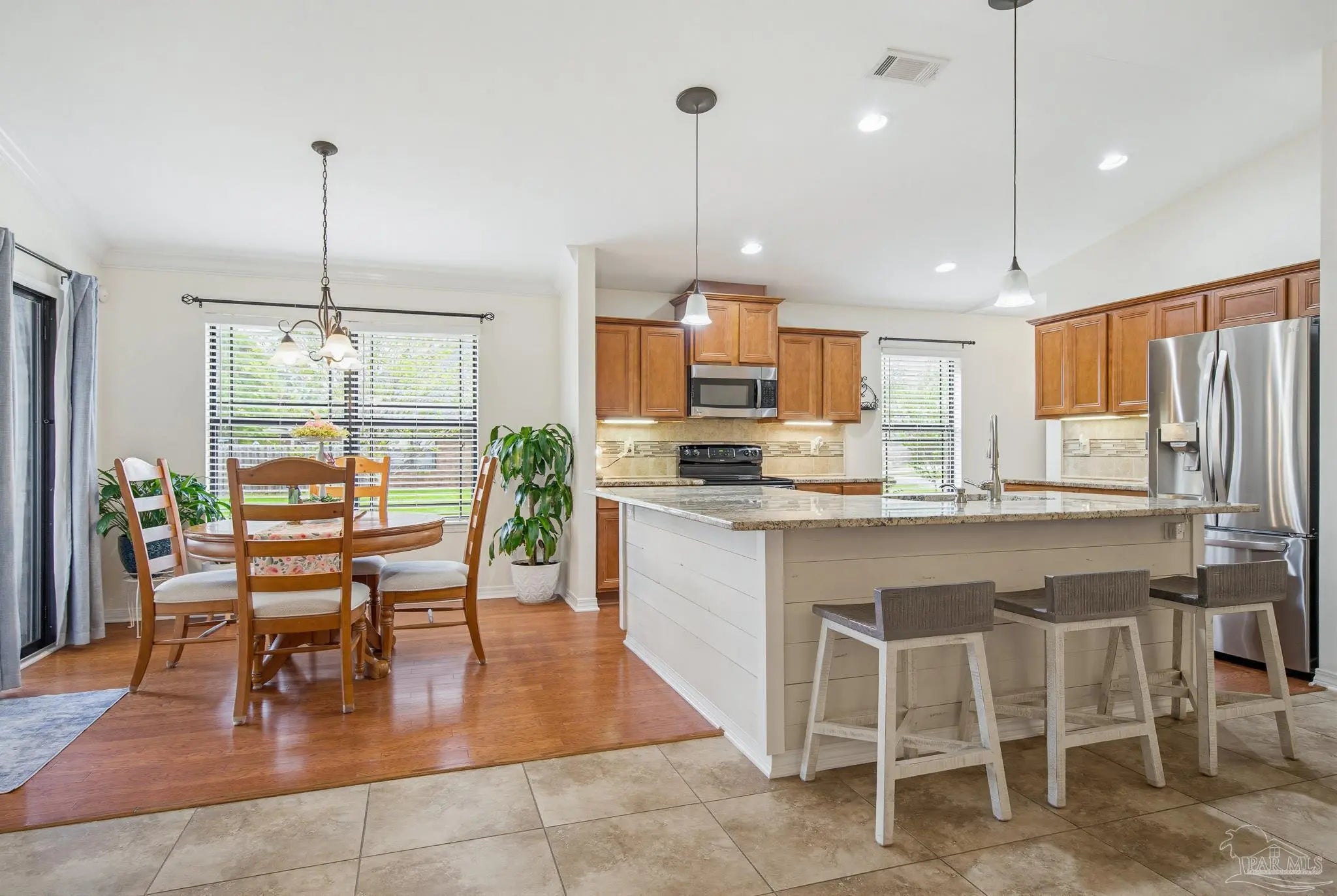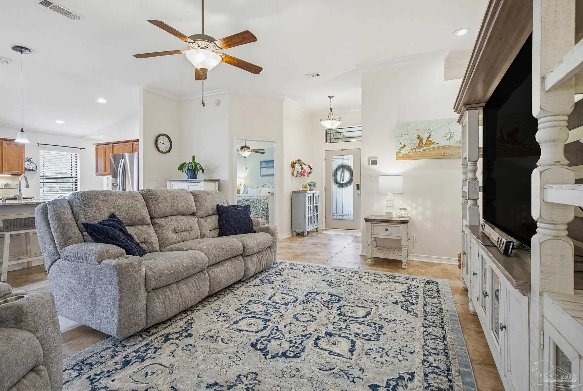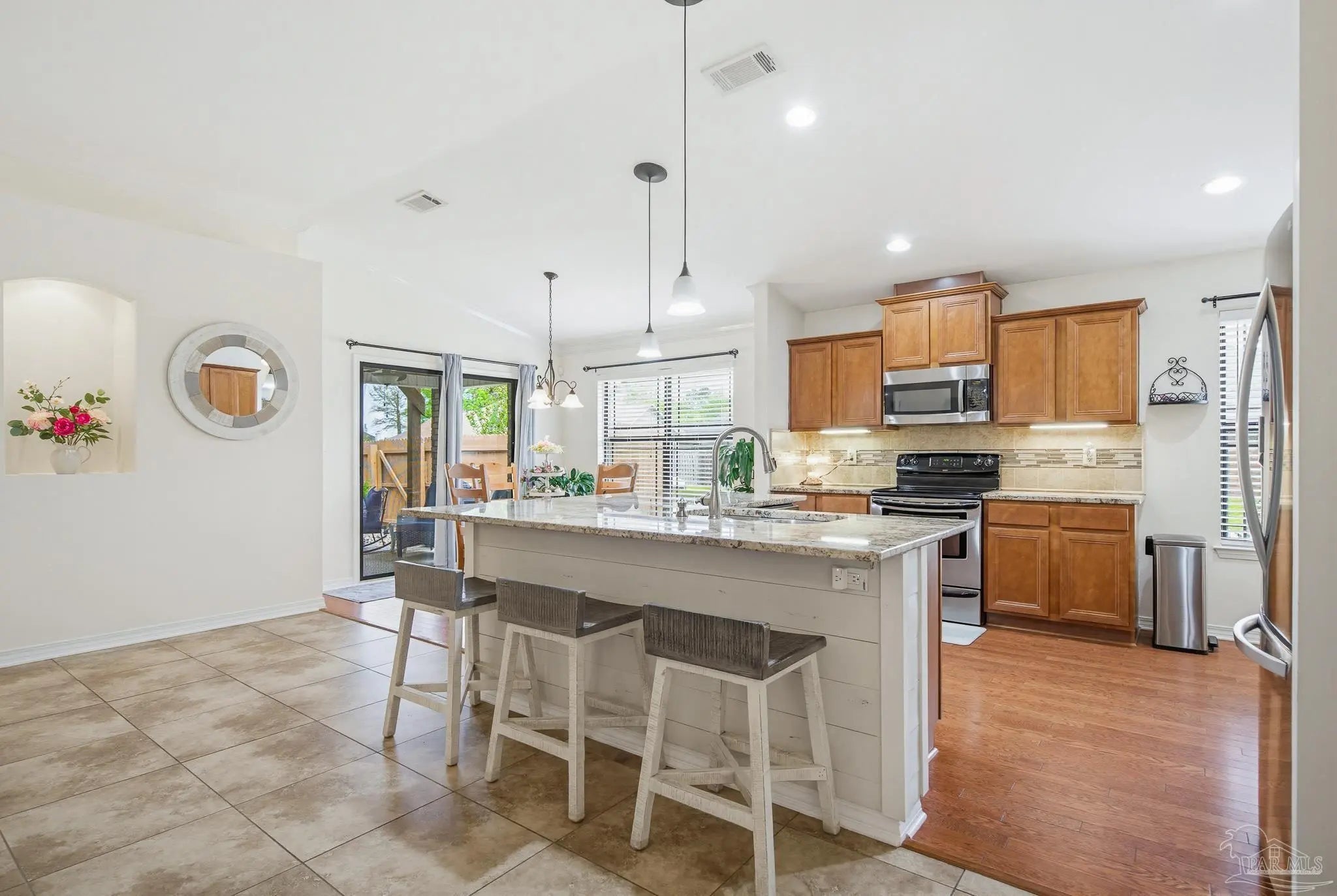 Welcome to this well-maintained 3-bedroom, 2-bath home on a corner lot in the gated community of Stonechase. Inside, you’ll find an open layout connecting the great room, kitchen, and dining area—perfect for everyday living or hosting guests. The great room features vaulted ceilings, crown molding, and tasteful built-in details, along with large ceramic tile floors that offer a natural stone look and run throughout the main living area. The kitchen is both stylish and functional, with granite countertops, a stainless sink, pendant and under-cabinet lighting, hardwood floors, and a walk-in pantry. The dining area is bright and open, with sliding glass doors leading out back—and that’s where this home really shines. Enjoy multiple outdoor spaces, including a dedicated grilling patio, a larger patio under a pergola with a ceiling fan, Tuscan-style stone pavers, and a covered area for relaxing in the shade. There’s also a powered storage shed with double doors and a window—perfect for tools, hobbies, or extra storage. Schedule your showing today!