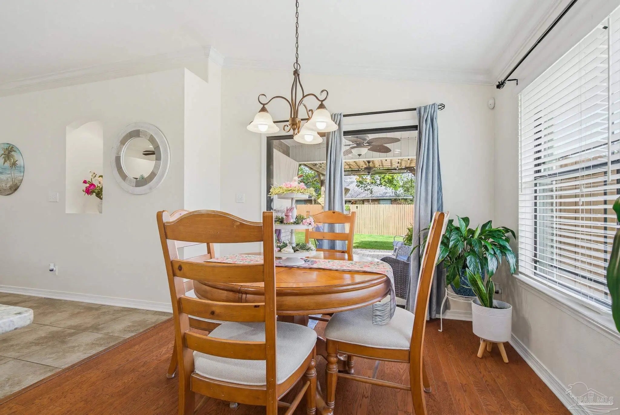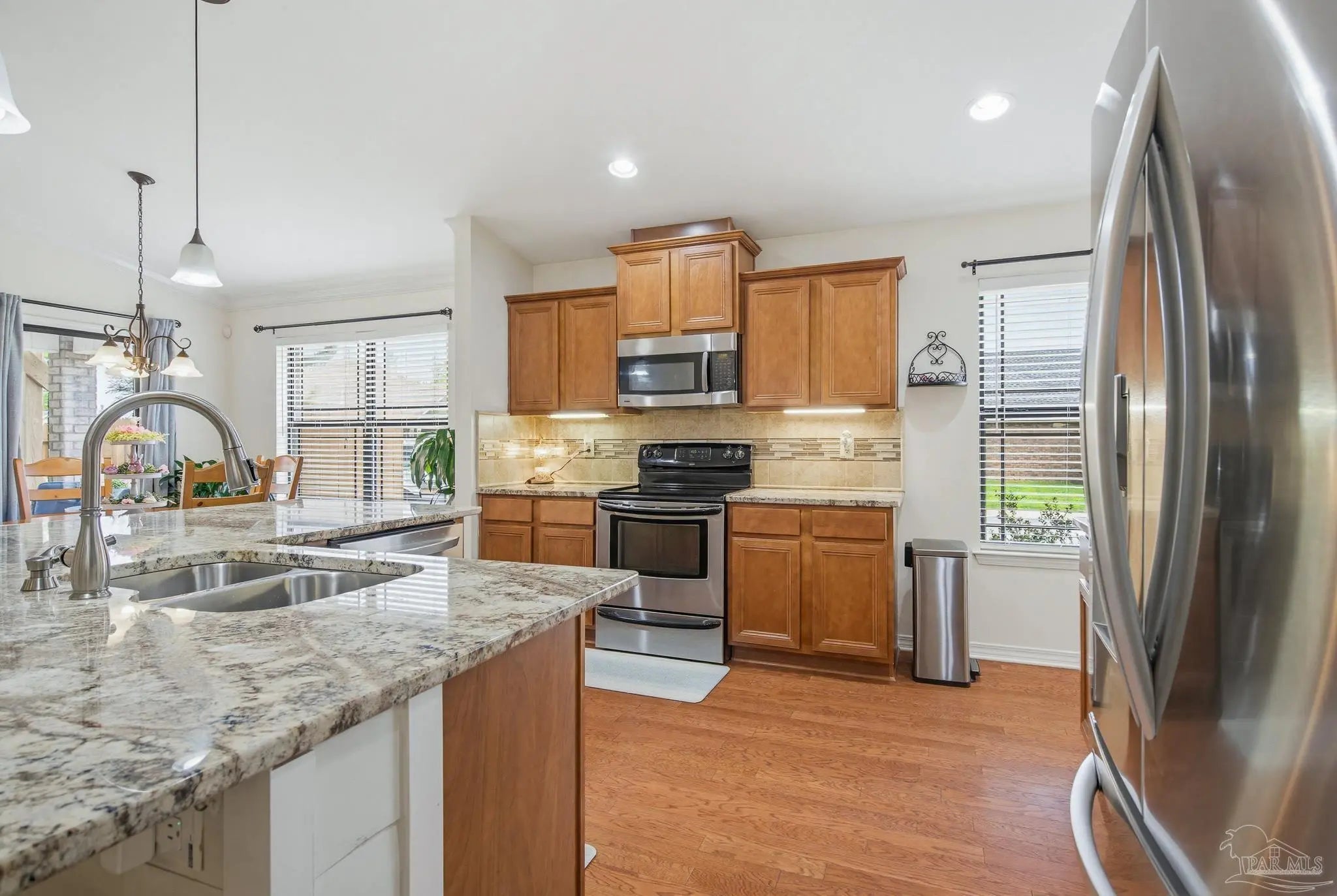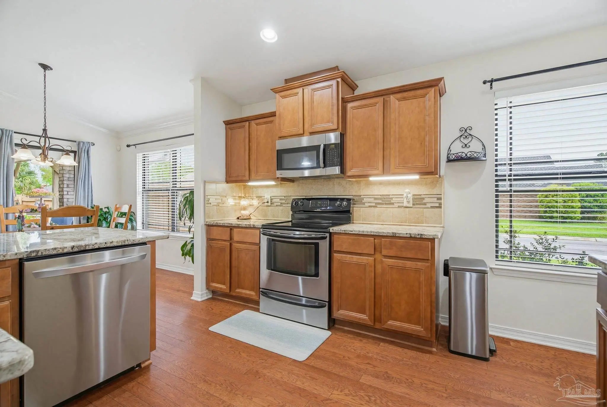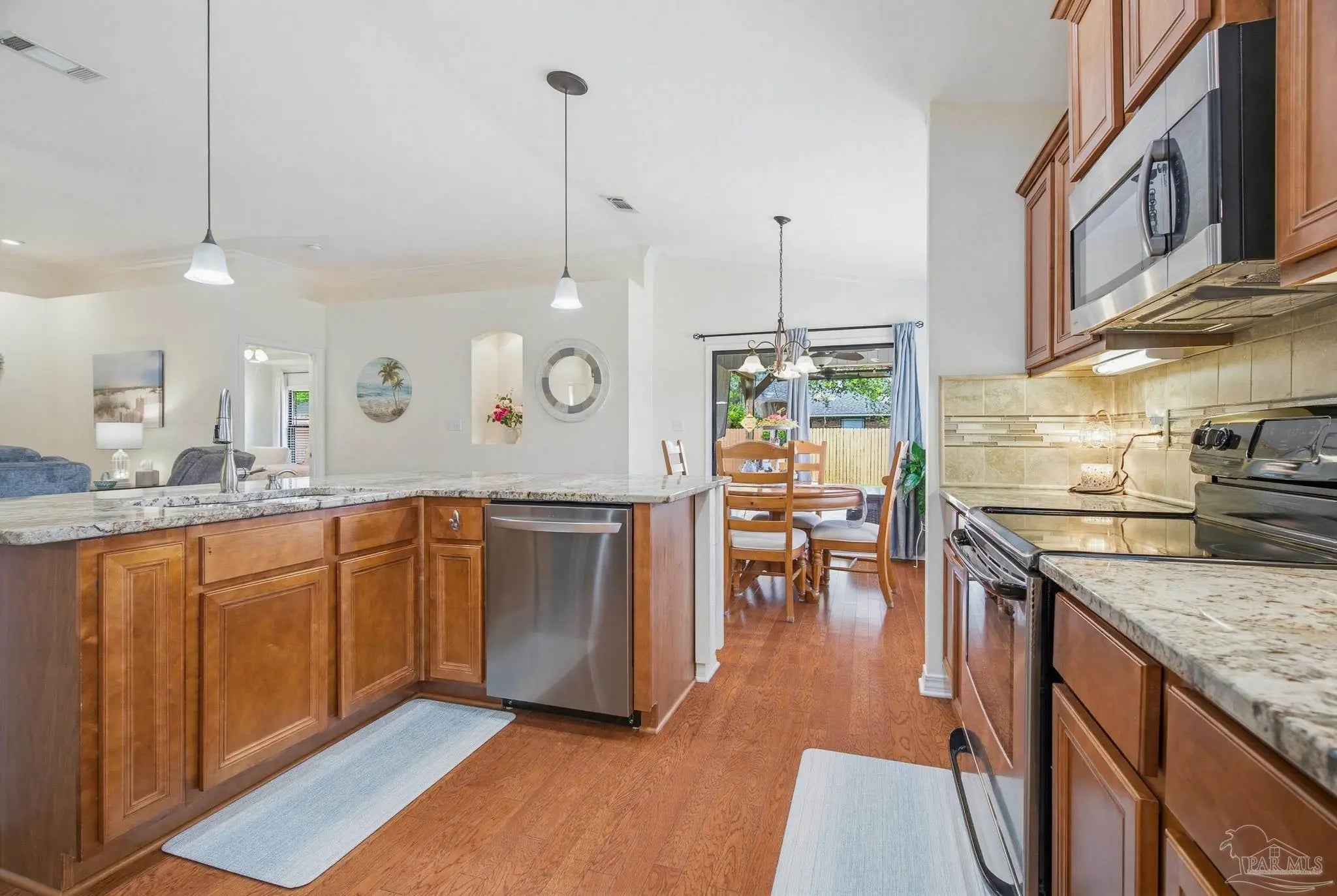 Welcome to this well-maintained 3-bedroom, 2-bath home on a corner lot in the gated community of Stonechase. Inside, you’ll find an open layout connecting the great room, kitchen, and dining area—perfect for everyday living or hosting guests. The great room features vaulted ceilings, crown molding, and tasteful built-in details, along with large ceramic tile floors that offer a natural stone look and run throughout the main living area. The kitchen is both stylish and functional, with granite countertops, a stainless sink, pendant and under-cabinet lighting, hardwood floors, and a walk-in pantry. The dining area is bright and open, with sliding glass doors leading out back—and that’s where this home really shines. Enjoy multiple outdoor spaces, including a dedicated grilling patio, a larger patio under a pergola with a ceiling fan, Tuscan-style stone pavers, and a covered area for relaxing in the shade. There’s also a powered storage shed with double doors and a window—perfect for tools, hobbies, or extra storage. Schedule your showing today!