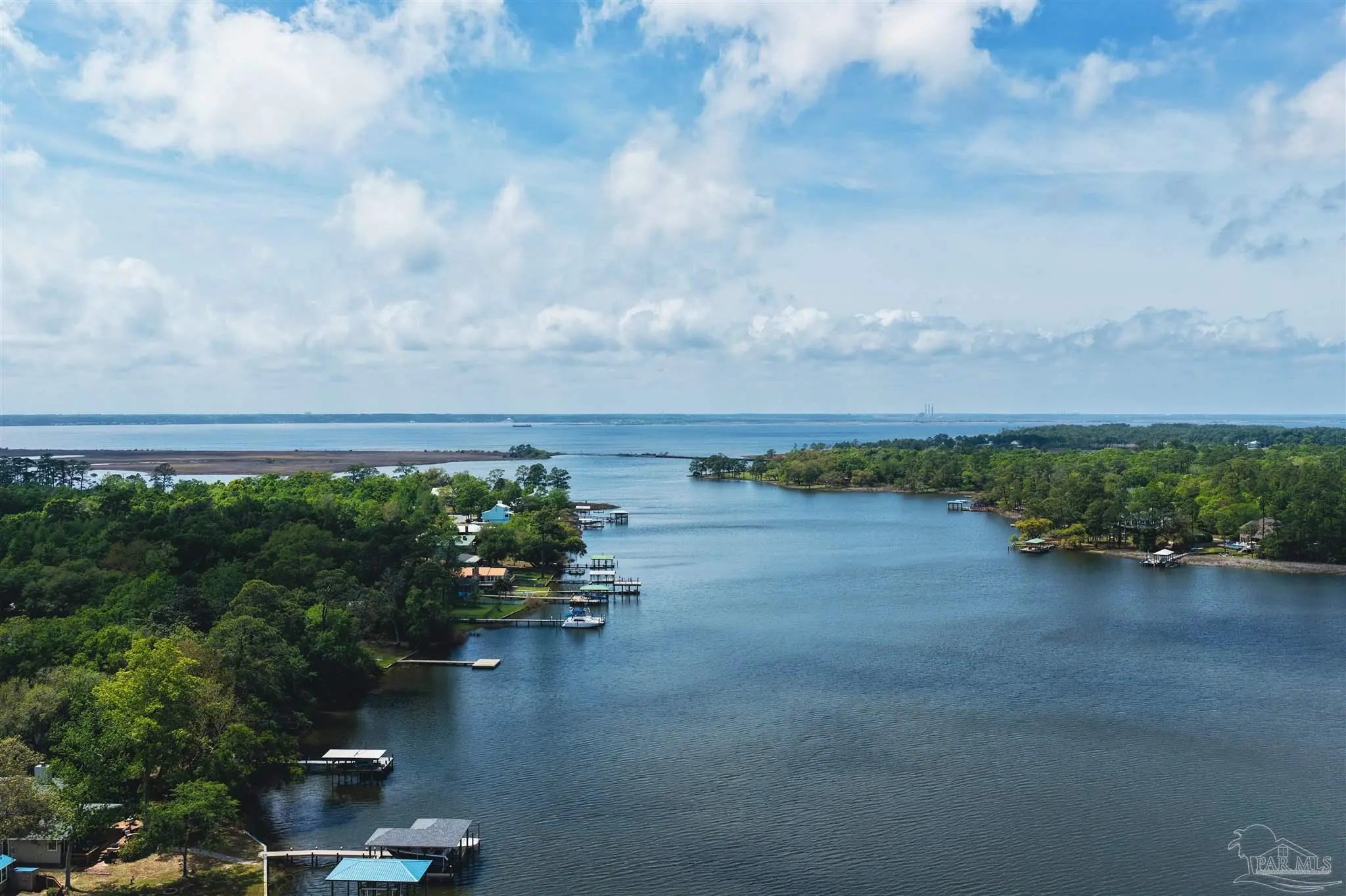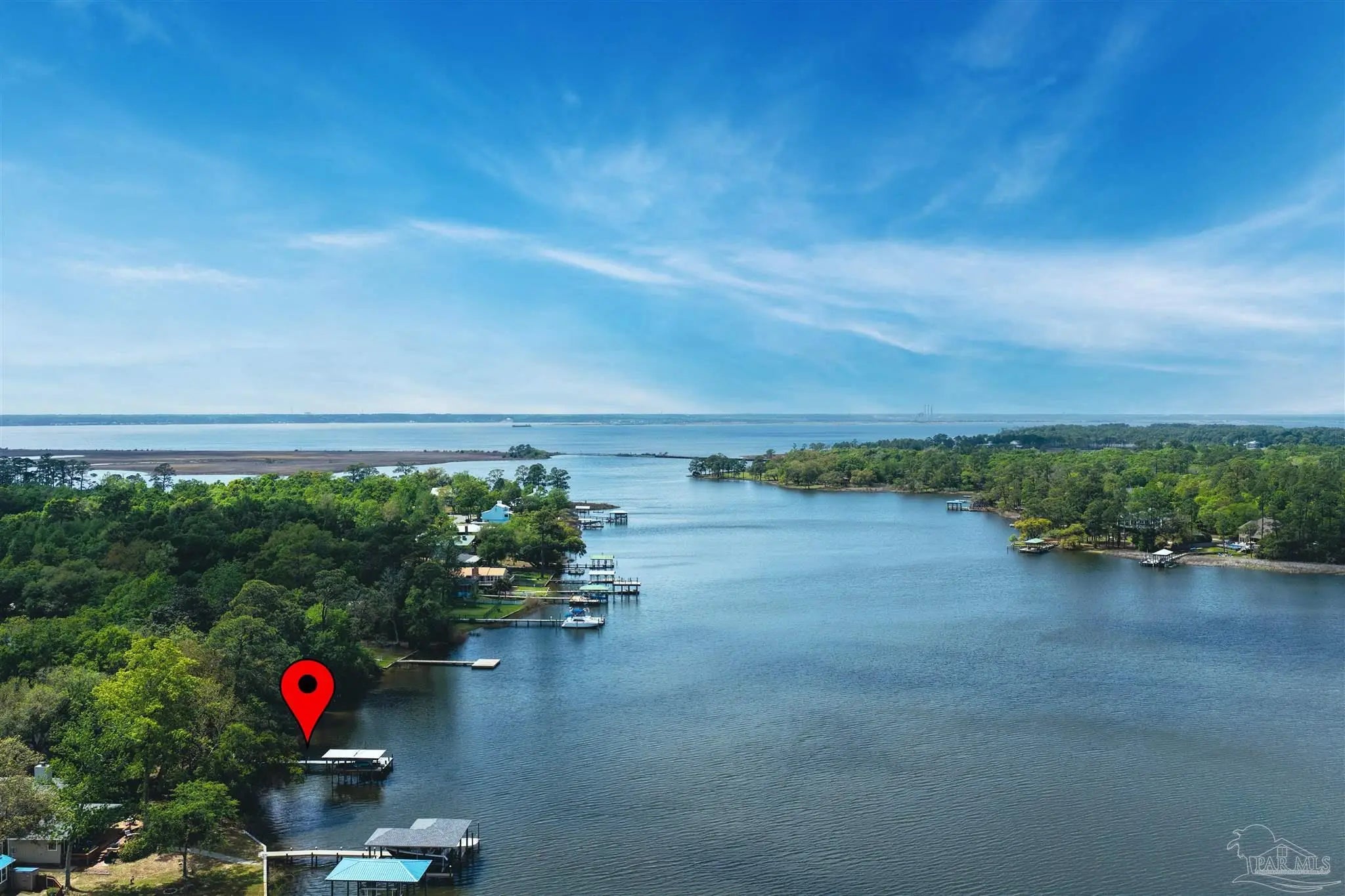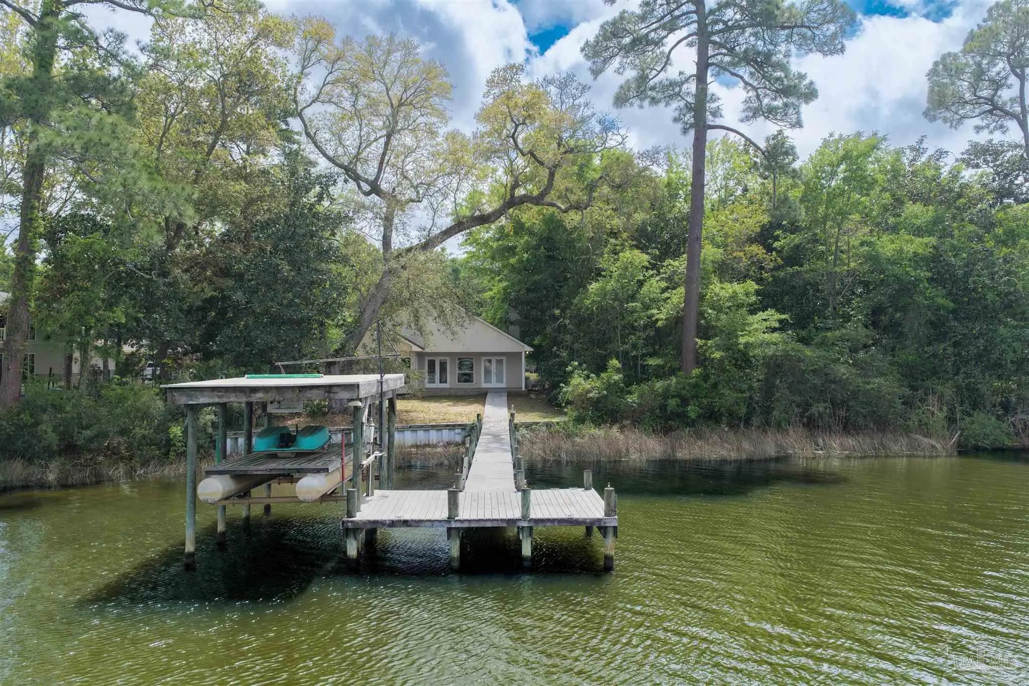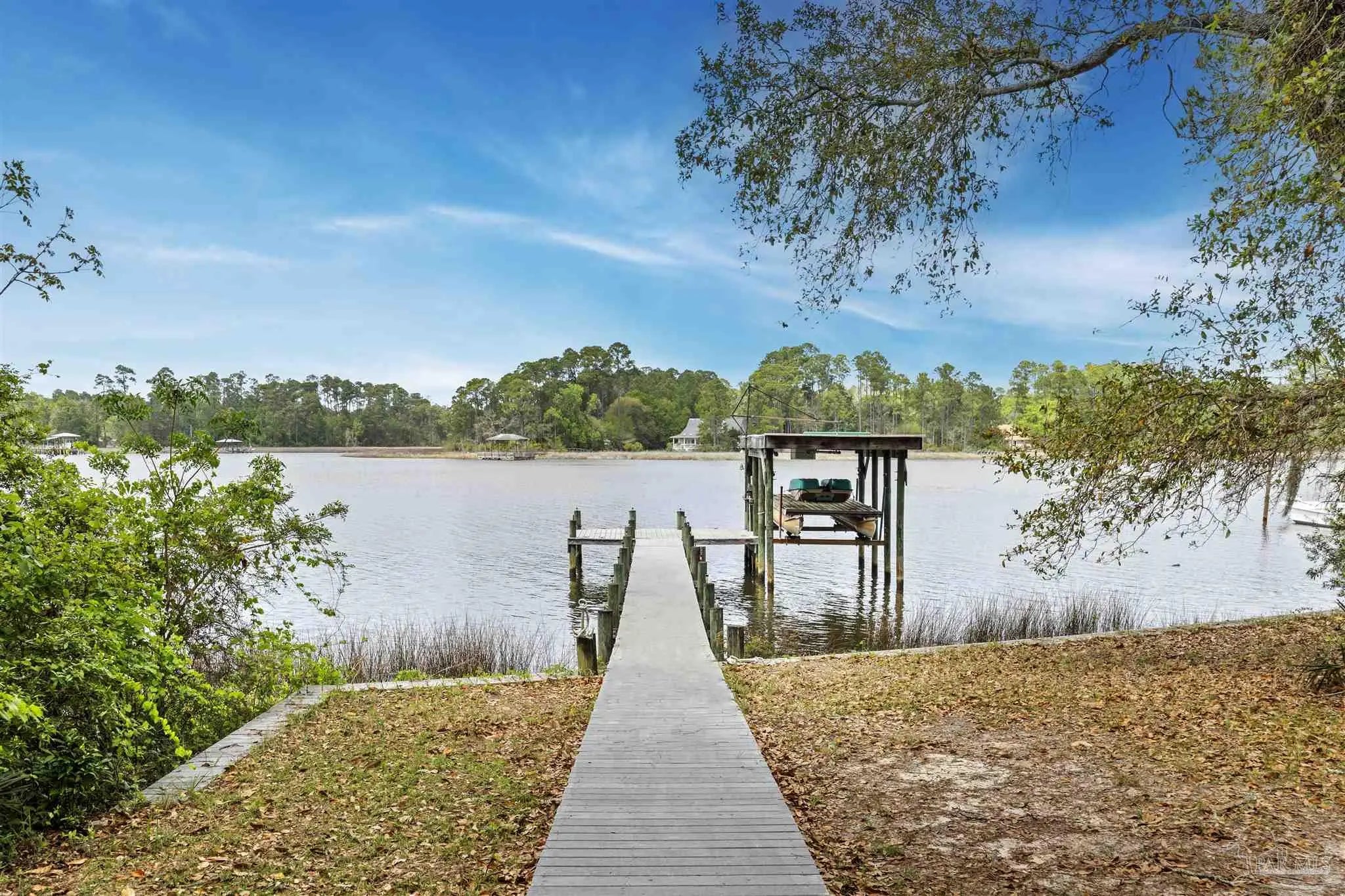 Waterfront living on Mulatto Bayou with direct access to Escambia Bay and beyond to Pensacola Beach, this 3 bedroom, 2 bath home offers 55 feet of waterfront complete with a private dock and boat lift, making it ideal for boating and enjoying coastal lifestyle living; inside, the home features an open layout with tiled flooring throughout the main living areas, a spacious living room with fireplace, and large windows that capture beautiful water views from both the living room and the primary bedroom; the kitchen is equipped with granite countertops, tiled backsplash, ample cabinetry, and functional workspace for everyday living or entertaining; the primary suite includes wood flooring, large closets, double vanities, a soaking tub, and a separate shower, creating a comfortable retreat; additional bedrooms provide flexibility for guests or office space; step outside to a covered back porch overlooking the bayou, offering a peaceful setting to relax or entertain while enjoying the natural surroundings; a paver driveway and mature landscaping add to the overall appeal of this well-positioned waterfront property combining comfort, functionality, and access to some of the area’s best boating waters. Roof replaced in 2020, Water Heater replaced in 2025.