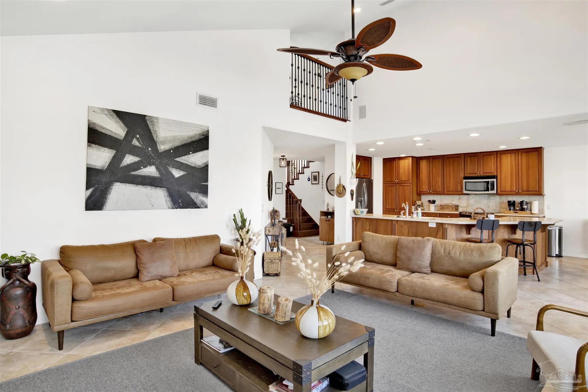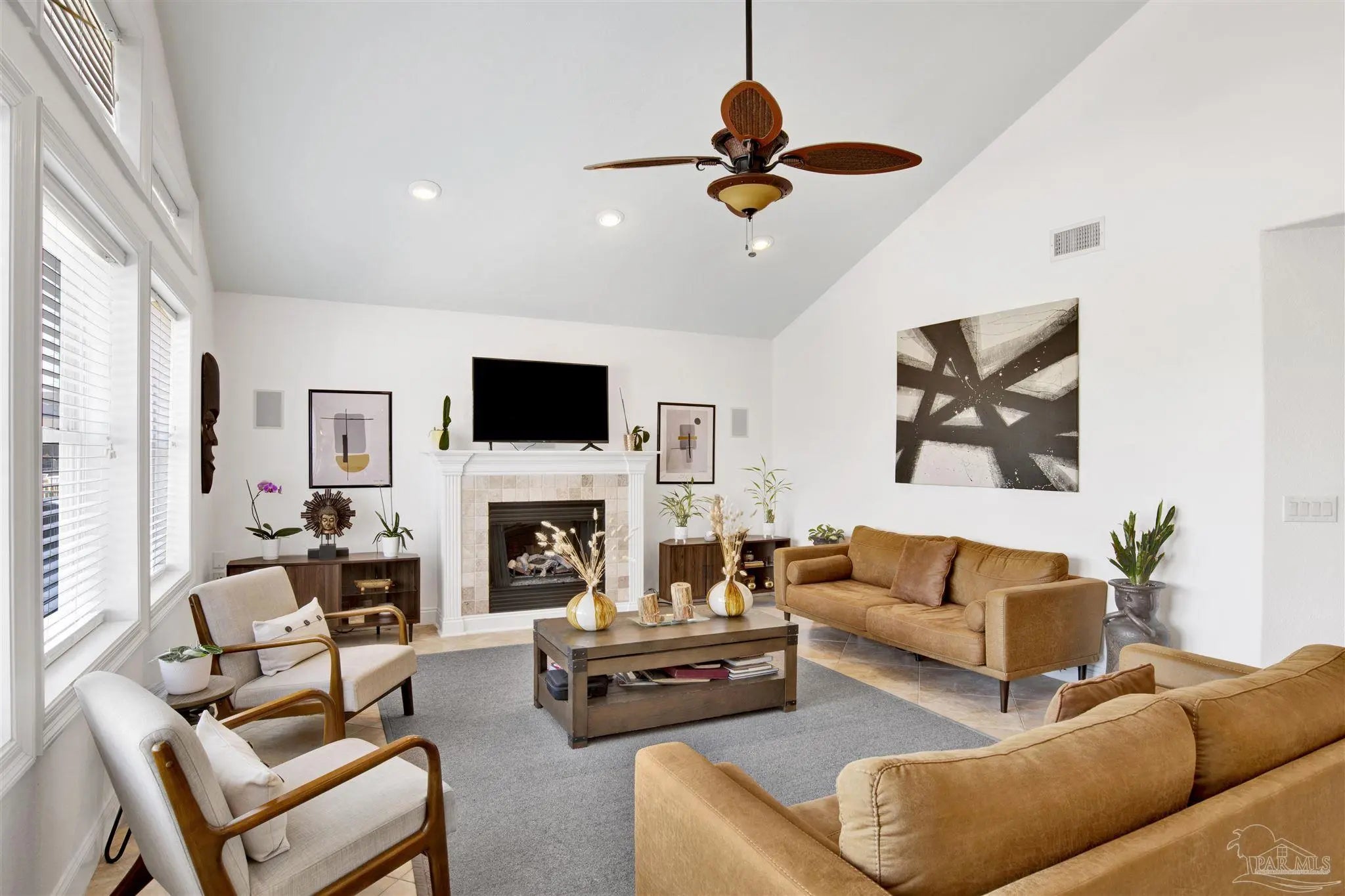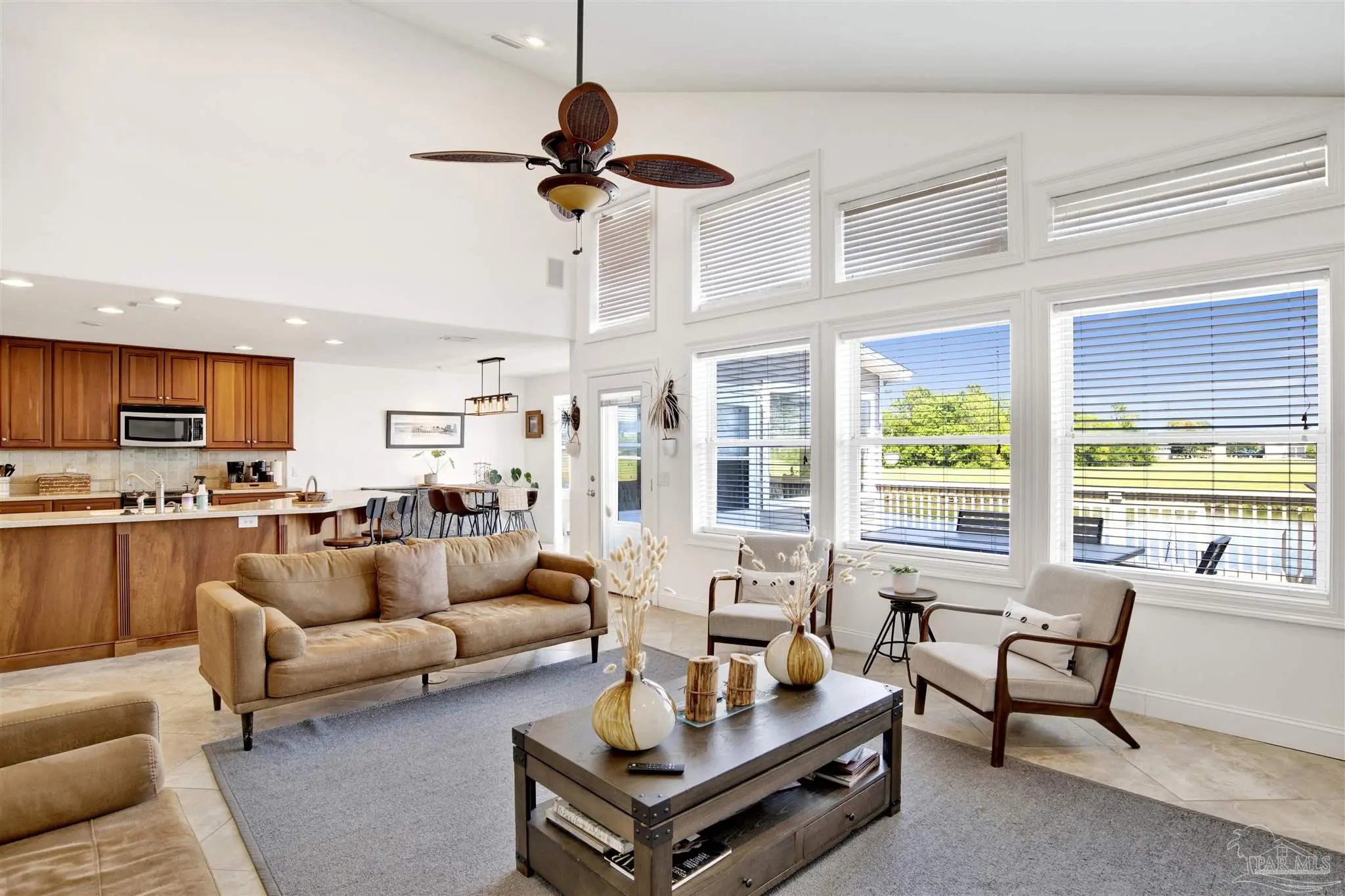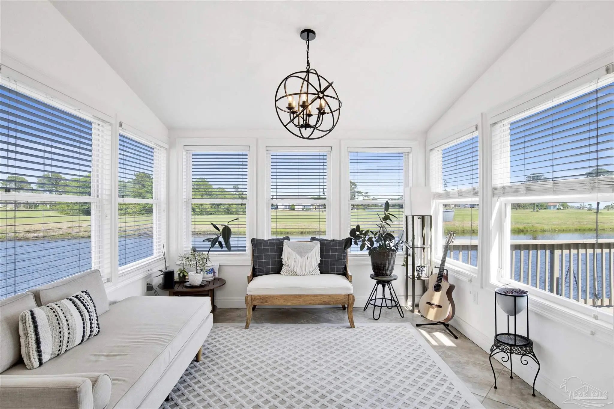 Welcome to your new home in the coveted Lionsgate section of Tiger Point! Situated on a serene lake with panoramic views of Santa Rosa Sound and the Tiger Point Golf Course, this waterfront residence offers luxury living and effortless style. Step inside to a breathtaking great room featuring vaulted ceilings, a cozy gas fireplace, and a wall of windows that flood the space with natural light and showcase the spectacular water and golf course views. The open layout flows seamlessly into the dining area and an impressive kitchen complete with a large peninsula, floor-to-ceiling cabinetry with specialty drawers, stainless steel appliances and ample counter space for entertaining. Just off the main living area, the Florida room is wrapped in windows, offering a tranquil space to relax and enjoy the beauty of the surrounding landscape year-round. The thoughtfully designed split-bedroom floor plan provides privacy and comfort. The primary suite, located on the lower level, is a peaceful retreat with elegant crown molding, his & her walk-in closets, and a spa-like ensuite bath featuring split double vanities, a jetted garden tub, and a separate tiled walk-in shower. A convenient half bath and a spacious laundry room with wet sink complete the lower level and offer easy access to the double car garage. Upstairs, luxury vinyl plank flooring runs throughout the loft and two generously sized bedrooms, each with ceiling fans, large closets, and stunning lake views. A full bath with tile flooring and a tub/shower combo completes the upper level. Step outside onto the expansive open deck, perfect for entertaining, dining al fresco, or just taking in the breathtaking views of the lake, golf course, and Santa Rosa Sound. The peaceful lake is ideal for kayaking, paddleboarding or fishing off your deck Additional features include: * Paid in full Solar panels for energy efficiency * Lawn maintenance provided by HOA Don’t miss the opportunity to own this beautiful waterfront oasis!