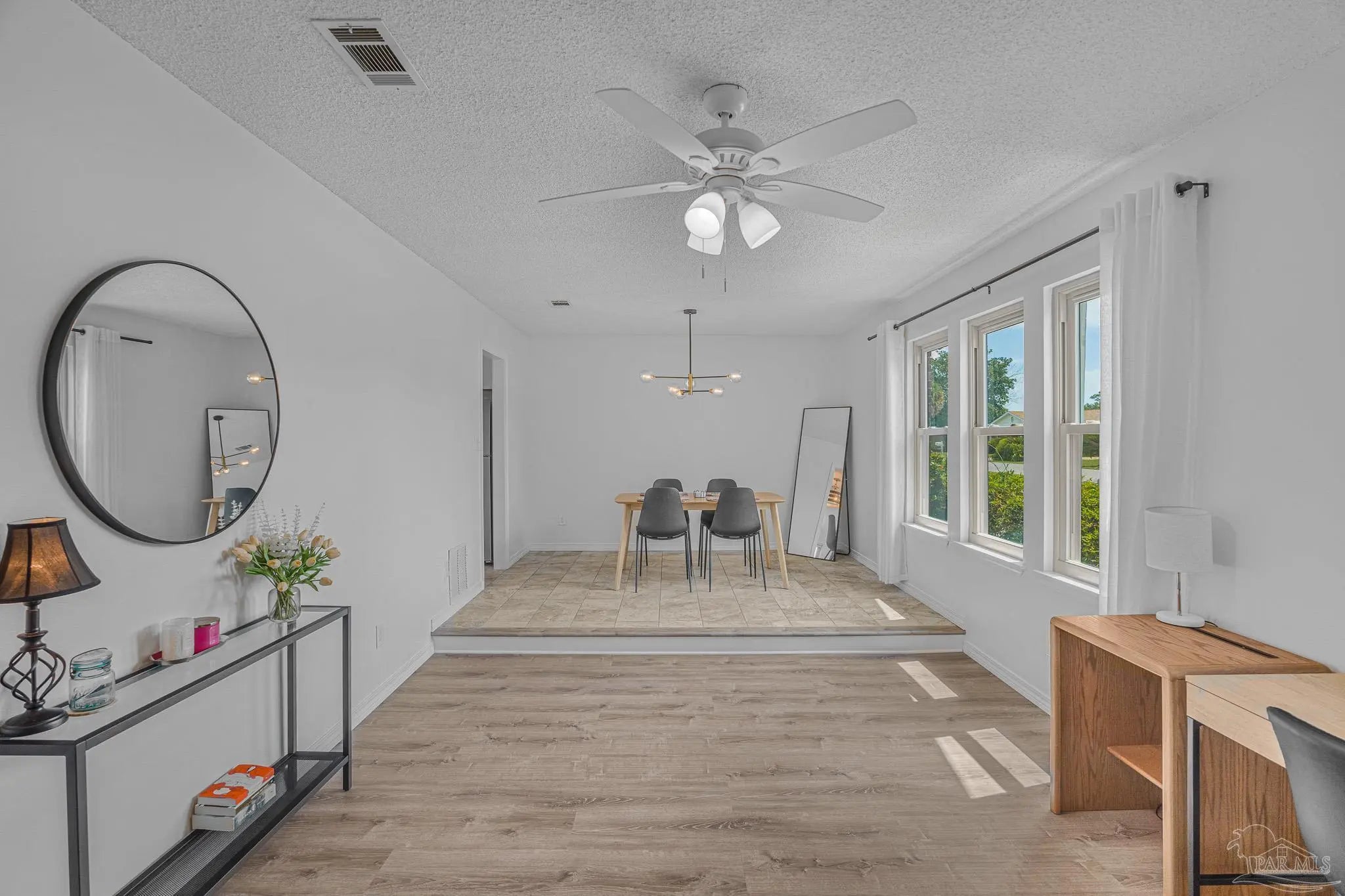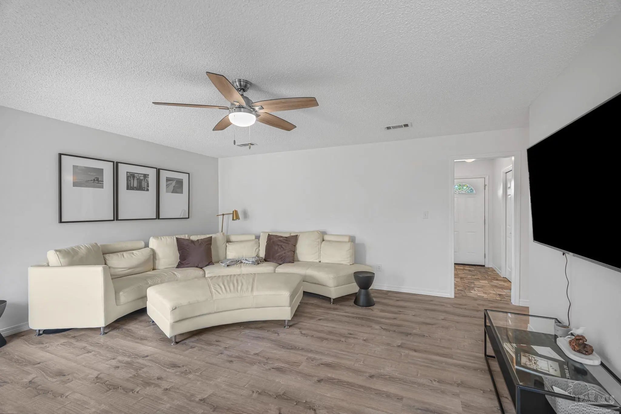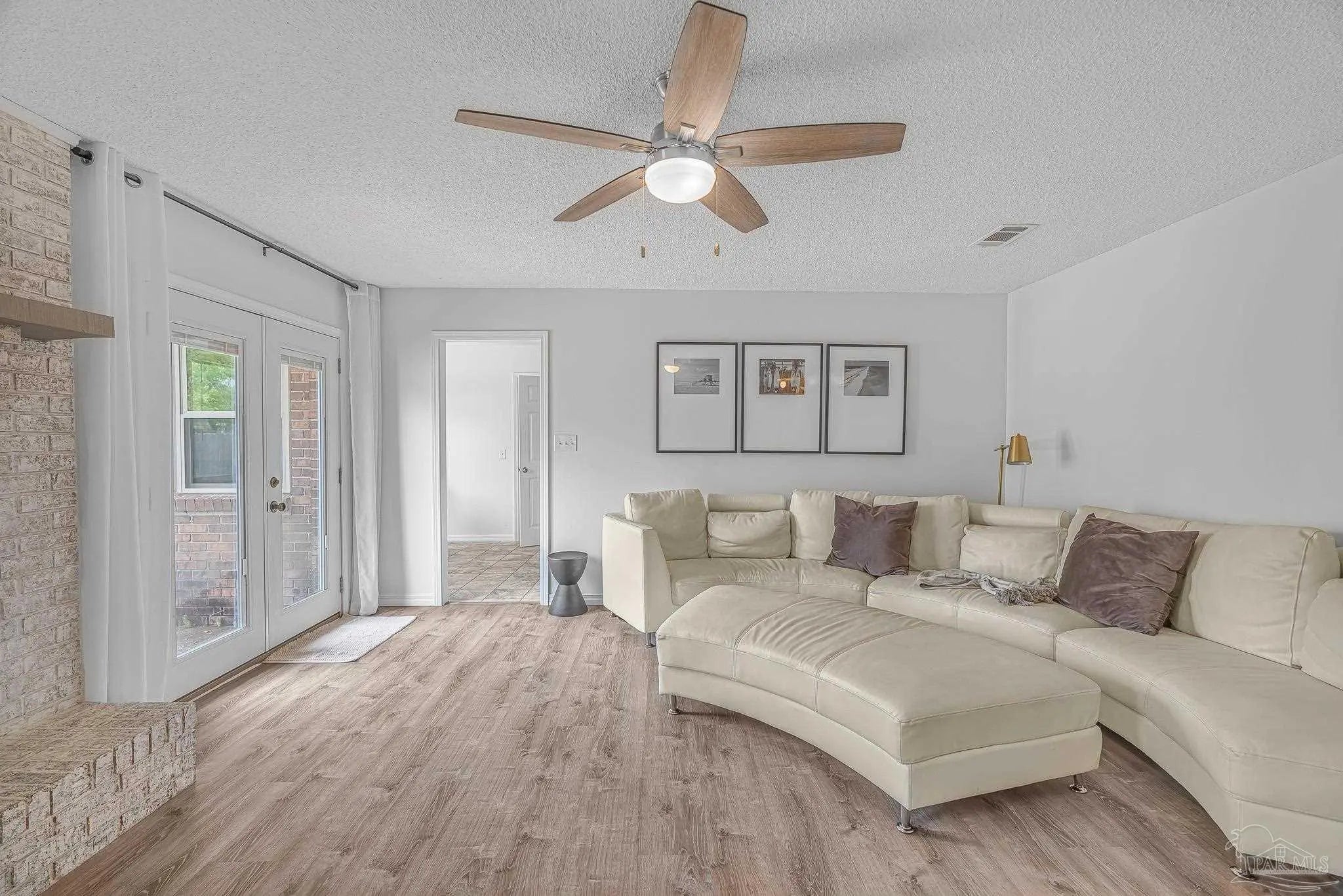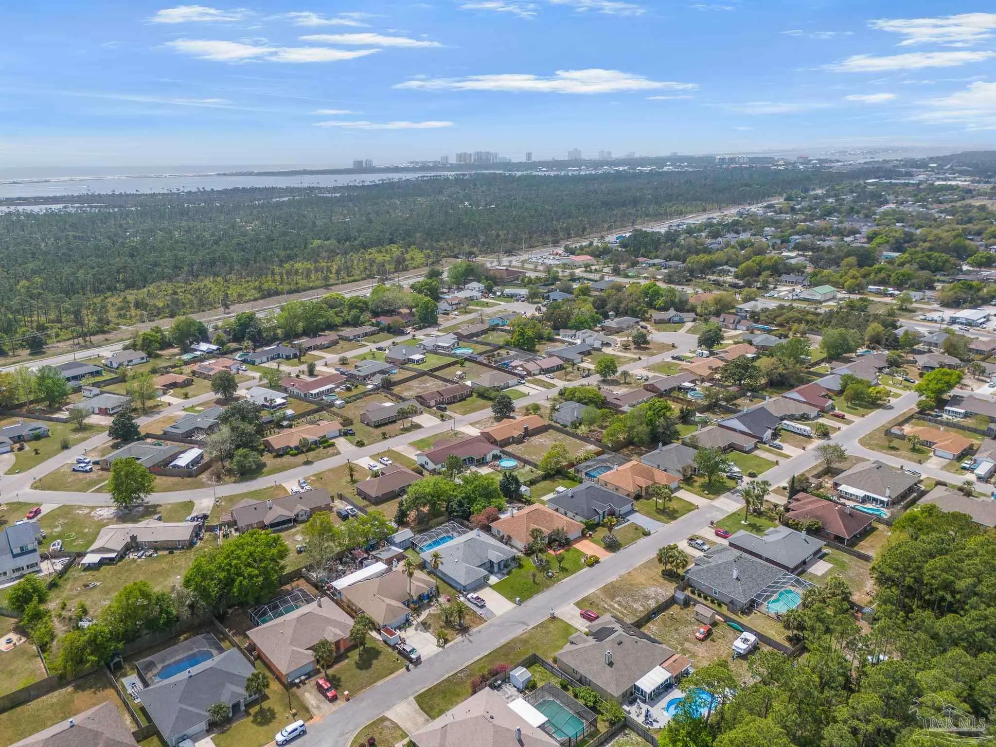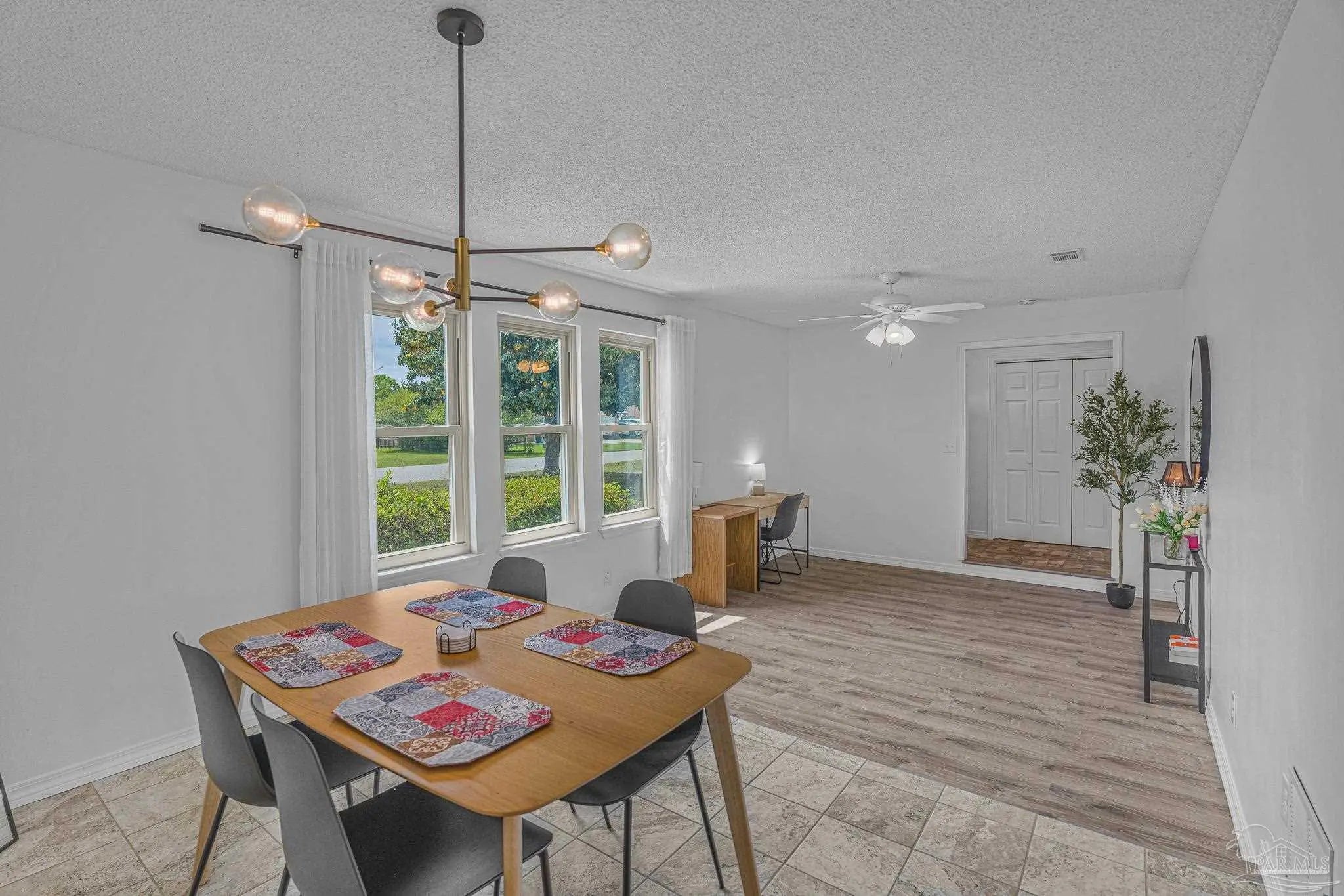 Step into a home that effortlessly blends everyday comfort with flexible living spaces designed to fit your lifestyle. This 3 bedroom, 2 bathroom residence offers a functional layout and comfortable living spaces throughout. An entryway with extended flex space and a formal dining room creates a versatile first impression, perfect for entertaining or additional living needs. Modern light fixtures add a fresh touch, while the kitchen features a breakfast nook for casual dining and flows seamlessly into a spacious living room anchored by a charming white brick fireplace. The primary suite includes a private en-suite bath, and a dedicated laundry room provides extra storage. Step outside to enjoy the outdoor patio overlooking a large fenced backyard—ideal for relaxing or hosting gatherings. Conveniently located in Southwest Pensacola near NAS Pensacola and just minutes from the beautiful beaches of Perdido Key, this home also offers access to nearby parks, water activities, and the amenities of the desirable Grande Lagoon area, blending everyday convenience with coastal living.