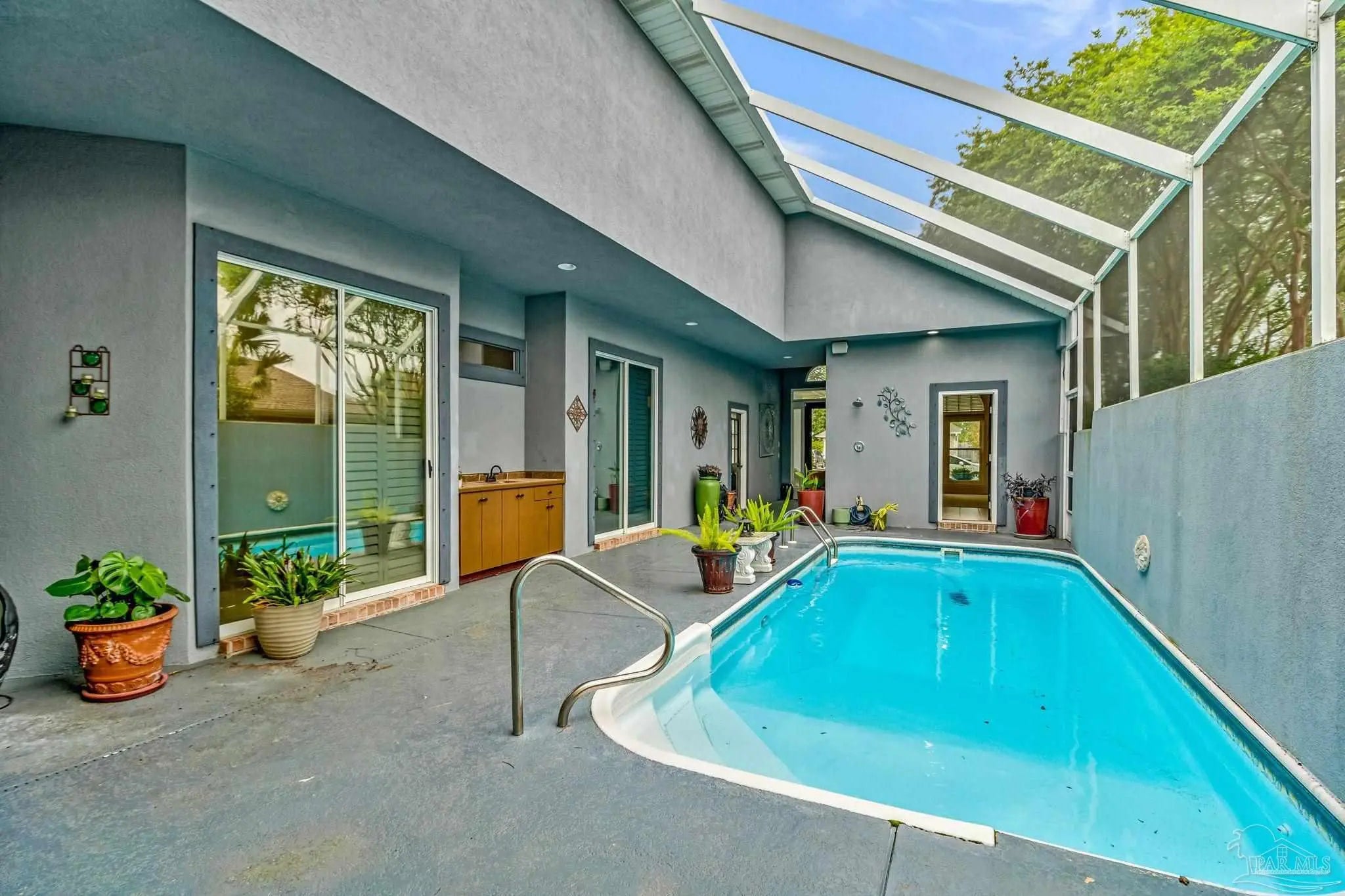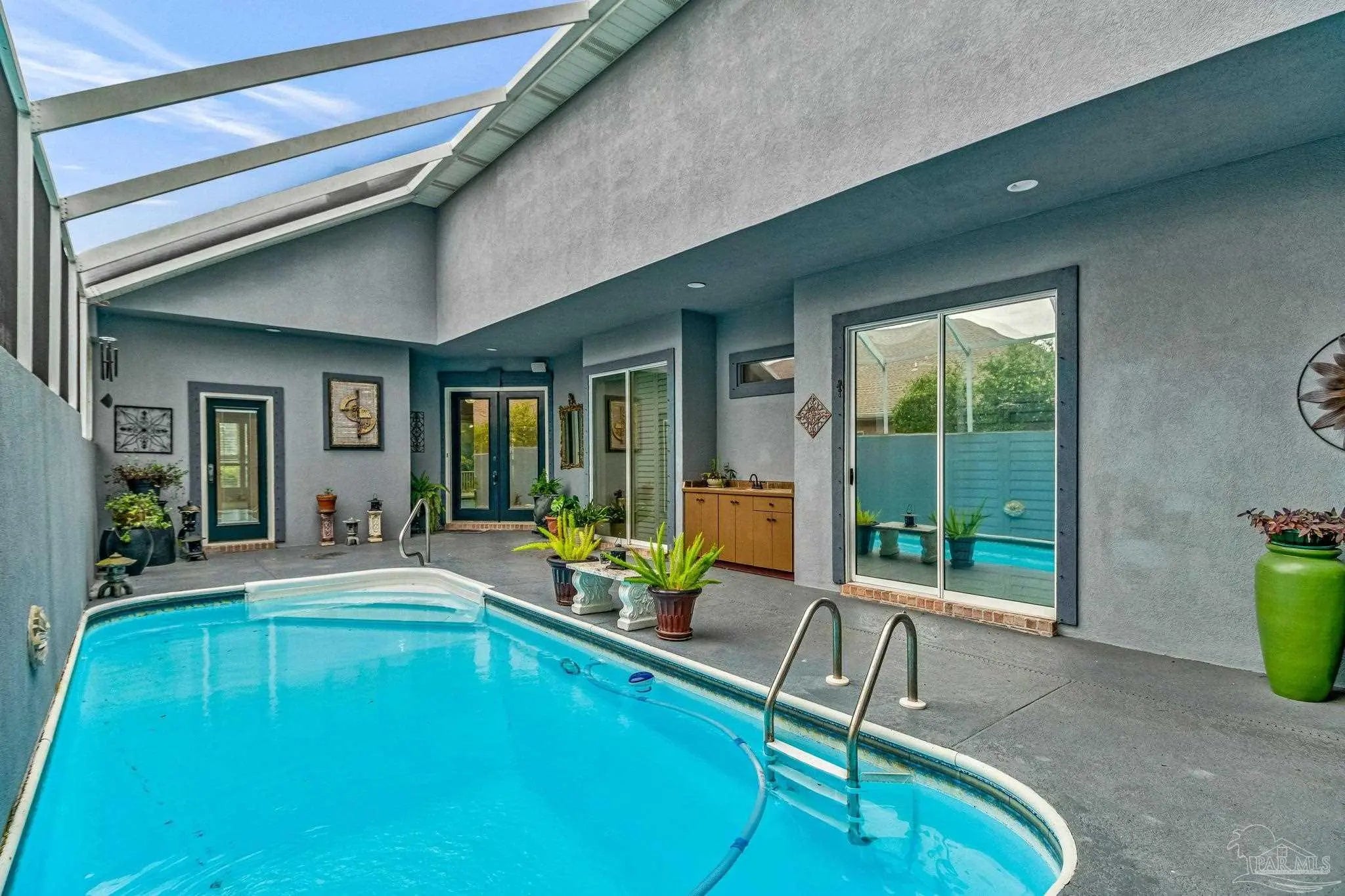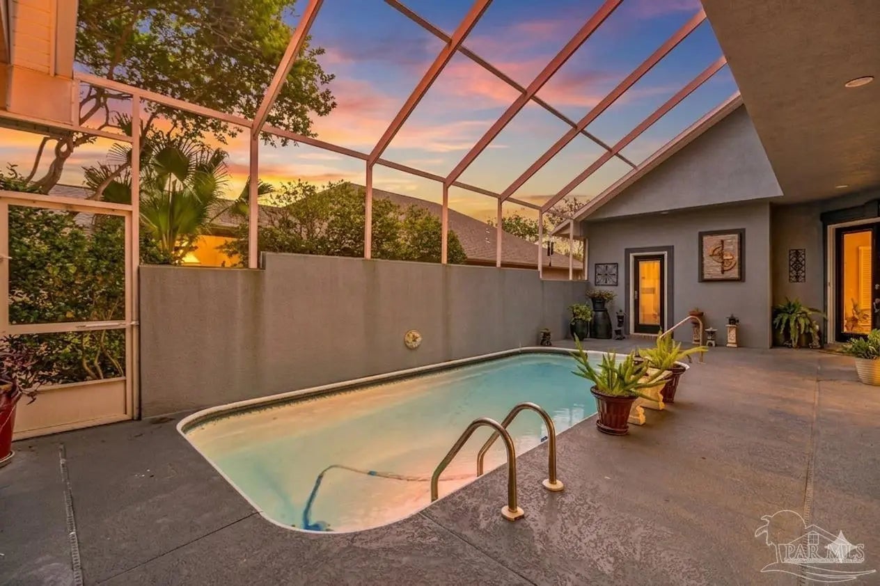 The search for the perfect patio home with a COURTYARD IN-GROUND POOL is officially OVER! Located on the 11th fairway in the highly desirable Oak Pointe in Gulf Breeze, this home is ready to impress from the moment you walk in. And trust me… this floorplan does not disappoint. You’re immediately welcomed by your private courtyard pool, basically your own little resort right at home (no travel required). This space is perfect for entertaining, relaxing, or just pretending you’re on vacation every day. One of the coolest features? The separate guest house has its own full bath and high ceilings. Whether it’s for guests, an in-law suite, a home gym, office, or your next hobby you swear you’ll stick to… the options are endless. Step inside the main home where the kitchen sits at the heart of it all, featuring two breakfast bars, stainless steel appliances, white cabinetry, tile backsplash, and a functional layout perfect for entertaining. The living room offers a fireplace, making those rare Florida “cold” days feel extra special. The screened-in porch and open deck give you even more space to grill, hang out, and enjoy the outdoors. The primary suite is a split floor plan, two closets, a soaking tub, a walk-in shower, double vanities, and even direct access to the pool, because why not step straight into vacation mode? On the opposite side, another bedroom also has its own access to the courtyard pool and a private bath, making this home feel connected and functional throughout. Additional upgrades include plantation shutters, a newer water heater, a 2020 roof, a front-entry garage, and a spacious laundry room. This home is unique, fun, and full of possibilities, and it’s ready for its next owner to make it their own. Take one look… and you’ll get it!
