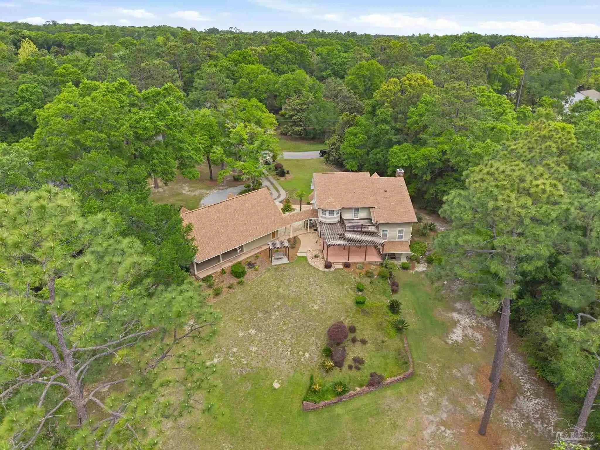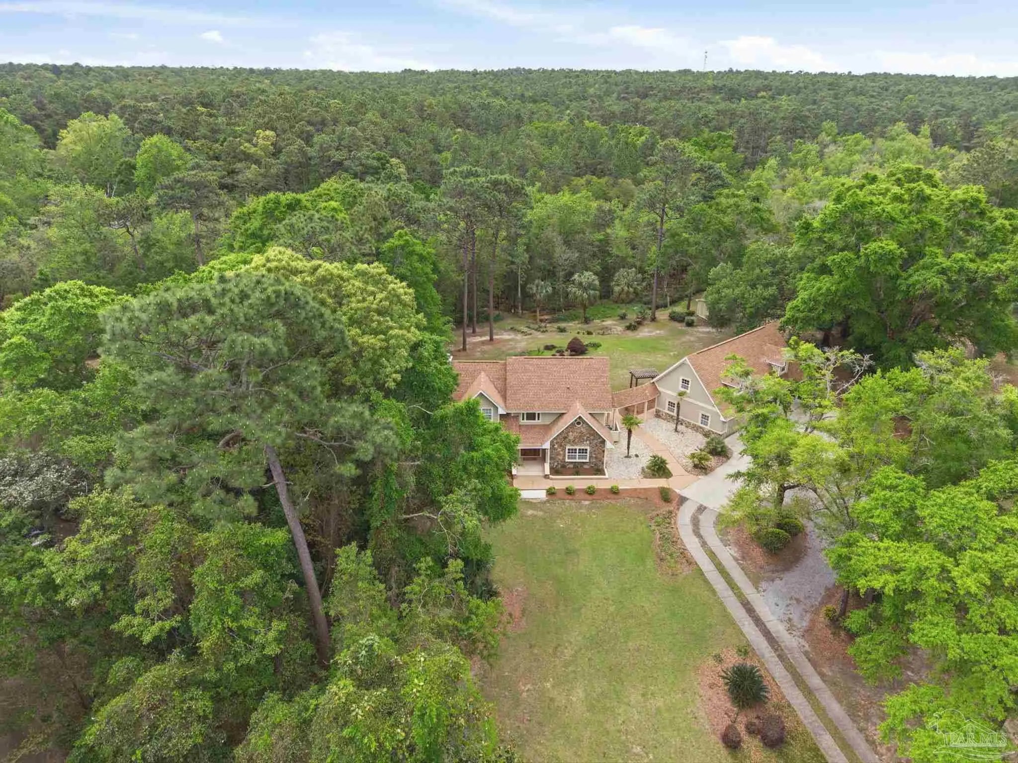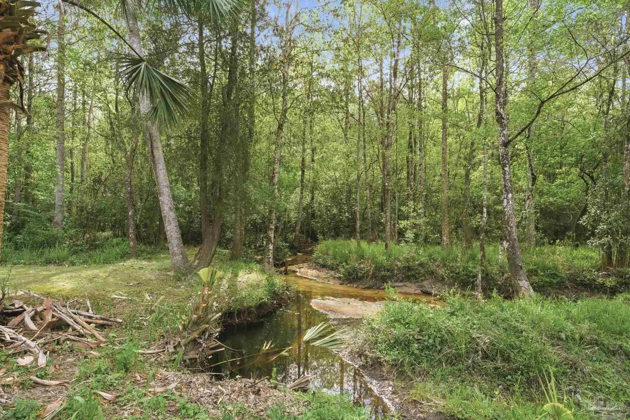 Unbelievable beauty paired with functional space! This two story home offers both. Drive through the stone gate, up the winding driveway to this custom built, one-owner home with large detached garage. Perfectly placed on 1.77 acres of rolling hills with room for an RV with electric hookup and nestled within the quiet neighborhood of Clear Creek Farms, this gorgeous 5-bedroom residence offers a rare blend of natural tranquility and peaceful sophistication. Spanning over 3,700 square feet of meticulously cared for space, the home features a backyard flowing creek and mature landscaping that create an immediate sense of sanctuary. Hike through your own backyard to the nearby UWF walking trails! Come inside and see the many useful spaces with renovations and updates. 2023 roof, 2024 hot water heaters, brand-new flooring across the main and upper levels, updated designer ceiling fans, and a kitchen featuring beautiful new quartz countertops paired with a stylish tile backsplash. The architectural layout prioritizes versatility, highlighted by a finished basement equipped with a second kitchen, private bedroom, and expansive bonus area ideal for multigenerational living, a guest area, or mother-in law suite. On the main level, a formal dining room and cozy living area are complemented by flexspace for a first floor bedroom or home office featuring custom built-in shelving and an attached full bath. The primary suite serves as a retreat, boasting three closets, dual vanities, and a large balcony overlooking your private grounds. Valuable exterior amenities include a detached two-car garage with attic storage or workshop, a two-car carport, and a powered outbuilding for extra storage. Hurricane protection devices, sprinkler, and lawn water pump are just a few more bonuses. Peaceful living that is still close to restaurants and shopping. Yes, you can have the best of both worlds. A warm home with acreage and a convenient location. Call for a tour today!