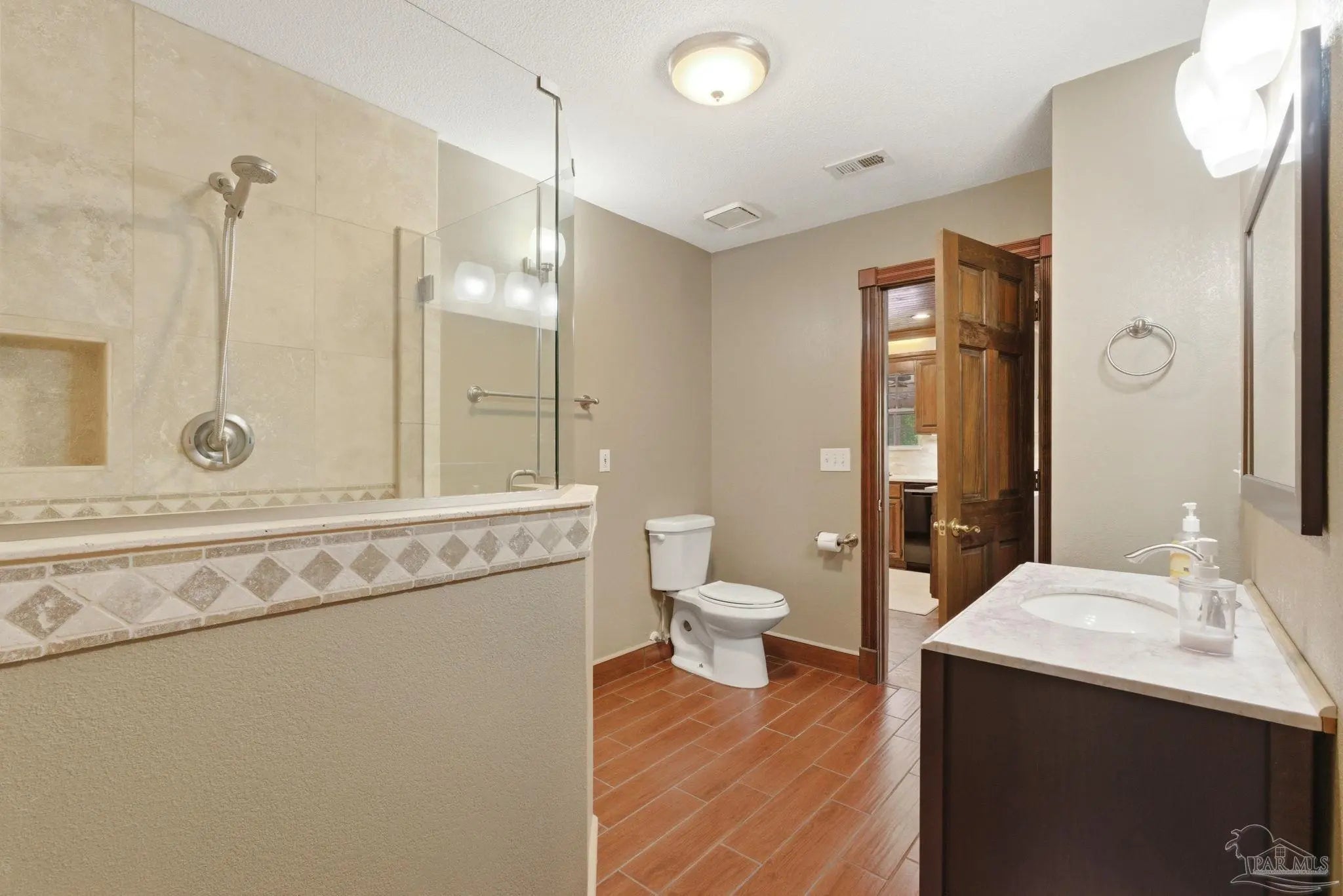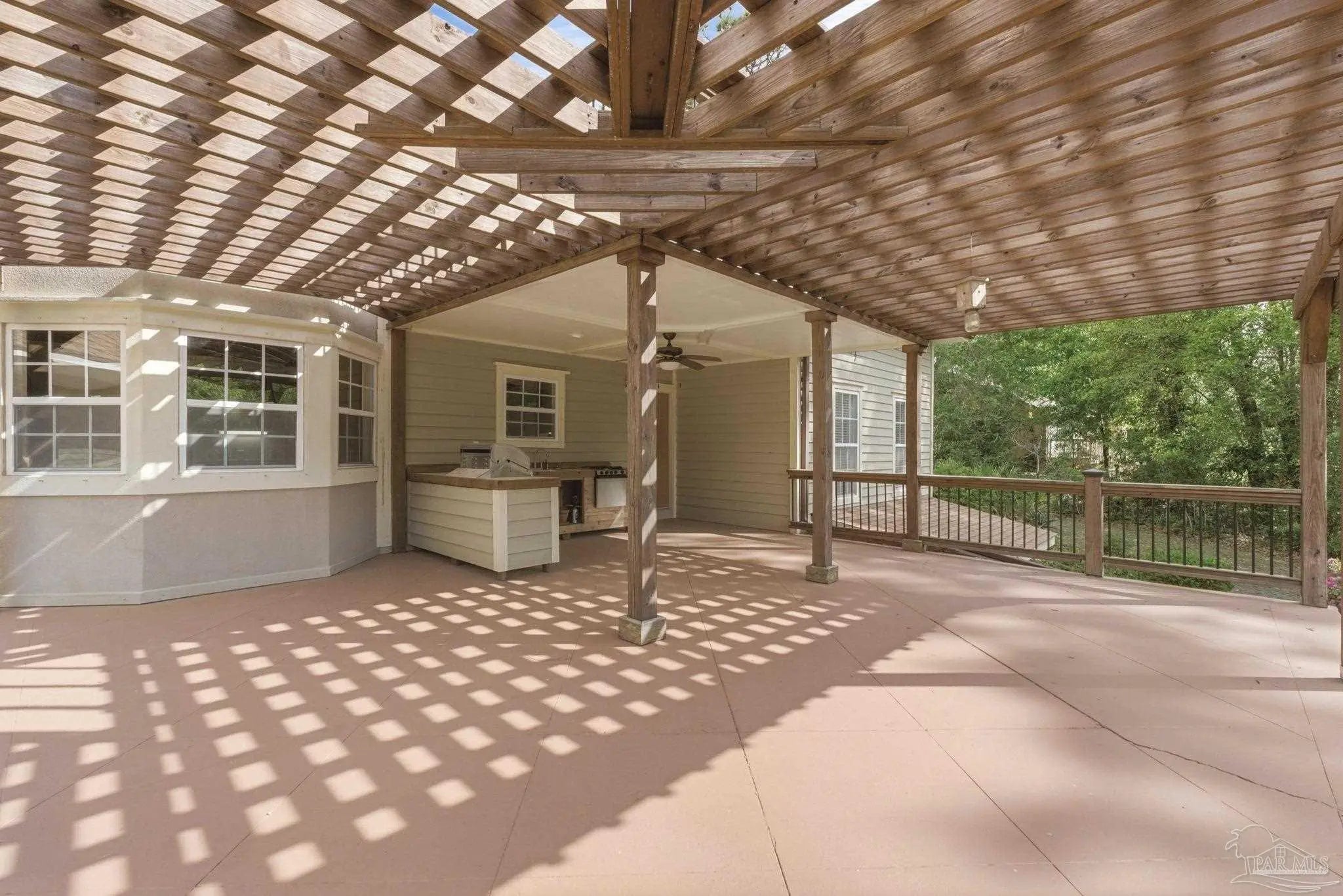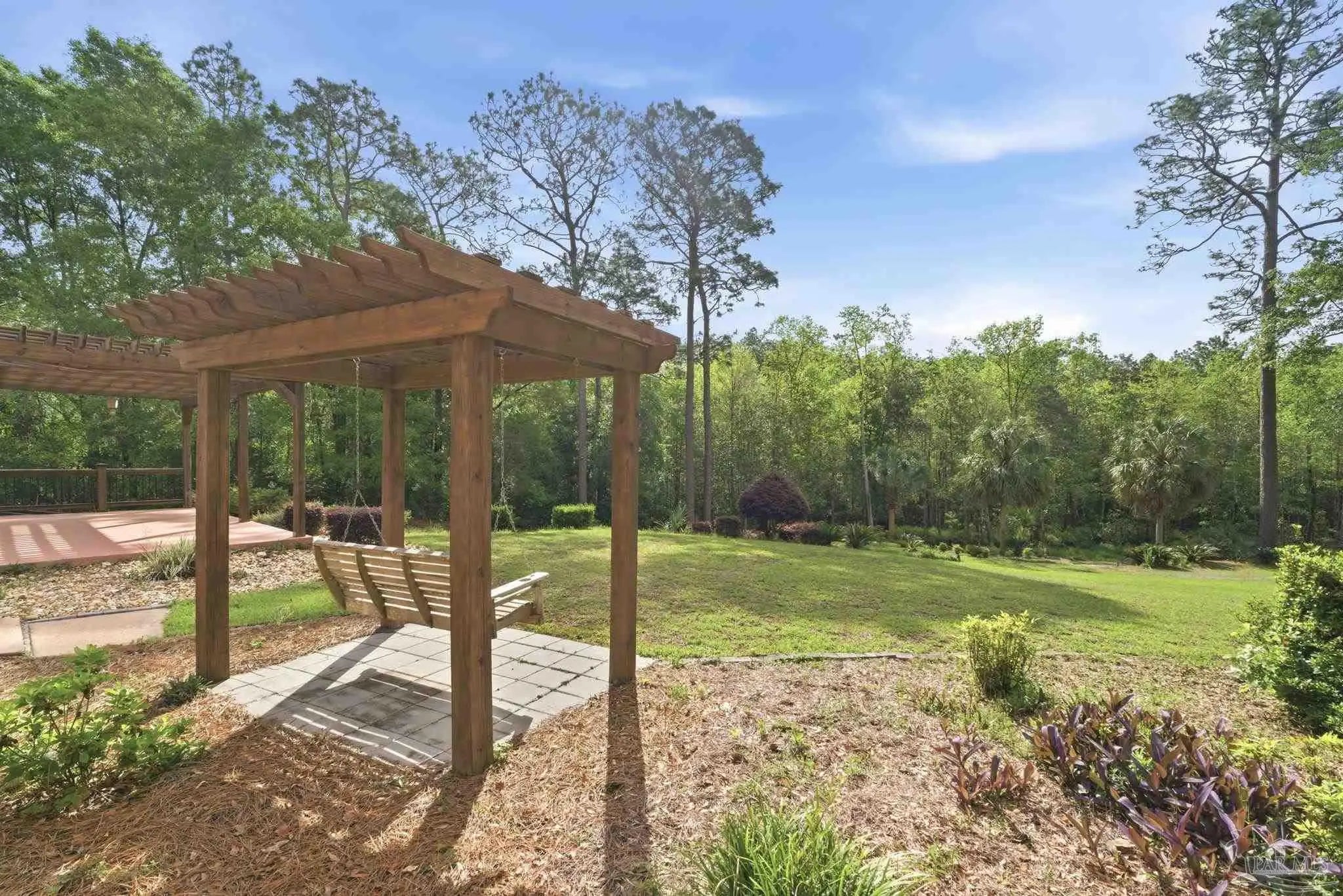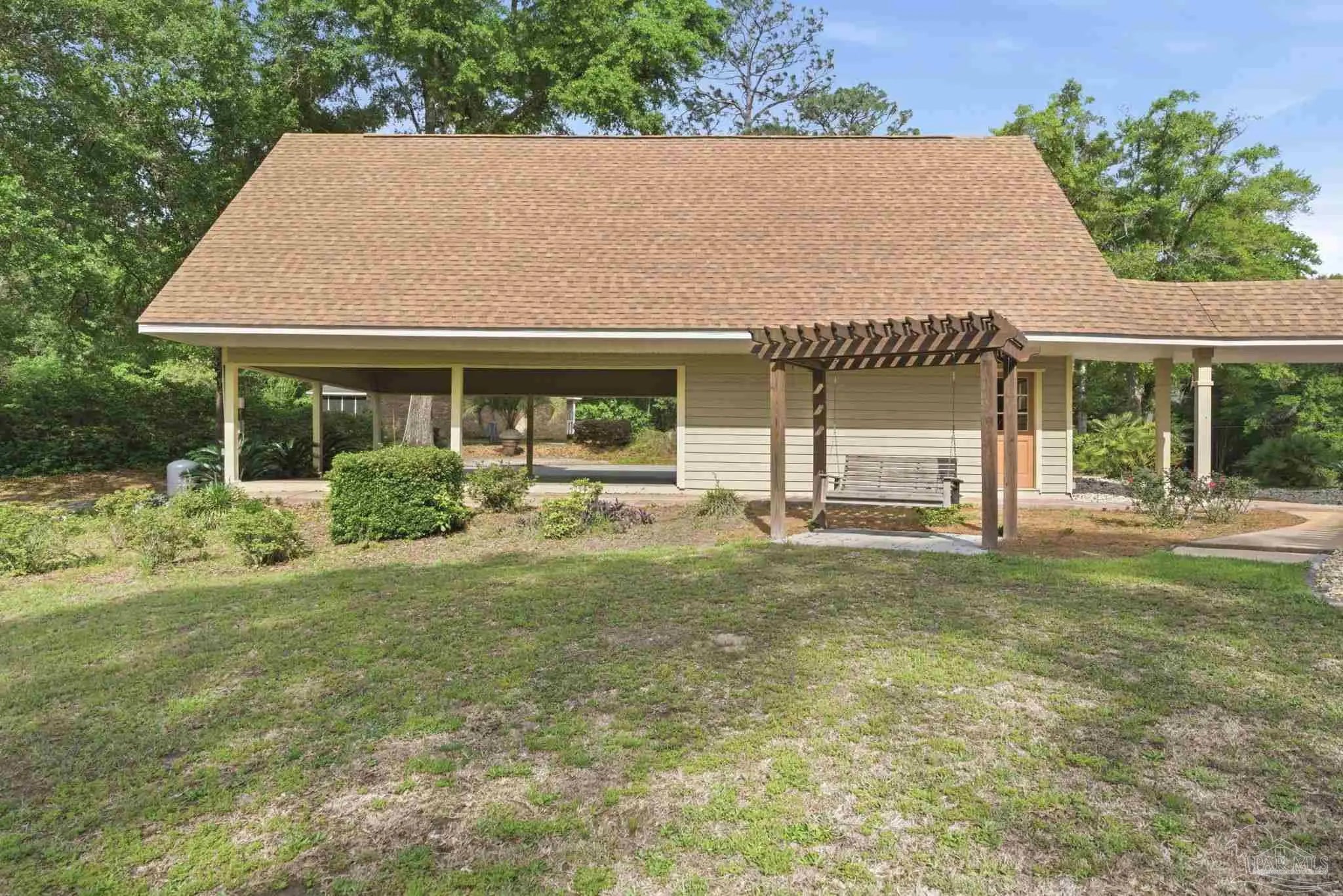 Unbelievable beauty paired with functional space! This two story home offers both. Drive through the stone gate, up the winding driveway to this custom built, one-owner home with large detached garage. Perfectly placed on 1.77 acres of rolling hills with room for an RV with electric hookup and nestled within the quiet neighborhood of Clear Creek Farms, this gorgeous 5-bedroom residence offers a rare blend of natural tranquility and peaceful sophistication. Spanning over 3,700 square feet of meticulously cared for space, the home features a backyard flowing creek and mature landscaping that create an immediate sense of sanctuary. Hike through your own backyard to the nearby UWF walking trails! Come inside and see the many useful spaces with renovations and updates. 2023 roof, 2024 hot water heaters, brand-new flooring across the main and upper levels, updated designer ceiling fans, and a kitchen featuring beautiful new quartz countertops paired with a stylish tile backsplash. The architectural layout prioritizes versatility, highlighted by a finished basement equipped with a second kitchen, private bedroom, and expansive bonus area ideal for multigenerational living, a guest area, or mother-in law suite. On the main level, a formal dining room and cozy living area are complemented by flexspace for a first floor bedroom or home office featuring custom built-in shelving and an attached full bath. The primary suite serves as a retreat, boasting three closets, dual vanities, and a large balcony overlooking your private grounds. Valuable exterior amenities include a detached two-car garage with attic storage or workshop, a two-car carport, and a powered outbuilding for extra storage. Hurricane protection devices, sprinkler, and lawn water pump are just a few more bonuses. Peaceful living that is still close to restaurants and shopping. Yes, you can have the best of both worlds. A warm home with acreage and a convenient location. Call for a tour today!