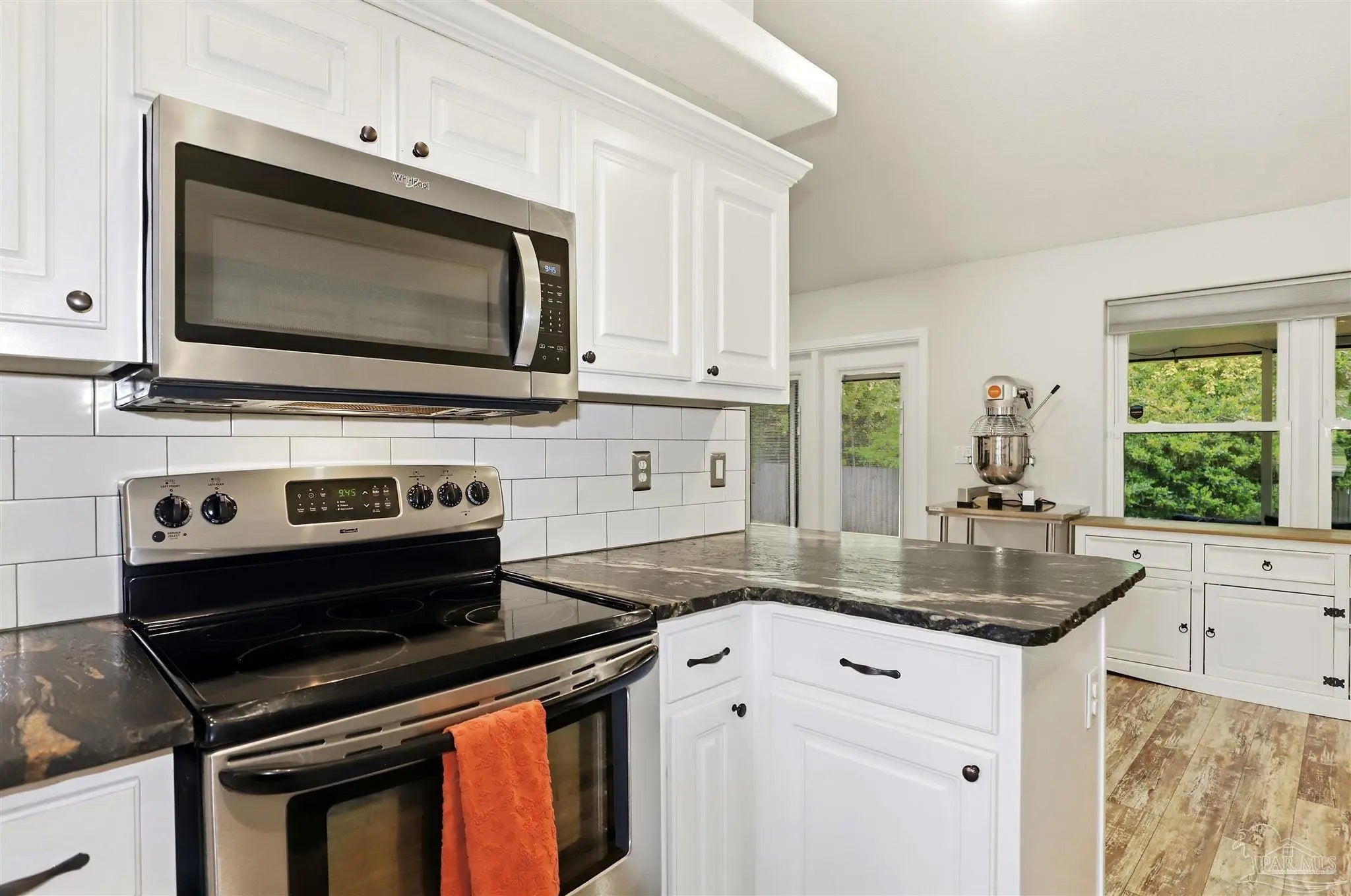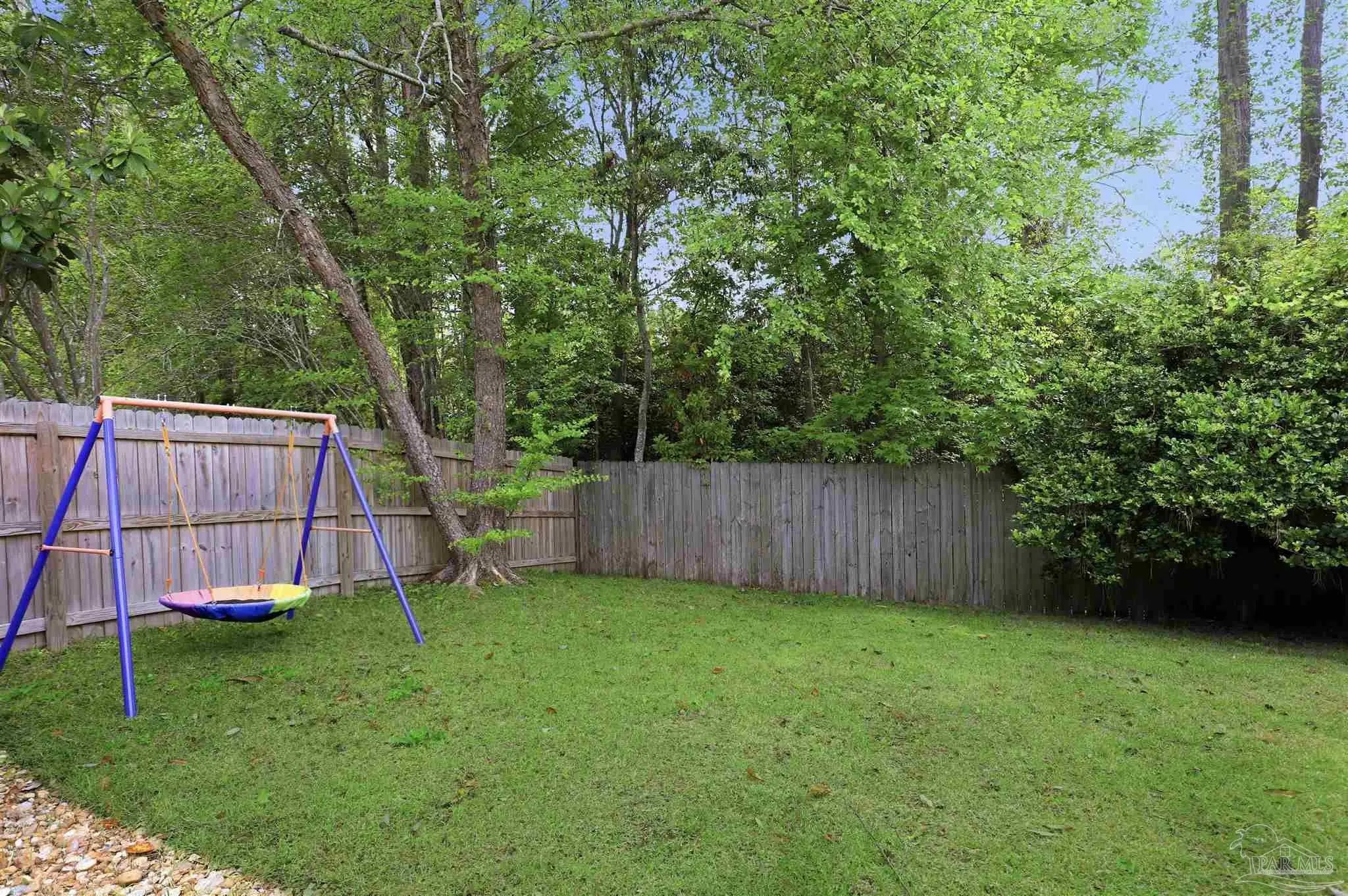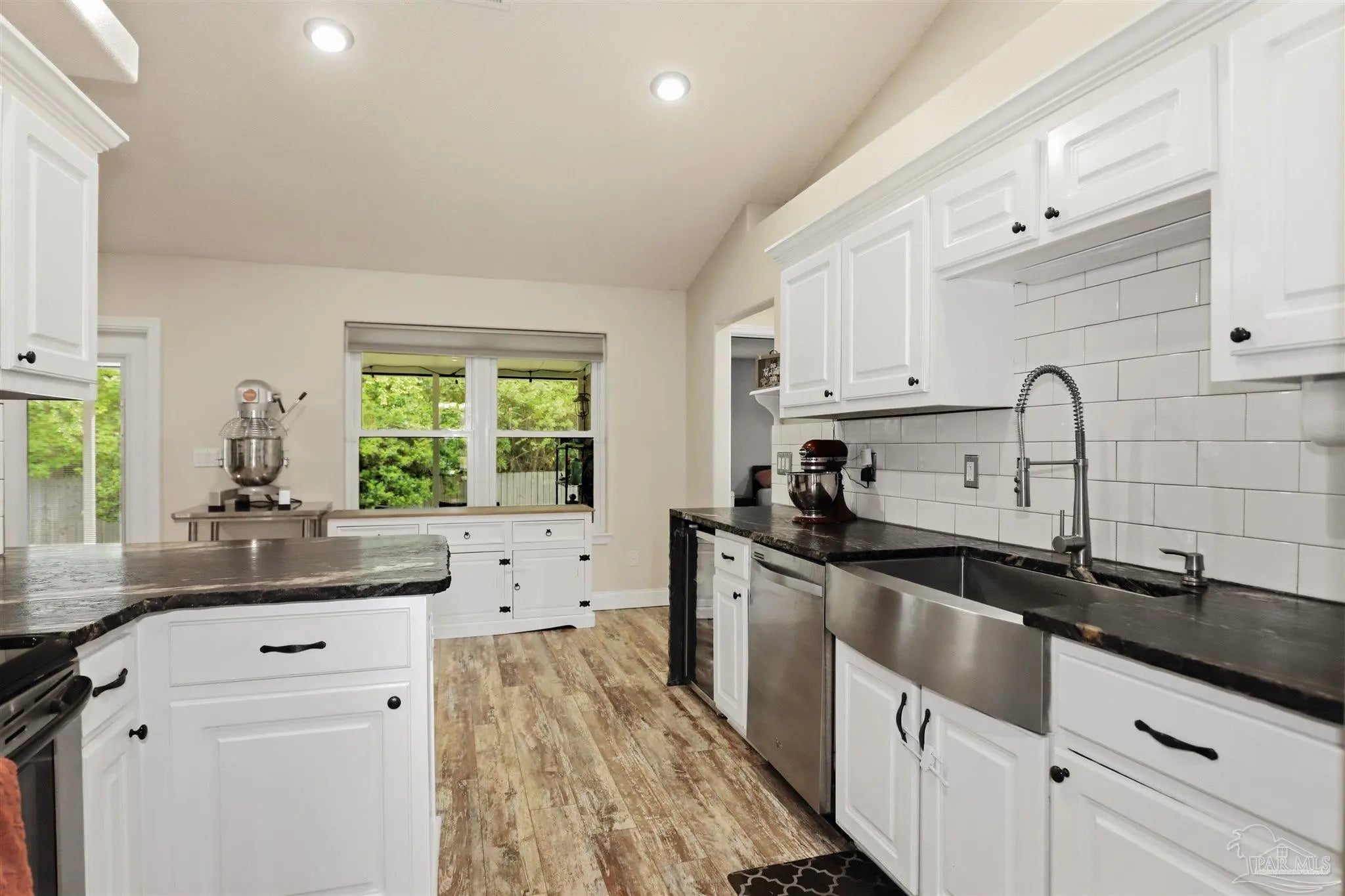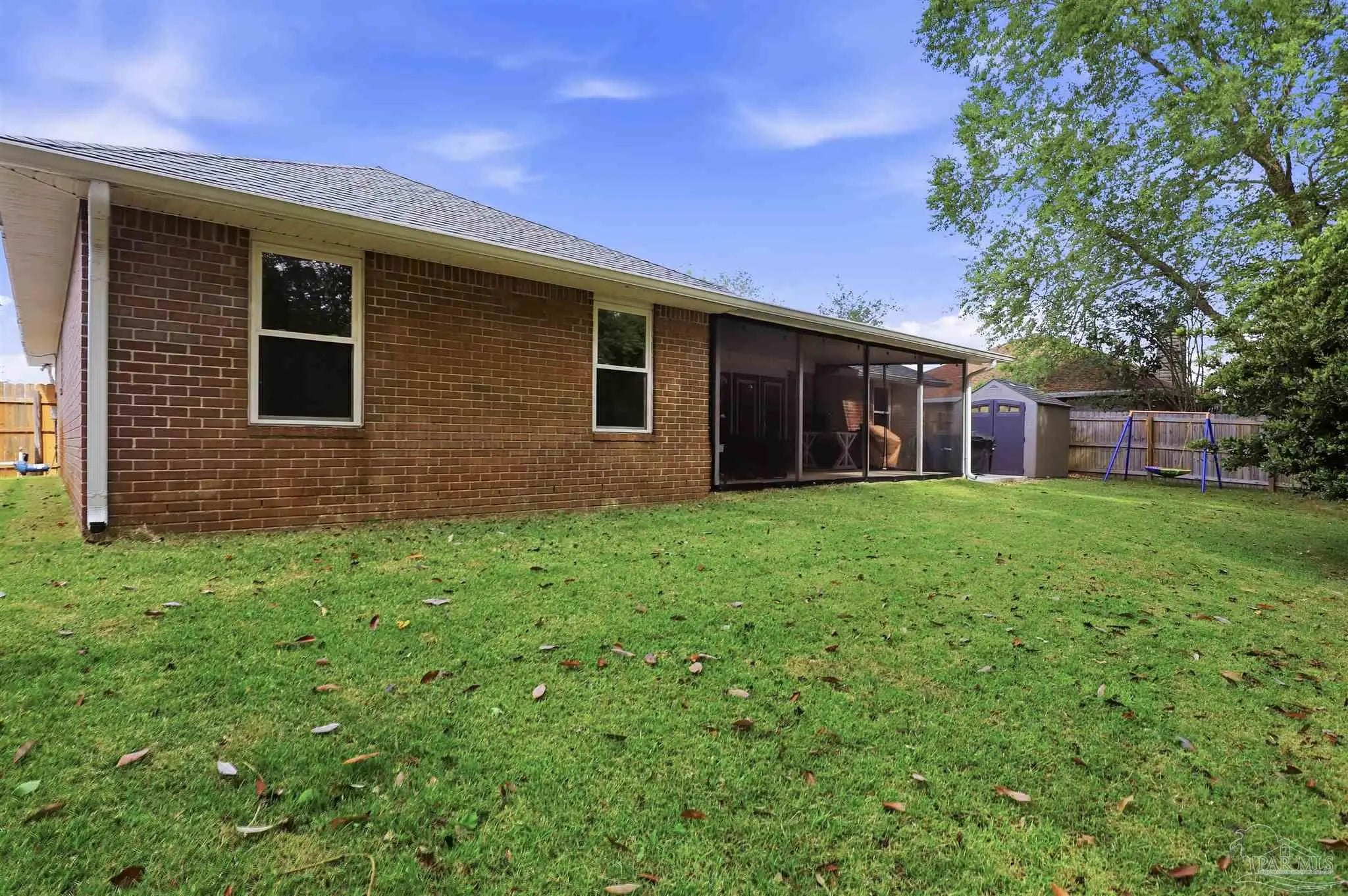 Move-in ready 4BR/2BA (1,903 sf) in Navarre. Features soaring ceilings, LVP flooring & farmhouse sink. Fenced yard, screened patio & neighborhood bay access. Inviting 4BR/2BA brick home in Navarre, Florida near the Santa Rosa Sound, offering convenient access to Navarre Beach, Hurlburt Field, and Pensacola, featuring soaring ceilings, luxury vinyl plank flooring throughout, and a beautifully updated kitchen with stainless steel appliances and granite countertops, plus a split floor plan, screened patio, fenced backyard, and neighborhood East Bay access just minutes away. Upon entry, a formal dining area sits to the right and flows seamlessly into the beautifully updated kitchen, complete with stainless steel appliances, farmhouse sink, textured leathered granite countertops with a rock-faced edge, built-in microwave, electric range, and space for a beverage cooler. The split floor plan offers privacy, with the spacious primary suite tucked away on one side, featuring a ceiling fan and an impressive en-suite bath with a walk-in shower, oversized closet, water closet, and linen storage. The open living area is ideal for entertaining and extends to a screened, covered back patio, plus an additional open patio—perfect for a fire pit. Three additional bedrooms are located on the opposite side of the home and share a full bath with updated vanities. Additional upgrades include recessed lighting, newer refrigerator, new windows for improved energy efficiency, and updated electrical with a generator switch installed. Enjoy a fully fenced backyard with privacy fencing and take advantage of neighborhood bay access just a few blocks away for evening walks and water views. HVAC replaced in 2022 and roof updated in 2019.