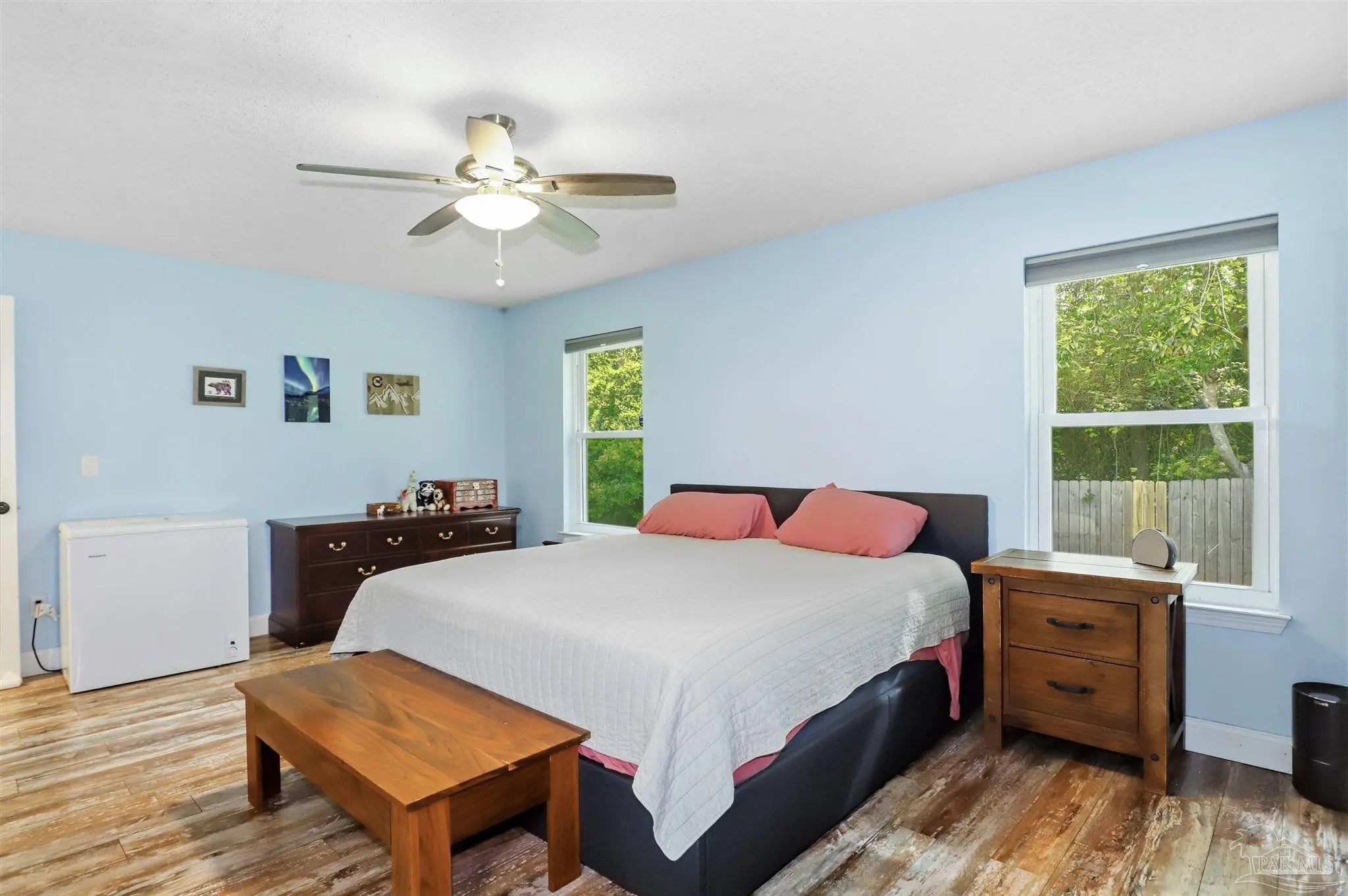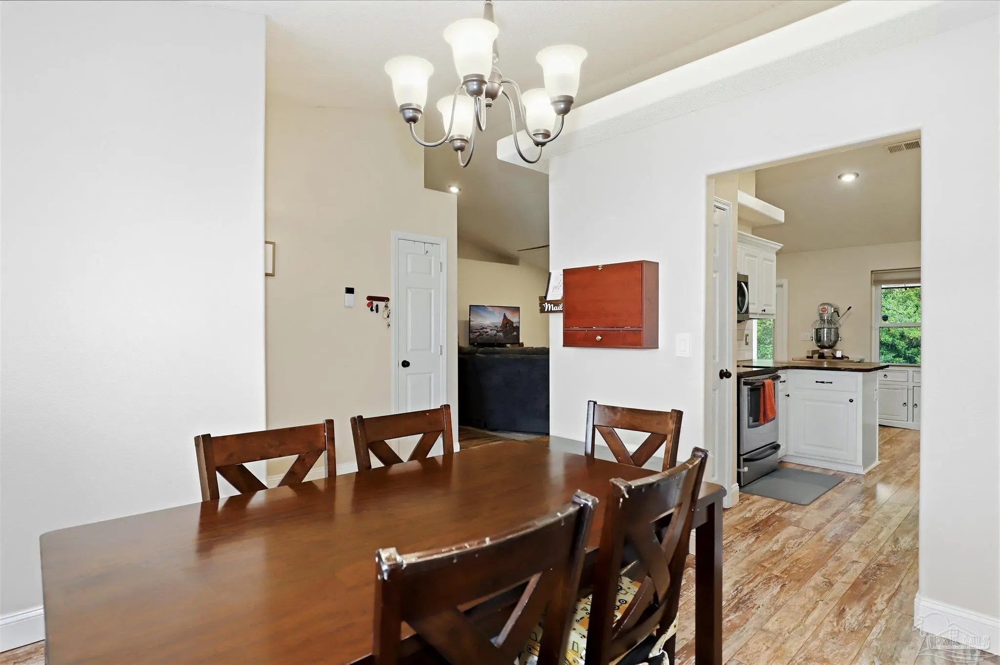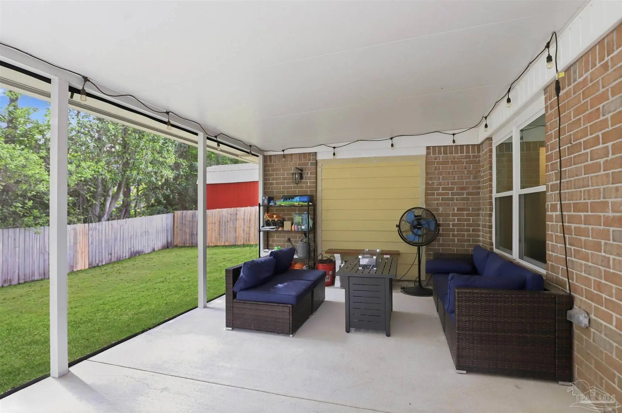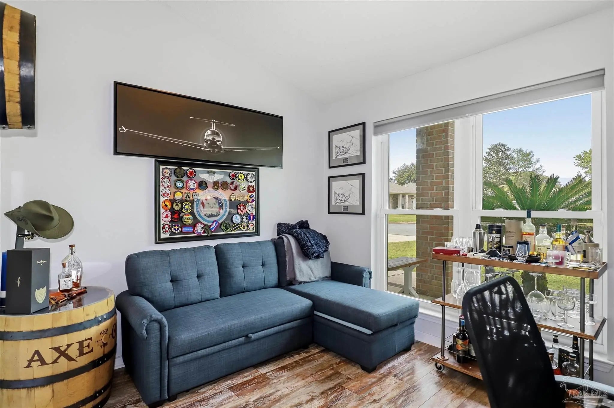 Move-in ready 4BR/2BA (1,903 sf) in Navarre. Features soaring ceilings, LVP flooring & farmhouse sink. Fenced yard, screened patio & neighborhood bay access. Inviting 4BR/2BA brick home in Navarre, Florida near the Santa Rosa Sound, offering convenient access to Navarre Beach, Hurlburt Field, and Pensacola, featuring soaring ceilings, luxury vinyl plank flooring throughout, and a beautifully updated kitchen with stainless steel appliances and granite countertops, plus a split floor plan, screened patio, fenced backyard, and neighborhood East Bay access just minutes away. Upon entry, a formal dining area sits to the right and flows seamlessly into the beautifully updated kitchen, complete with stainless steel appliances, farmhouse sink, textured leathered granite countertops with a rock-faced edge, built-in microwave, electric range, and space for a beverage cooler. The split floor plan offers privacy, with the spacious primary suite tucked away on one side, featuring a ceiling fan and an impressive en-suite bath with a walk-in shower, oversized closet, water closet, and linen storage. The open living area is ideal for entertaining and extends to a screened, covered back patio, plus an additional open patio—perfect for a fire pit. Three additional bedrooms are located on the opposite side of the home and share a full bath with updated vanities. Additional upgrades include recessed lighting, newer refrigerator, new windows for improved energy efficiency, and updated electrical with a generator switch installed. Enjoy a fully fenced backyard with privacy fencing and take advantage of neighborhood bay access just a few blocks away for evening walks and water views. HVAC replaced in 2022 and roof updated in 2019.