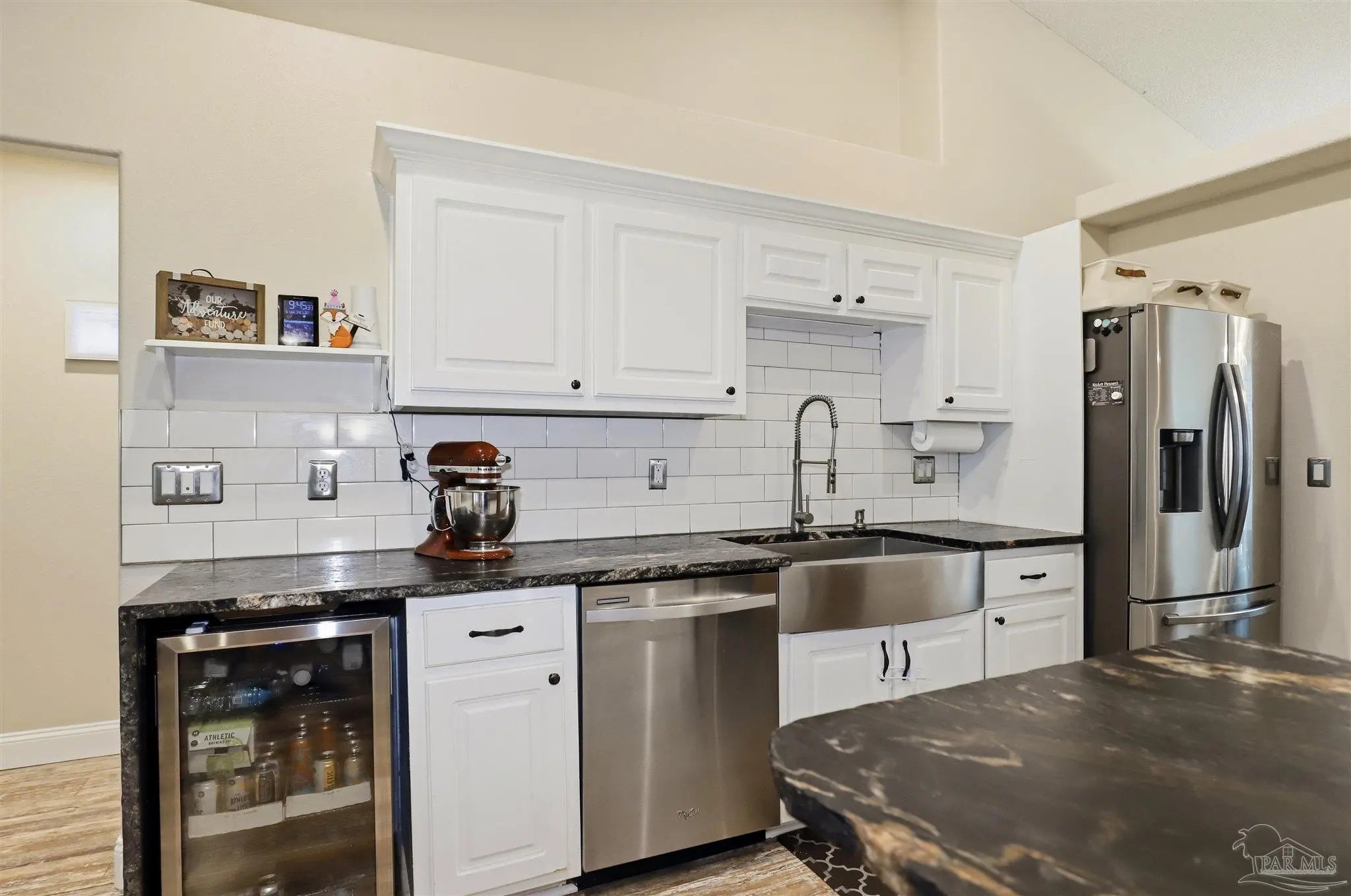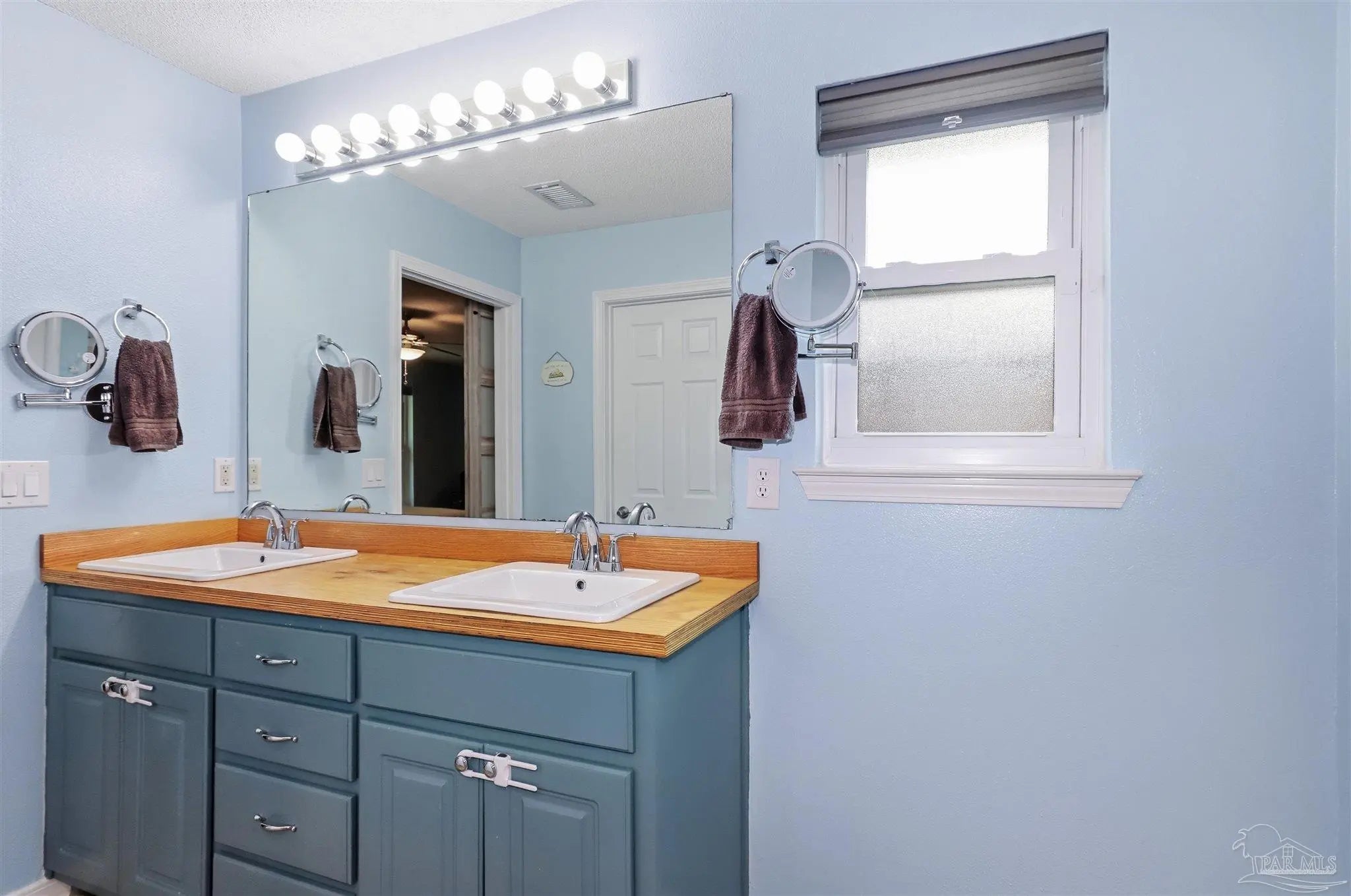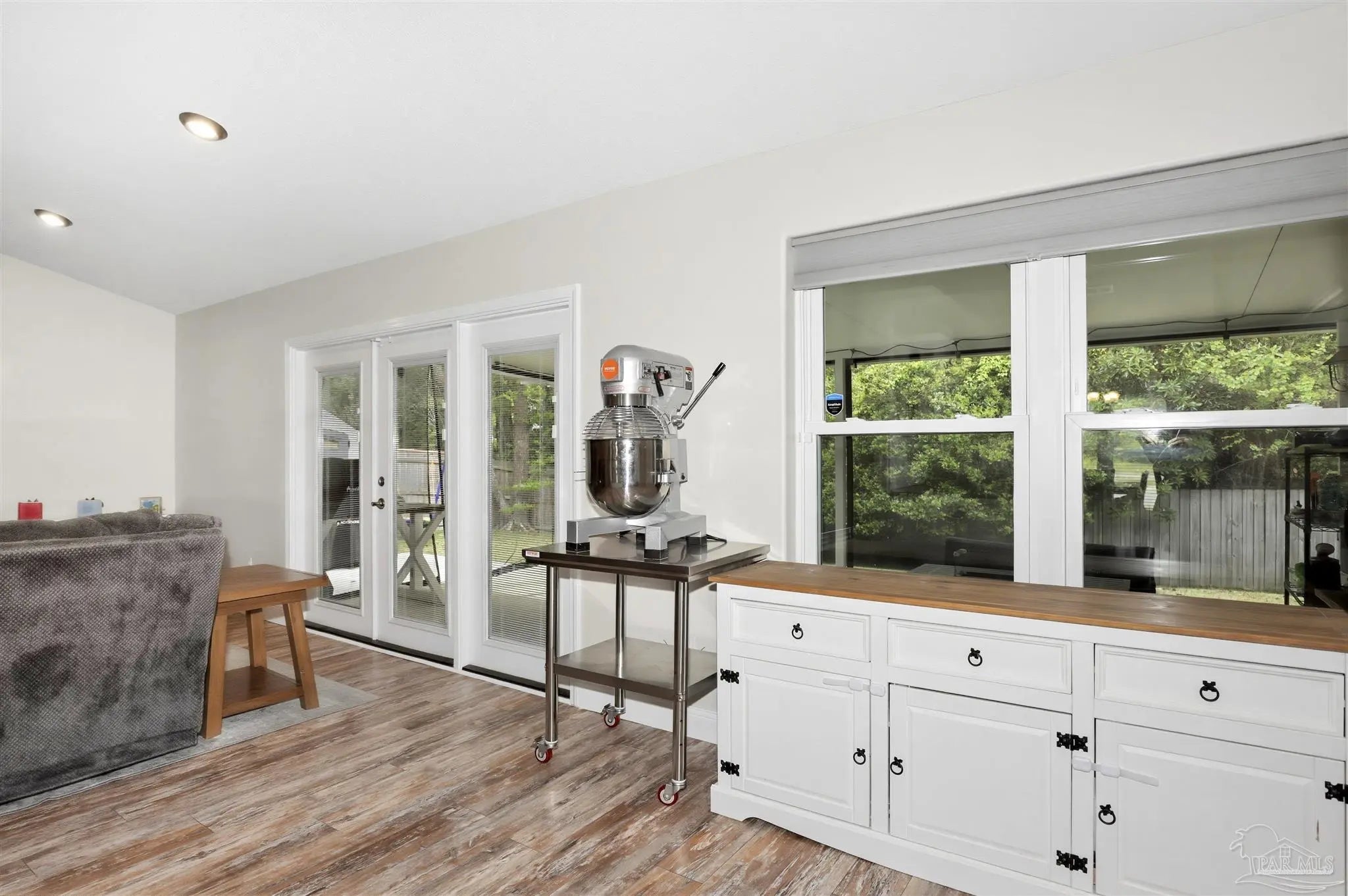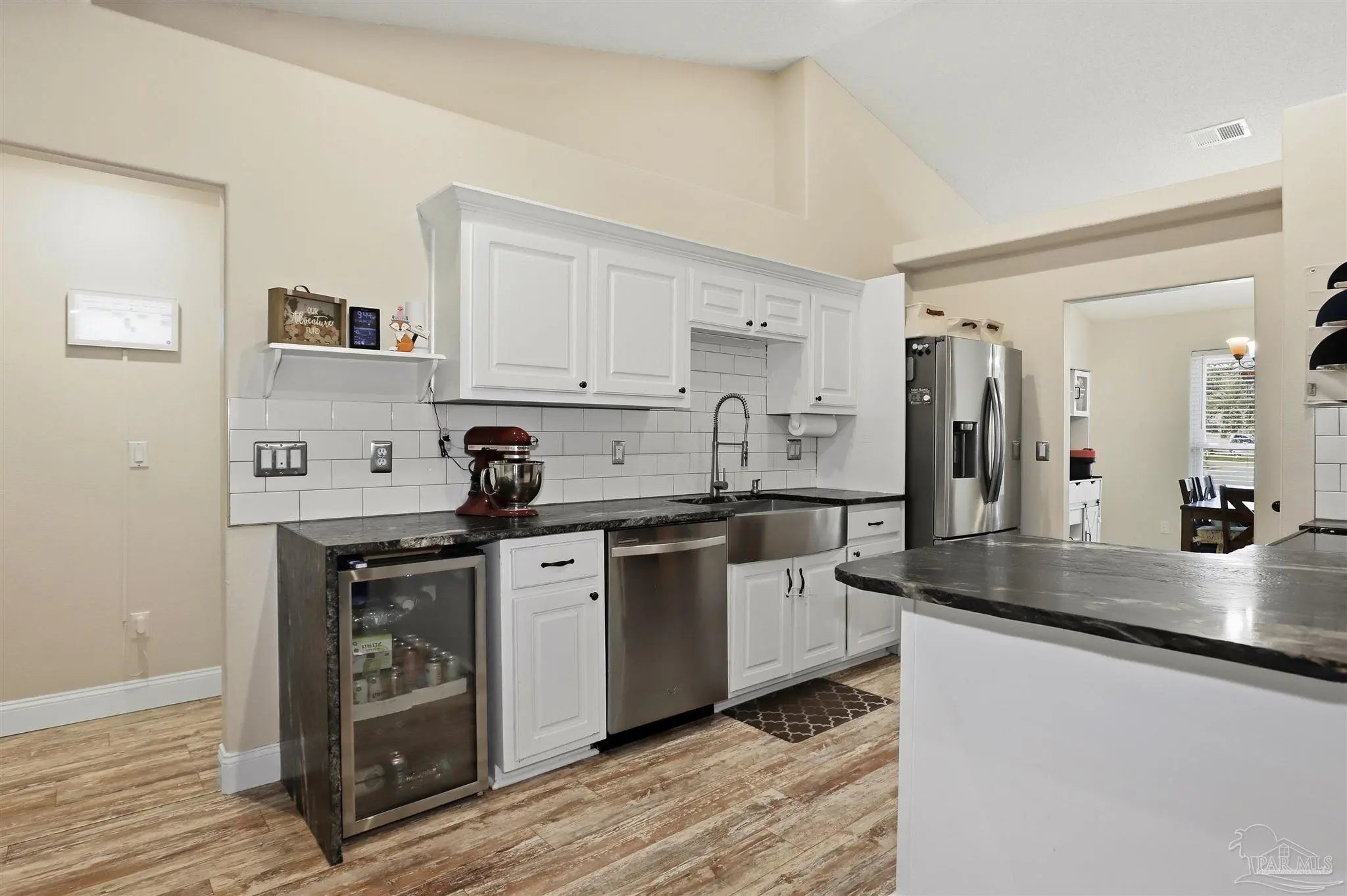 Move-in ready 4BR/2BA (1,903 sf) in Navarre. Features soaring ceilings, LVP flooring & farmhouse sink. Fenced yard, screened patio & neighborhood bay access. Inviting 4BR/2BA brick home in Navarre, Florida near the Santa Rosa Sound, offering convenient access to Navarre Beach, Hurlburt Field, and Pensacola, featuring soaring ceilings, luxury vinyl plank flooring throughout, and a beautifully updated kitchen with stainless steel appliances and granite countertops, plus a split floor plan, screened patio, fenced backyard, and neighborhood East Bay access just minutes away. Upon entry, a formal dining area sits to the right and flows seamlessly into the beautifully updated kitchen, complete with stainless steel appliances, farmhouse sink, textured leathered granite countertops with a rock-faced edge, built-in microwave, electric range, and space for a beverage cooler. The split floor plan offers privacy, with the spacious primary suite tucked away on one side, featuring a ceiling fan and an impressive en-suite bath with a walk-in shower, oversized closet, water closet, and linen storage. The open living area is ideal for entertaining and extends to a screened, covered back patio, plus an additional open patio—perfect for a fire pit. Three additional bedrooms are located on the opposite side of the home and share a full bath with updated vanities. Additional upgrades include recessed lighting, newer refrigerator, new windows for improved energy efficiency, and updated electrical with a generator switch installed. Enjoy a fully fenced backyard with privacy fencing and take advantage of neighborhood bay access just a few blocks away for evening walks and water views. HVAC replaced in 2022 and roof updated in 2019.