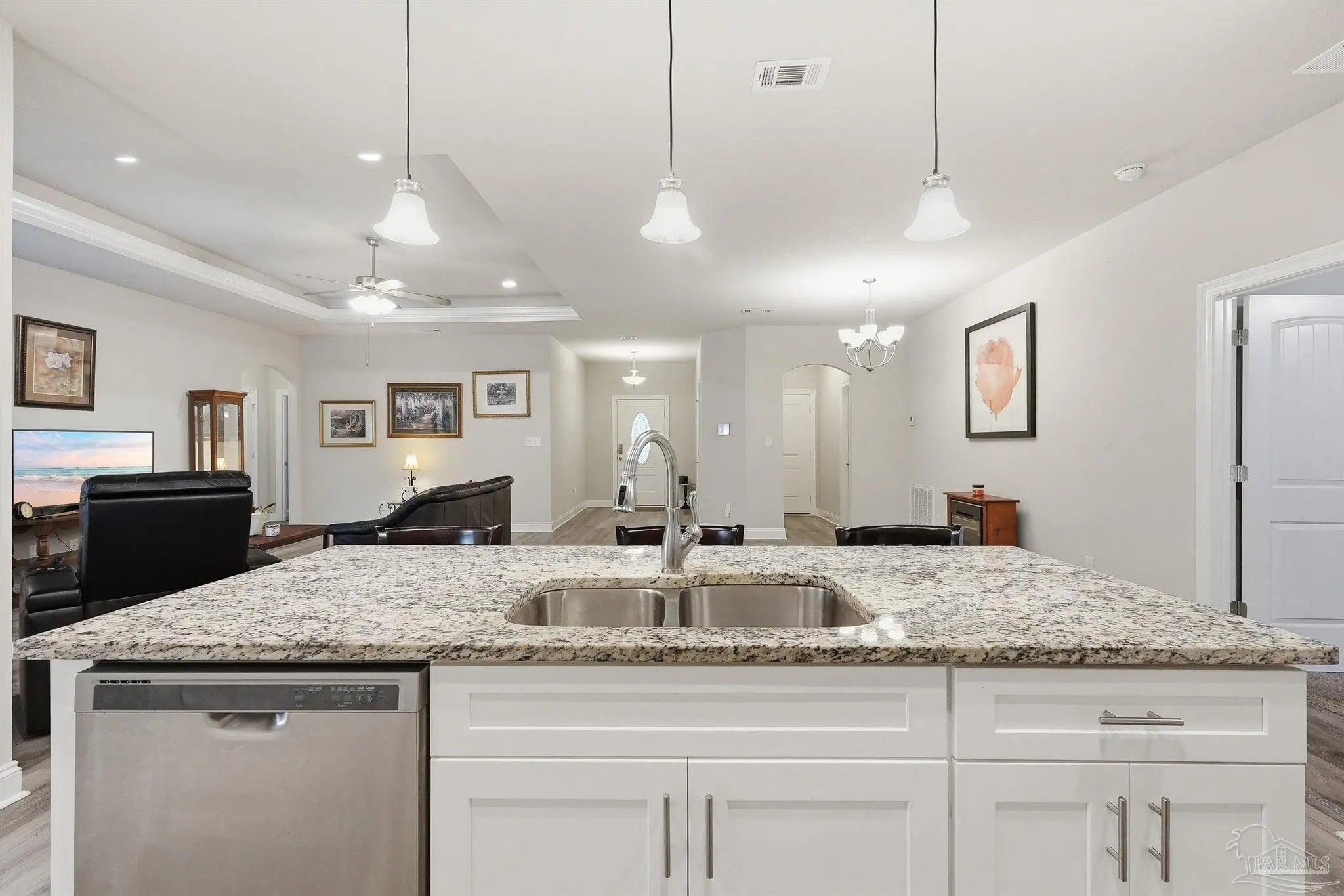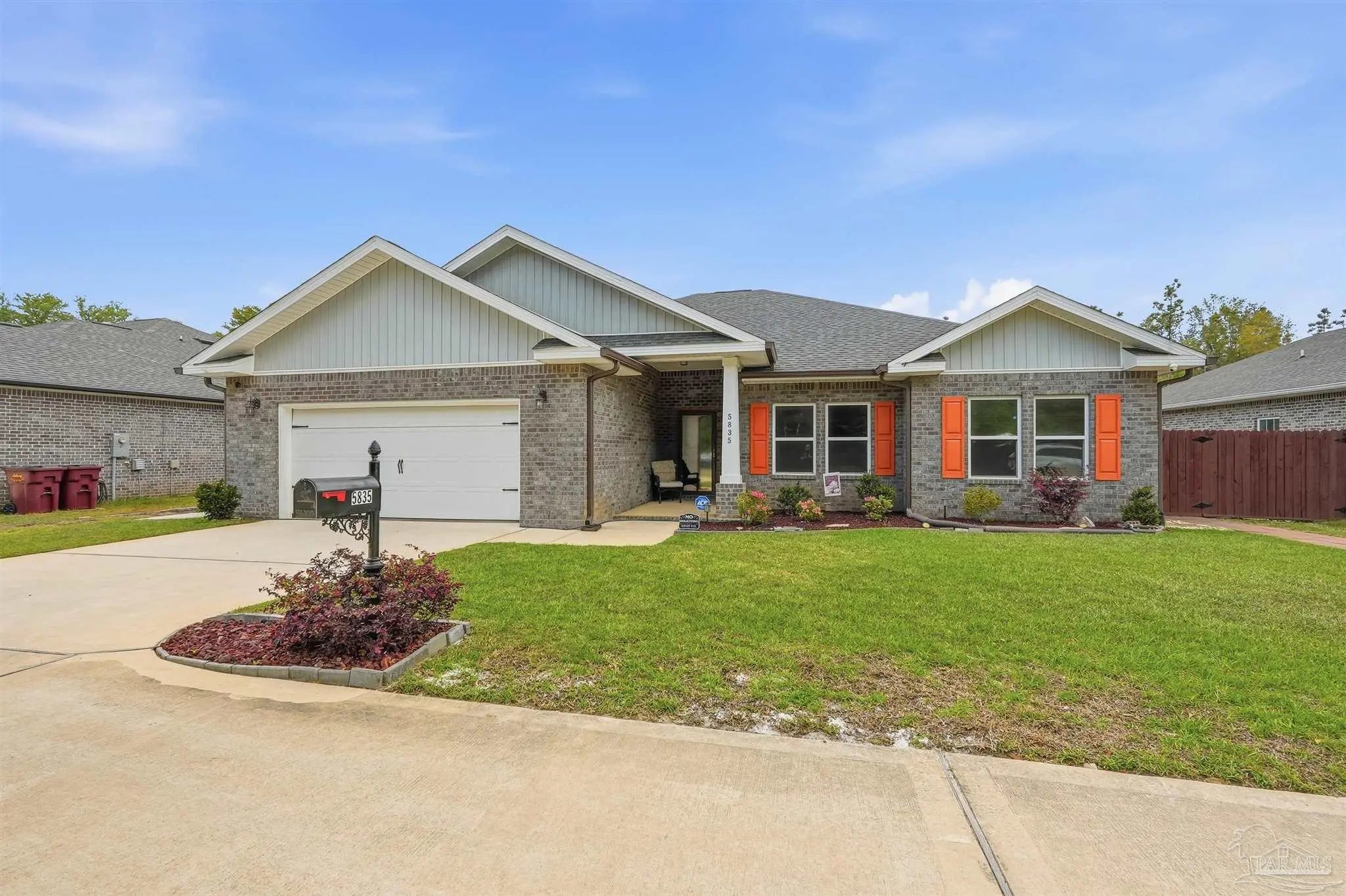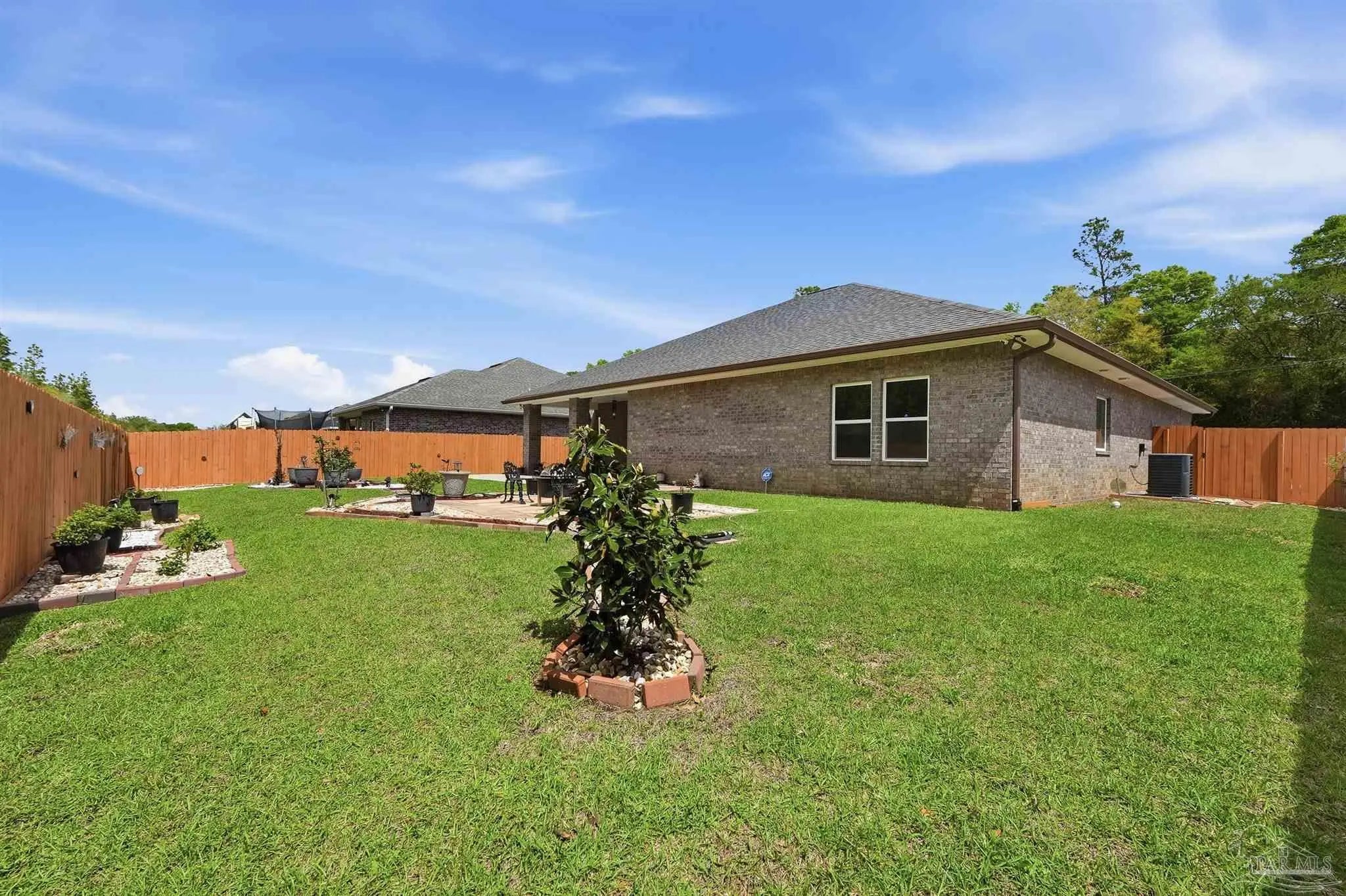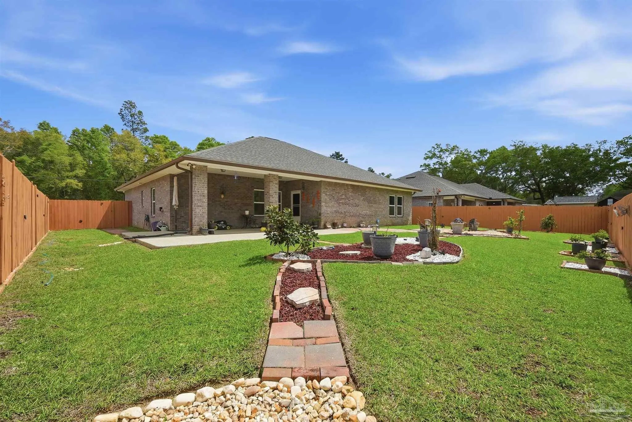 Built in 2022 but finished like a custom home — 5835 Anderson Lane is brick construction with 4 bedrooms, 2 baths, and 2,182 sq ft of intentionally designed living space on a .34-acre lot in Milton. The open floor plan features tray ceilings with crown moulding, arched entryways, high ceilings throughout, and glass insert entry doors front and rear with storm doors. The kitchen offers granite countertops, stainless appliances, a pantry, and flows seamlessly into the family room. The primary suite includes a tray ceiling, garden tub, tiled shower with glass enclosure, double vanity, and a large closet accessible from both the suite and laundry room — plus a linen closet. LVP in common areas, carpet in bedrooms. Outside, enjoy an extended coated covered patio, pavers, hardscaping, extensive landscaping, and a privacy-fenced backyard. Nothing builder-grade here — this one was built with intention and maintained with care.