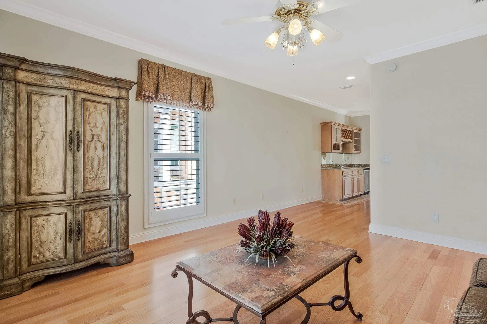 - Baseboards, Ceiling Fan(s), High Ceilings, Wet Bar