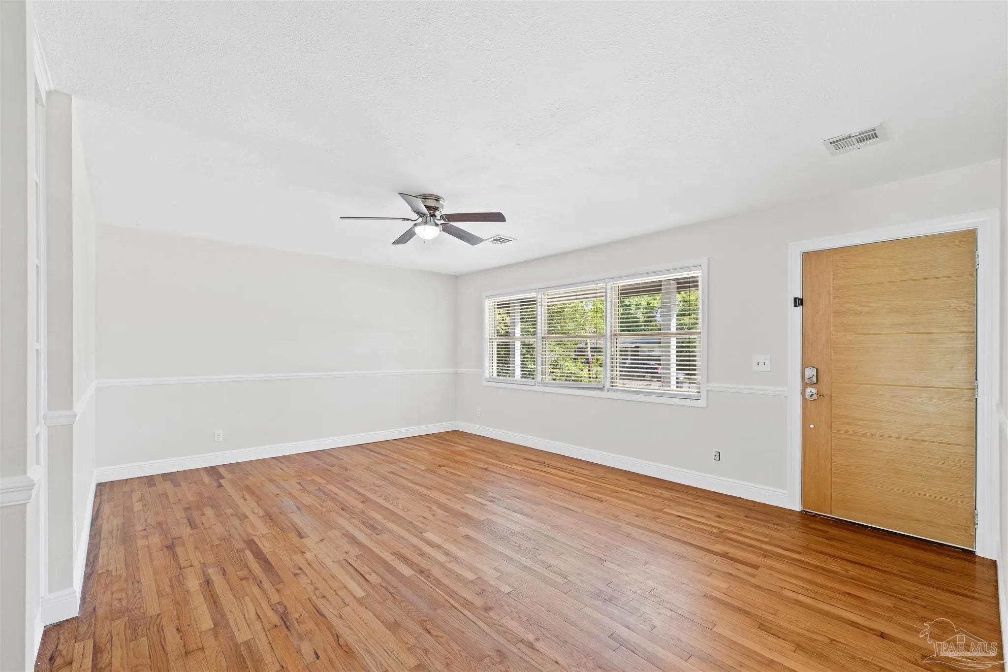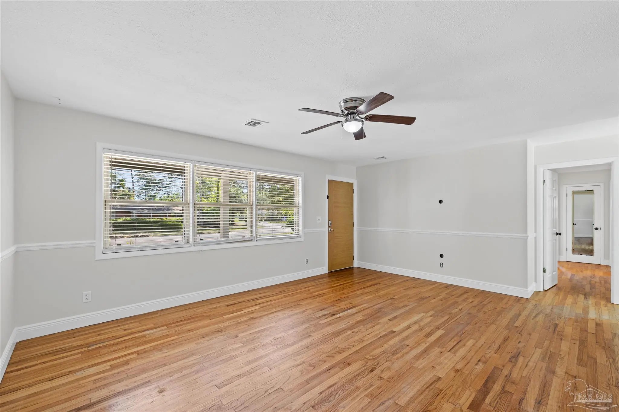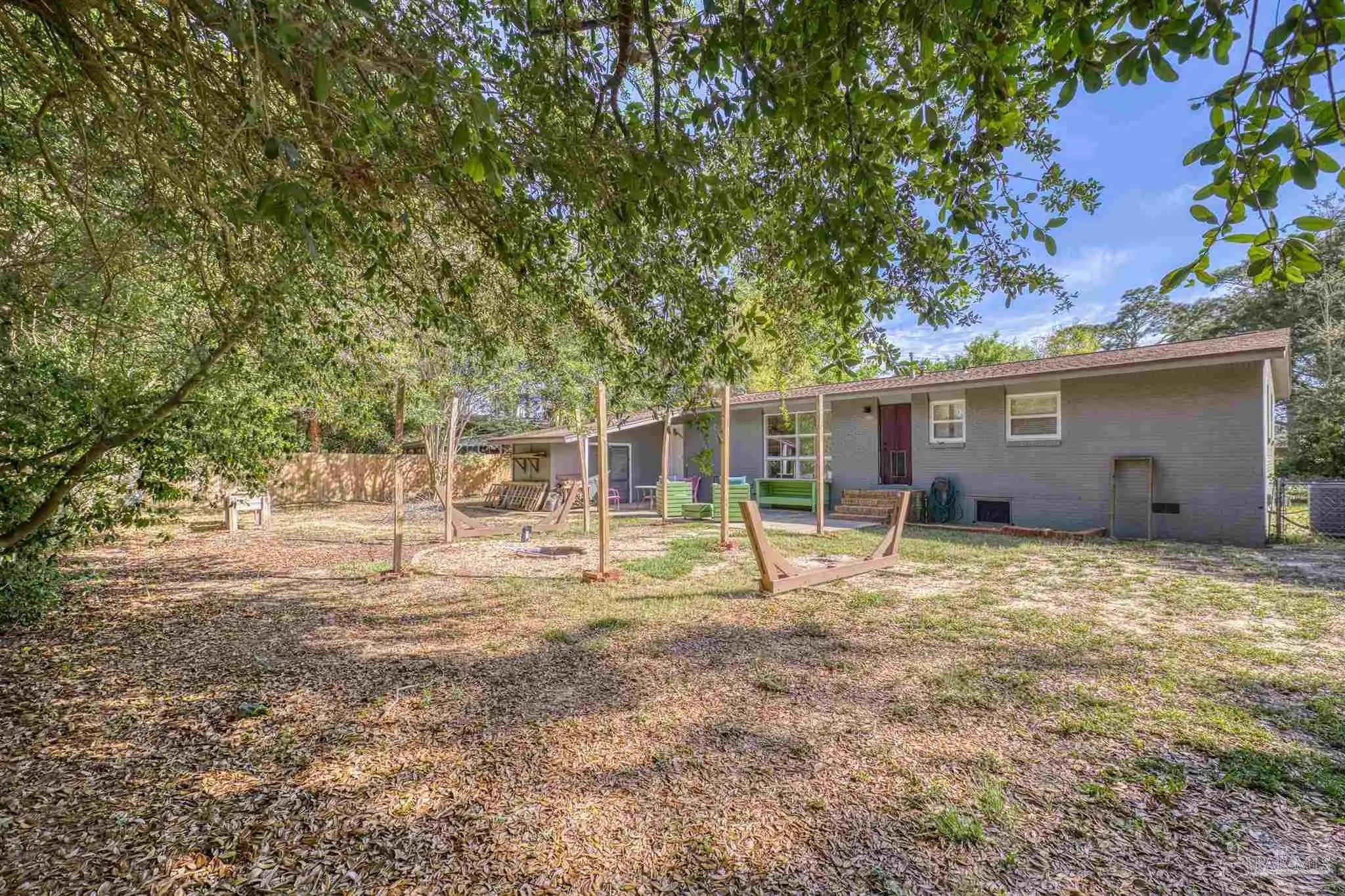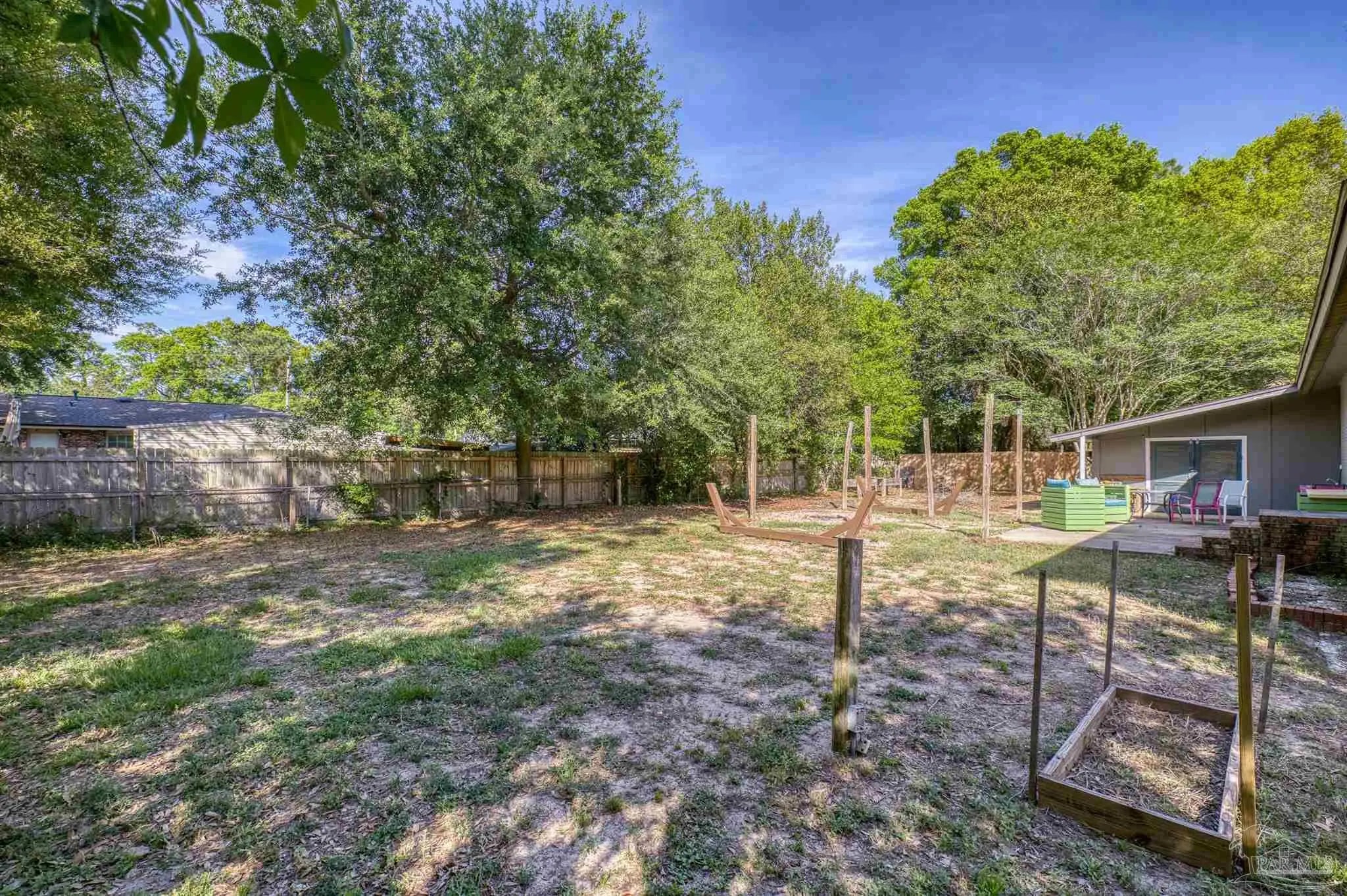 This Scenic Heights home sits on a spacious lot just moments from local parks and everyday conveniences. Freshly refreshed inside and out with a modern, neutral palette, the home welcomes you with a bright living room featuring hardwood floors, charming chair rail, a built-in bookcase, and large windows overlooking the front yard. A step-down bonus room adds valuable extra living space with its cathedral ceiling, wood-laminate flooring, and painted brick accent wall full of character. The kitchen offers tile flooring, painted cabinetry with a large lazy Susan, open shelving, pantry storage, and electric appliances, while the adjacent dining area showcases floor-to-ceiling windows that flood the space with natural light. All three bedrooms include hardwood flooring, ceiling fans, and generous closets. The updated full bath features a modern vanity and tub-shower combo, and the updated half bath connects conveniently to both the primary bedroom and the laundry area. The laundry room includes tile flooring, built-in shelving, and access to the backyard. Outdoors, the fenced yard is lined with mature trees and offers both a large open patio—perfect for BBQs—and a smaller covered patio with access to a spacious storage room or workshop. Move-in ready and thoughtfully maintained, this charming home blends comfort, updates, and convenience in one inviting package.