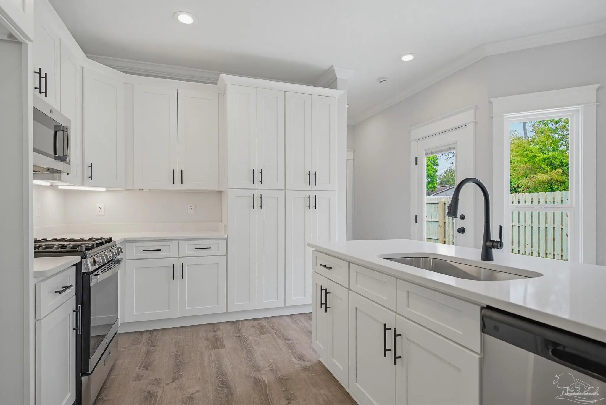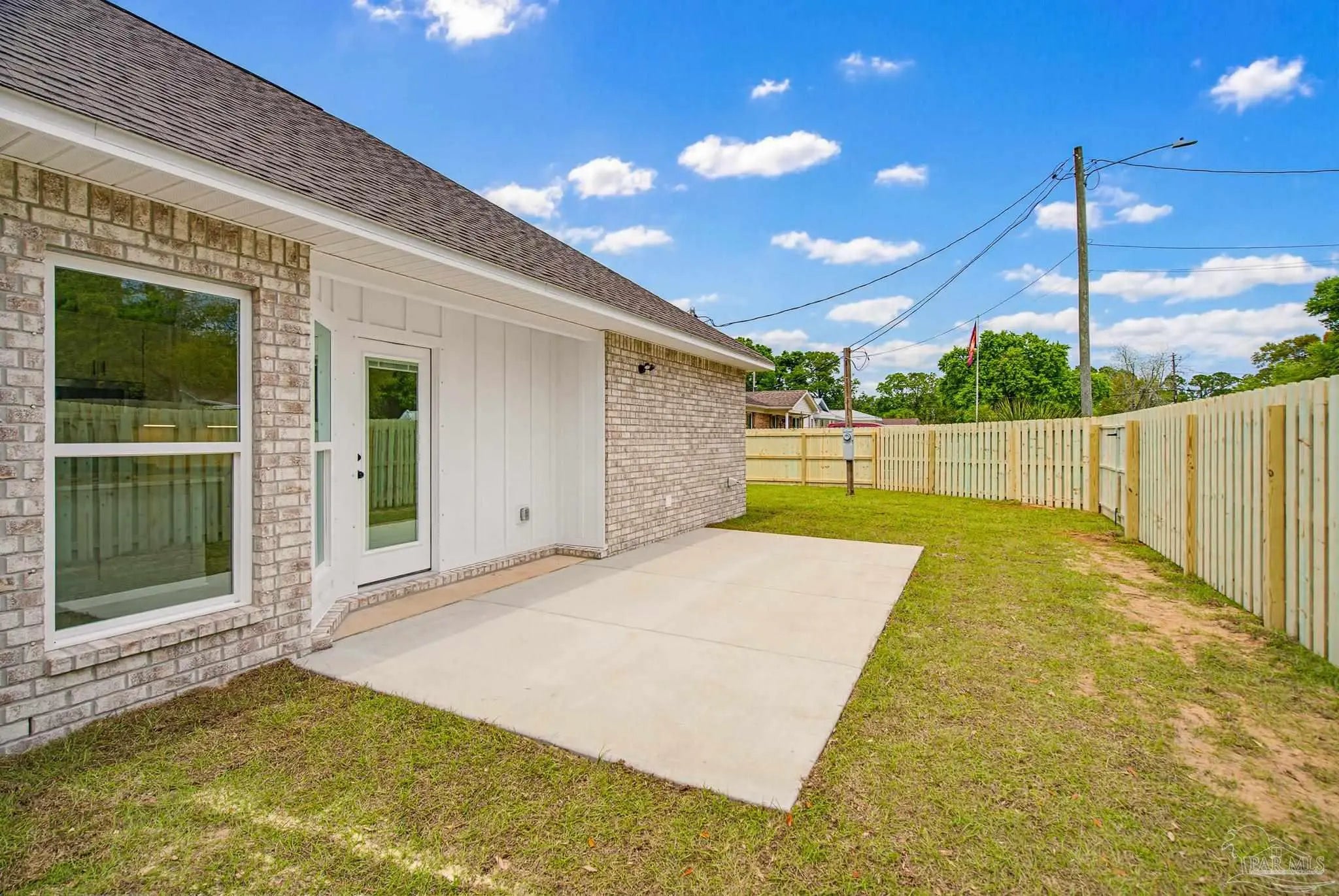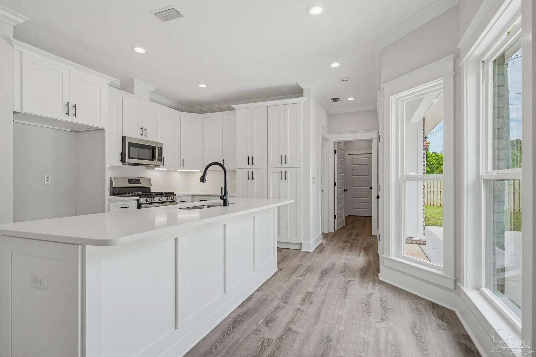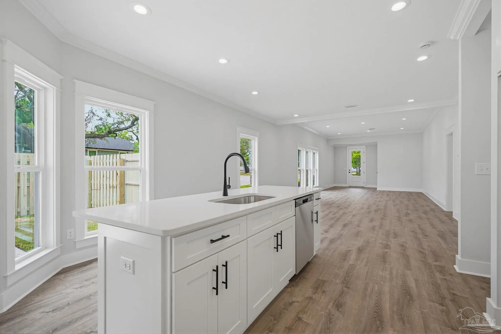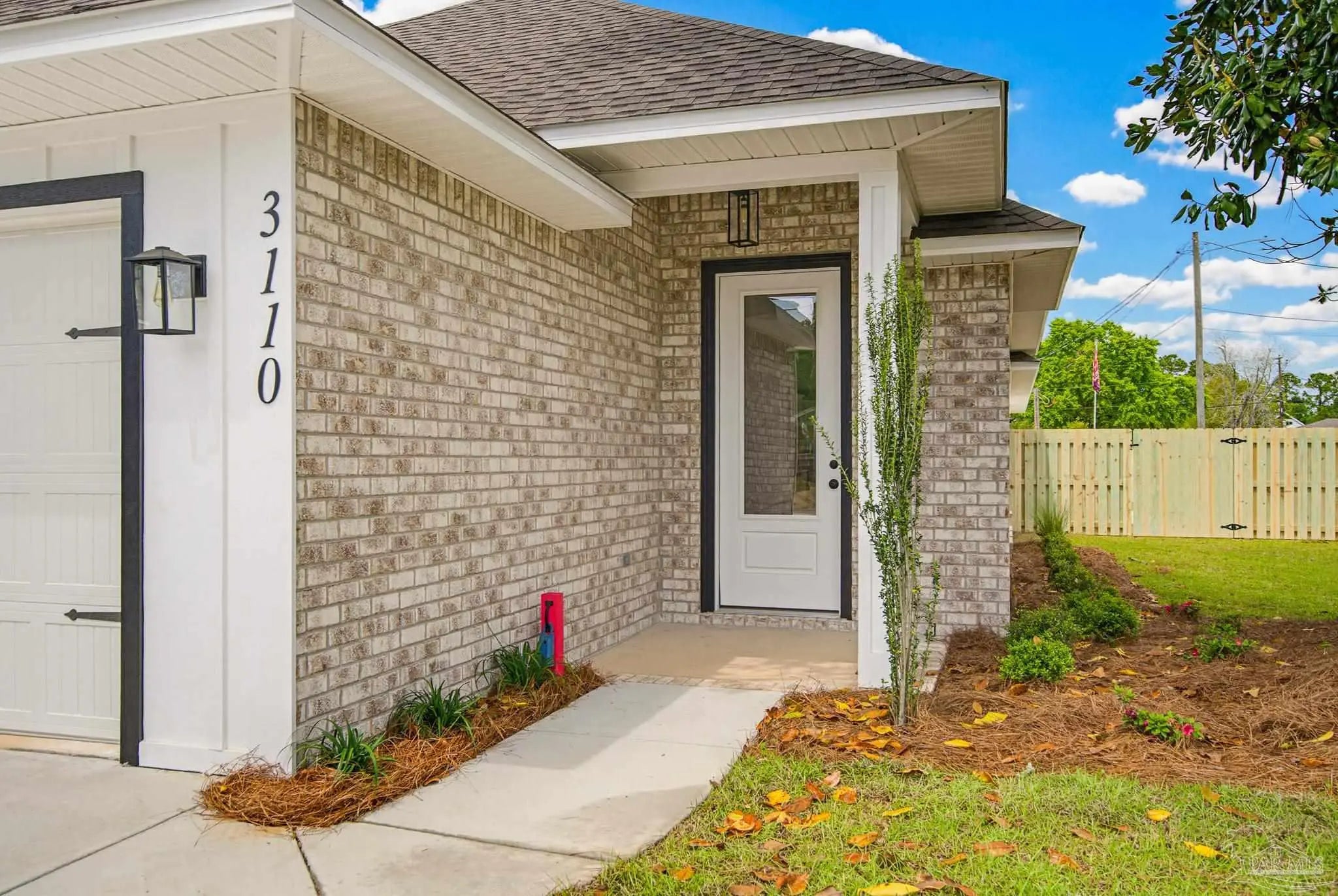 This brand-new, custom-built home is just minutes from local shopping, and dining, including a grocery store, bakery, and bistro. It’s a short drive to downtown Pensacola and Pensacola Beach. The design seamlessly blends craftsman and modern coastal elements! The exterior features white brick with black trim, complemented by a mature magnolia tree and a camellia bush in the front yard. Inside, the home offers 4 bedrooms and 2 bathrooms. Upon entry, you'll notice high ceilings, crown molding, and abundant natural light. To the left of the living area, a hallway leads to two bedrooms, a guest bathroom, and a linen closet; behind the hallway, another bedroom is tucked to the left of the kitchen. The bright kitchen includes white cabinets with undercabinet lighting, quartz countertops, a large island, a gas range, and two full pantry cabinets, with access to a private backyard patio. Down the hallway to the right of the kitchen are the primary suite and a full laundry room with a large storage closet. The primary suite features tray ceilings, crown molding, recessed lighting, and large windows. The primary bathroom has a double vanity with quartz countertops and a sleek tiled shower, with a frameless glass door. Additional features include a tankless gas water heater, yard sprinkler system, and ample storage. The modern finishes perfectly complement the craftsman style, creating a truly lovely home. Schedule your showing today!