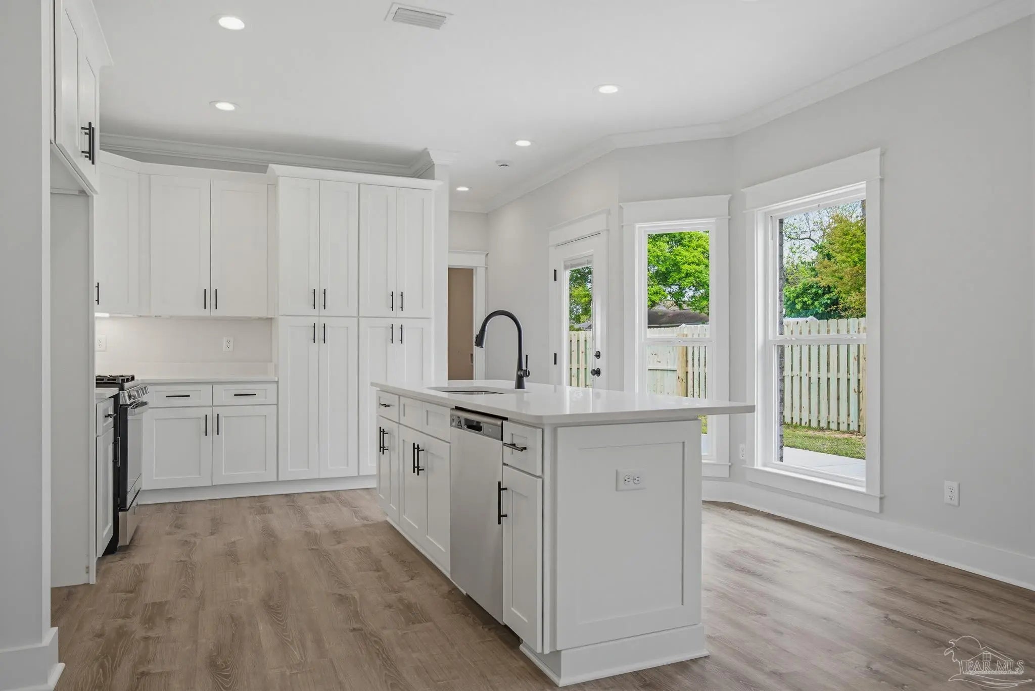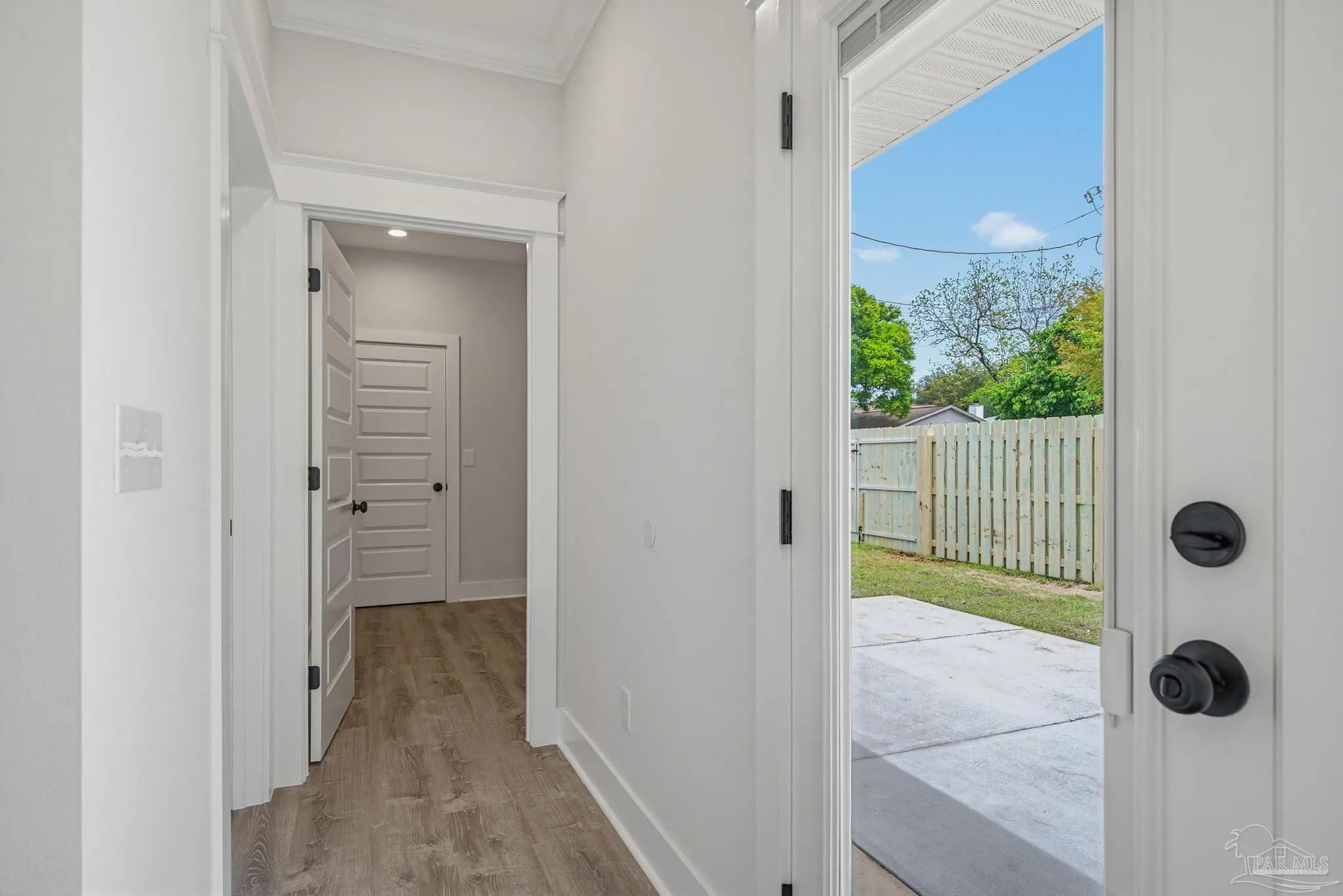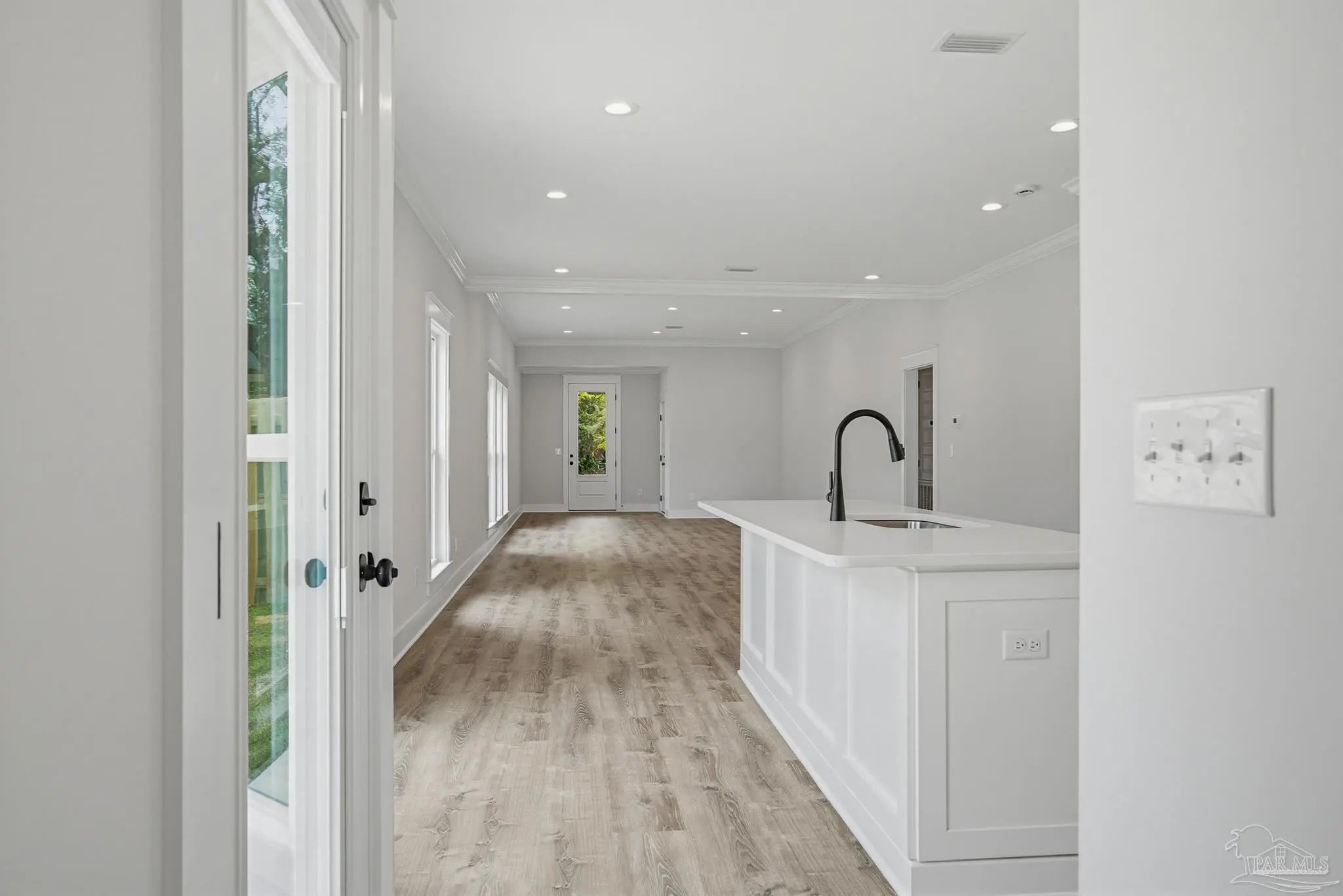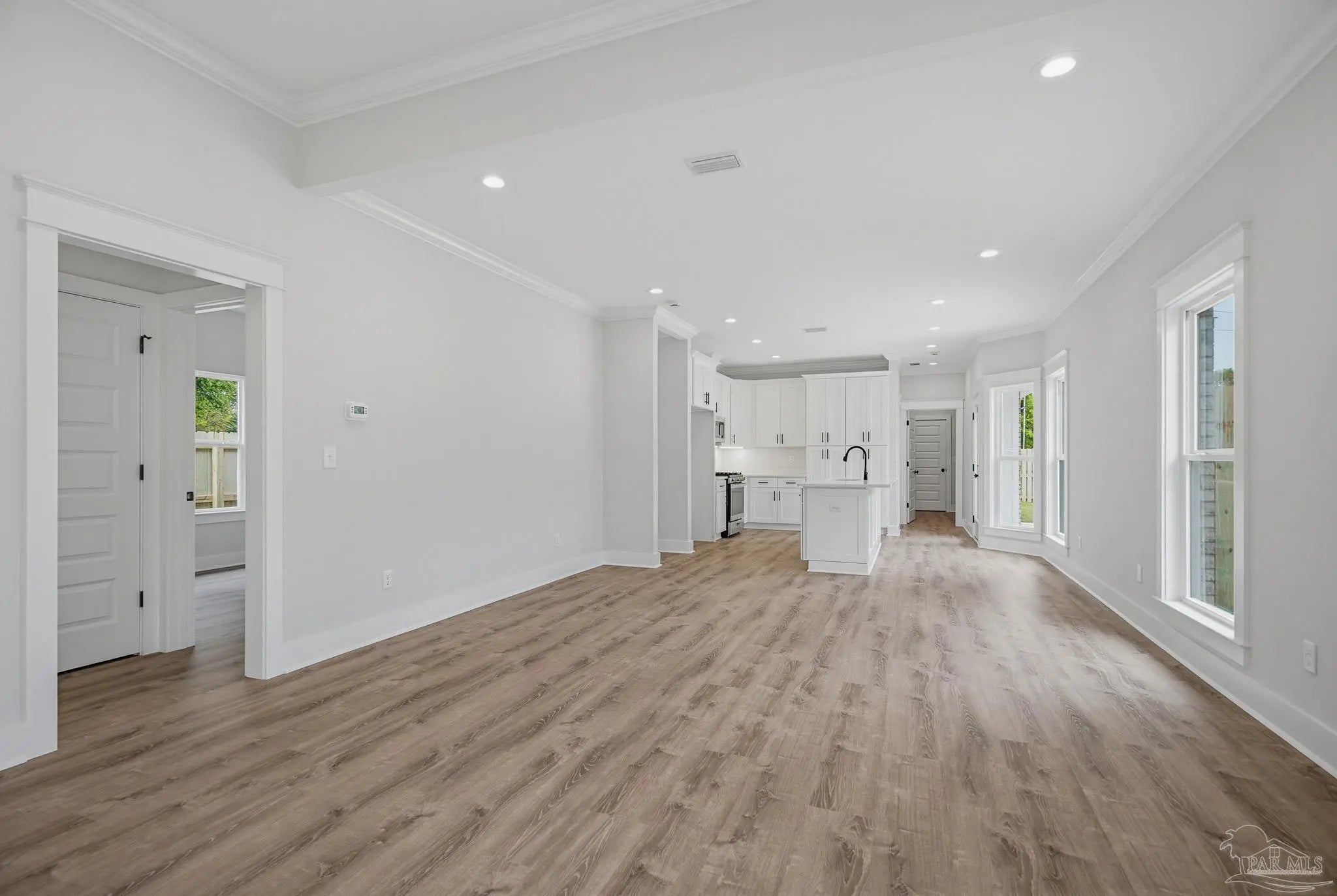 This brand-new, custom-built home is just minutes from local shopping, and dining, including a grocery store, bakery, and bistro. It’s a short drive to downtown Pensacola and Pensacola Beach. The design seamlessly blends craftsman and modern coastal elements! The exterior features white brick with black trim, complemented by a mature magnolia tree and a camellia bush in the front yard. Inside, the home offers 4 bedrooms and 2 bathrooms. Upon entry, you'll notice high ceilings, crown molding, and abundant natural light. To the left of the living area, a hallway leads to two bedrooms, a guest bathroom, and a linen closet; behind the hallway, another bedroom is tucked to the left of the kitchen. The bright kitchen includes white cabinets with undercabinet lighting, quartz countertops, a large island, a gas range, and two full pantry cabinets, with access to a private backyard patio. Down the hallway to the right of the kitchen are the primary suite and a full laundry room with a large storage closet. The primary suite features tray ceilings, crown molding, recessed lighting, and large windows. The primary bathroom has a double vanity with quartz countertops and a sleek tiled shower, with a frameless glass door. Additional features include a tankless gas water heater, yard sprinkler system, and ample storage. The modern finishes perfectly complement the craftsman style, creating a truly lovely home. Schedule your showing today!