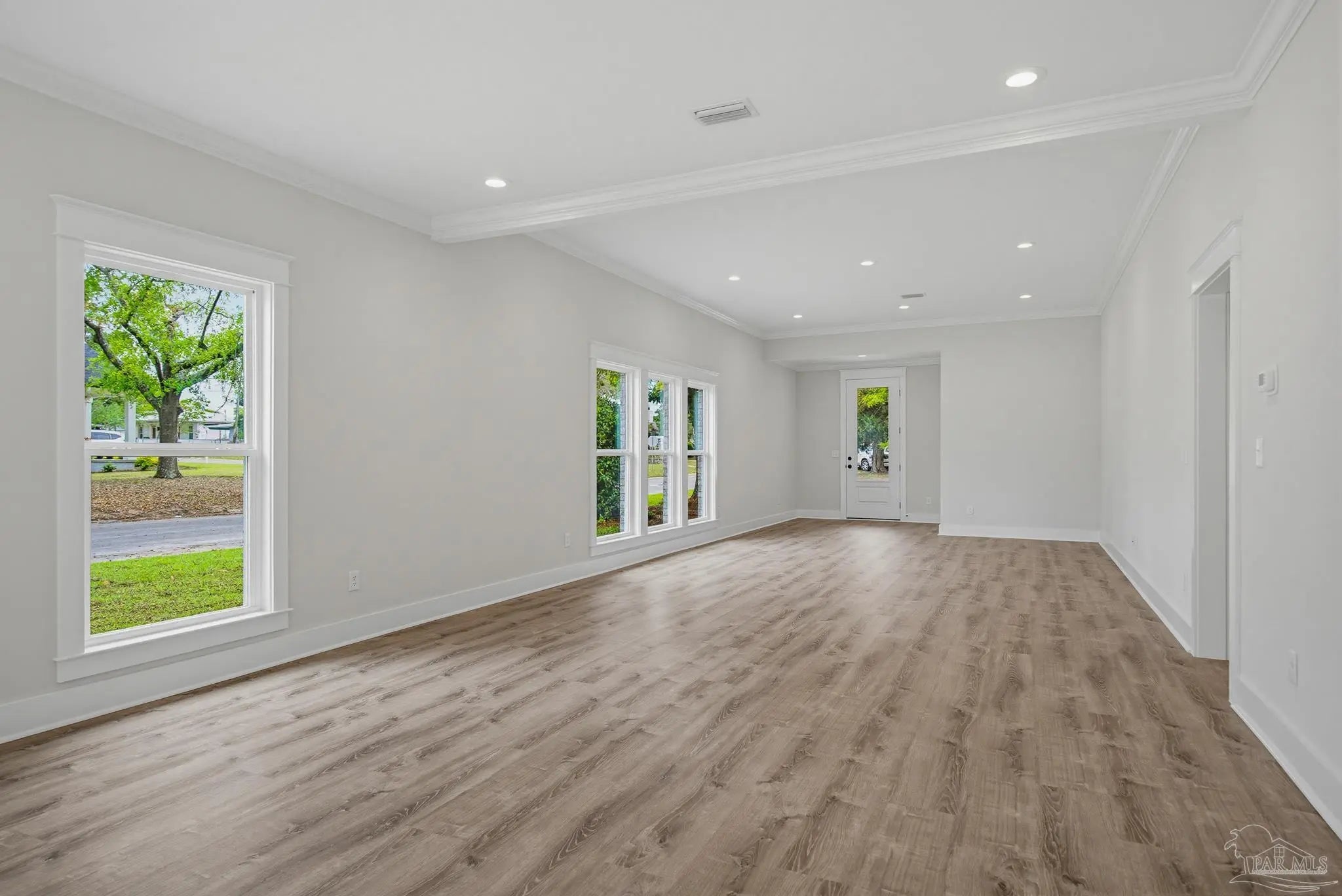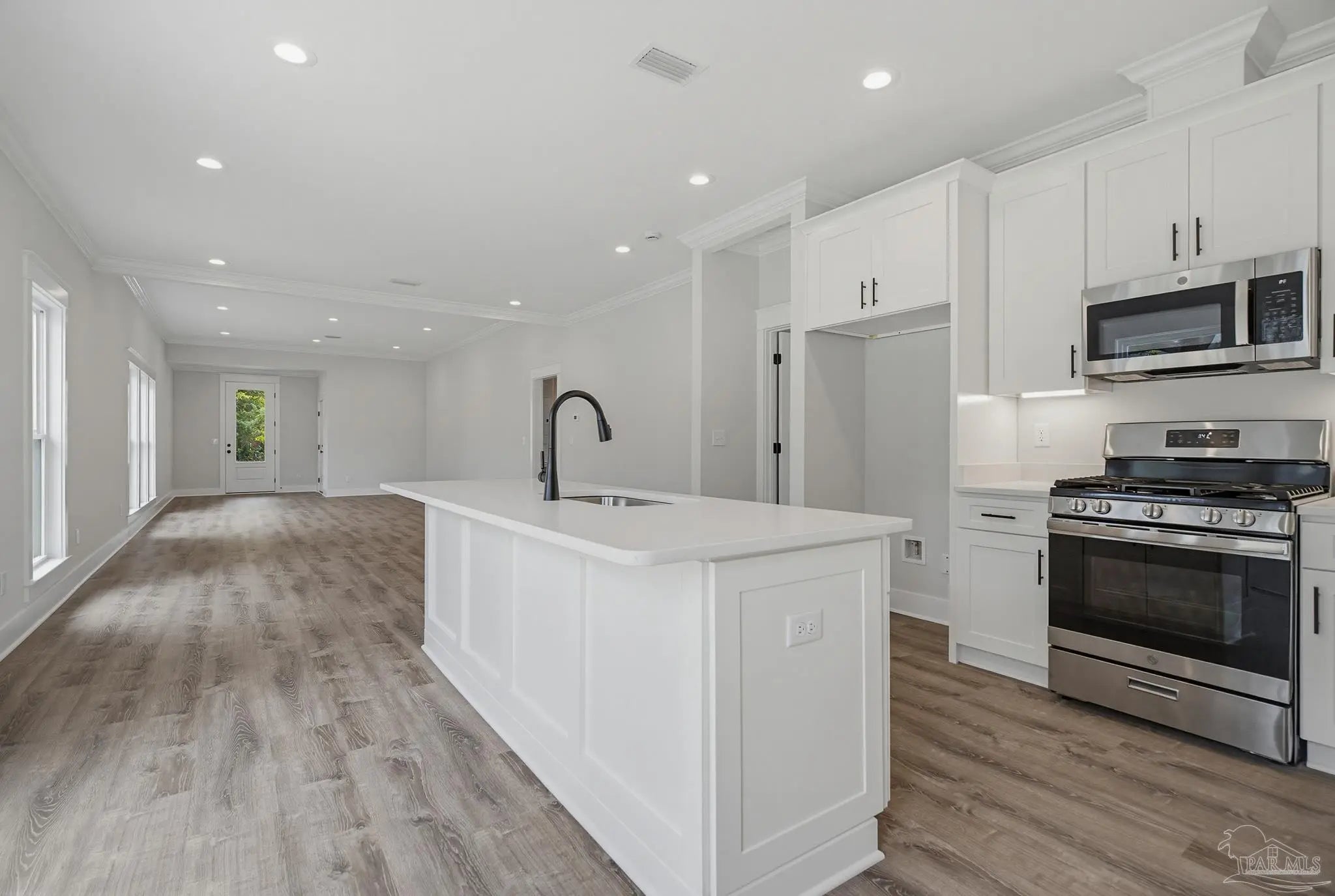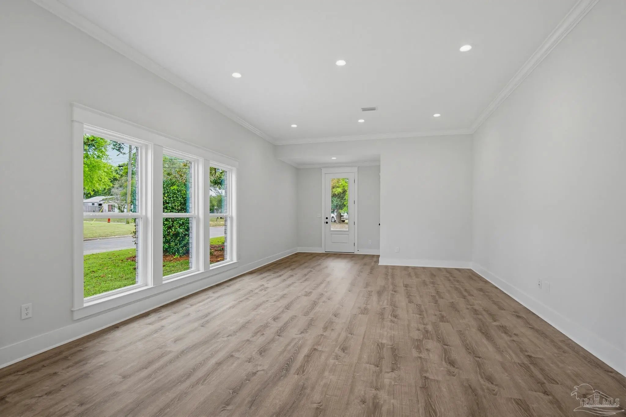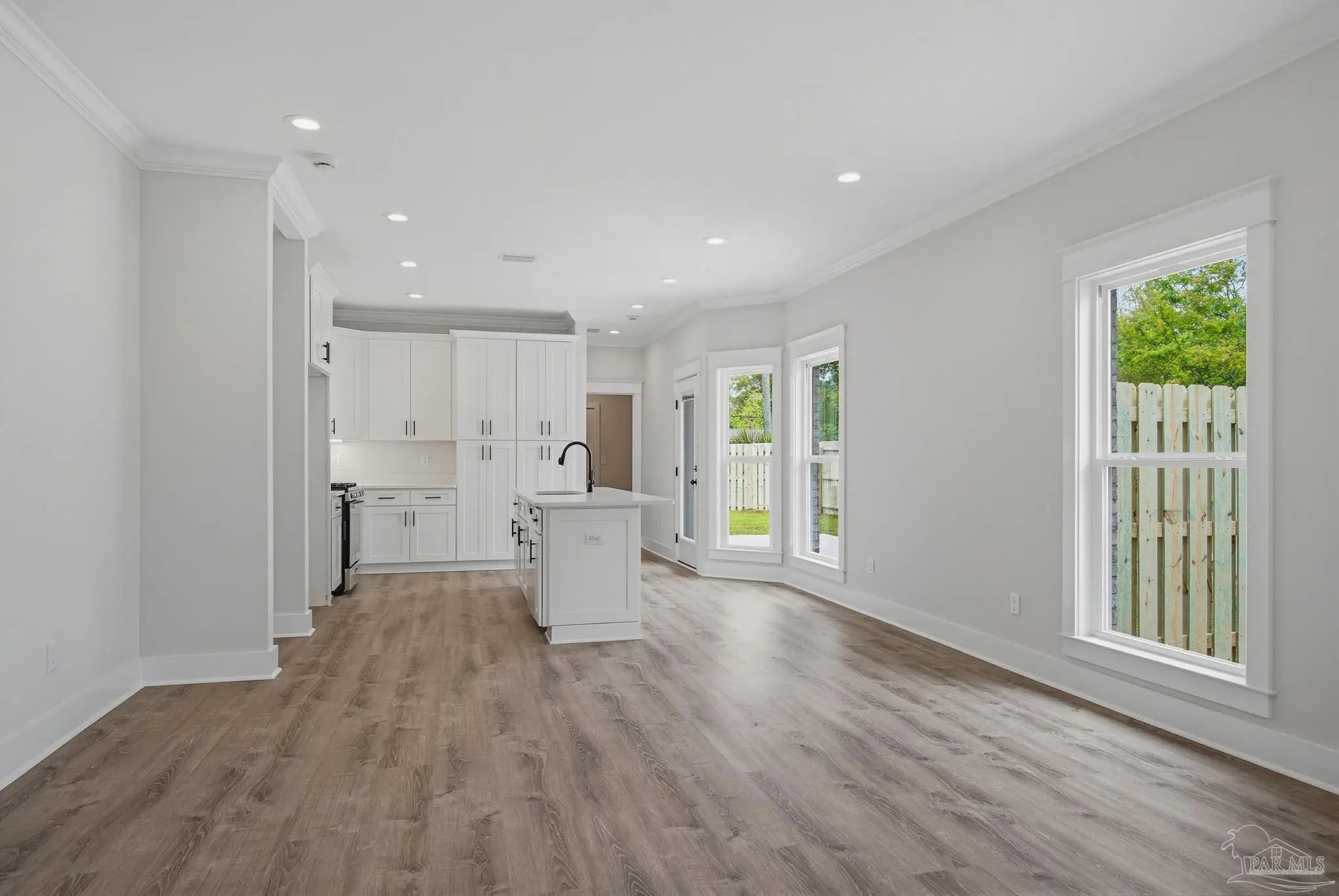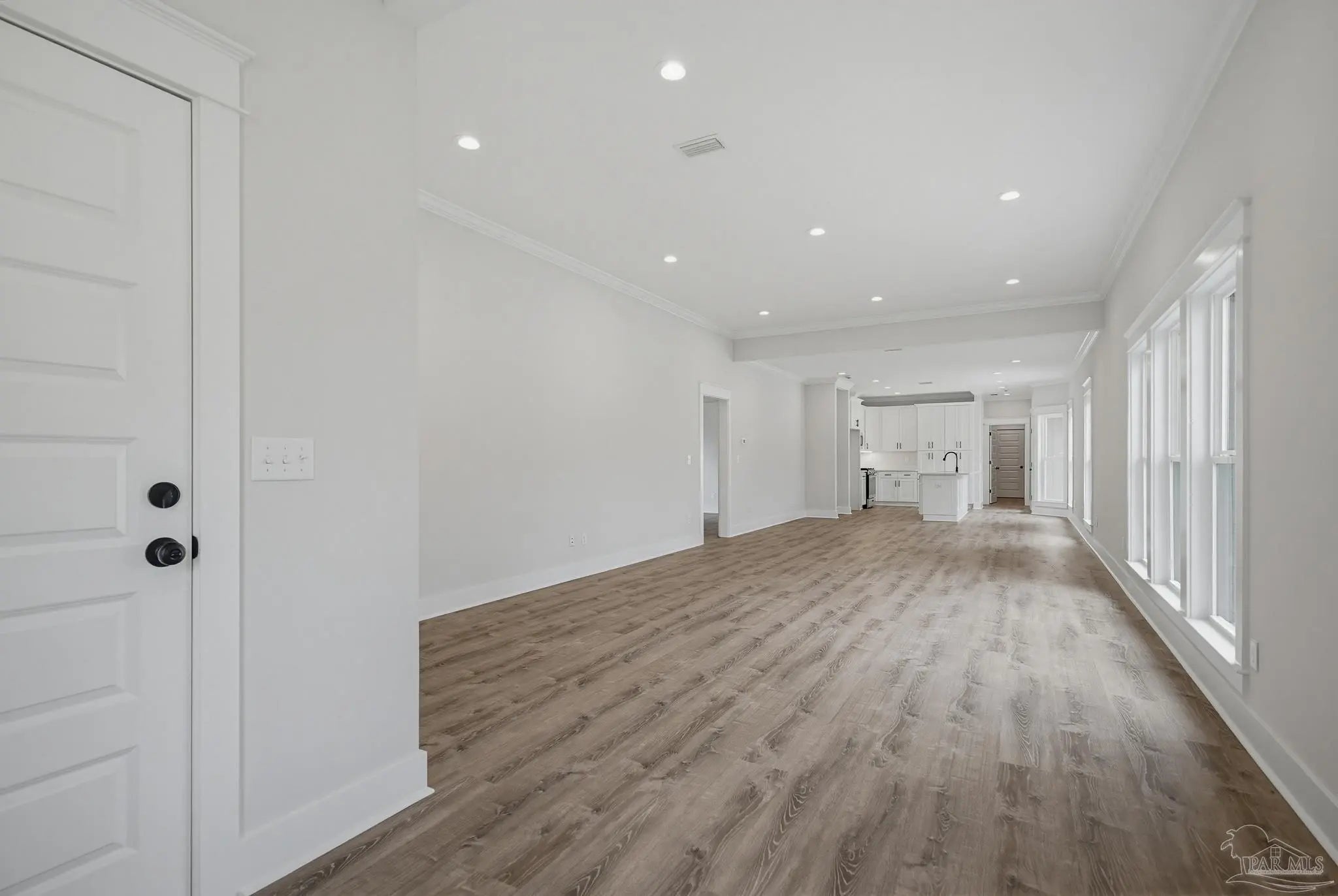 This brand-new, custom-built home is just minutes from local shopping, and dining, including a grocery store, bakery, and bistro. It’s a short drive to downtown Pensacola and Pensacola Beach. The design seamlessly blends craftsman and modern coastal elements! The exterior features white brick with black trim, complemented by a mature magnolia tree and a camellia bush in the front yard. Inside, the home offers 4 bedrooms and 2 bathrooms. Upon entry, you'll notice high ceilings, crown molding, and abundant natural light. To the left of the living area, a hallway leads to two bedrooms, a guest bathroom, and a linen closet; behind the hallway, another bedroom is tucked to the left of the kitchen. The bright kitchen includes white cabinets with undercabinet lighting, quartz countertops, a large island, a gas range, and two full pantry cabinets, with access to a private backyard patio. Down the hallway to the right of the kitchen are the primary suite and a full laundry room with a large storage closet. The primary suite features tray ceilings, crown molding, recessed lighting, and large windows. The primary bathroom has a double vanity with quartz countertops and a sleek tiled shower, with a frameless glass door. Additional features include a tankless gas water heater, yard sprinkler system, and ample storage. The modern finishes perfectly complement the craftsman style, creating a truly lovely home. Schedule your showing today!