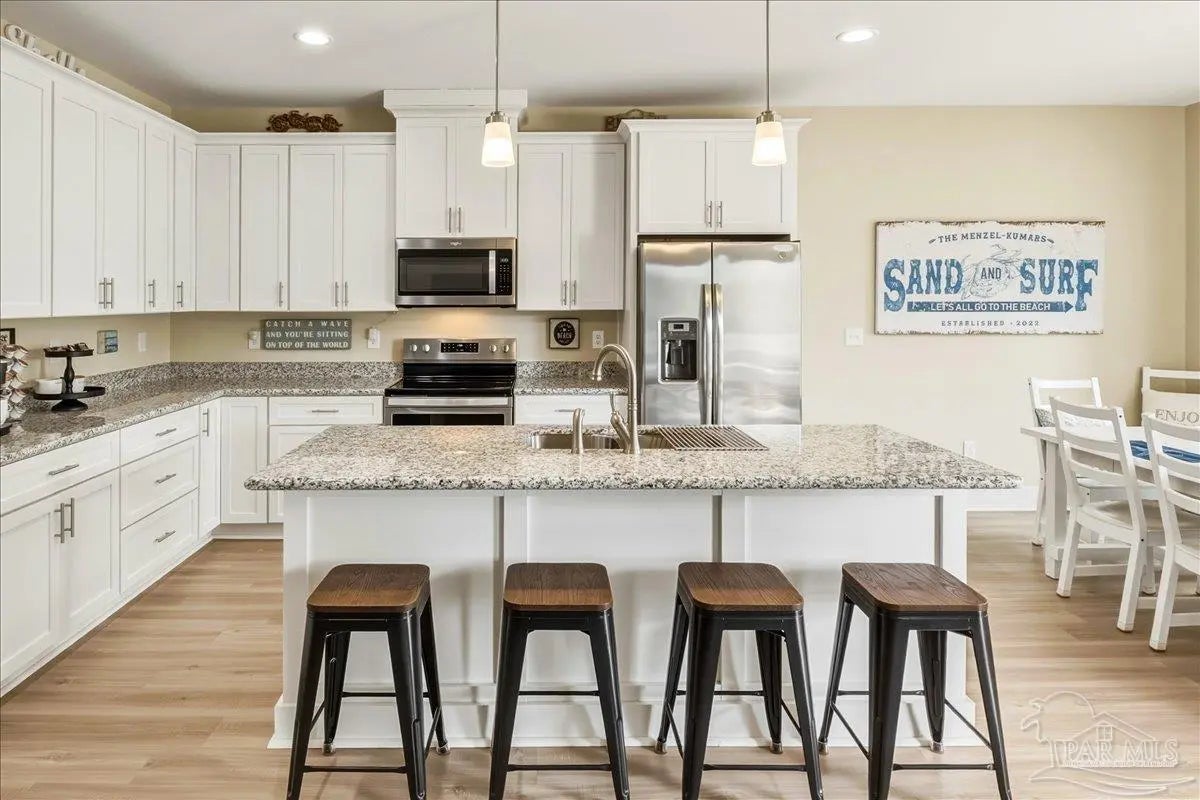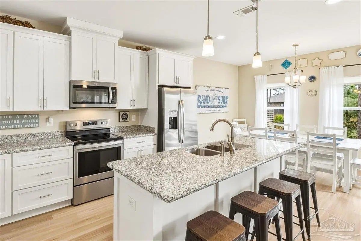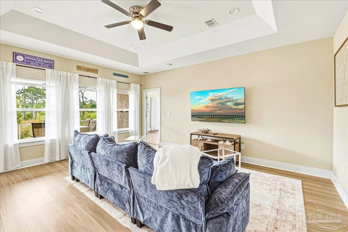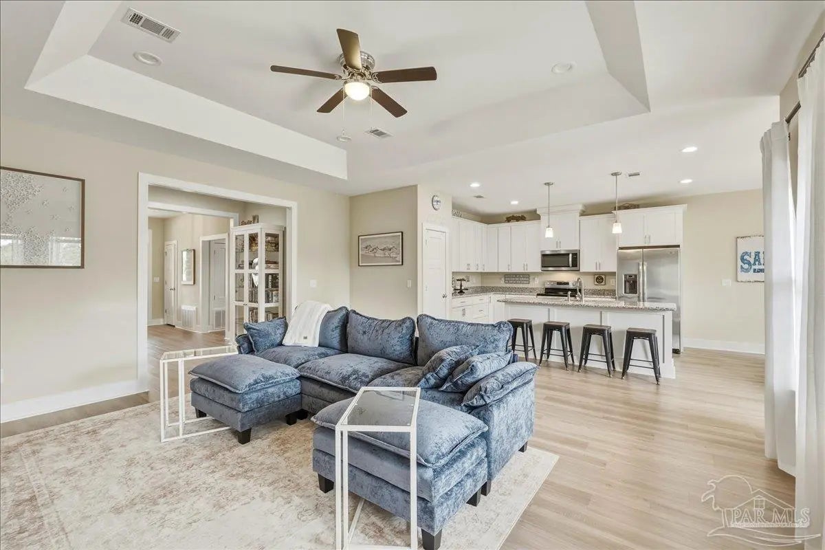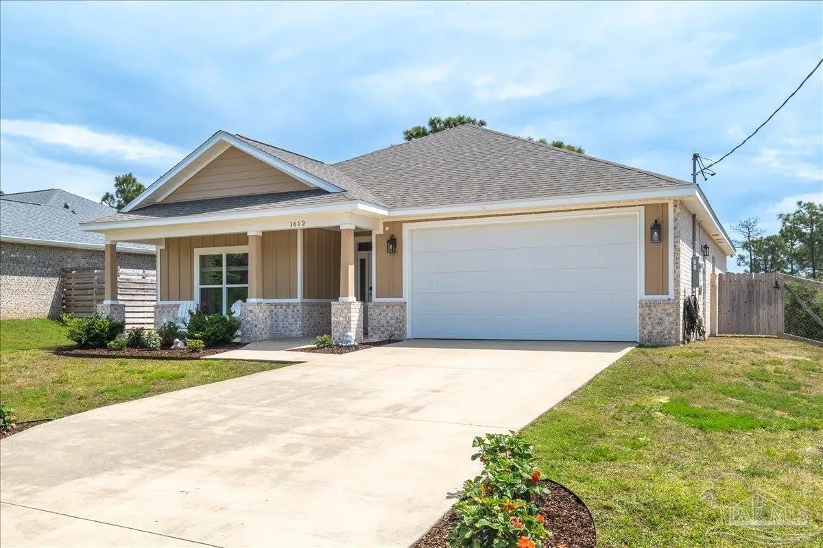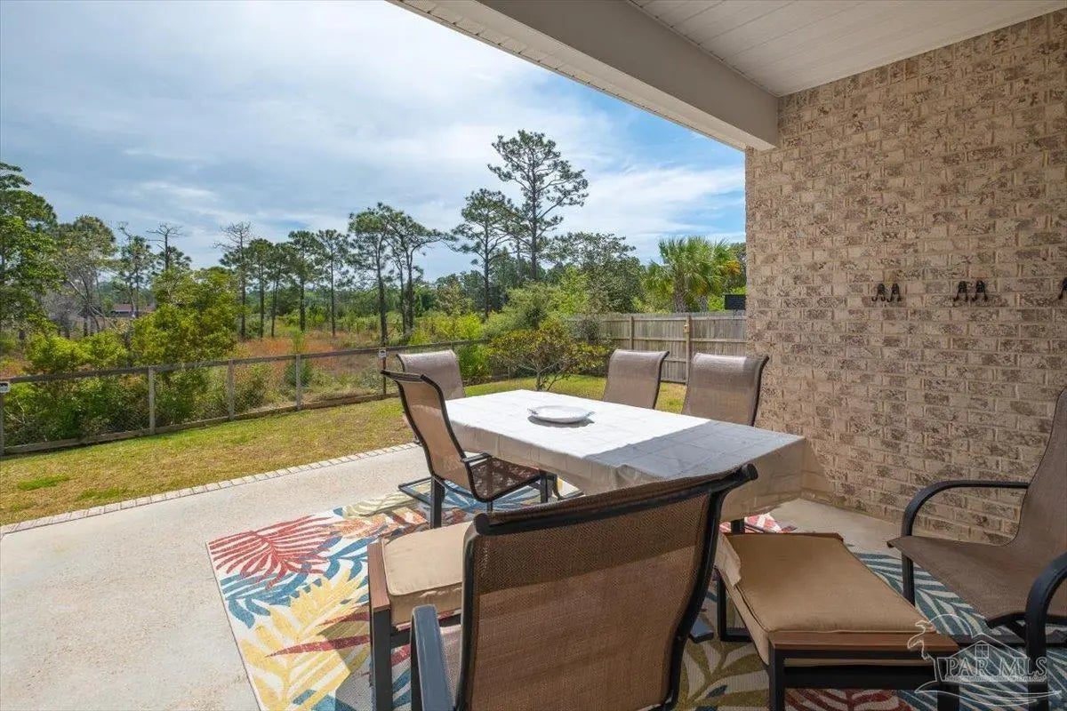 Experience the perfect blend of comfort, style, and location in this beautifully maintained home, ideally situated between Pensacola and Navarre Beach—just minutes from a convenient boat ramp. Step inside to an inviting open-concept living space filled with natural light, thanks to a stunning wall of windows. The seamless layout creates a warm and welcoming atmosphere, perfect for both everyday living and entertaining. The kitchen is a true centerpiece, featuring stainless steel appliances—including a French door refrigerator, smooth top range, microwave, and dishwasher—along with a granite-topped island with sink and tall soft-close cabinetry that any home chef will appreciate. The spacious primary suite is a private retreat, complete with a tray ceiling, cozy sitting area, and a large walk-in closet. The en-suite bath offers a spa-like experience with a soaking tub, walk-in shower, water closet, and generous linen storage. Two additional bedrooms provide comfortable accommodations and share a well-appointed second bath with granite countertops. Outside, enjoy the fenced backyard perfect for play, relaxation, or entertaining. The covered patio sets the stage for evenings outdoors, whether you are unwinding after a long day or hosting family and friends. Located just minutes from the pristine shores of Navarre Beach with some of the Gulf Coast’s best activities, fishing from the longest pier in the area, snorkeling vibrant reefs, deep-sea fishing, shell collecting, or simply relaxing by the water. Known for its natural beauty and tranquility, Navarre Beach is a hidden gem along Florida’s coastline. This is your chance to own this exceptional home in a convenient location—where coastal living meets everyday convenience. Move-in ready, Seller may consider selling all furniture and decor.