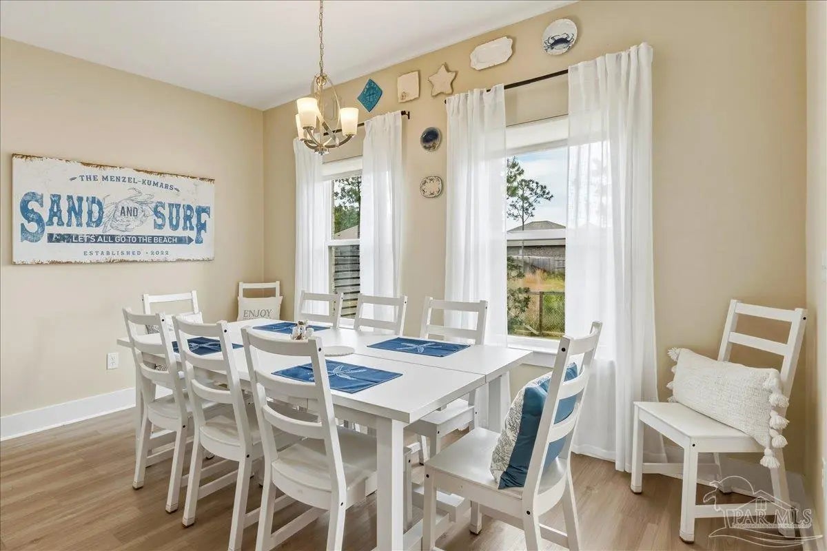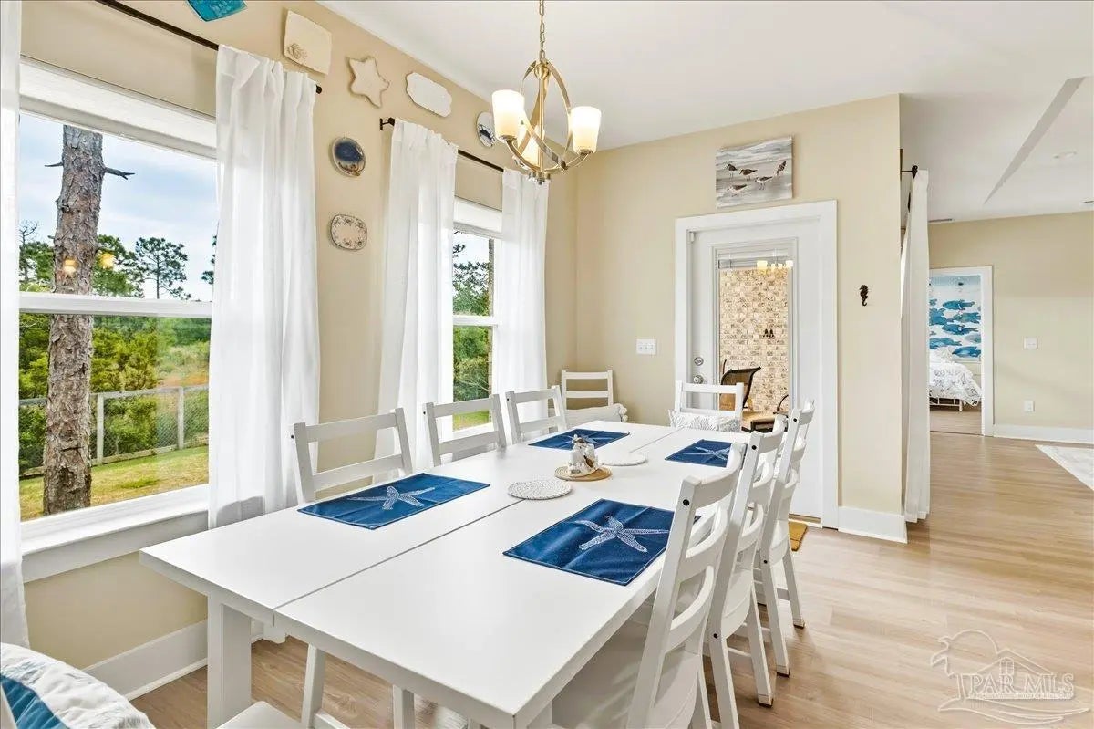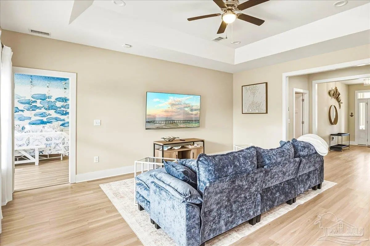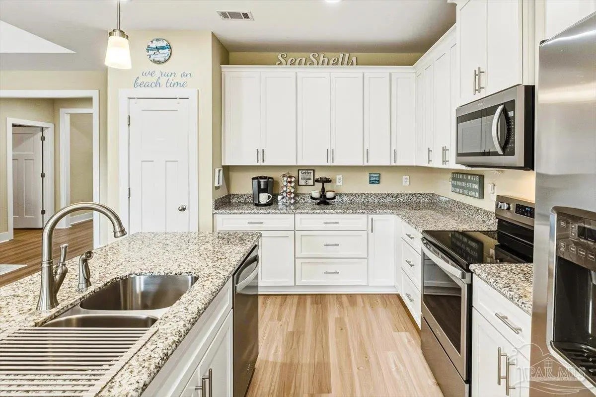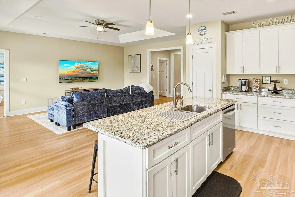 Experience the perfect blend of comfort, style, and location in this beautifully maintained home, ideally situated between Pensacola and Navarre Beach—just minutes from a convenient boat ramp. Step inside to an inviting open-concept living space filled with natural light, thanks to a stunning wall of windows. The seamless layout creates a warm and welcoming atmosphere, perfect for both everyday living and entertaining. The kitchen is a true centerpiece, featuring stainless steel appliances—including a French door refrigerator, smooth top range, microwave, and dishwasher—along with a granite-topped island with sink and tall soft-close cabinetry that any home chef will appreciate. The spacious primary suite is a private retreat, complete with a tray ceiling, cozy sitting area, and a large walk-in closet. The en-suite bath offers a spa-like experience with a soaking tub, walk-in shower, water closet, and generous linen storage. Two additional bedrooms provide comfortable accommodations and share a well-appointed second bath with granite countertops. Outside, enjoy the fenced backyard perfect for play, relaxation, or entertaining. The covered patio sets the stage for evenings outdoors, whether you are unwinding after a long day or hosting family and friends. Located just minutes from the pristine shores of Navarre Beach with some of the Gulf Coast’s best activities, fishing from the longest pier in the area, snorkeling vibrant reefs, deep-sea fishing, shell collecting, or simply relaxing by the water. Known for its natural beauty and tranquility, Navarre Beach is a hidden gem along Florida’s coastline. This is your chance to own this exceptional home in a convenient location—where coastal living meets everyday convenience. Move-in ready, Seller may consider selling all furniture and decor.