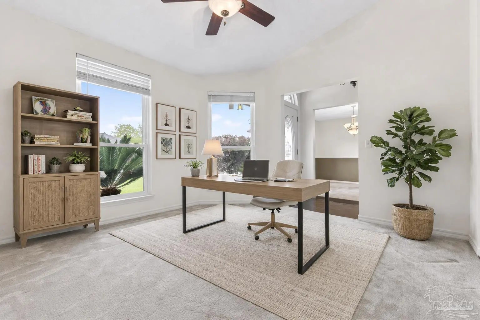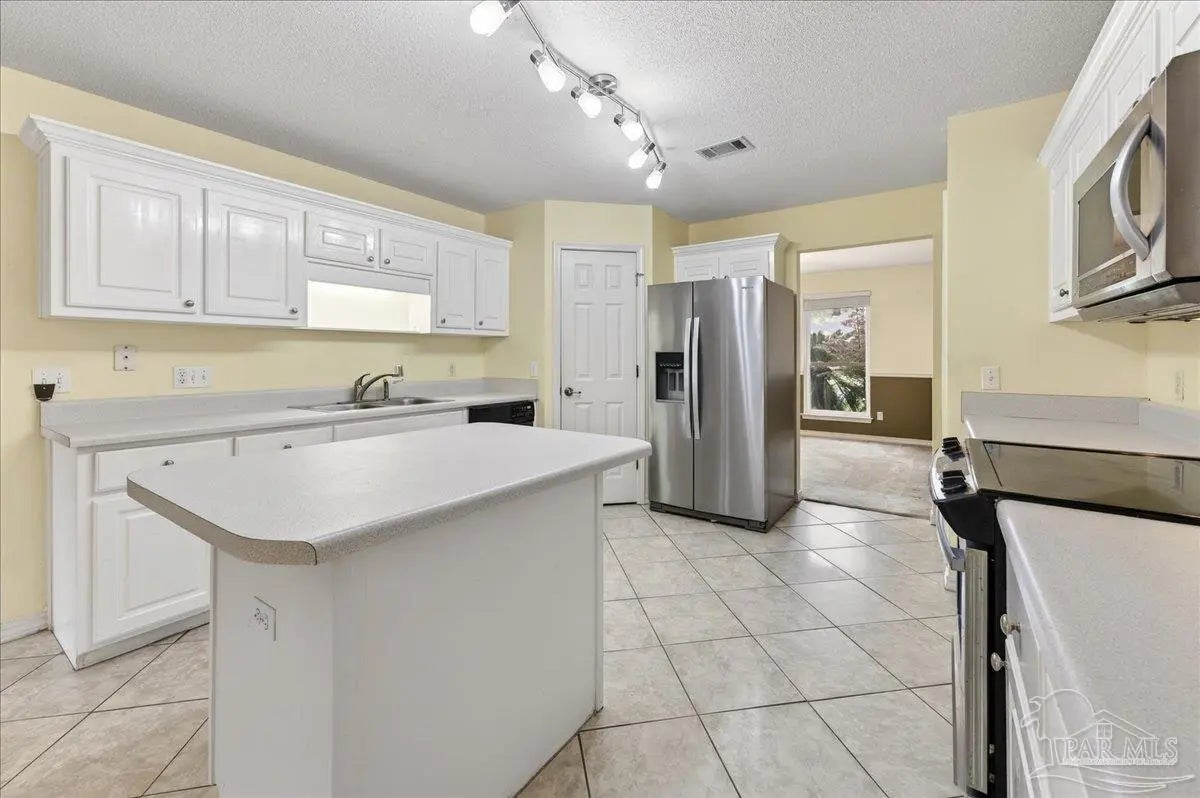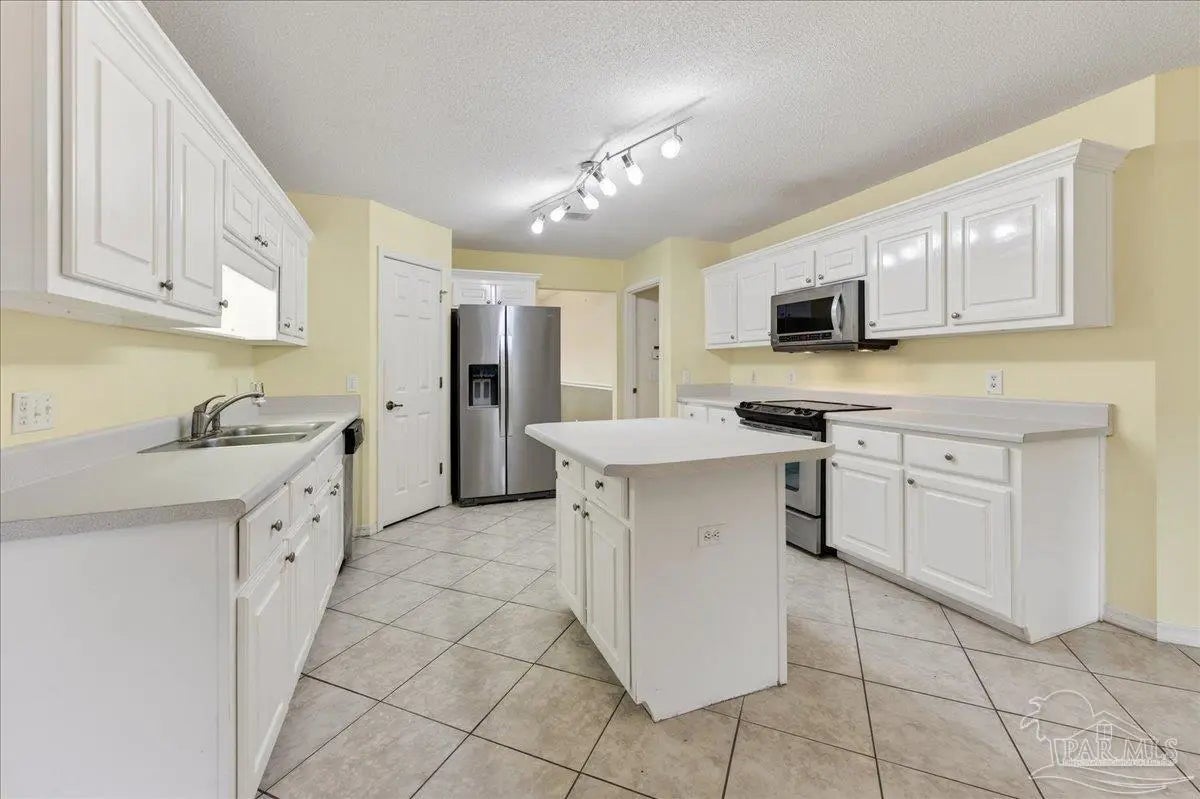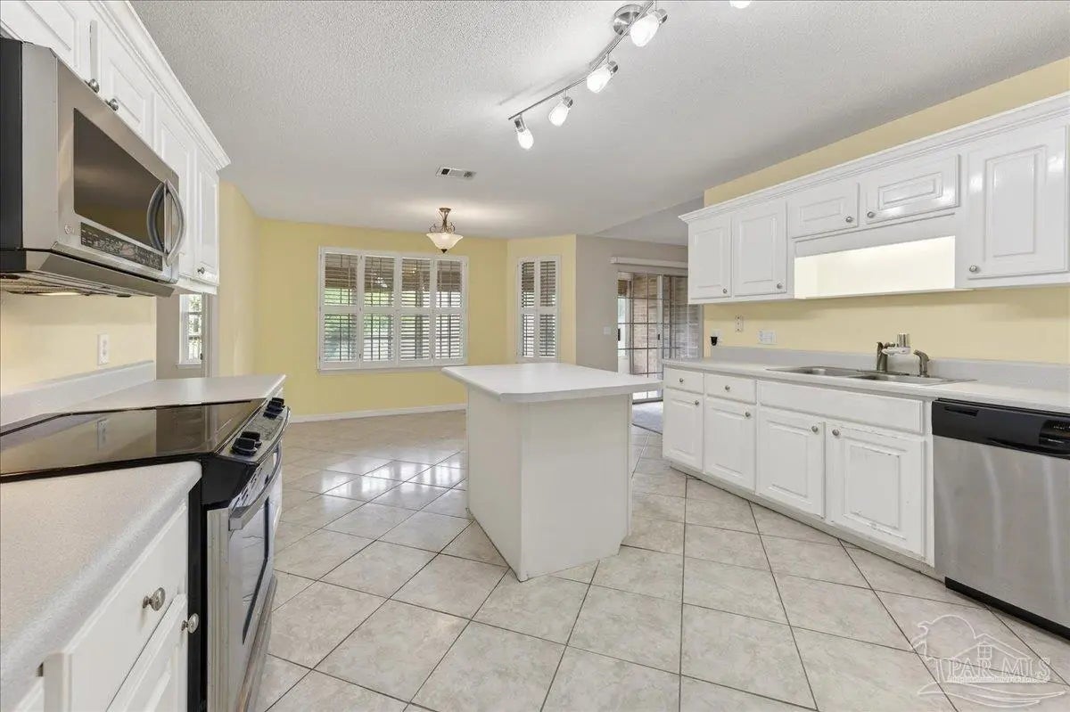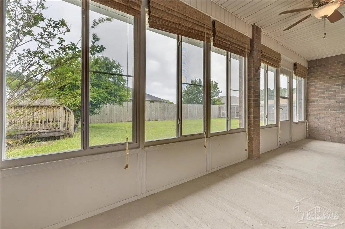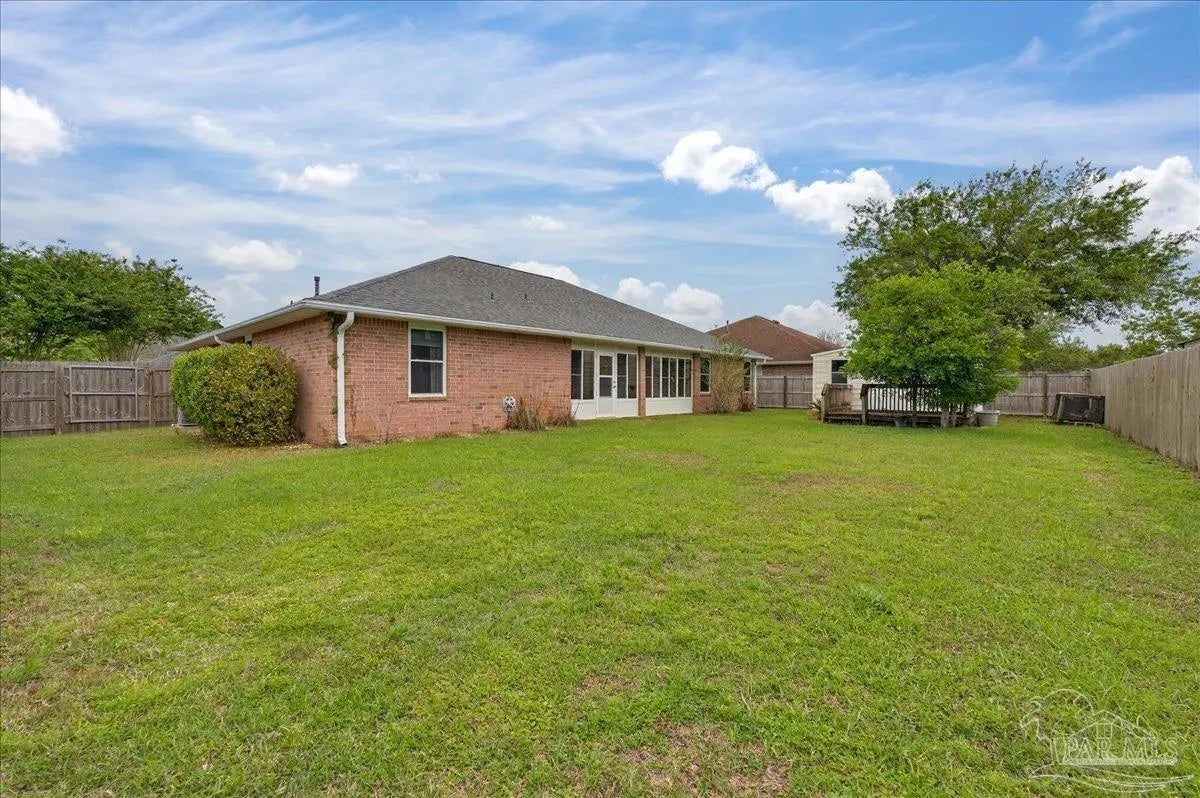 Welcome to this spacious four-bedroom, three-bathroom home with a bonus room, ideally located near the intersection of Lillian Highway and Blue Angel Parkway! Situated in a clean, HOA-managed neighborhood with streetlights, this property offers a central Pensacola location. With a 2021 roof and the windows replaced in 2017, the home is ready for its next owner. Inside, you’ll find a large living room featuring high ceilings and a cozy gas fireplace. The kitchen is generously sized with white cabinetry, stainless steel appliances, a large island, and a breakfast nook for casual dining. The formal dining room provides a dedicated space for hosting, while the bonus room offers flexibility for a home office, playroom, or additional living area. The split primary suite offers privacy and includes a spacious en suite bathroom with double vanities, two closets, a soaking tub, and a separate shower. Additional bedrooms are thoughtfully positioned in their own corners of the home, each with access to bathrooms featuring tub/shower combinations. Step outside to enjoy the covered patio and fully fenced backyard, complete with a large 11'4" x 15'4" workshop/shed. A two-car garage and corrugated metal hurricane shutters adds even more convenience. Located just minutes from NAS Pensacola, Corry Station, and approximately 15–20 minutes from the beautiful beaches of Perdido Key, this home is also close to schools, grocery stores, restaurants, hospitals, and shopping. Enjoy nearby outdoor recreation with Big Lagoon State Park, Navy Point Park, and Blue Angel Park all within a short drive. With its spacious floor plan, desirable neighborhood, and prime location, this home is an exceptional opportunity in Pensacola!
