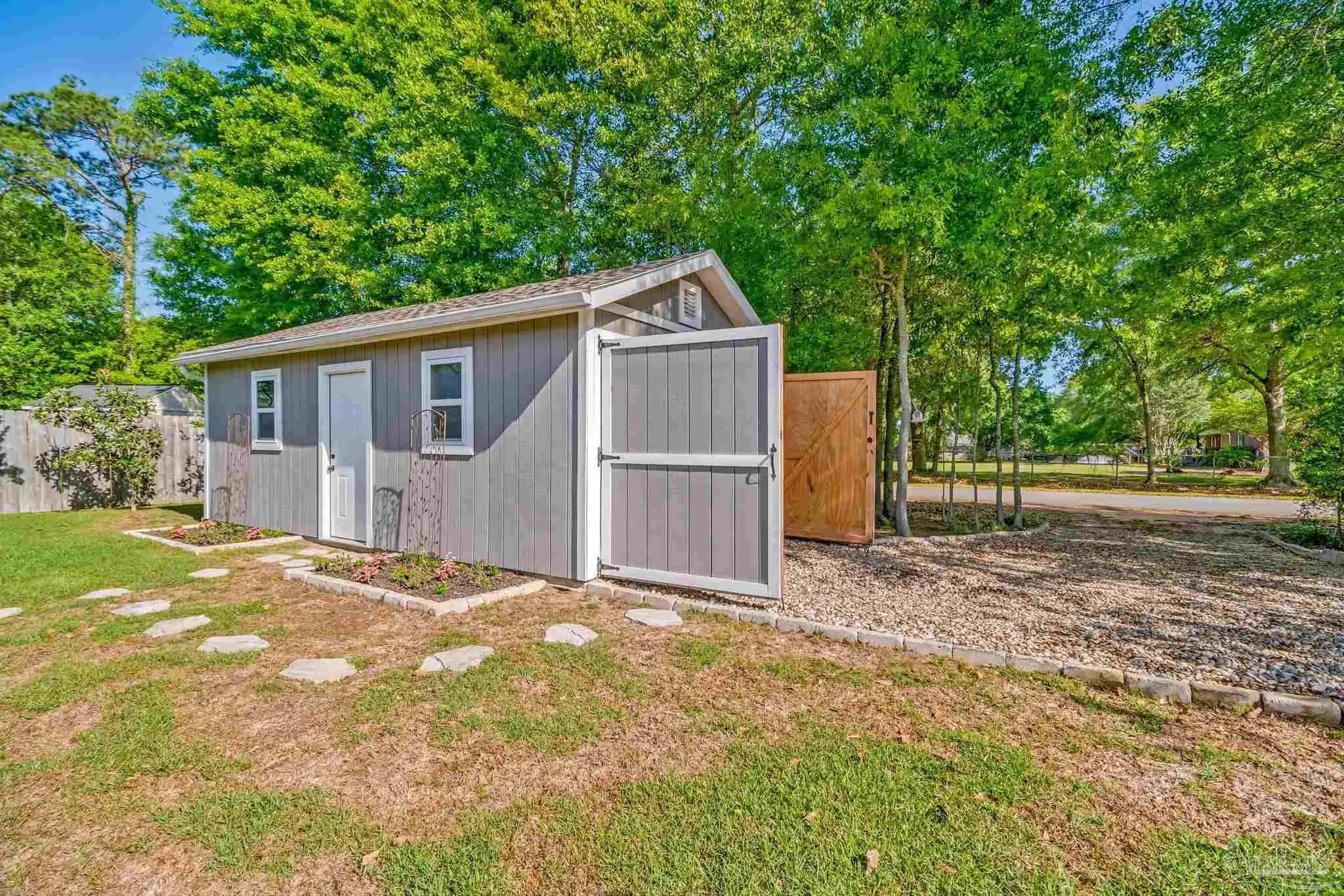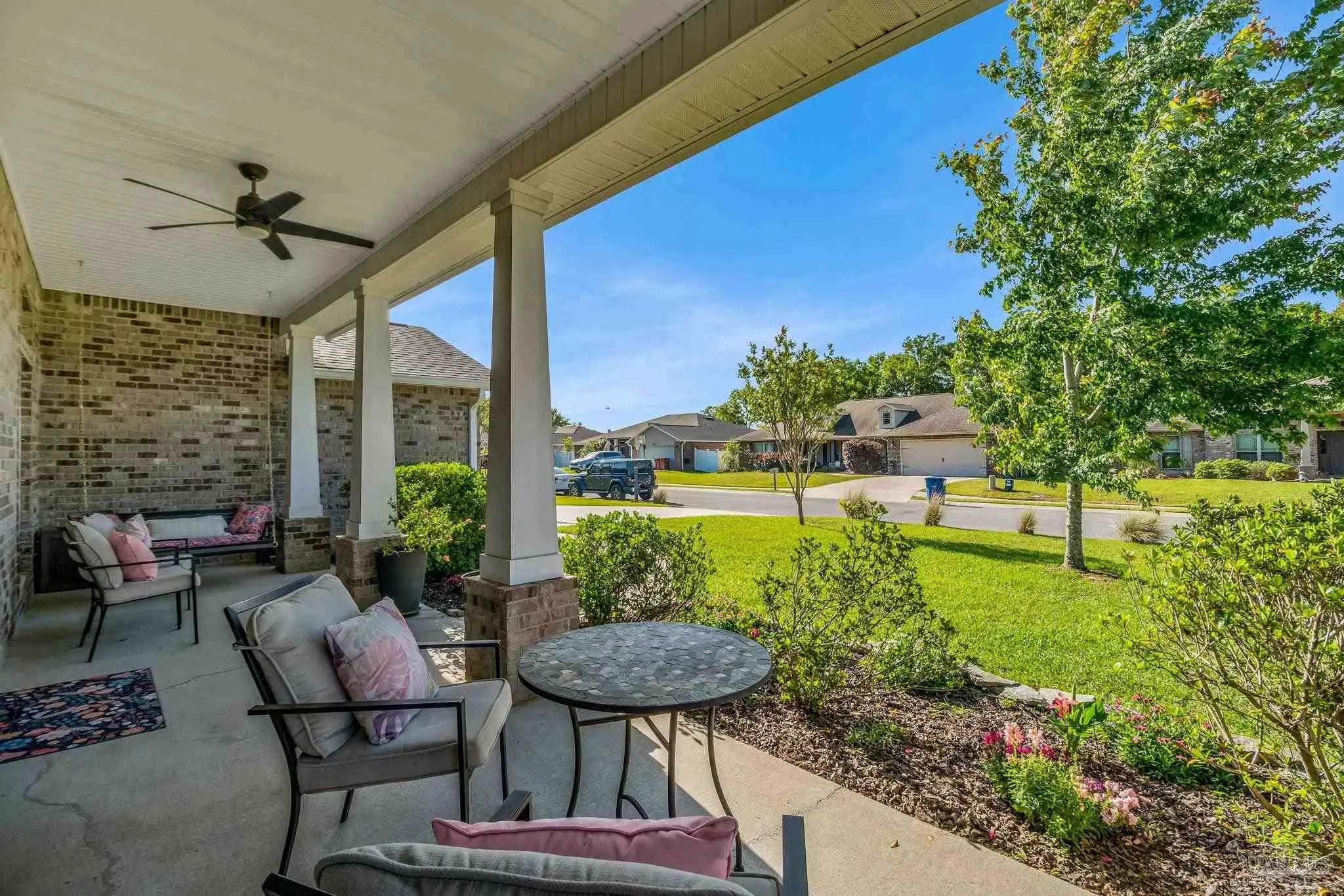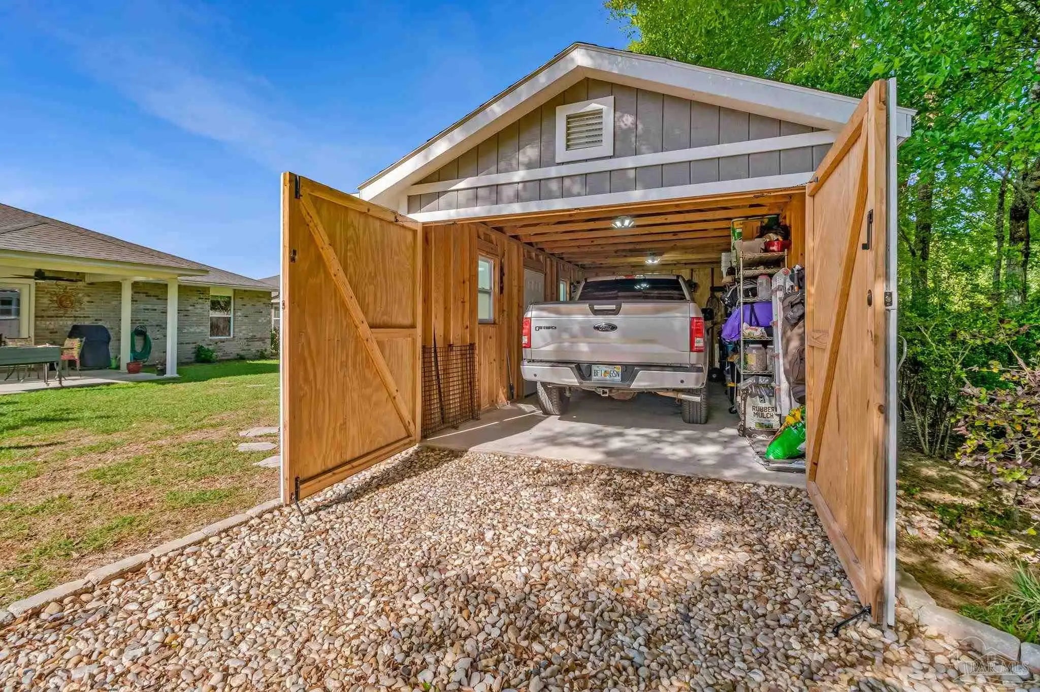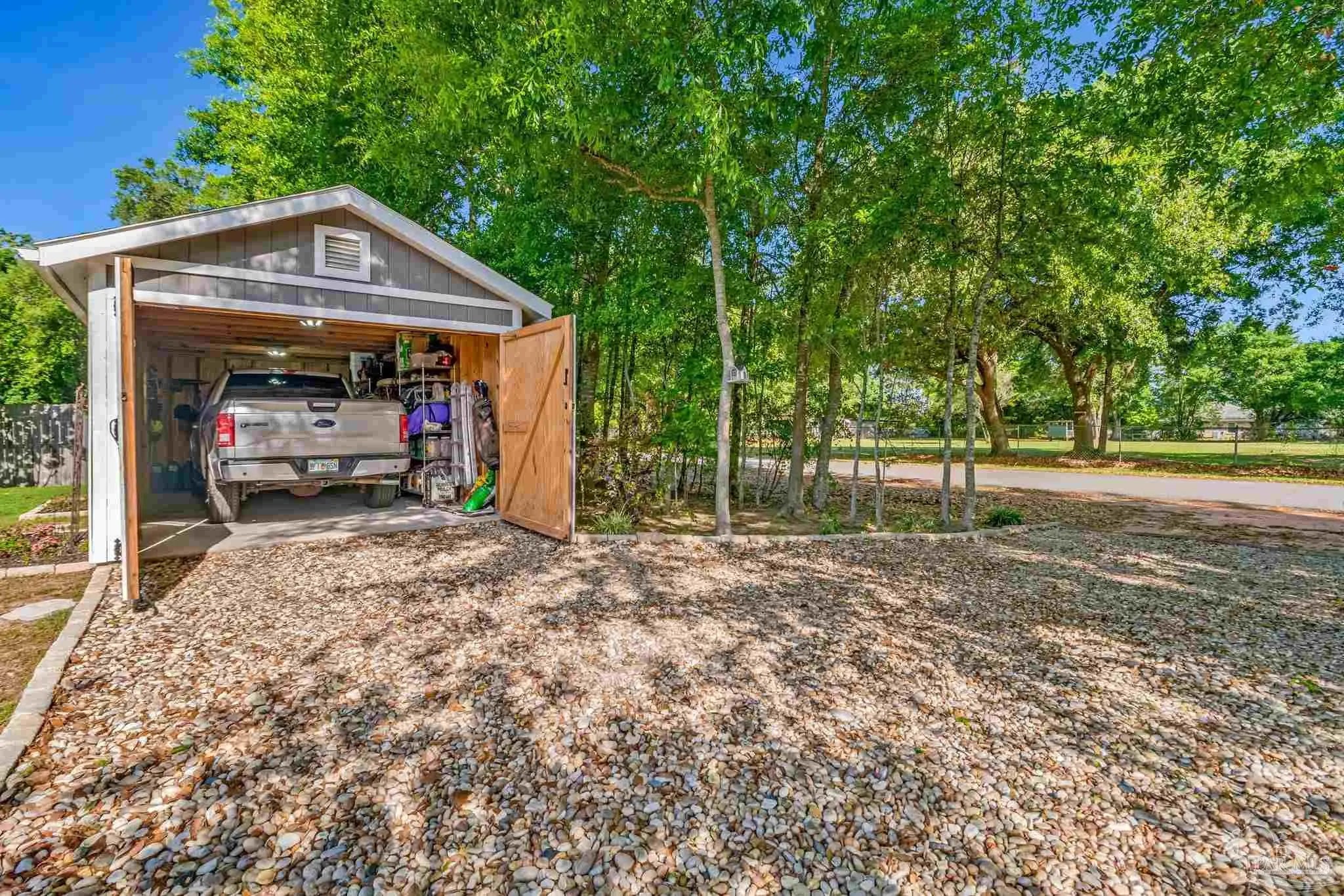 The wait is OVER! Welcome to the home you’ve been searching for in the highly desirable Pace Mill Creek neighborhood! From the moment you pull up, you’ll notice the inviting front porch and spacious two-car garage, but here’s a cool bonus… there’s also rear access with a rock driveway and a 12x24 detached garage, where it is big enough to fit a truck (yes, really!). It’s perfect for extra parking, storage, or keeping things tucked away. Step inside and you’re greeted by a welcoming foyer with a formal dining room to your right, perfect for hosting dinners or serving as a flex space (currently used as an additional living space). The living room features high ceilings and flows seamlessly into the kitchen, creating an open, airy layout that’s perfect for everyday living and entertaining. The kitchen is the heart of the home, featuring dark wood cabinetry, granite countertops, stainless steel appliances, a center island, breakfast bar, pantry, and a breakfast nook, aka plenty of space for cooking, hosting, and everything in between. The split floor plan gives you privacy where it matters most. The primary suite is tucked away on its own side of the home, with plenty of space for a king-sized bed and a sitting area. The ensuite bathroom? A total win, with an oversized tiled shower, soaking tub, double vanities with granite, private water closet, and a large closet. On the opposite side of the home, you’ll find three additional bedrooms sharing a full bath. Complete with a tub/shower combination, granite countertops, and a single vanity sink. Now, step out back to your covered patio, ideal for morning coffee, winding down in the evenings, or morning bird watching. The backyard offers tons of space to spread out, entertain, or just enjoy the Florida weather, and that large, covered shed/garage adds even more flexibility. This home checks all the boxes, and then some. Come see it for yourself… You might not want to leave!